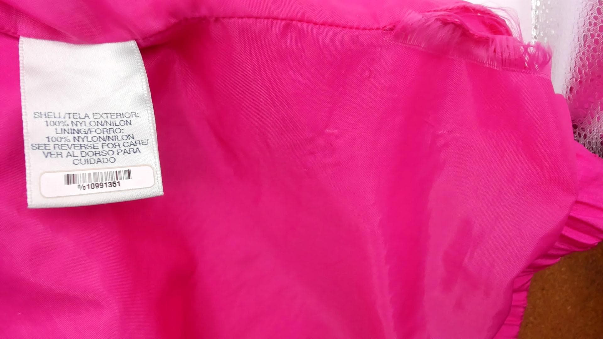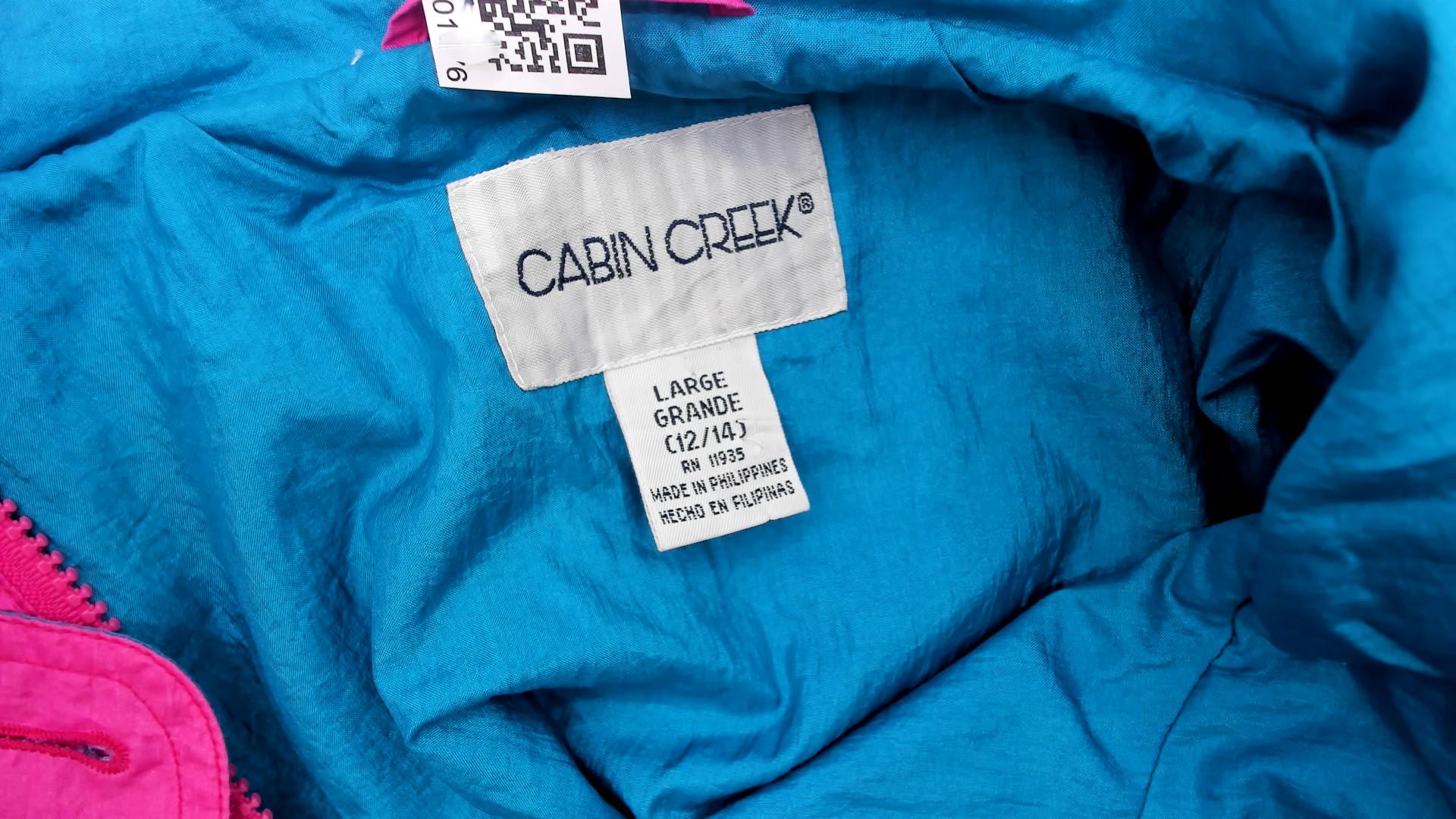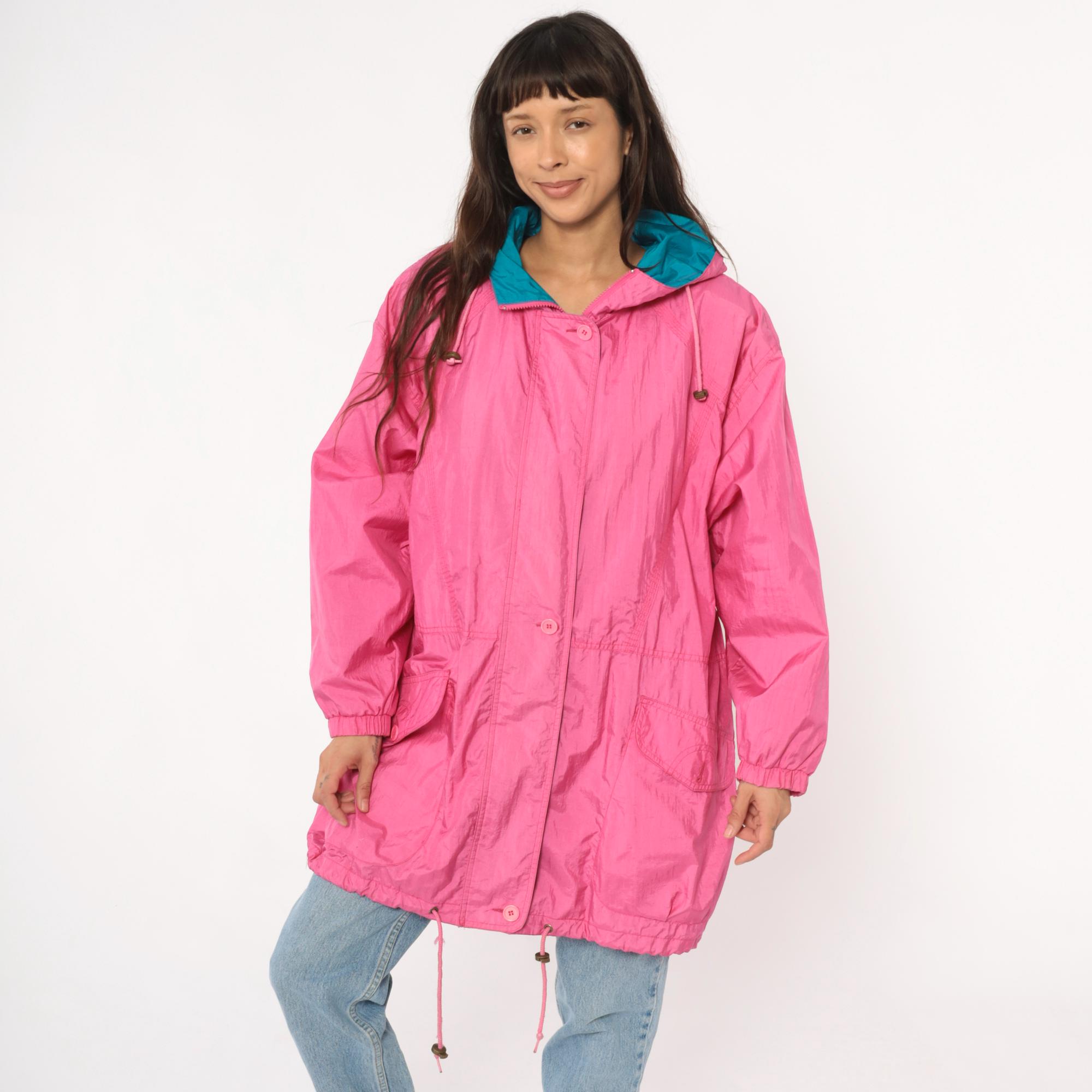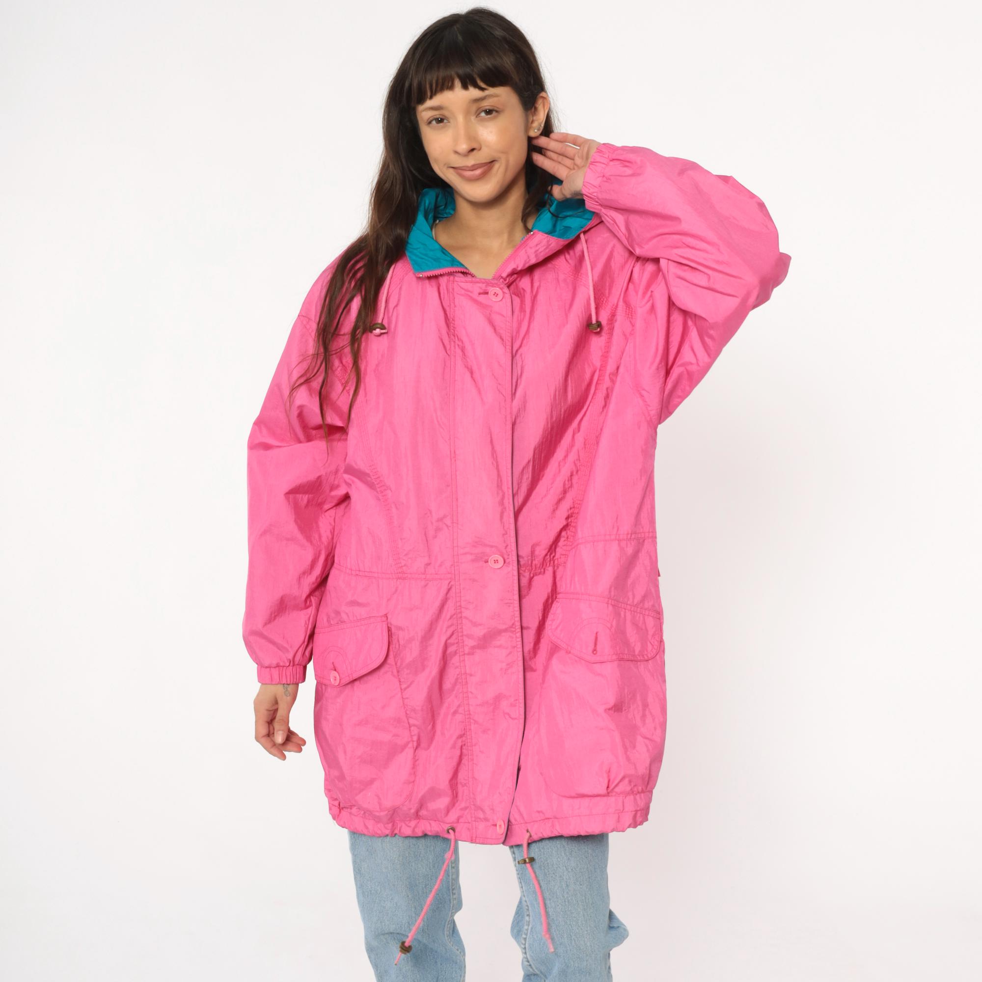 90s bubblegum pink windbreaker from Cabin Creek with teal lining visible at hood interior. Button front closure with hood and drawstring, elastic cuffs at sleeves, gathered elastic waist with drawstring ties. Two front patch pockets, extended length past hip.