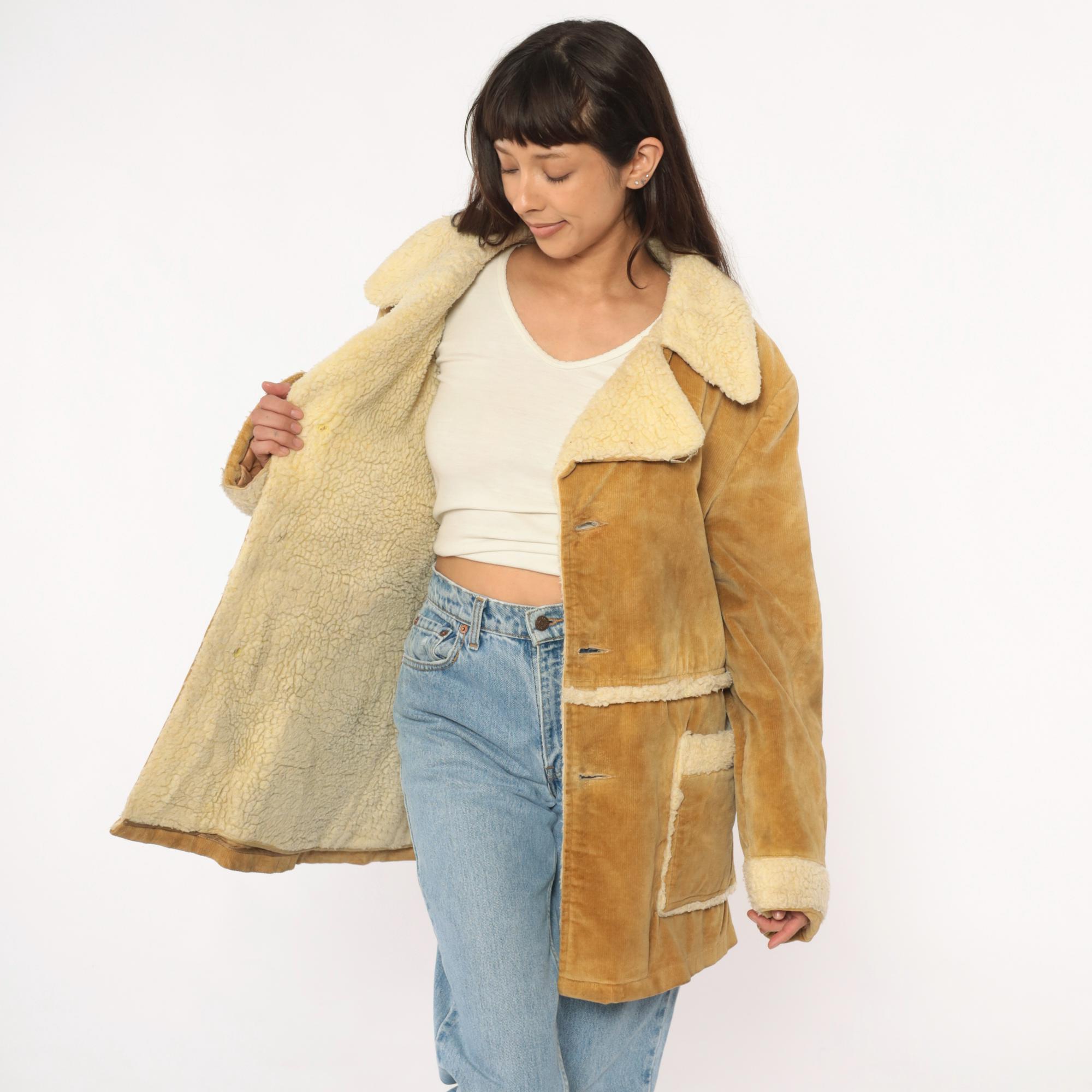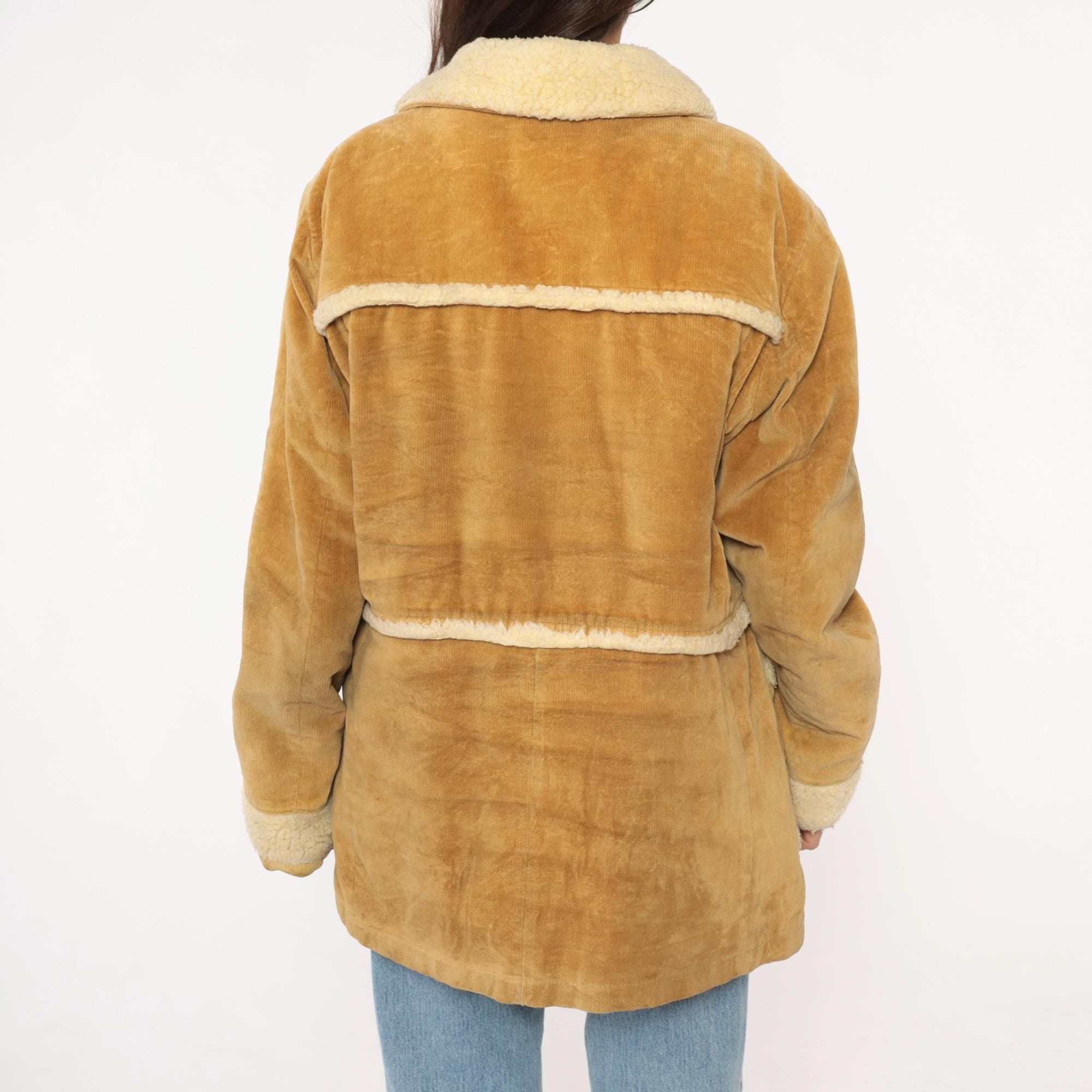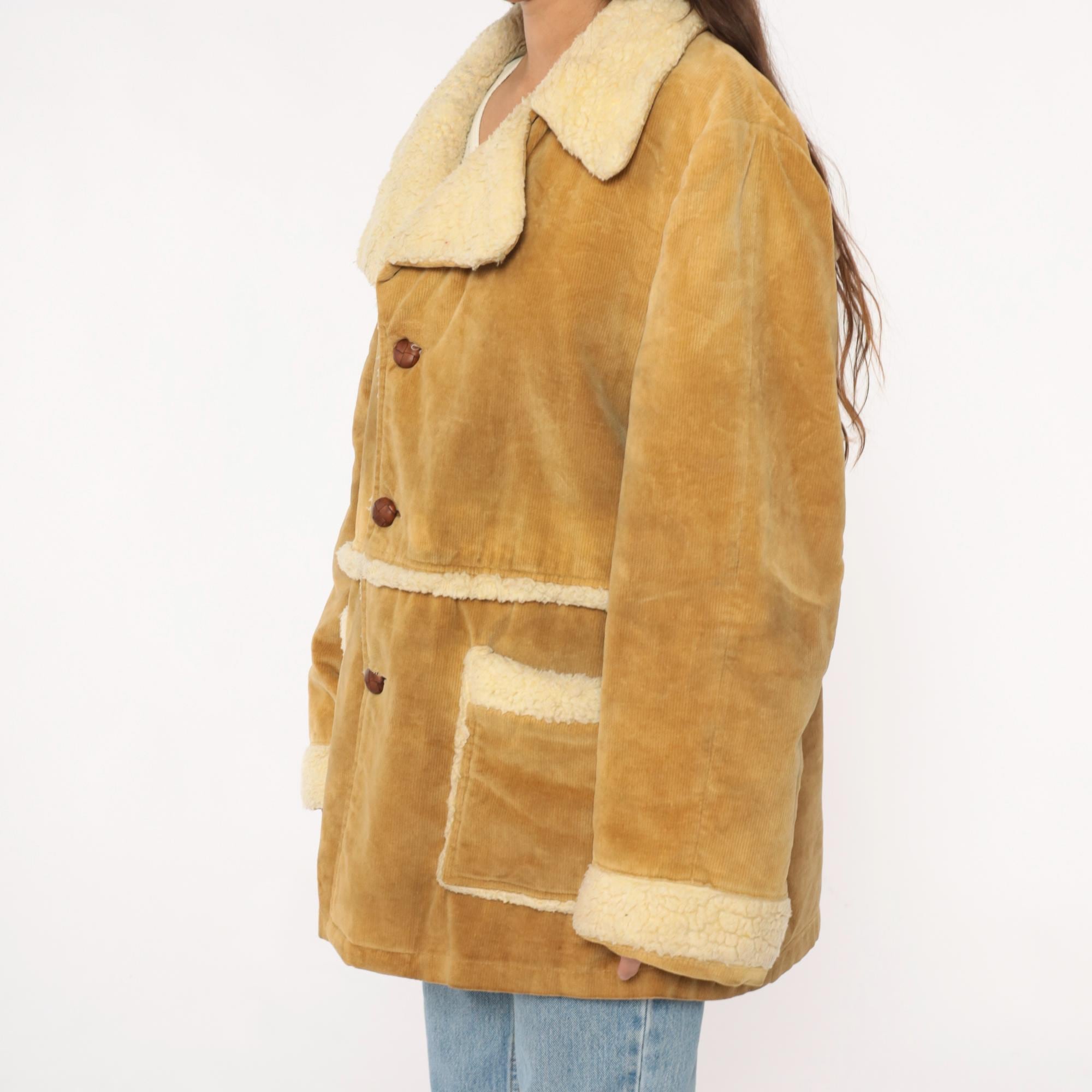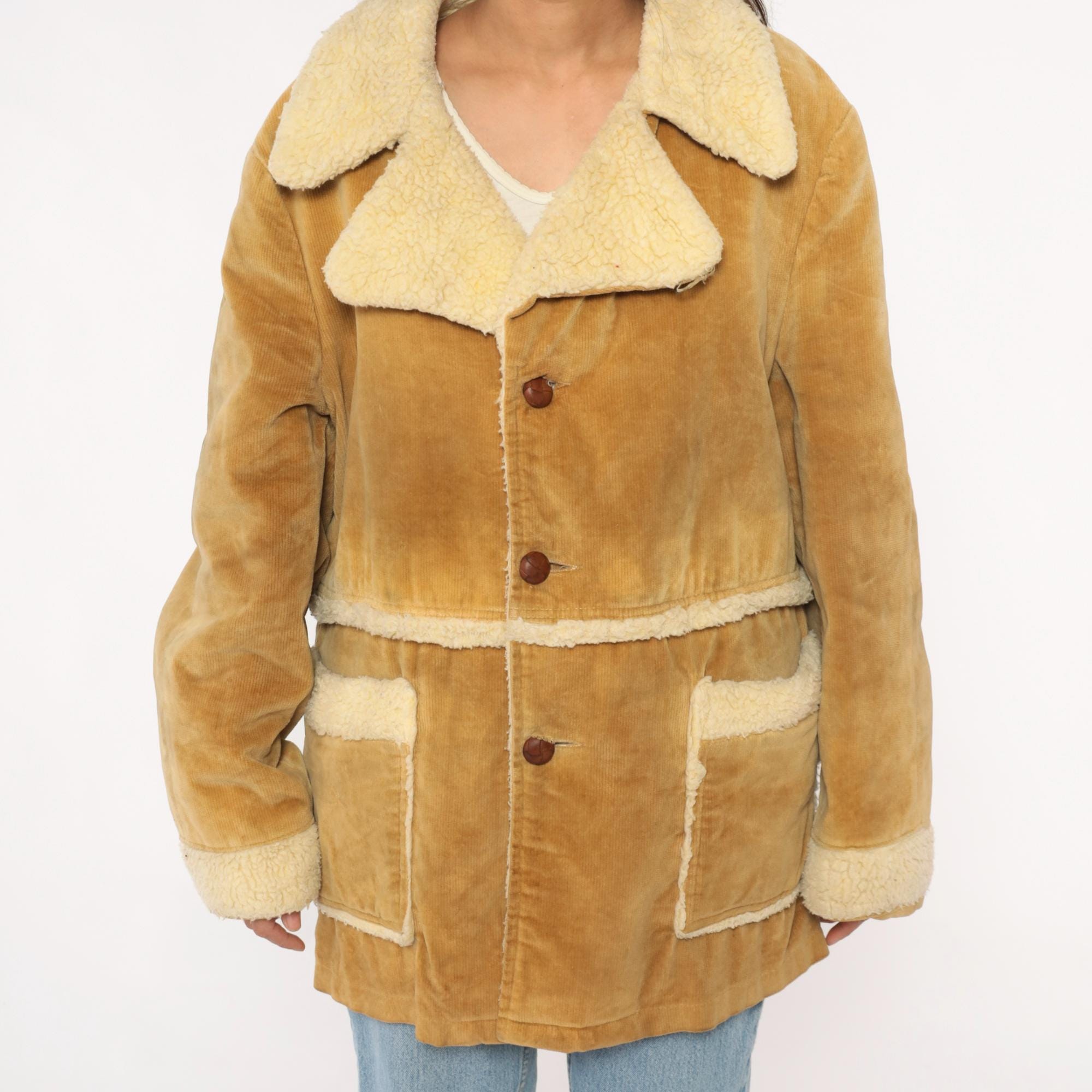 70s tan corduroy jacket styled by william barry with faux shearling collar, cuffs, and trim at pockets and hem. Button front closure with brown buttons, two patch pockets at hips. Wide spread collar with shearling lining visible throughout interior.