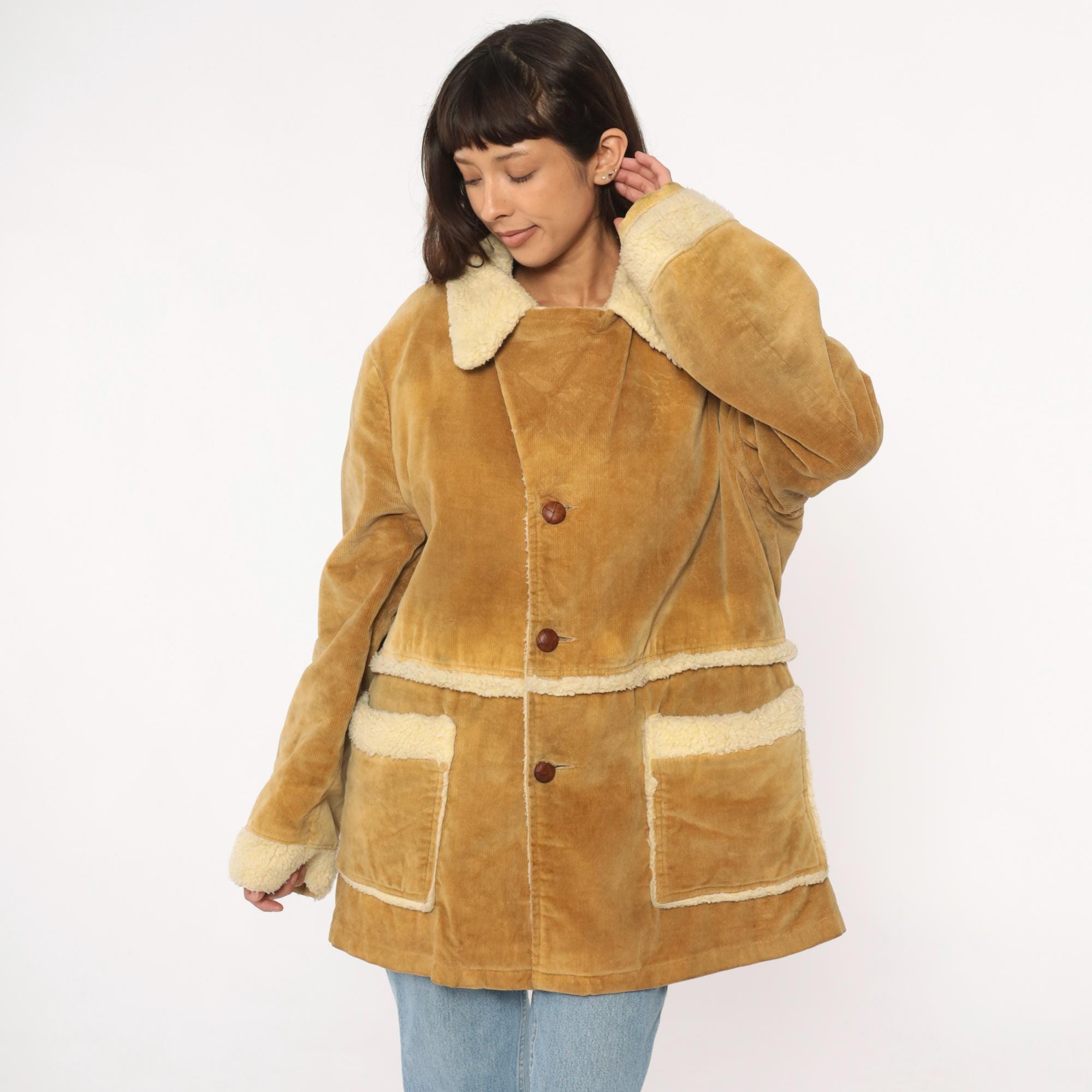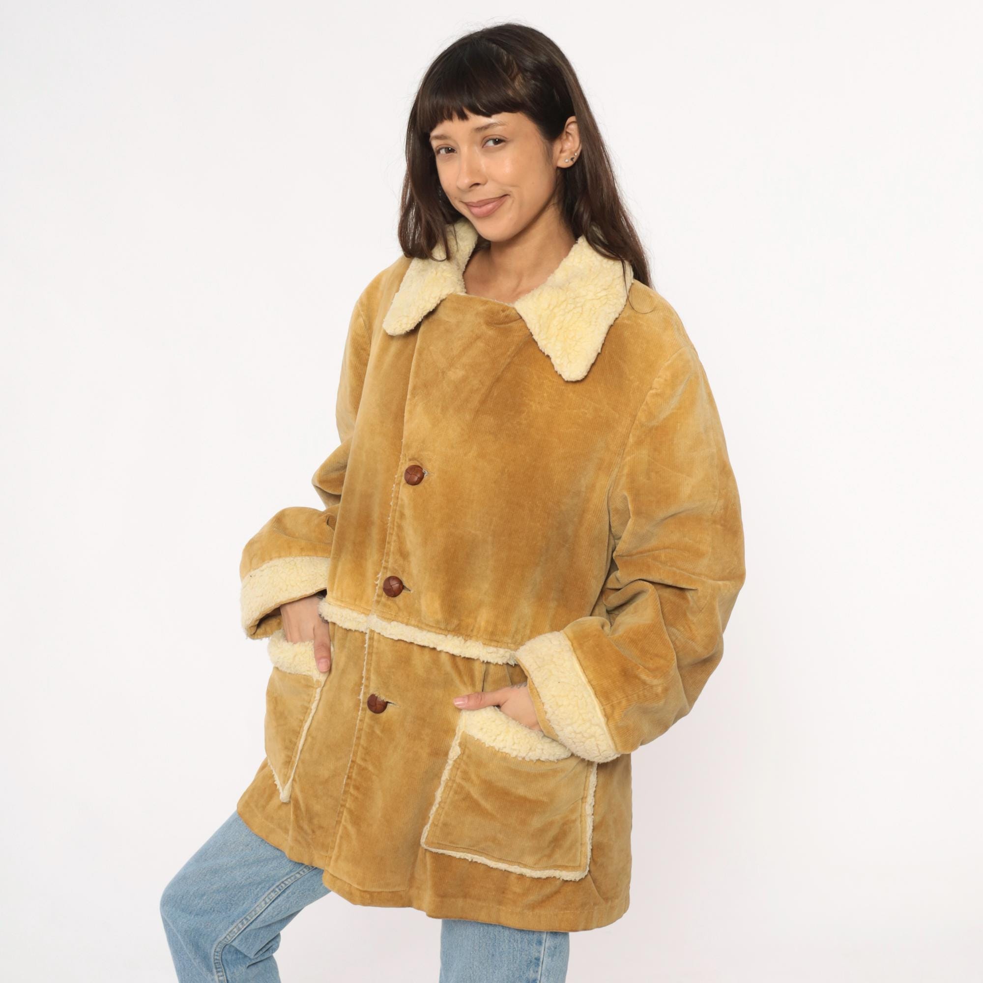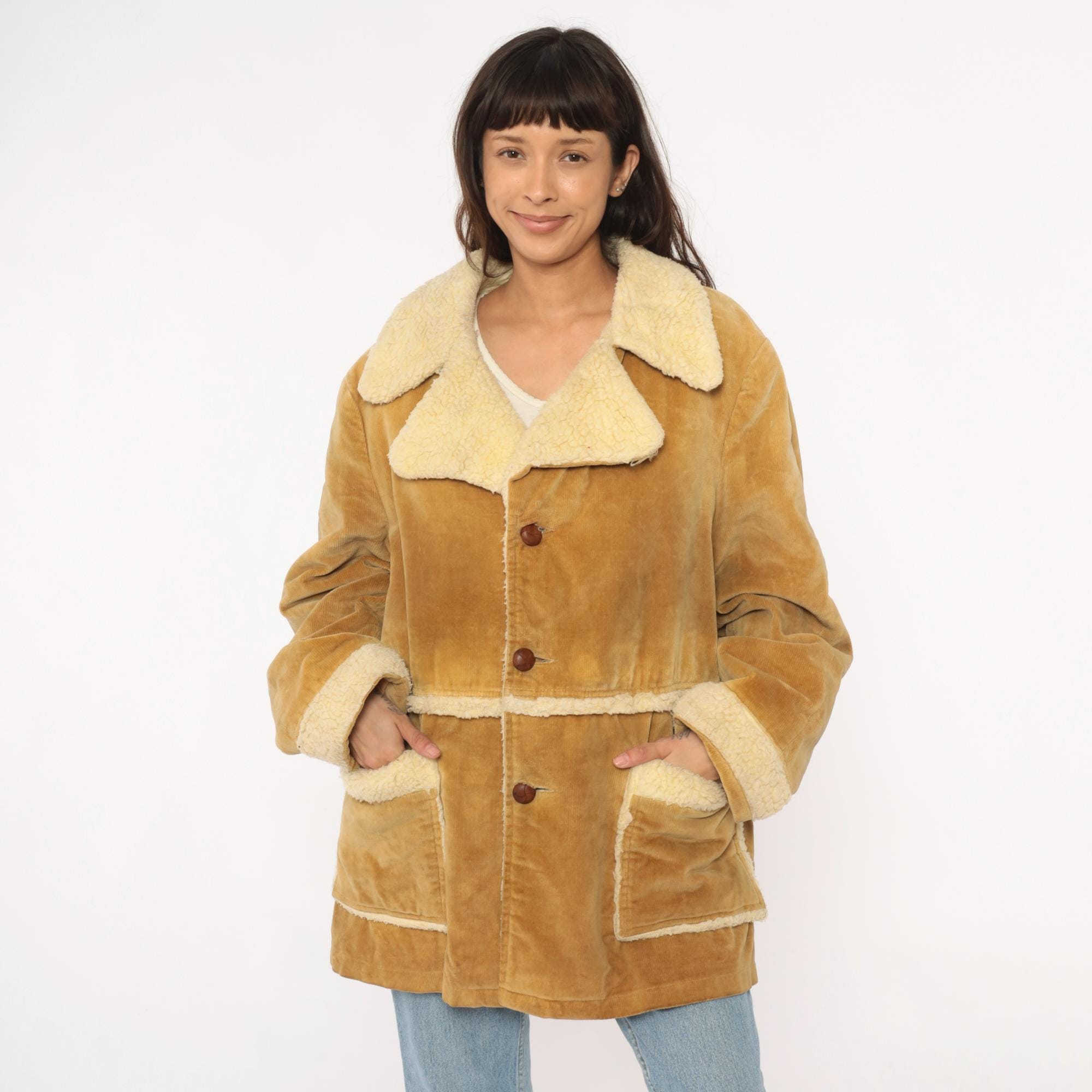70s tan corduroy jacket styled by william barry with faux shearling collar, cuffs, and trim at pockets and hem. Button front closure with brown buttons, two patch pockets at hips. Wide spread collar with shearling lining visible throughout interior.