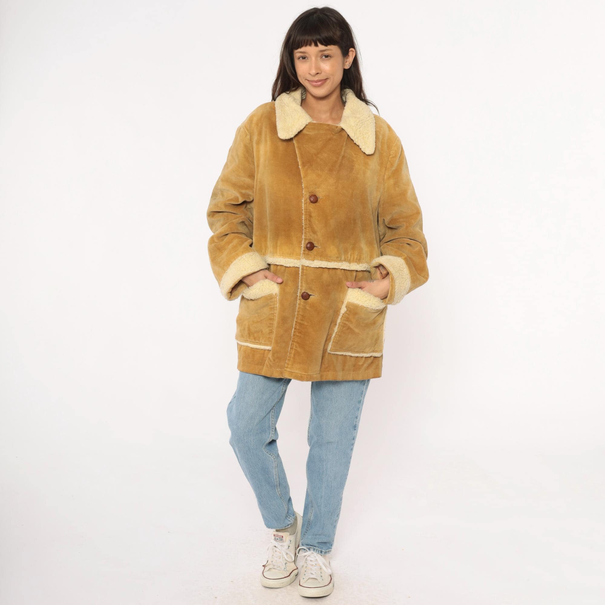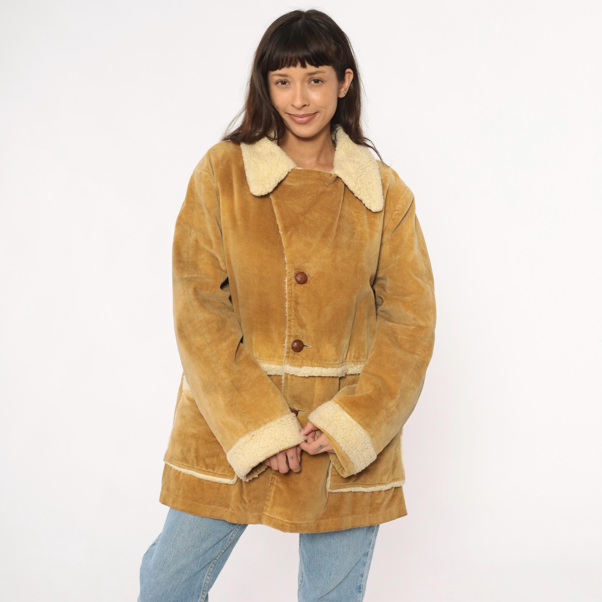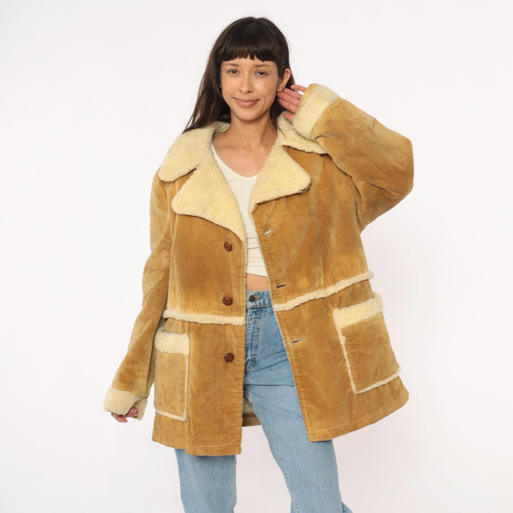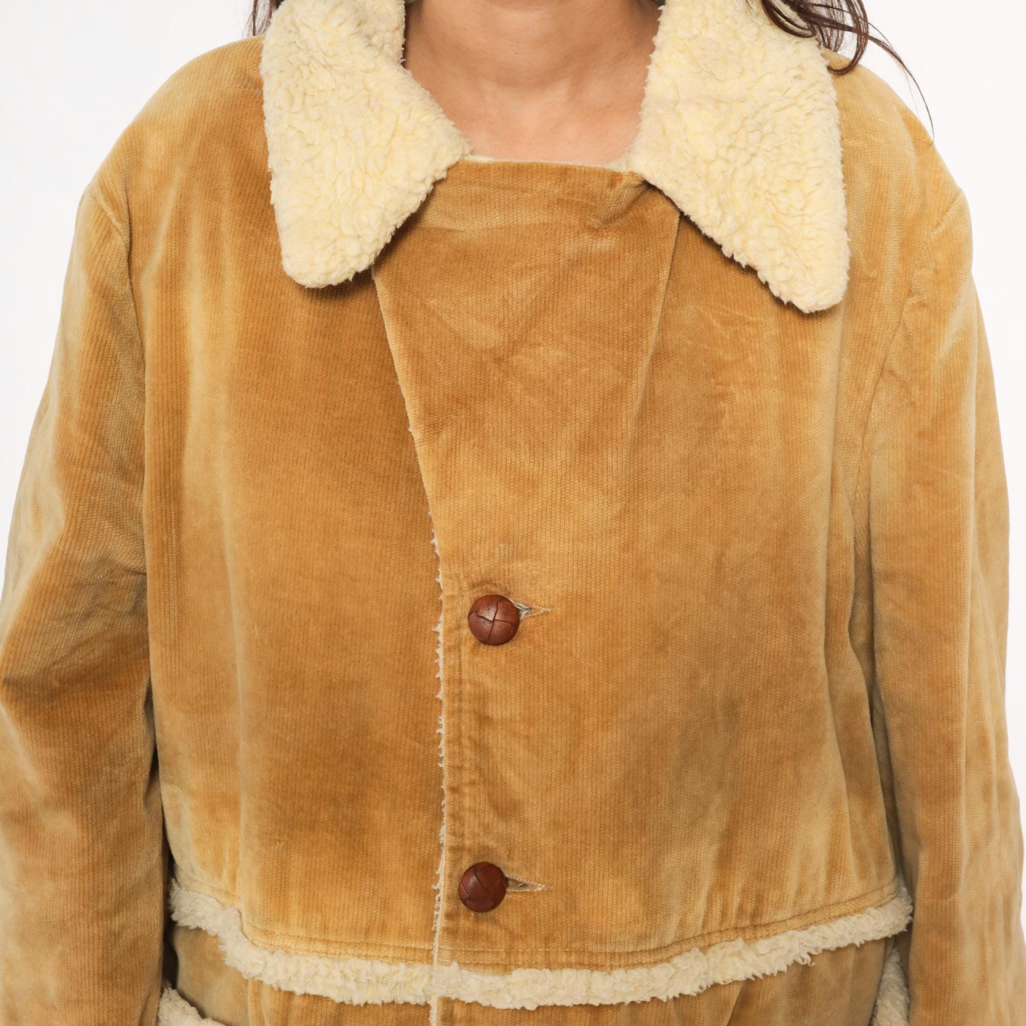 70s tan corduroy jacket styled by william barry with faux shearling collar, cuffs, and trim at pockets and hem. Button front closure with brown buttons, two patch pockets at hips. Wide spread collar with shearling lining visible throughout interior.