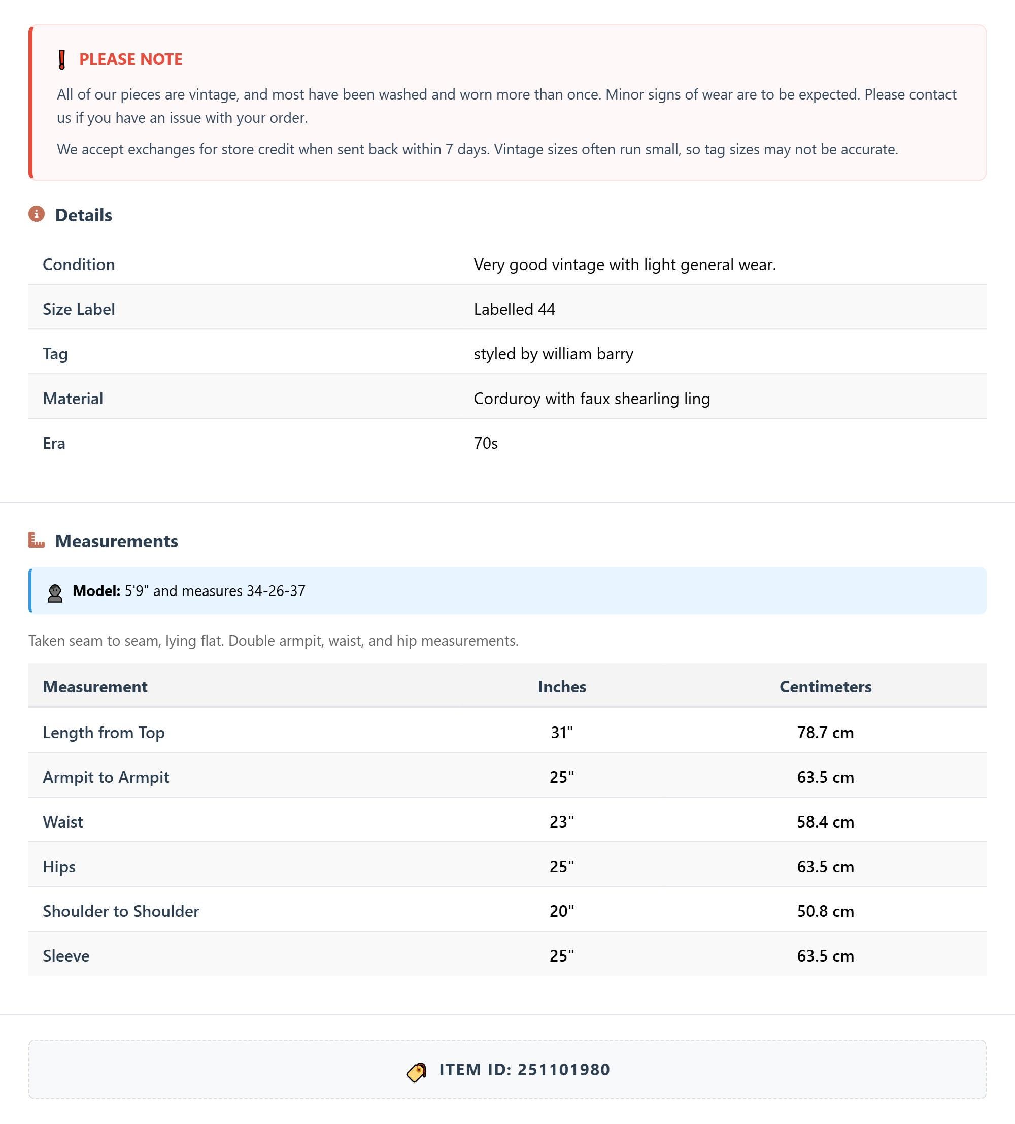 All of our pieces are vintage, and most have been washed and worn more than once. Minor signs of wear are to be expected. Please contact us if you have an issue with your order. We accept exchanges for store credit when sent back within 7 days.