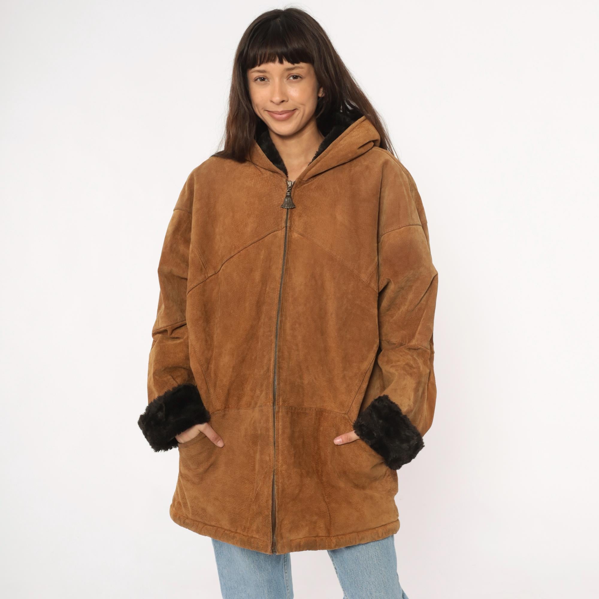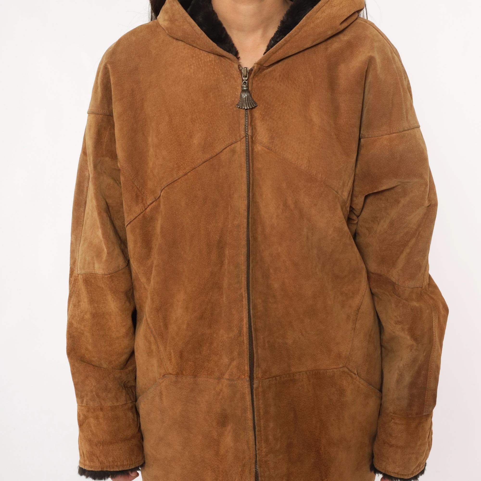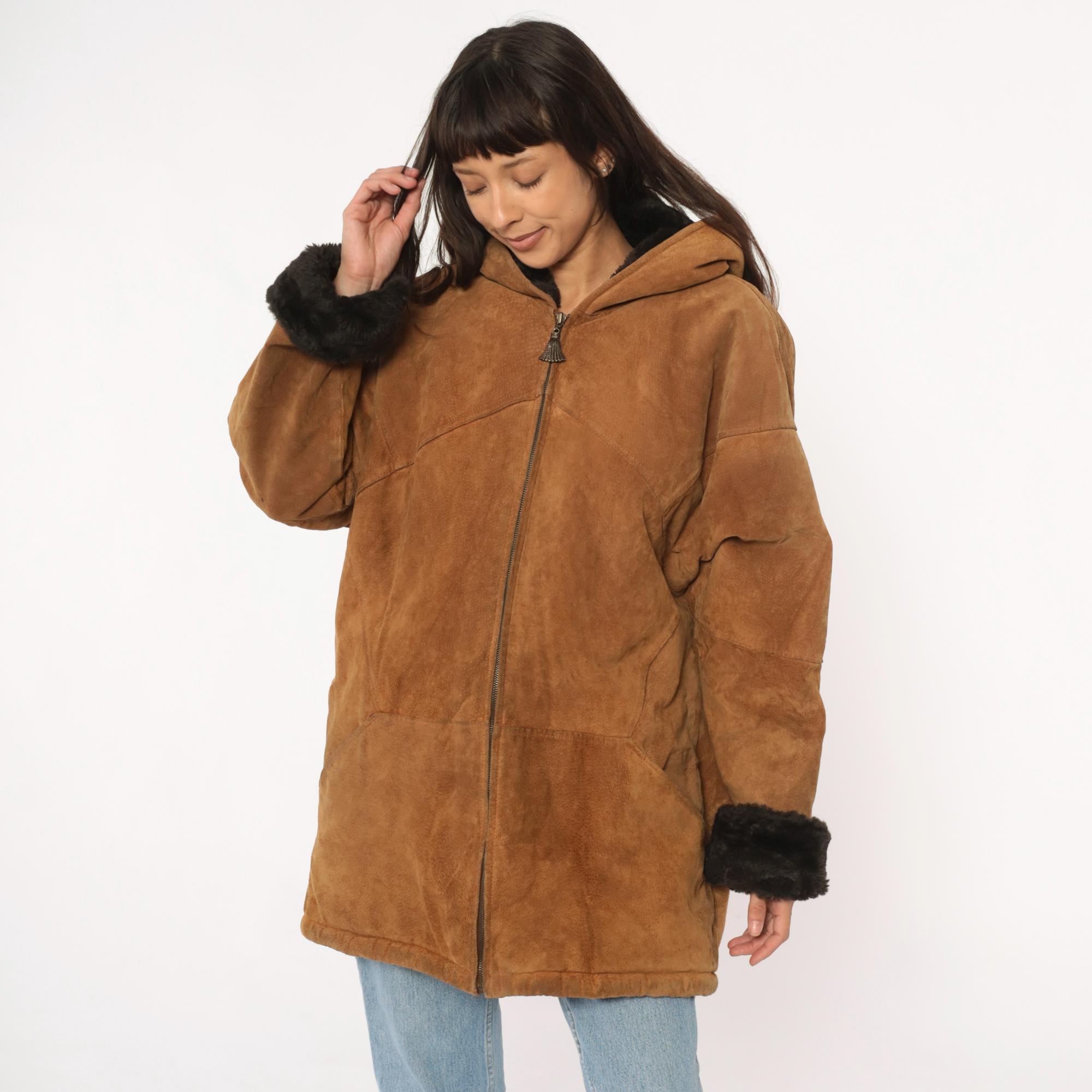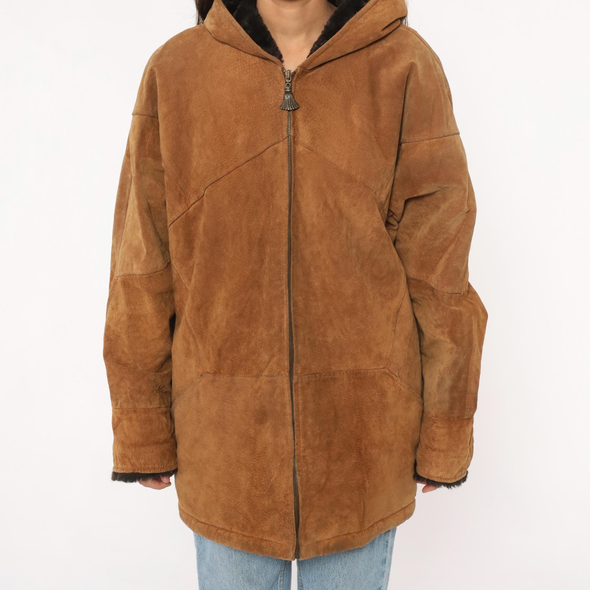 90s tan leather hooded coat with black faux fur lining at cuffs, hood interior, and hem trim. Full front zipper closure, hip-level zippered pockets, paneled construction visible at back and sleeves. Leather with faux fur lining.