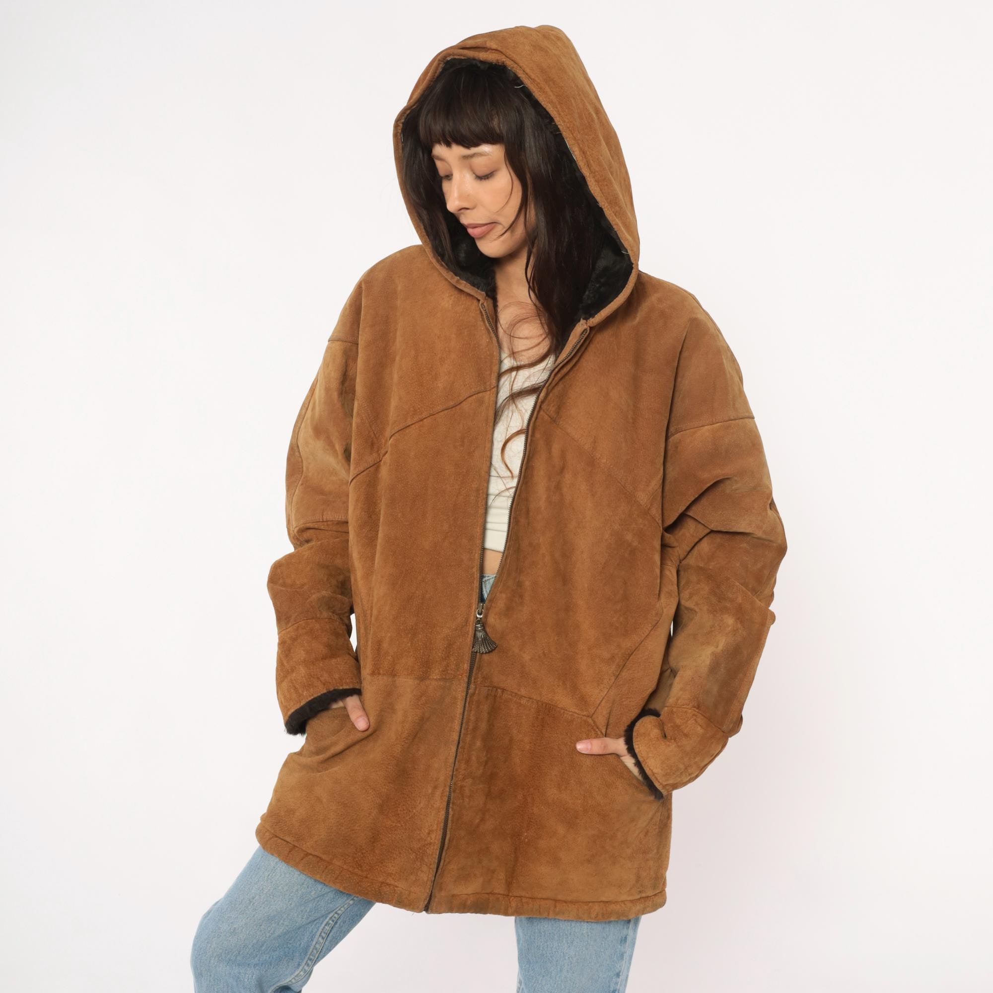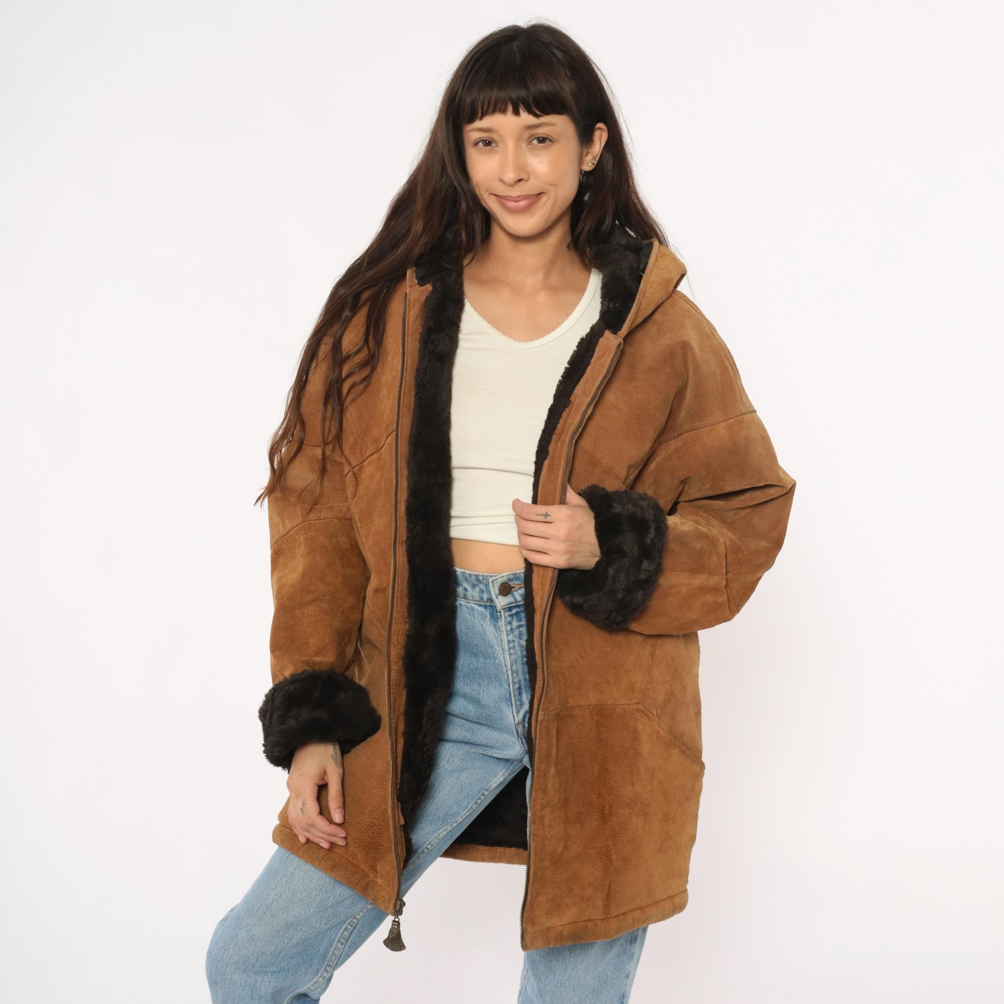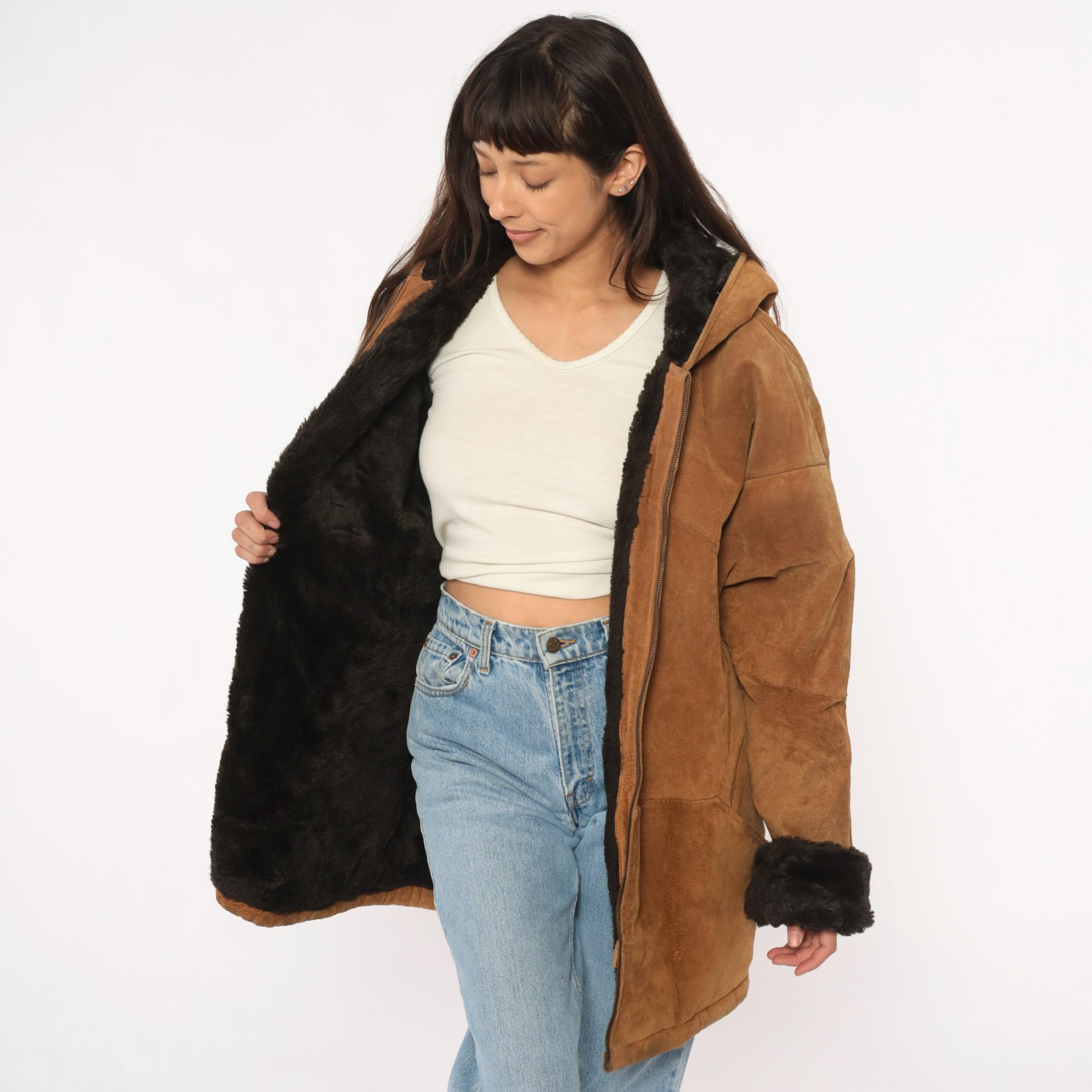 90s tan leather hooded coat with black faux fur lining at cuffs, hood interior, and hem trim. Full front zipper closure, hip-level zippered pockets, paneled construction visible at back and sleeves. Leather with faux fur lining.