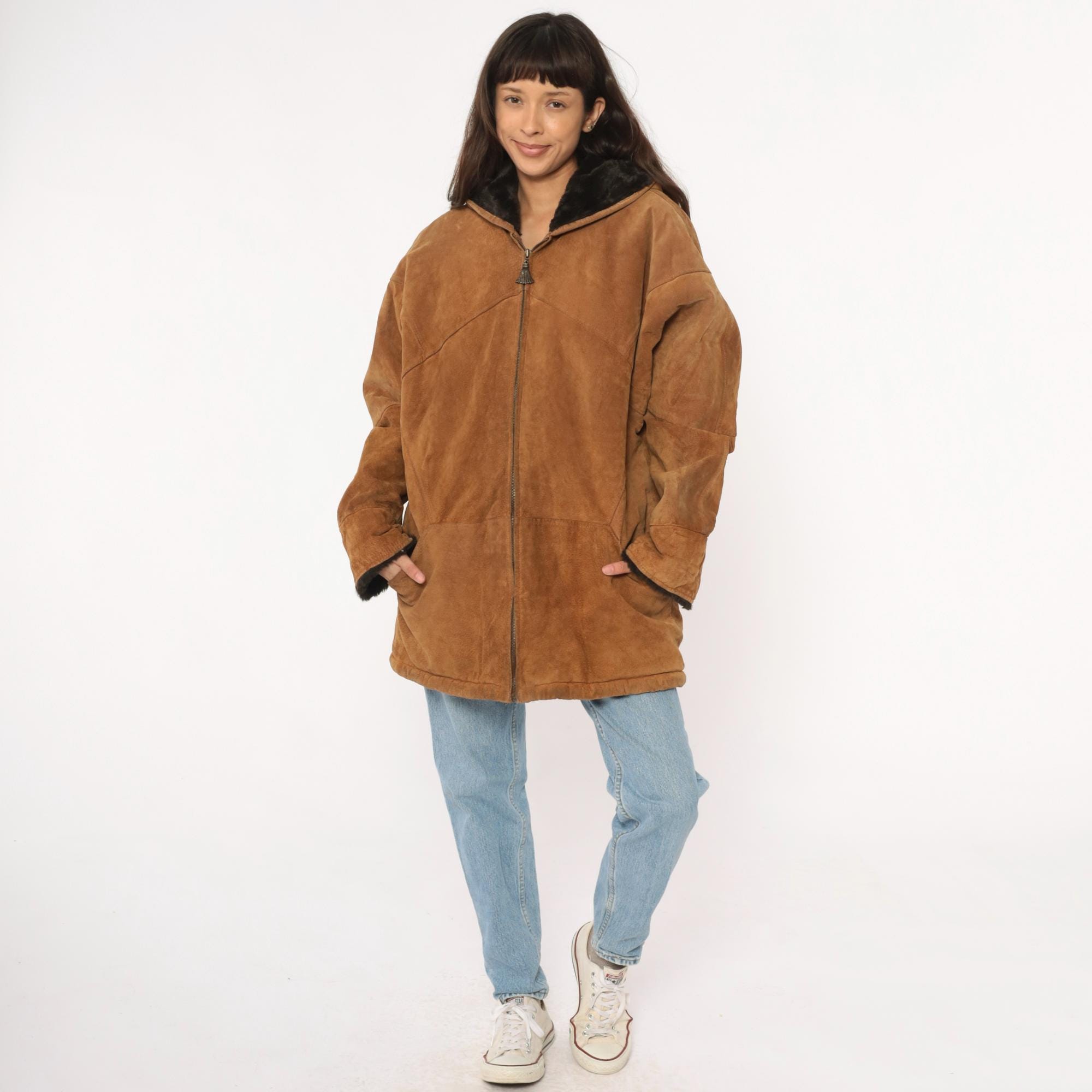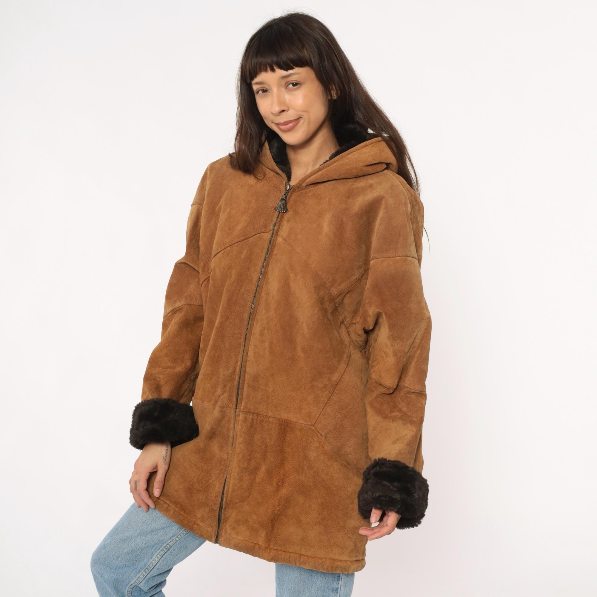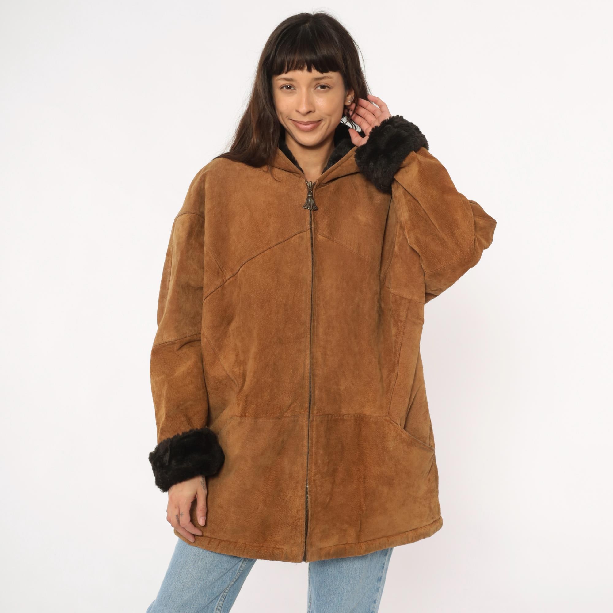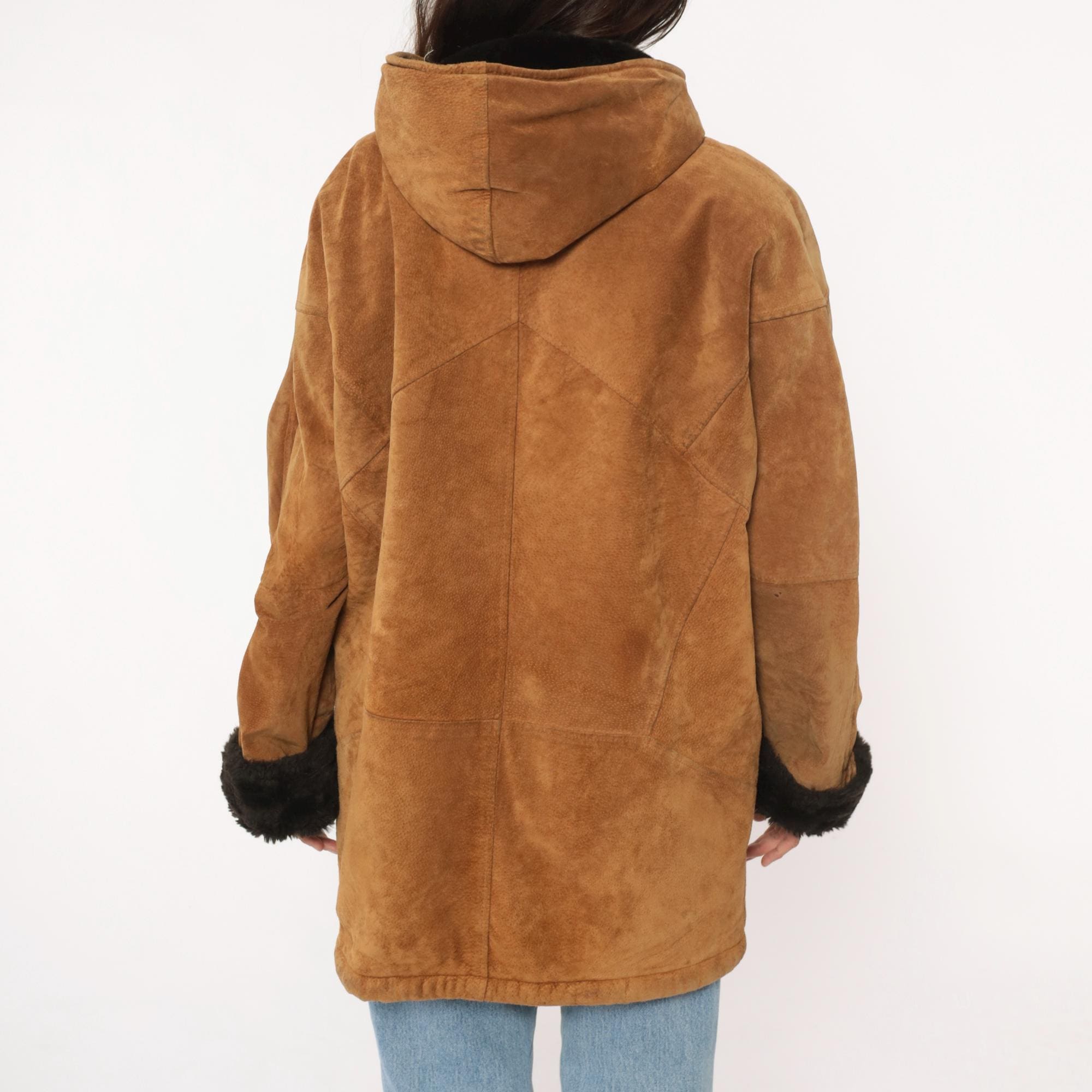 90s tan leather hooded coat with black faux fur lining at cuffs, hood interior, and hem trim. Full front zipper closure, hip-level zippered pockets, paneled construction visible at back and sleeves. Leather with faux fur lining.