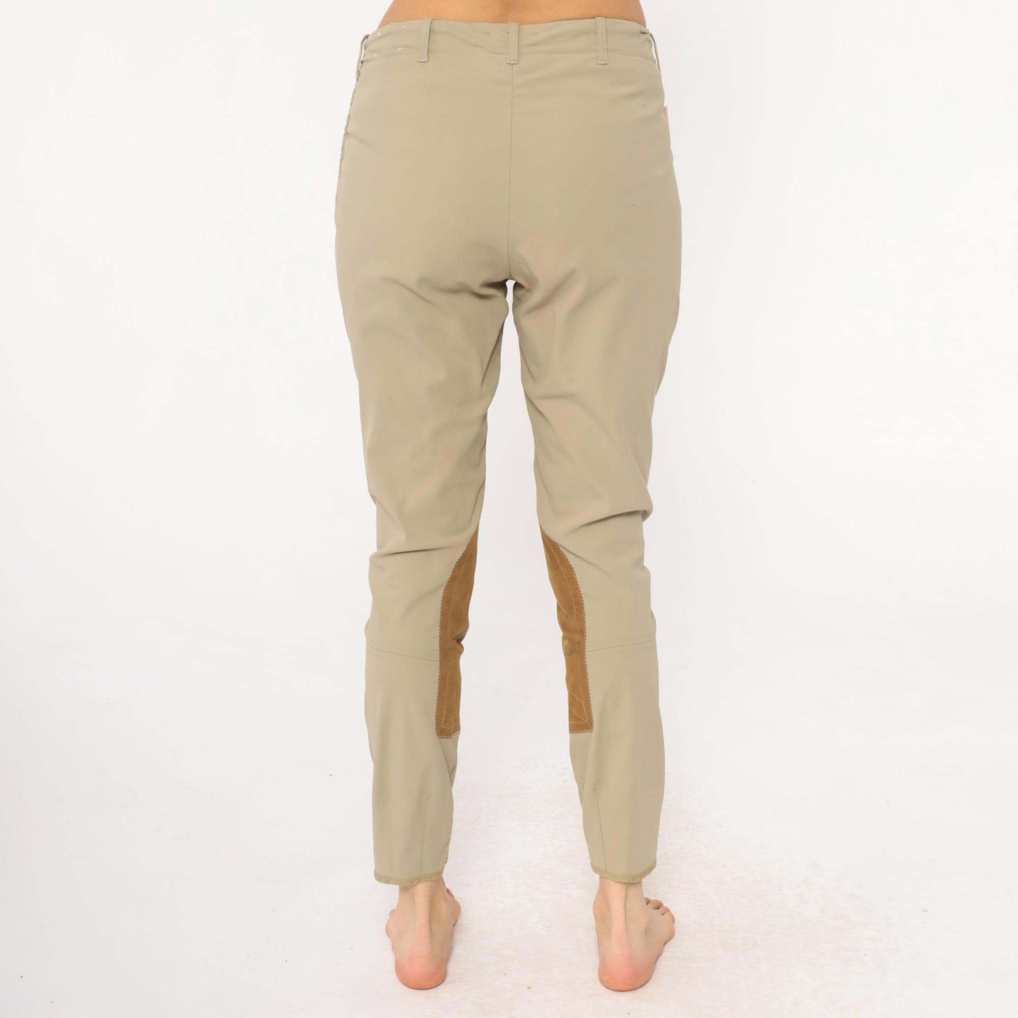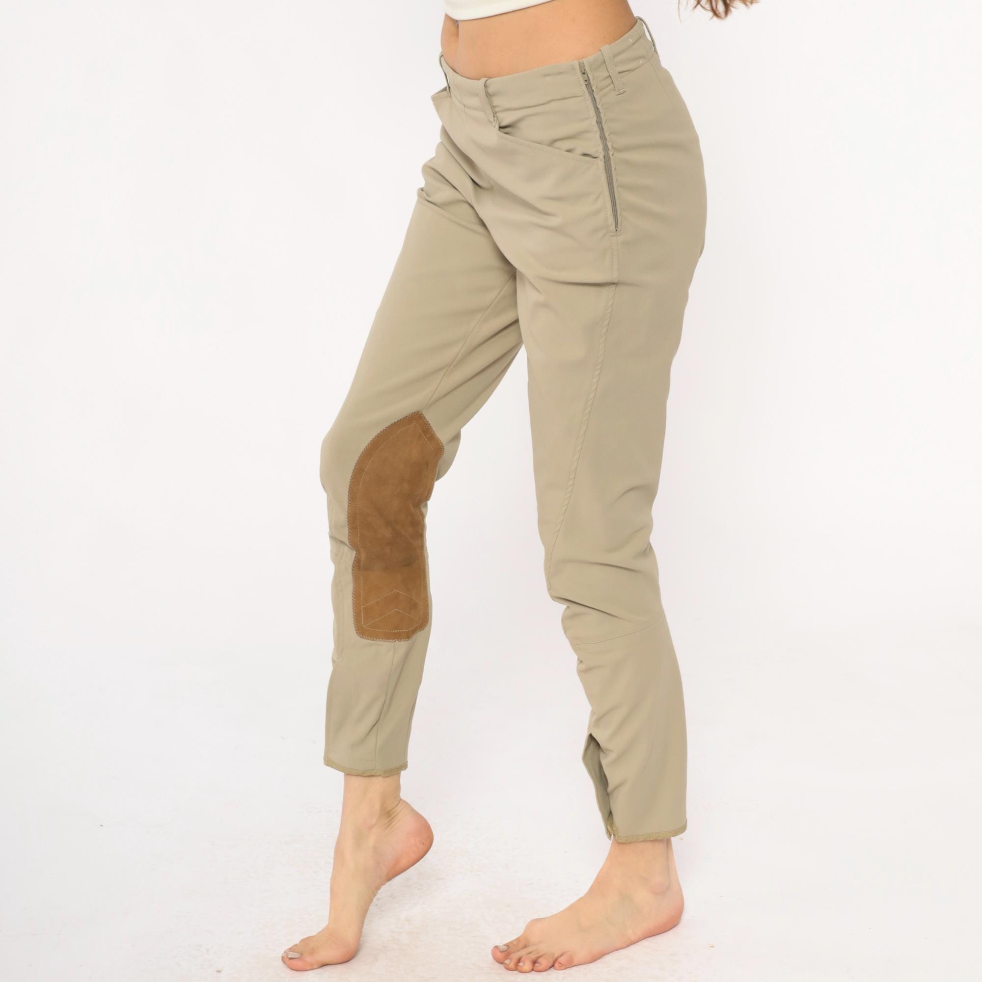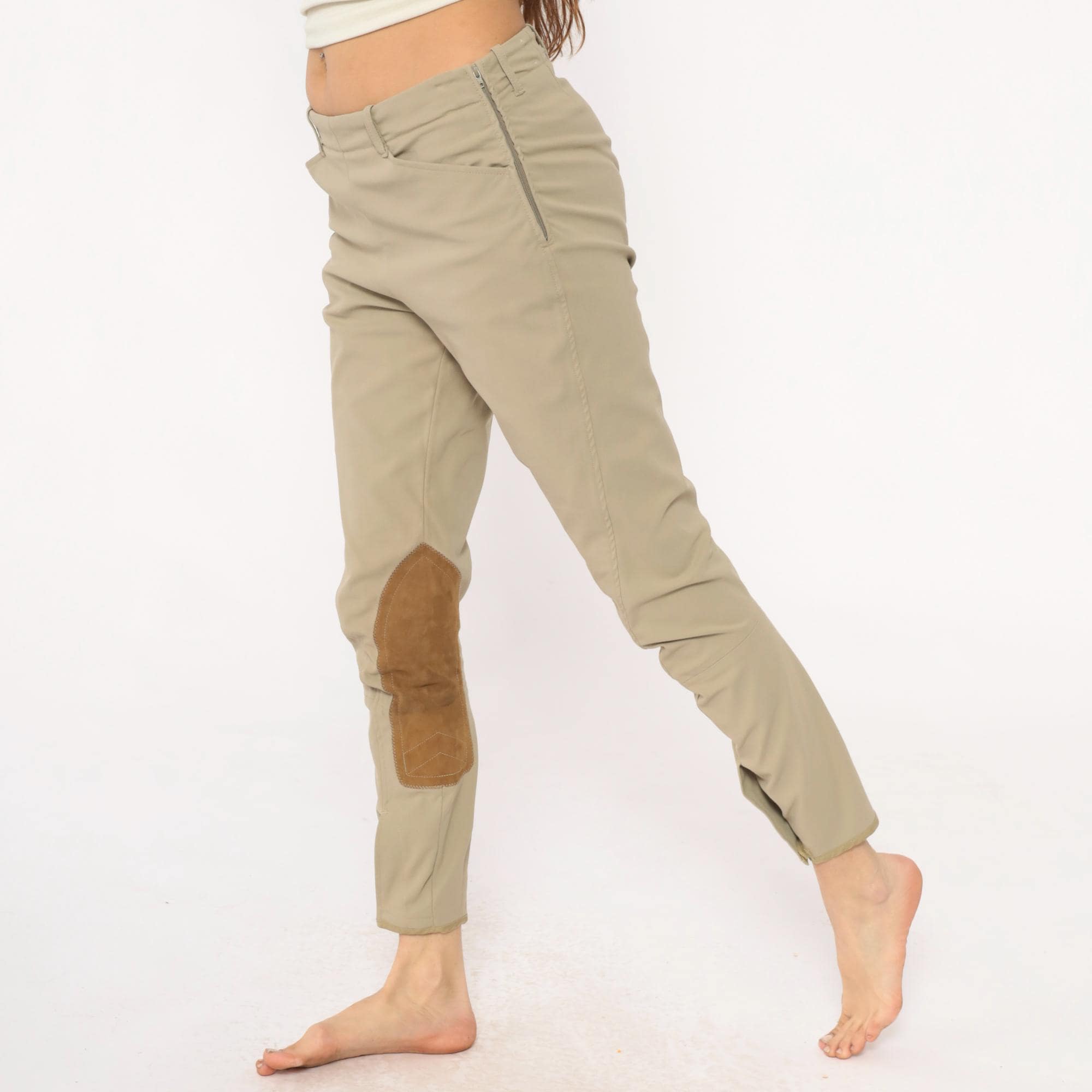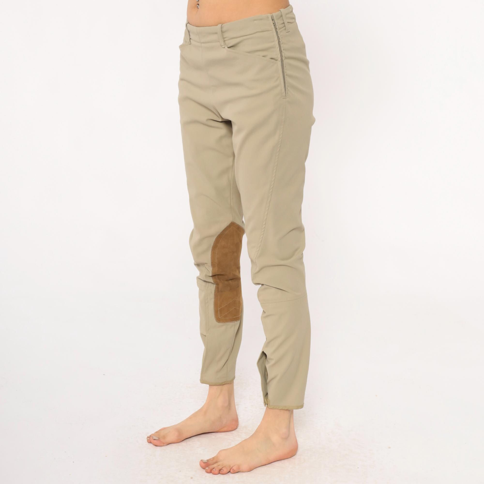 80s beige riding breeches from the tailored sportsman with tan suede knee patches extending down the inner calves. Front zipper fly, belt loops at waist, tapered ankle-length legs.