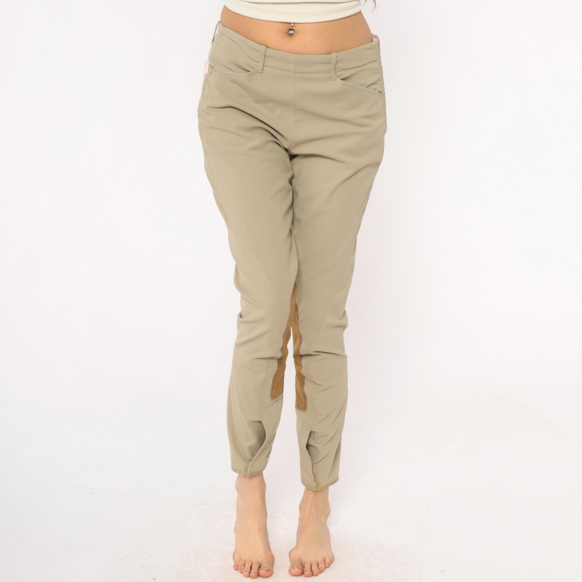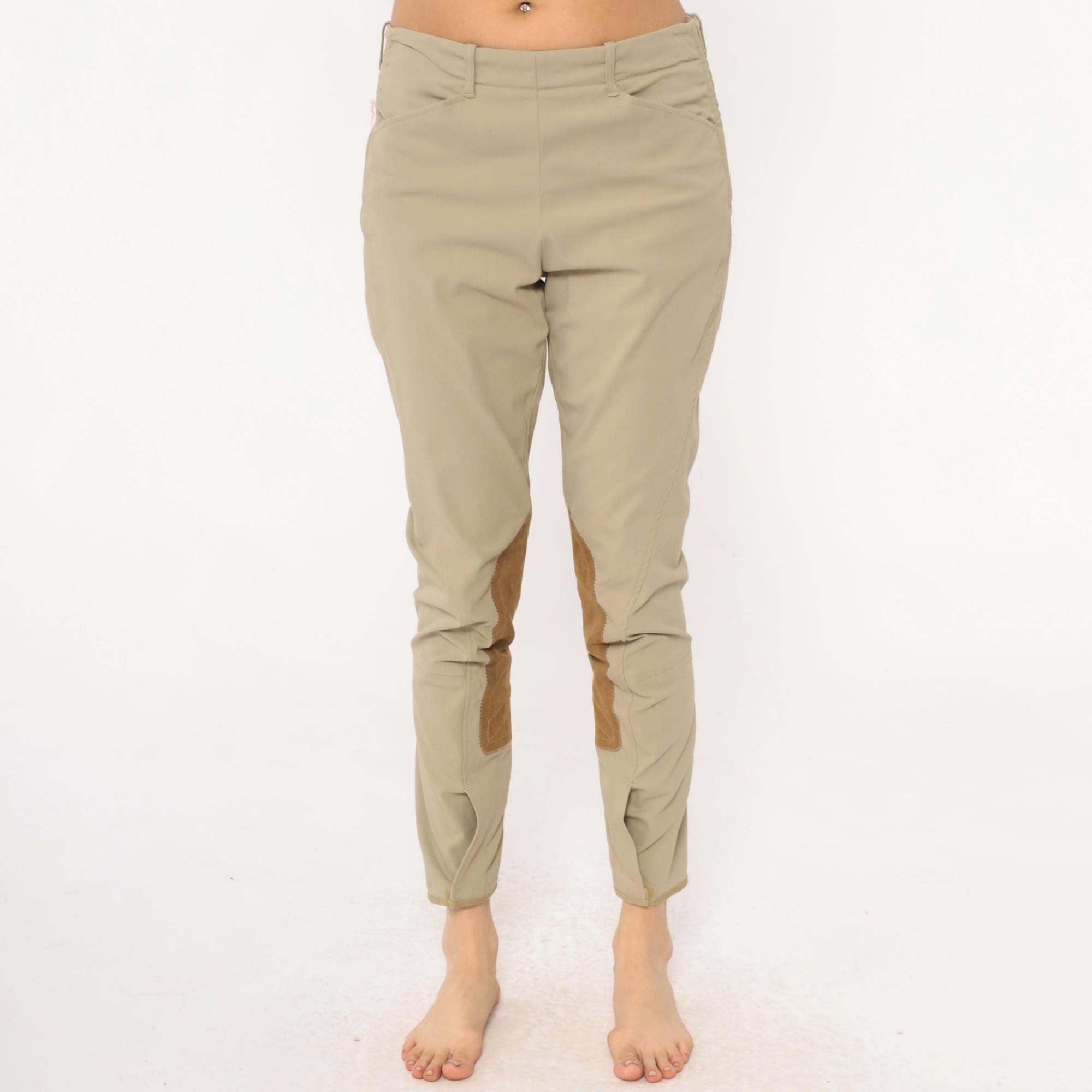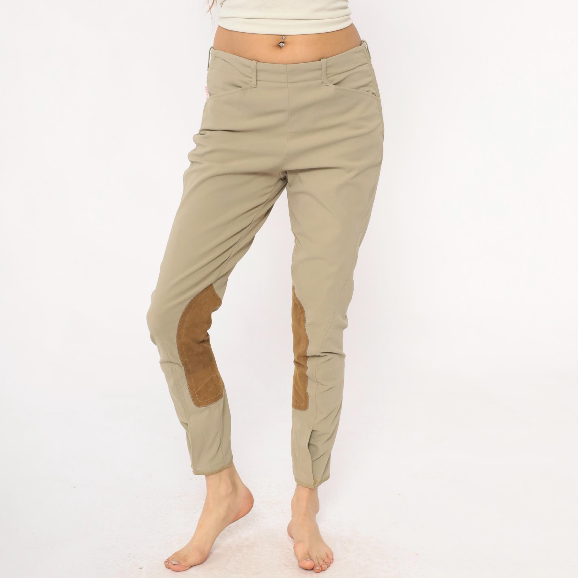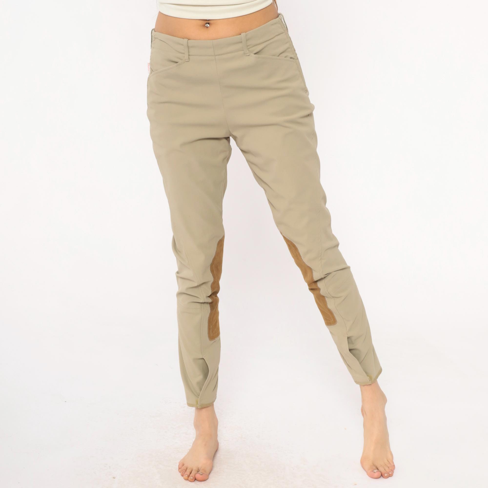 80s beige riding breeches from the tailored sportsman with tan suede knee patches extending down the inner calves. Front zipper fly, belt loops at waist, tapered ankle-length legs.