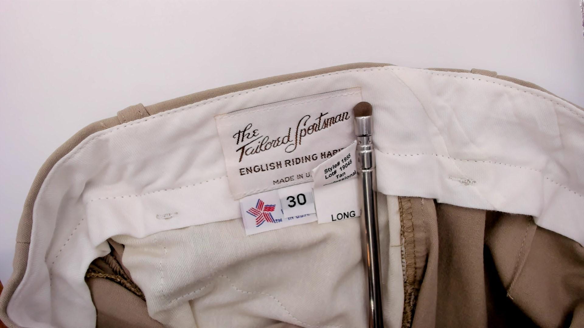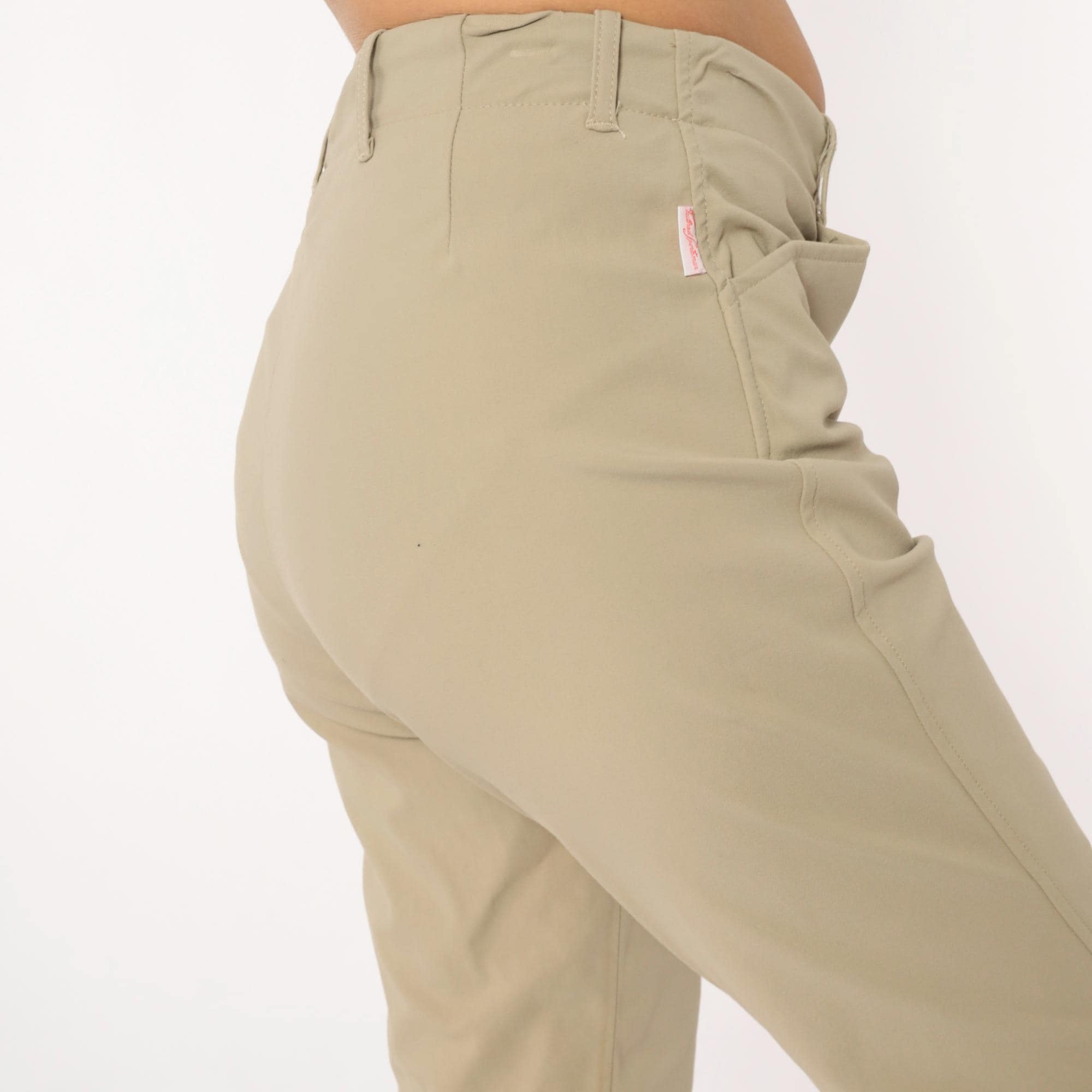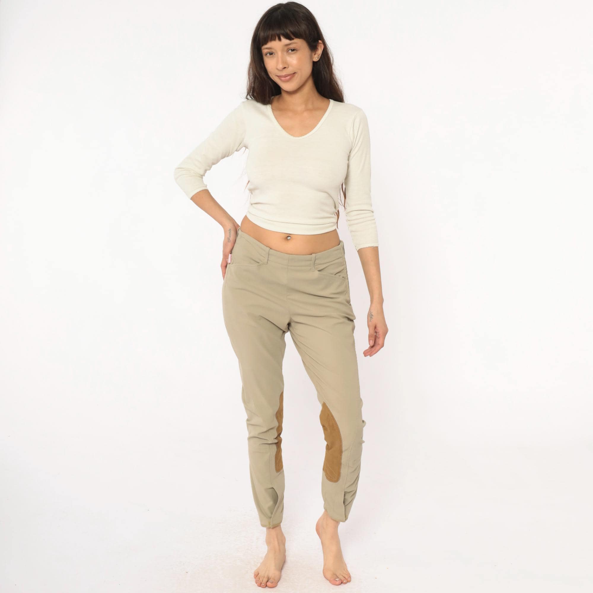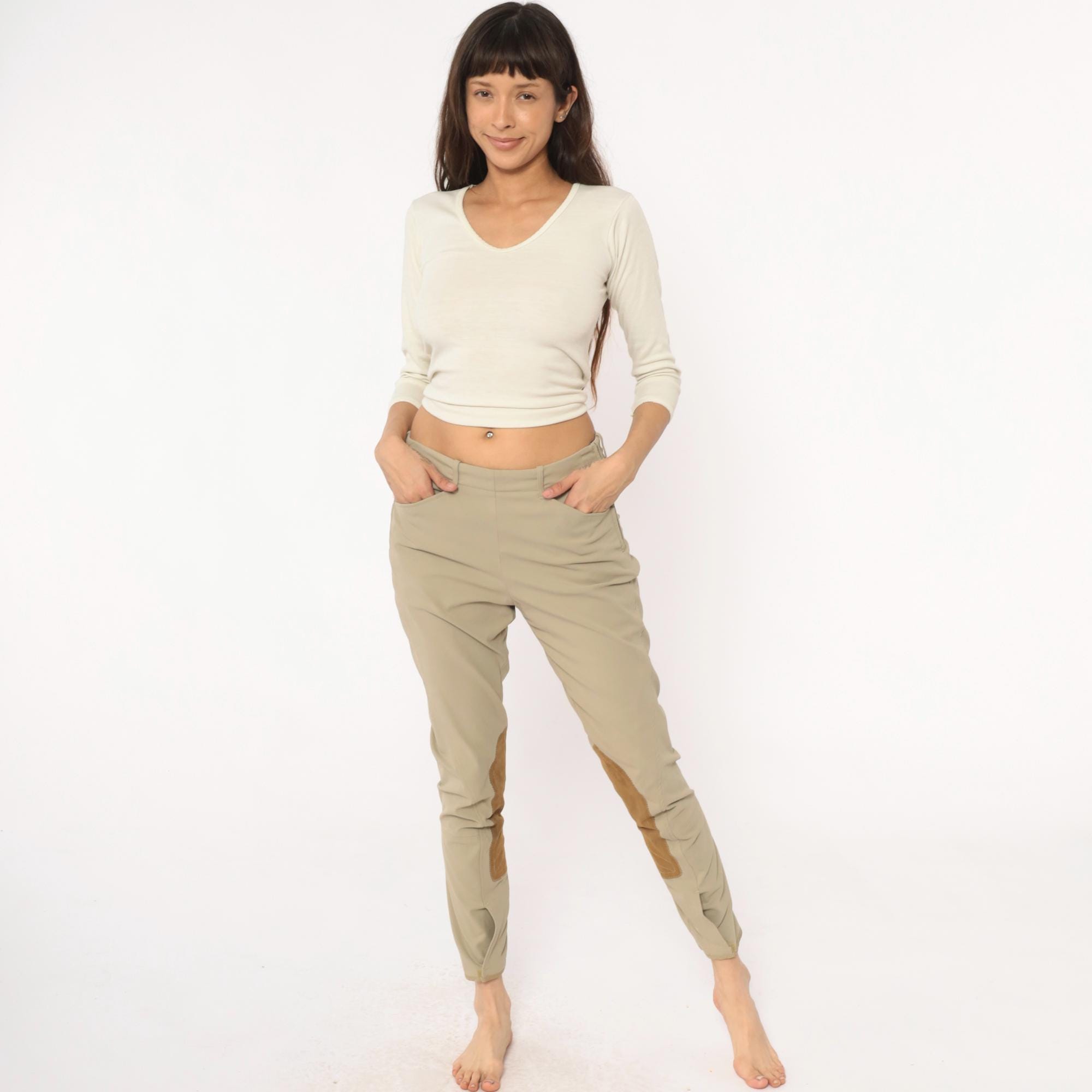 80s beige riding breeches from the tailored sportsman with tan suede knee patches extending down the inner calves. Front zipper fly, belt loops at waist, tapered ankle-length legs.