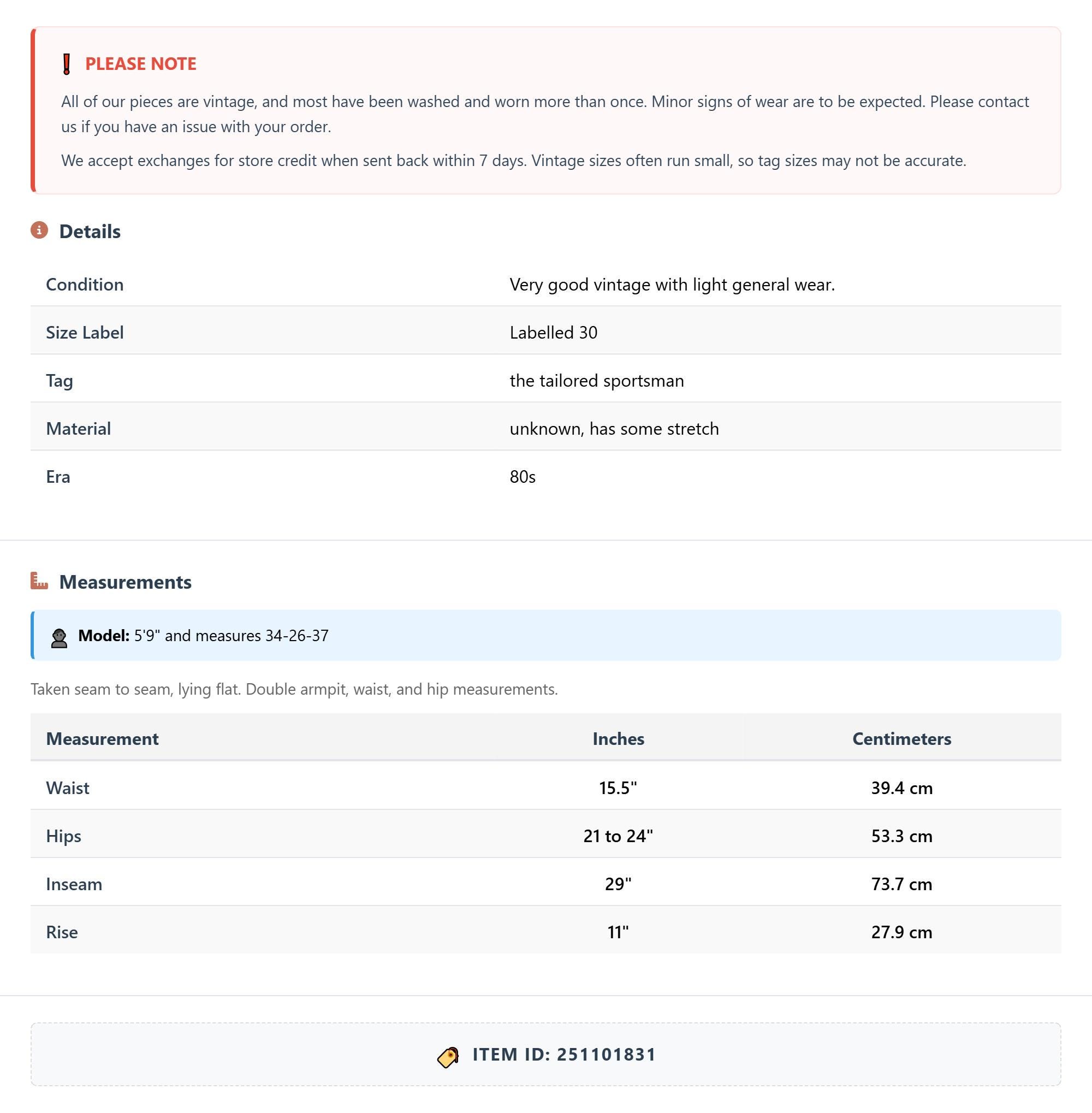 Vintage denim was usually made without any stretch, unlike modern jeans. Check the measurements to ensure proper fit, and remember to give yourself a little wiggle room in the waist and hips, depending on your preferred fit.