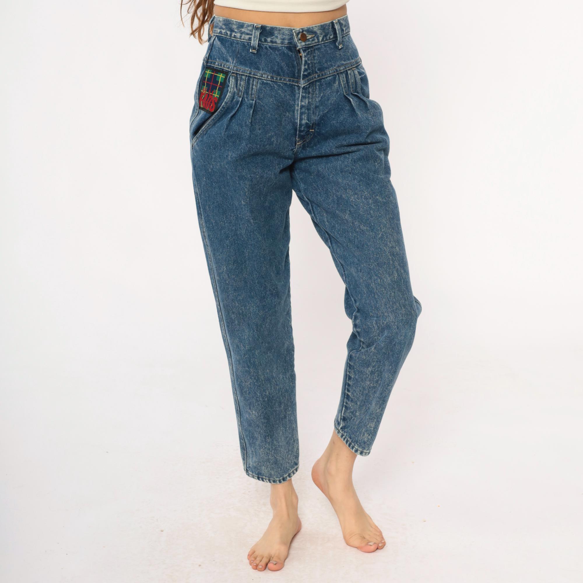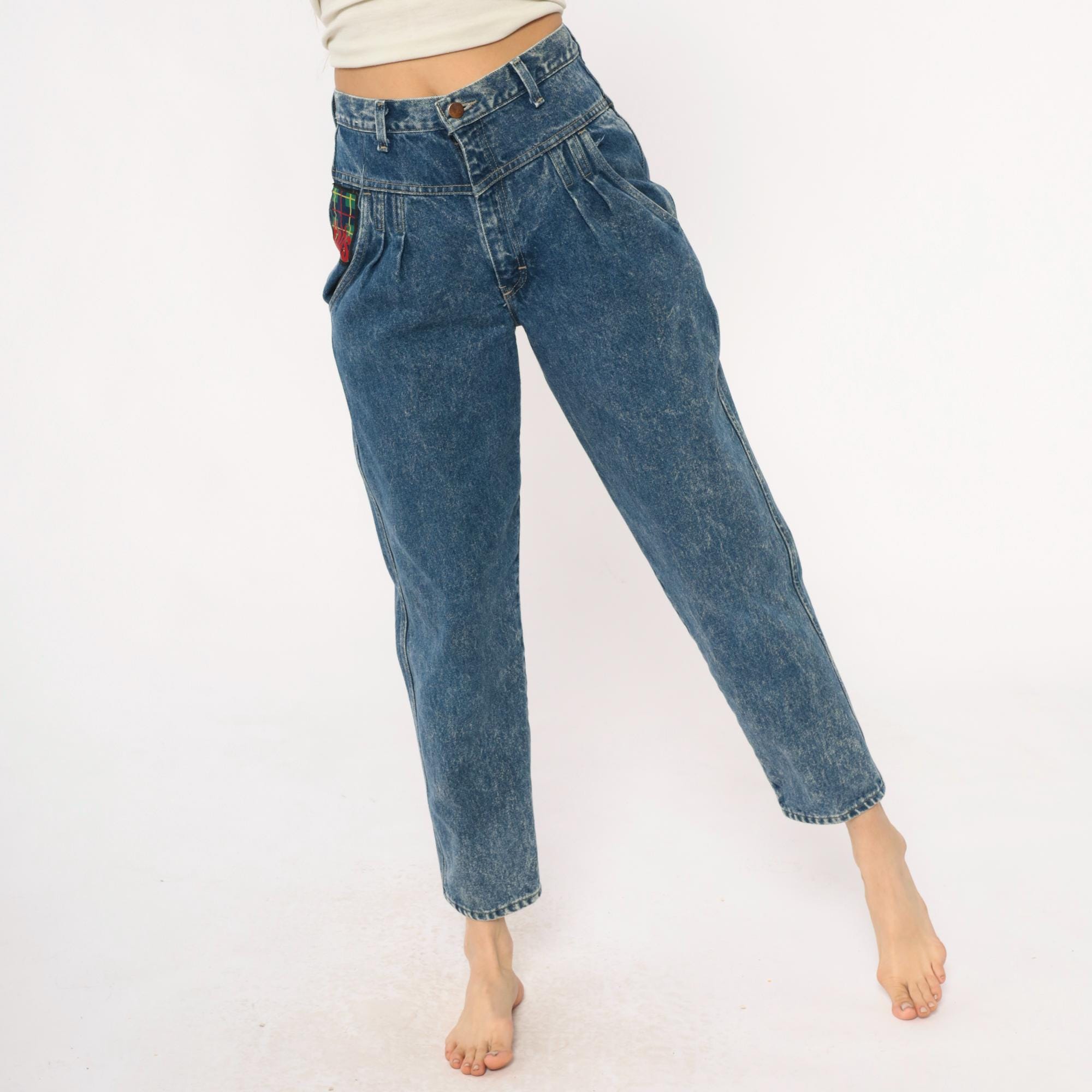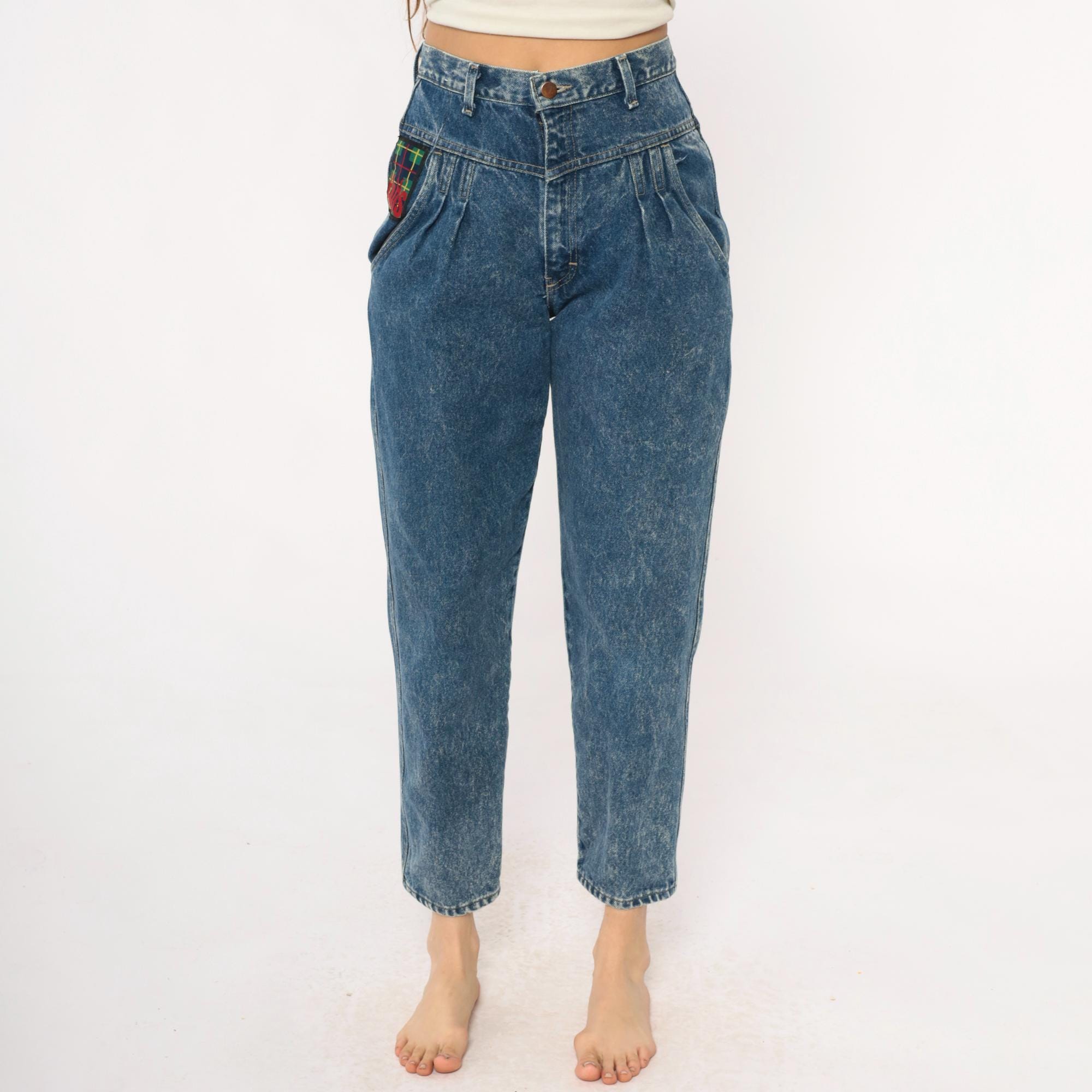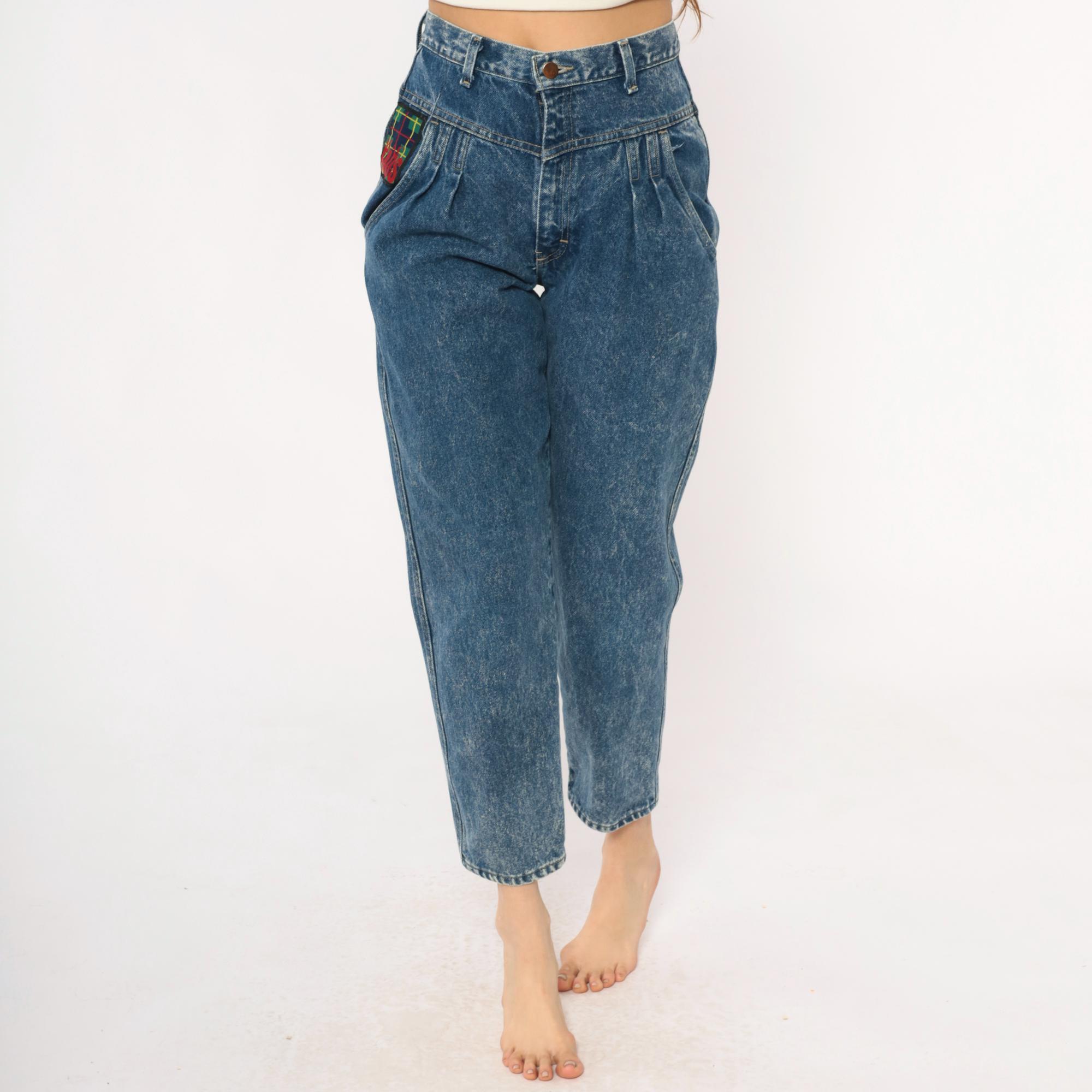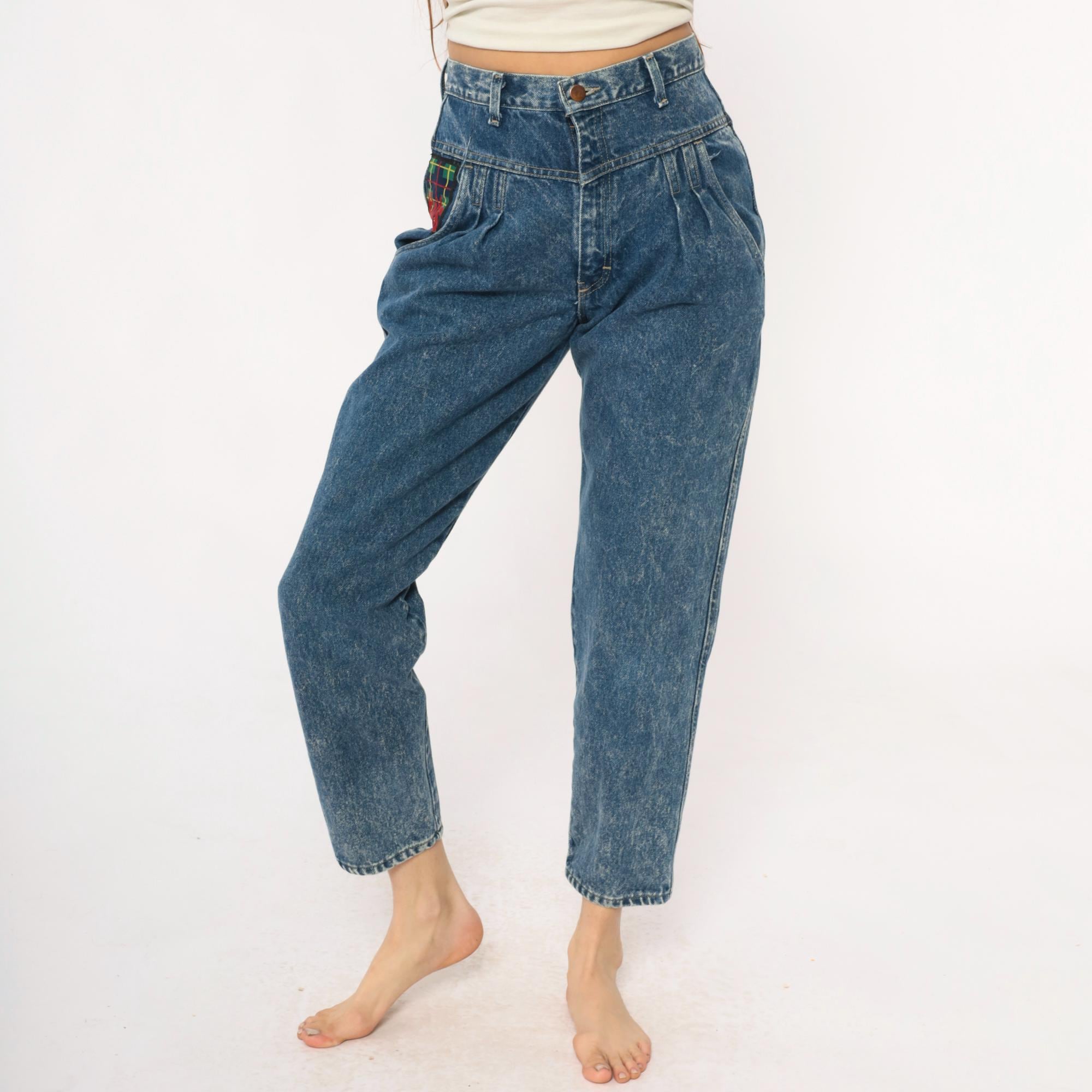 90s acid wash denim jeans from mac fads with high waisted pleated front and colorful plaid brand label patch on front pocket. Tapered straight leg silhouette with medium blue stonewash finish throughout. Front fly closure with button waist.