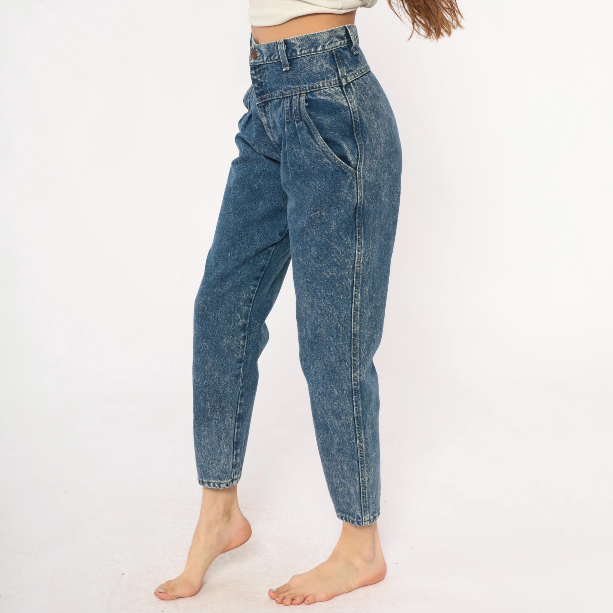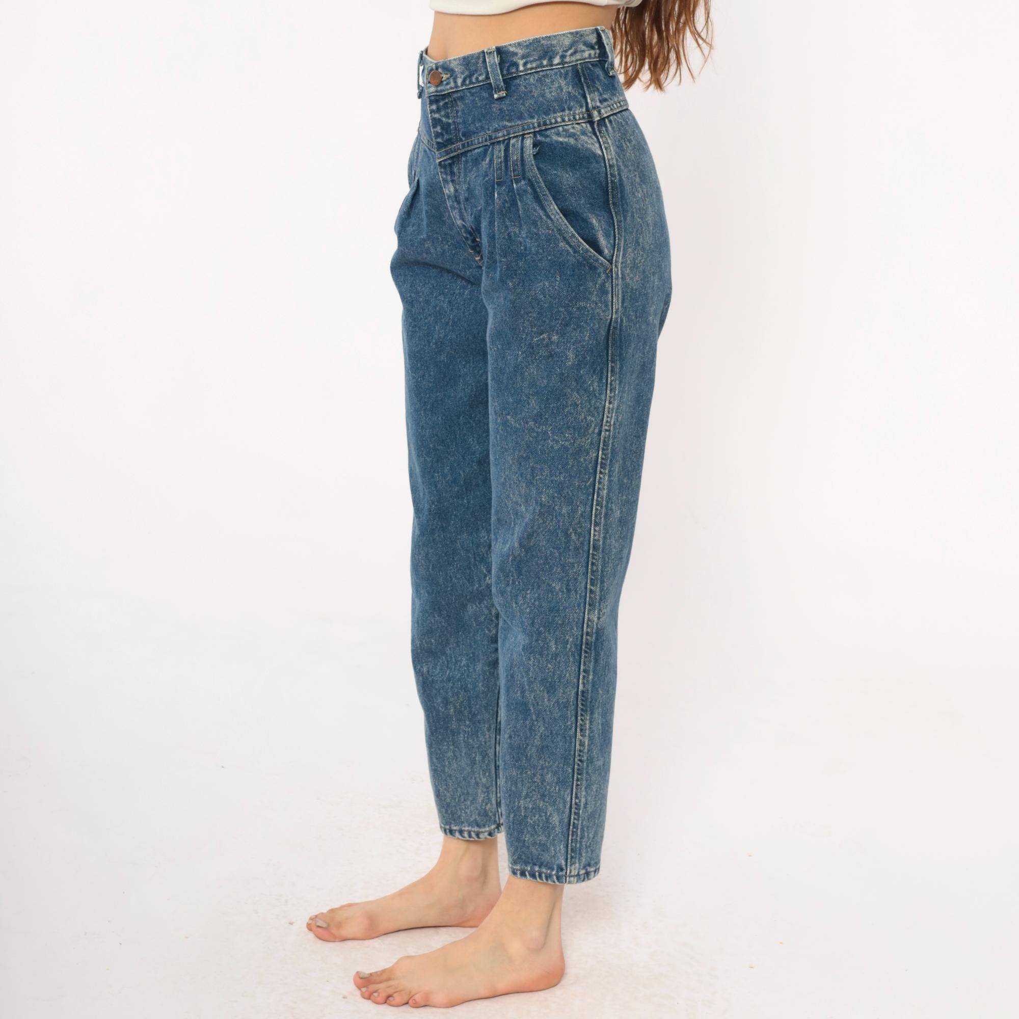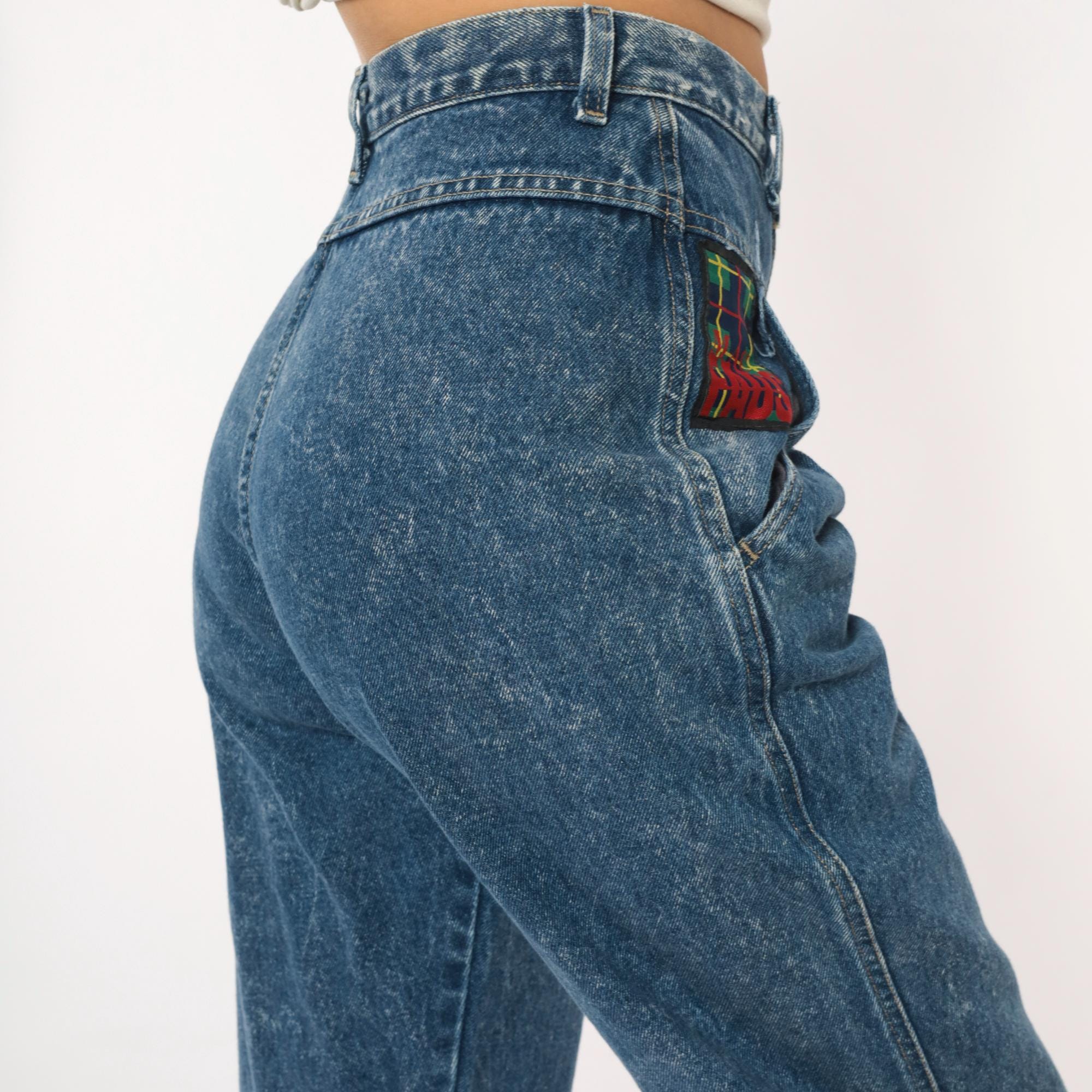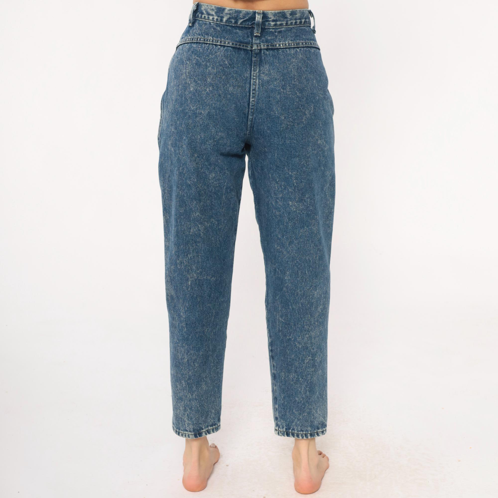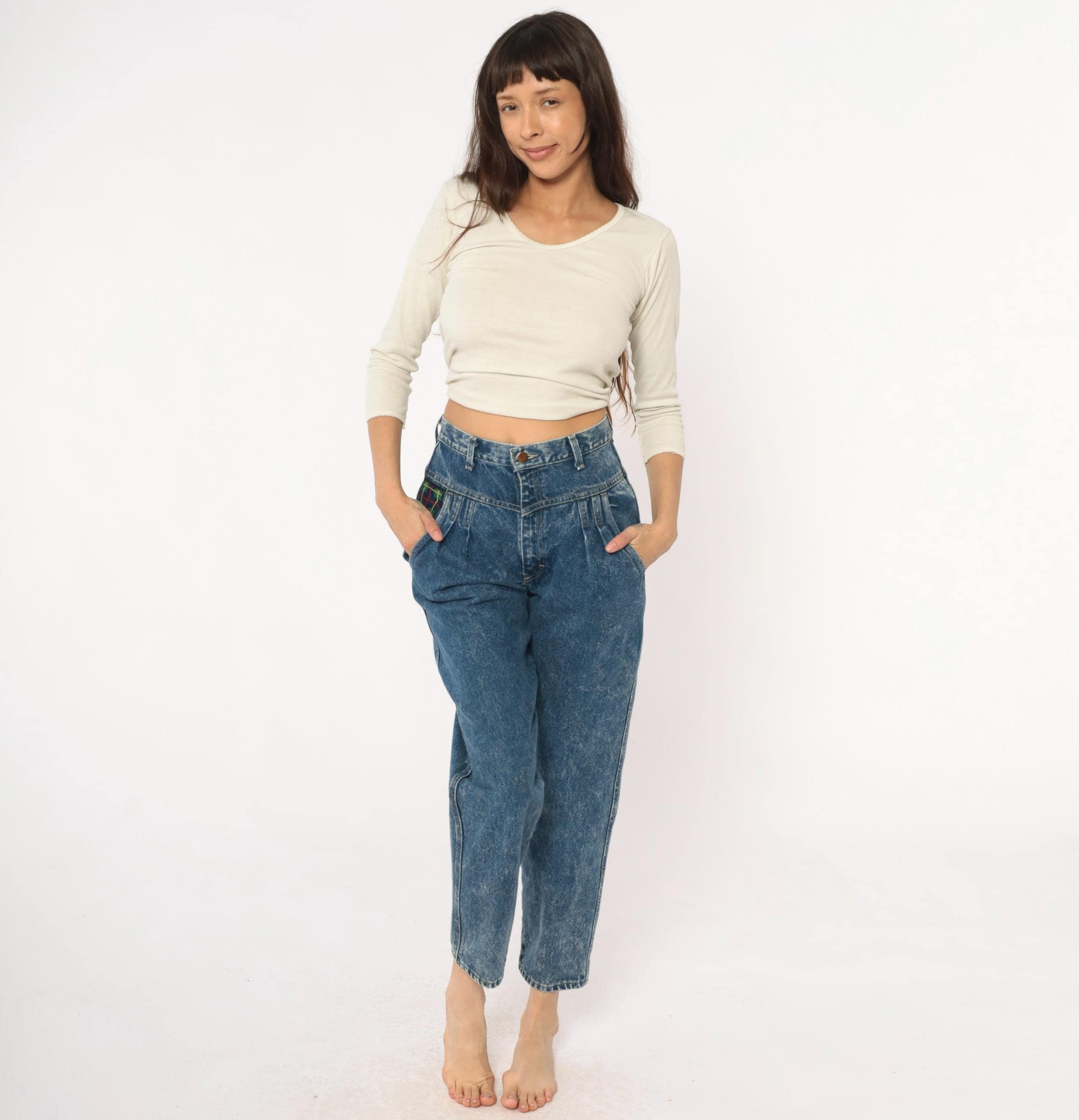 90s acid wash denim jeans from mac fads with high waisted pleated front and colorful plaid brand label patch on front pocket. Tapered straight leg silhouette with medium blue stonewash finish throughout. Front fly closure with button waist.