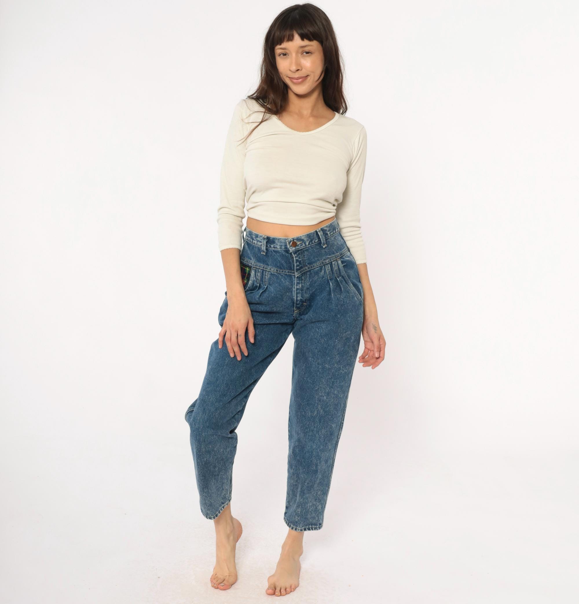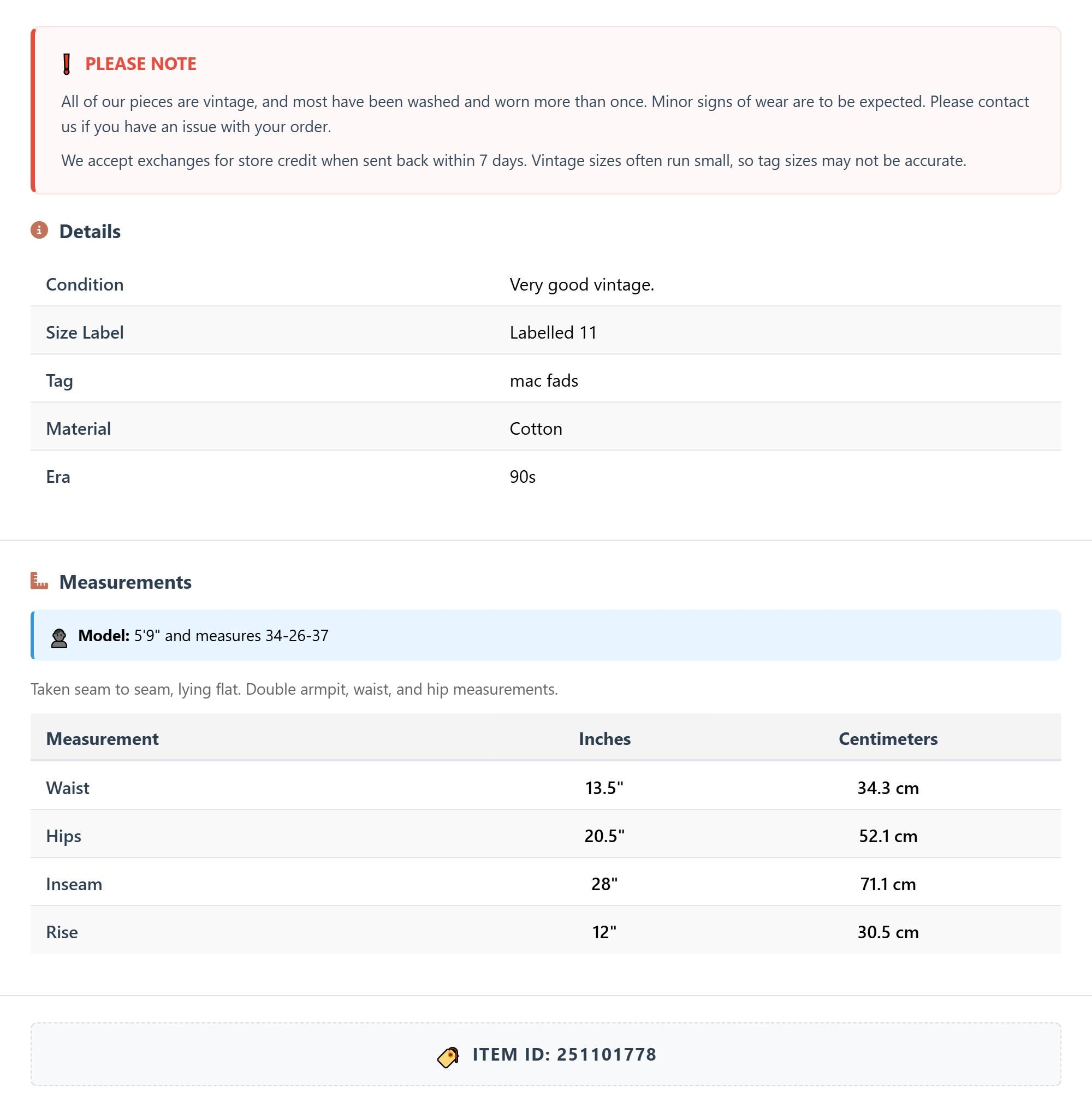 Vintage denim was usually made without any stretch, unlike modern jeans. Check the measurements to ensure proper fit, and remember to give yourself a little wiggle room in the waist and hips, depending on your preferred fit.