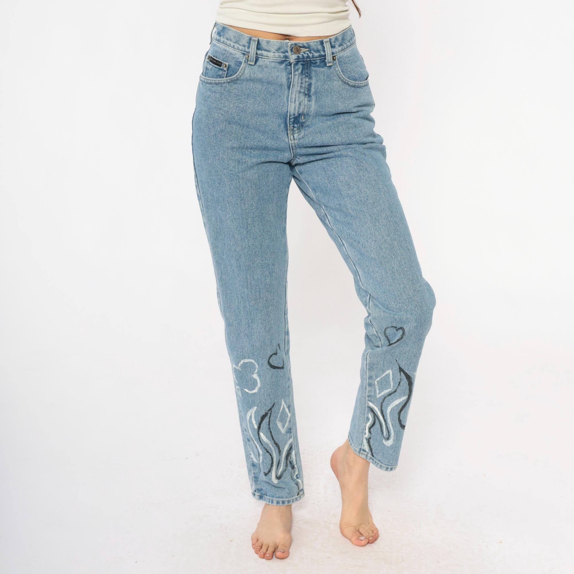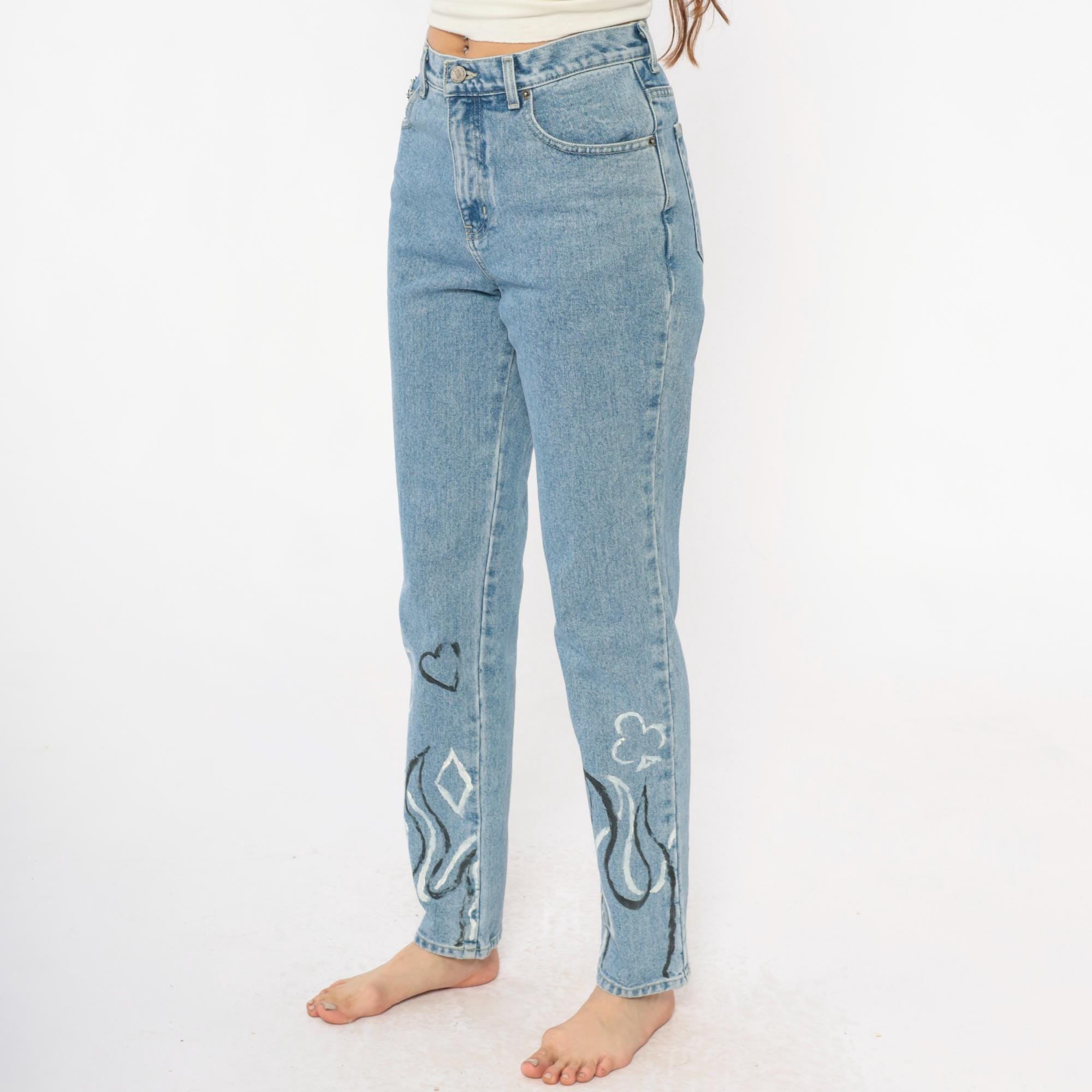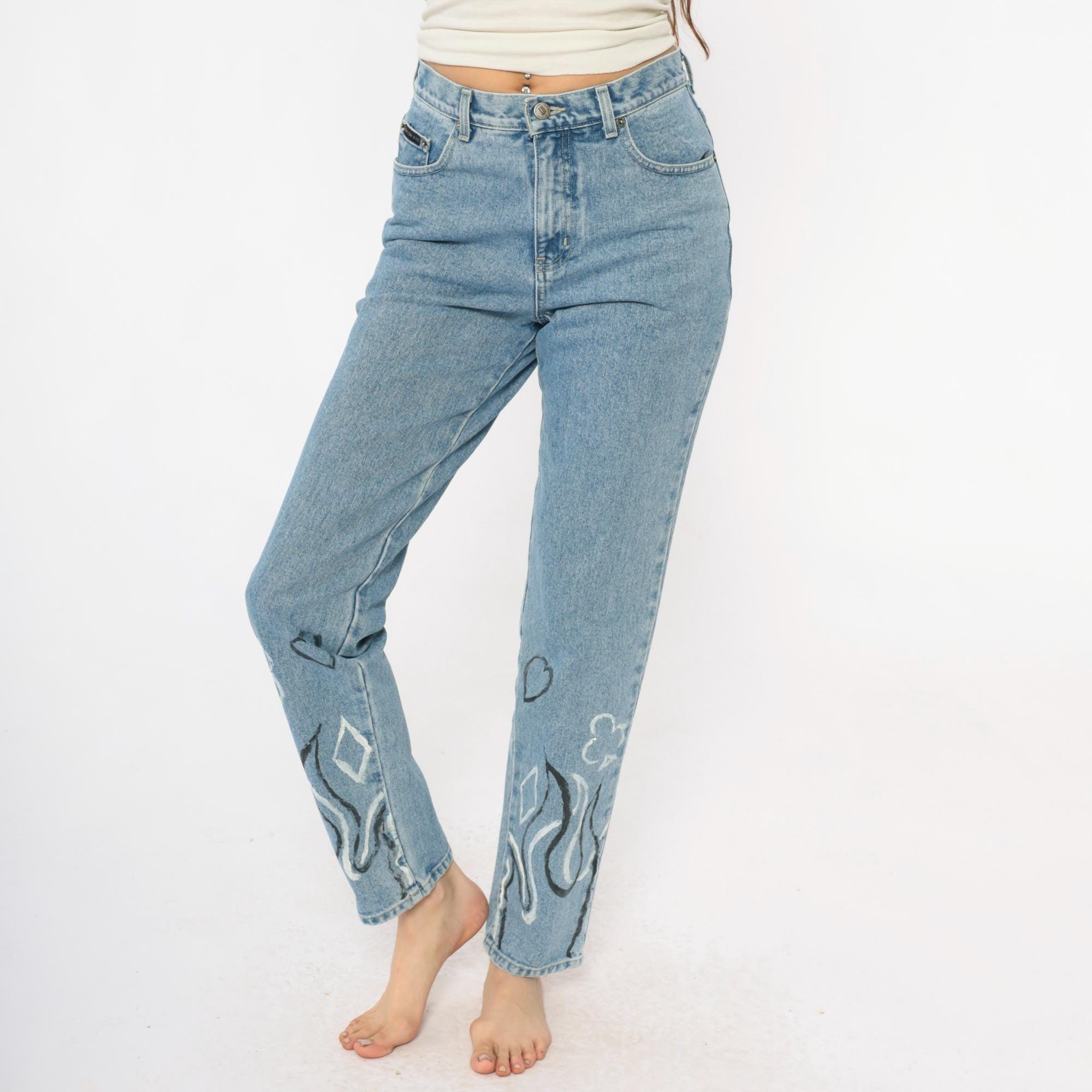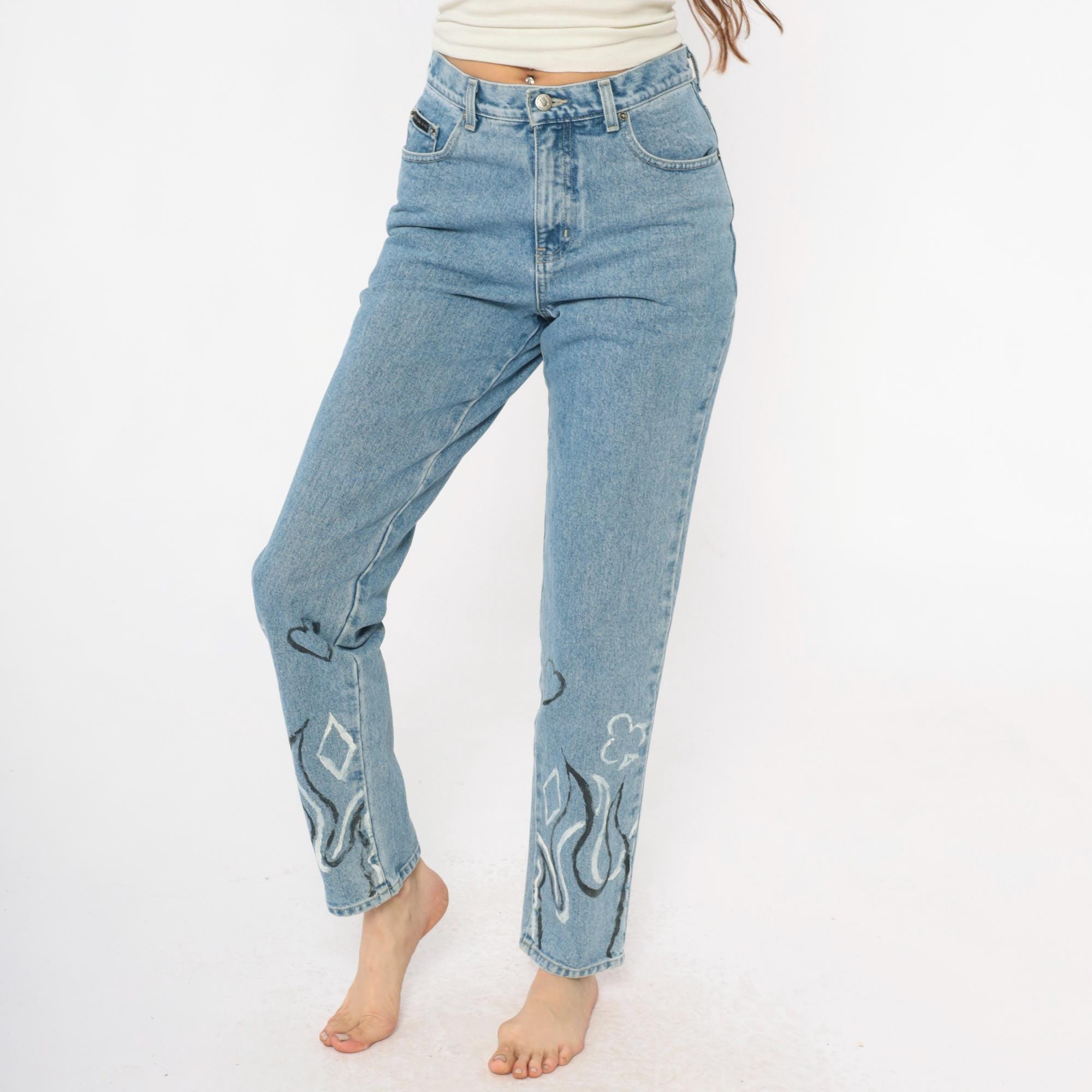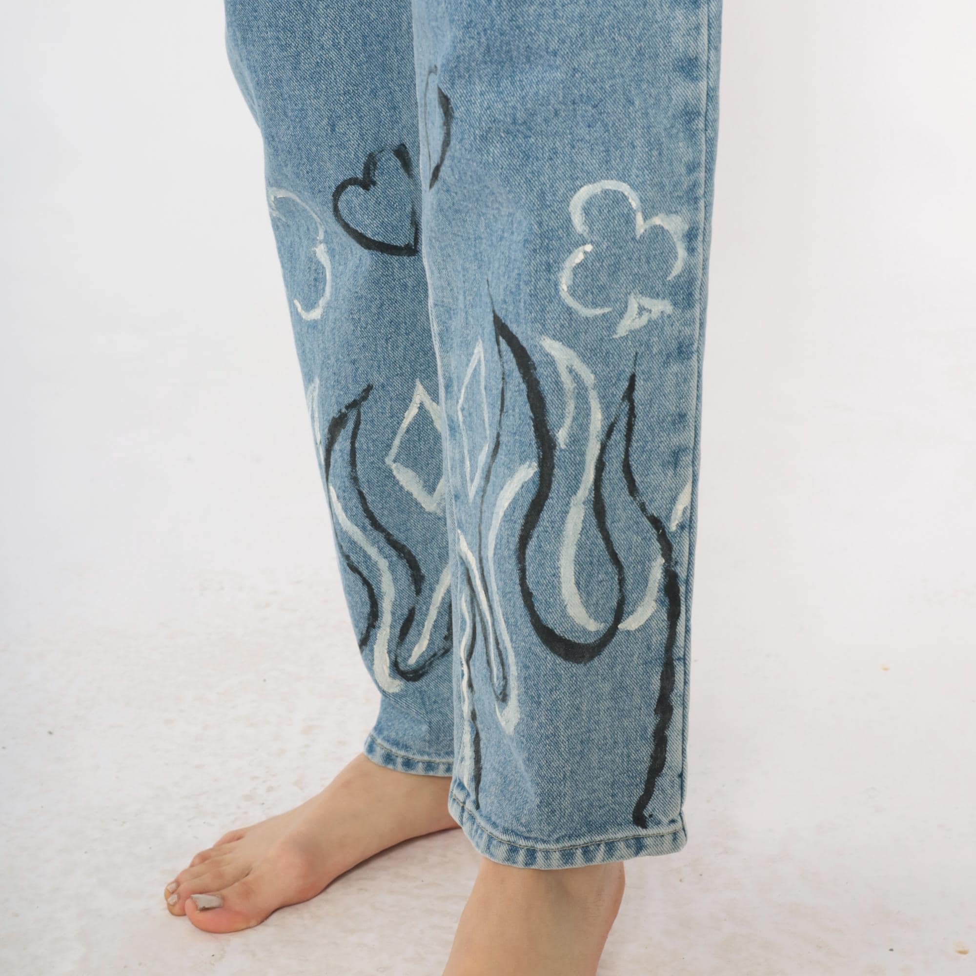 Y2K light wash blue jeans with hand-painted black and white flame designs at the lower legs, painted hearts and circular motifs above. High-waisted straight leg fit with button fly closure and five-pocket styling