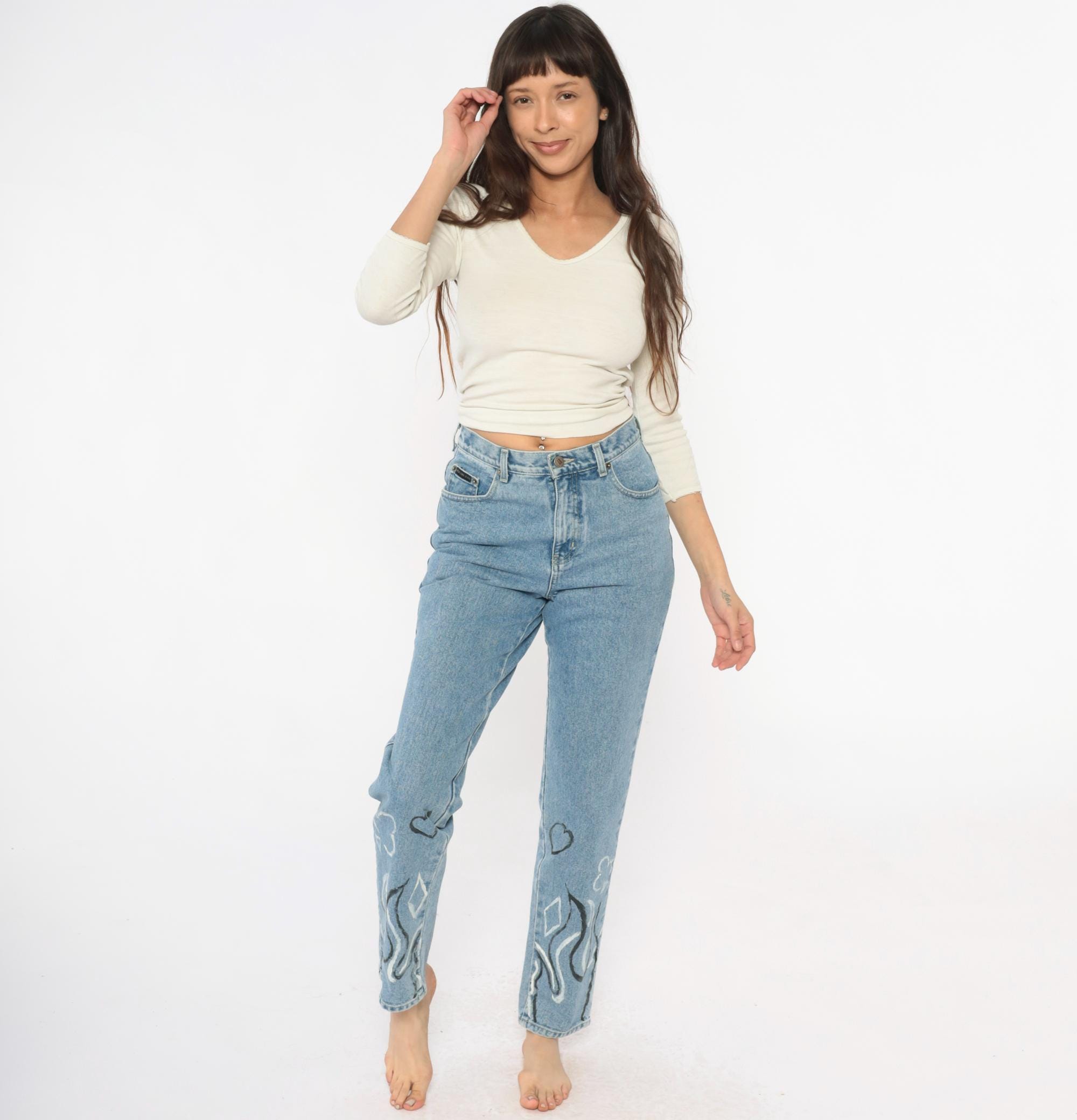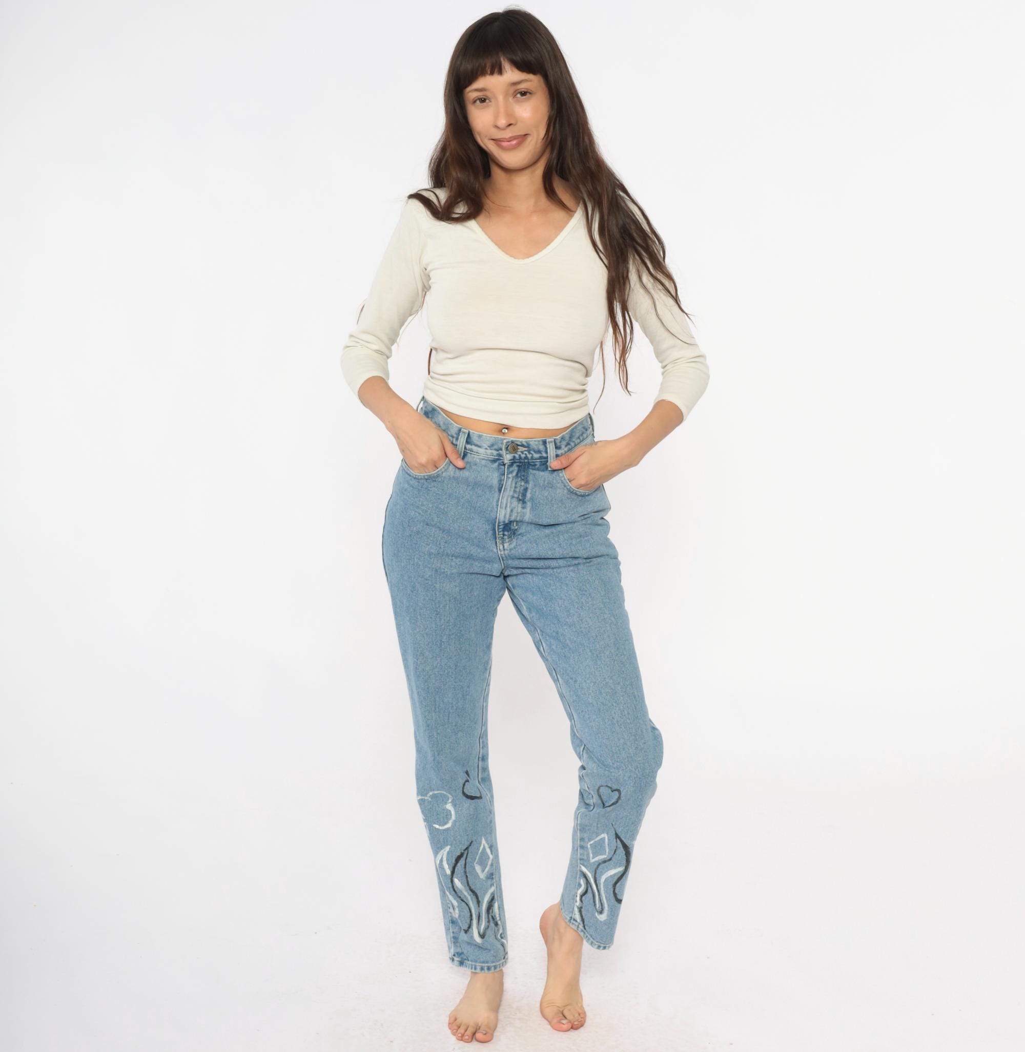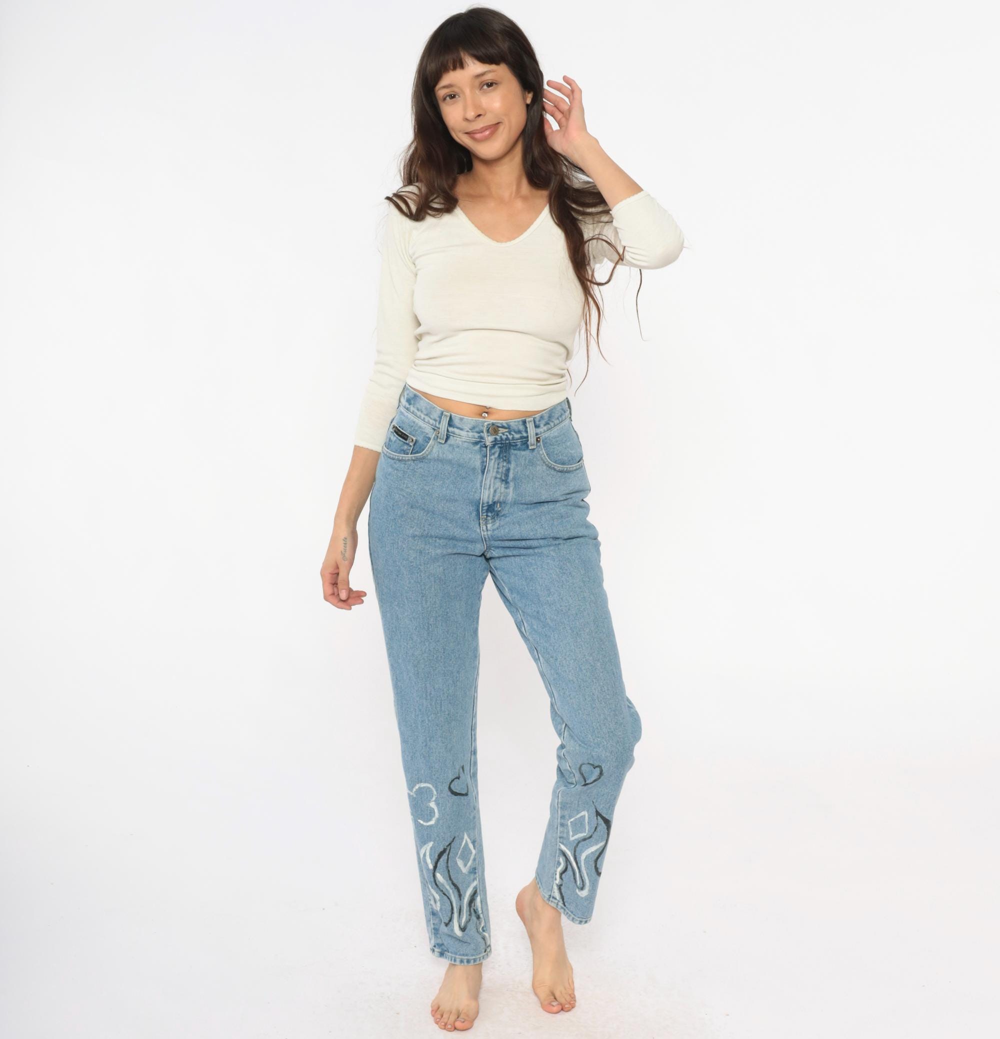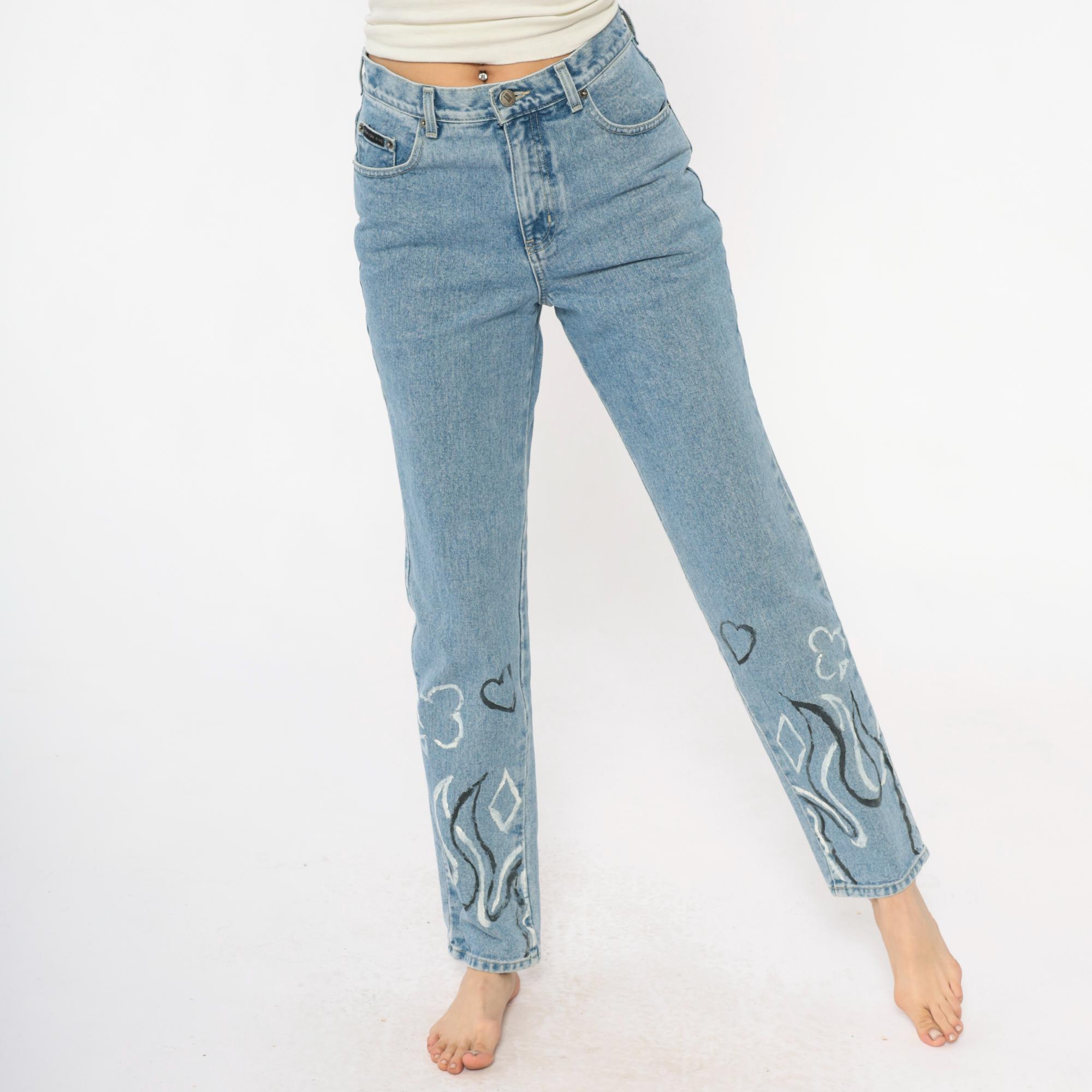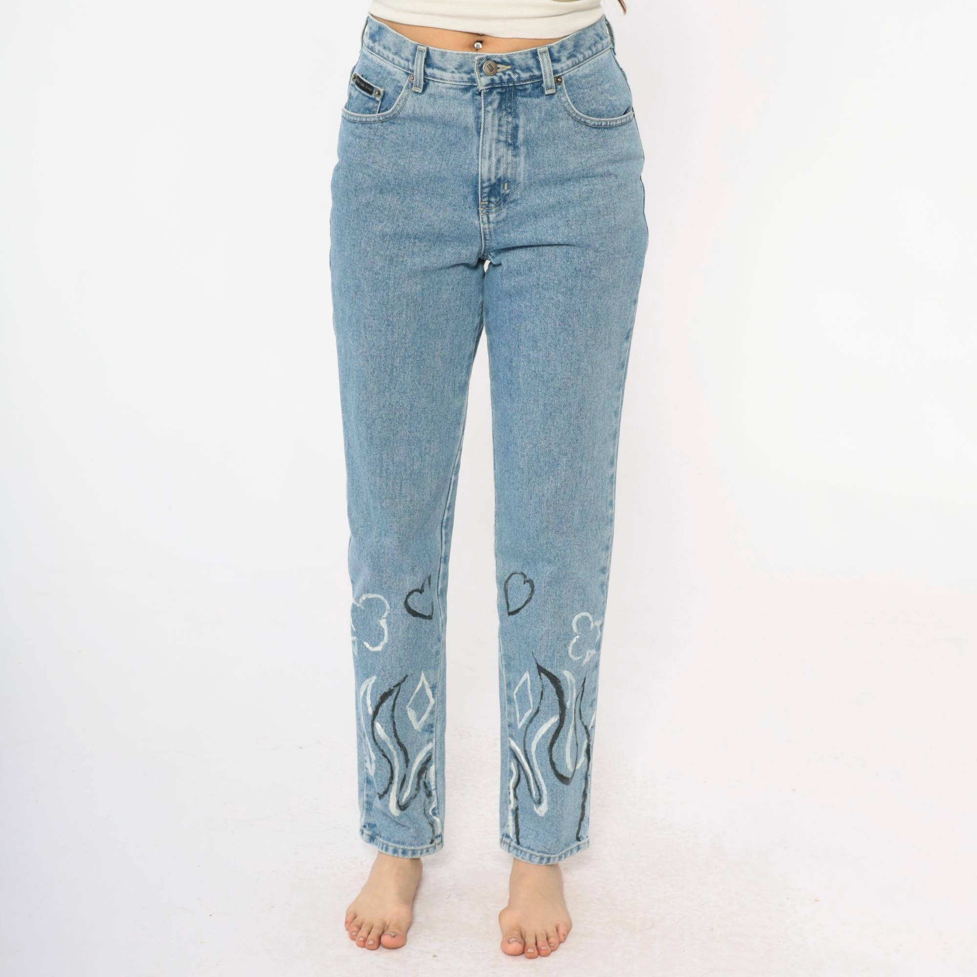 Y2K light wash blue jeans with hand-painted black and white flame designs at the lower legs, painted hearts and circular motifs above. High-waisted straight leg fit with button fly closure and five-pocket styling