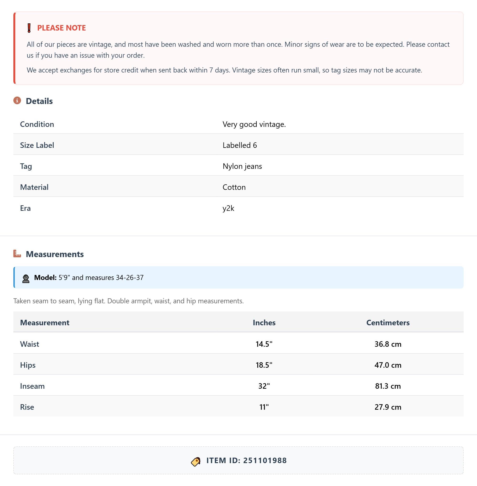 Vintage denim was usually made without any stretch, unlike modern jeans. Check the measurements to ensure proper fit, and remember to give yourself a little wiggle room in the waist and hips, depending on your preferred fit.