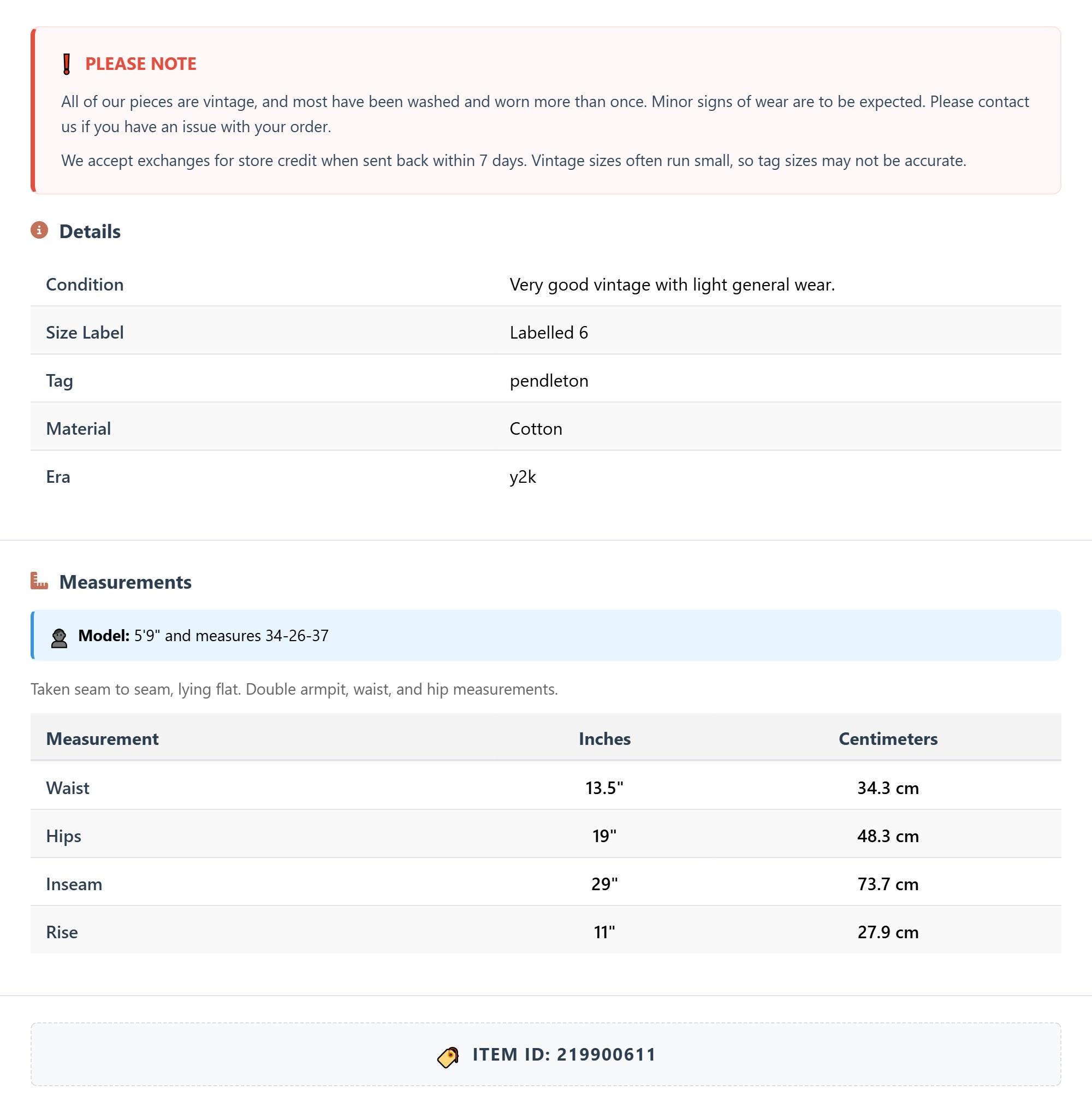 Vintage denim was usually made without any stretch, unlike modern jeans. Check the measurements to ensure proper fit, and remember to give yourself a little wiggle room in the waist and hips, depending on your preferred fit.