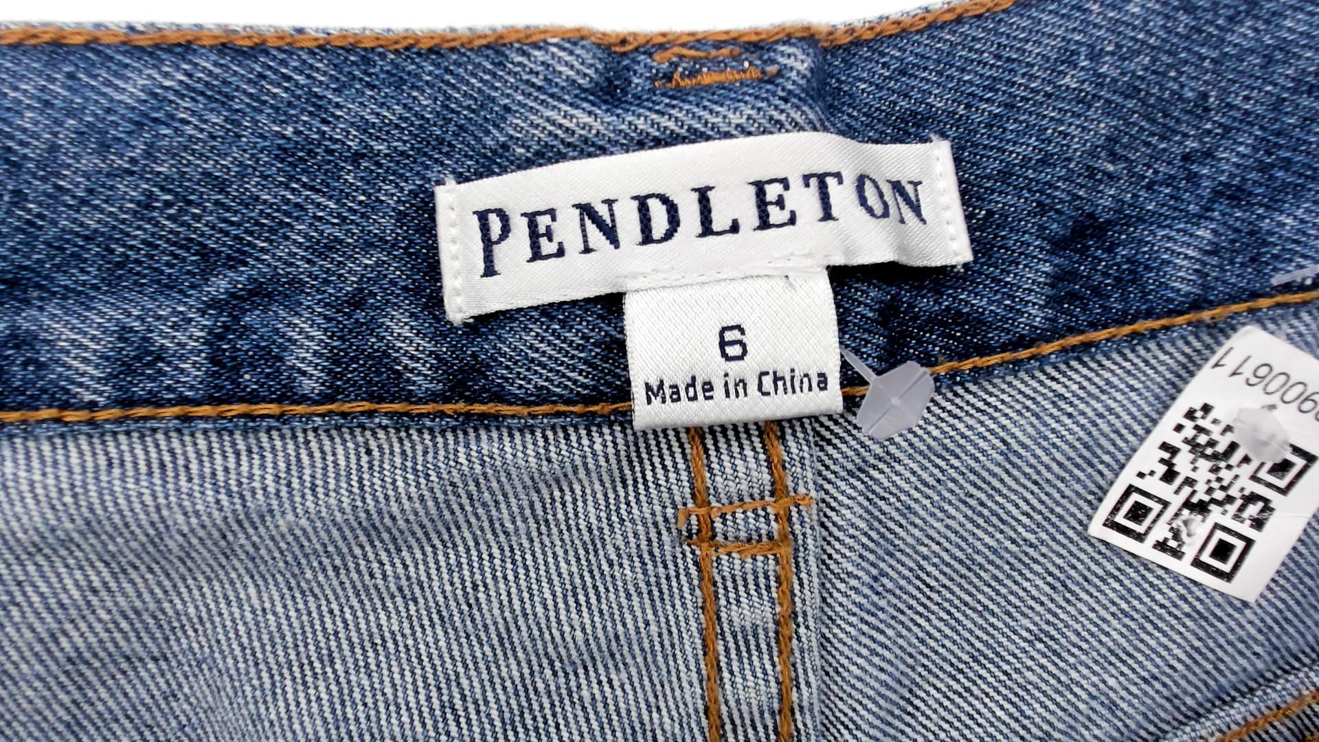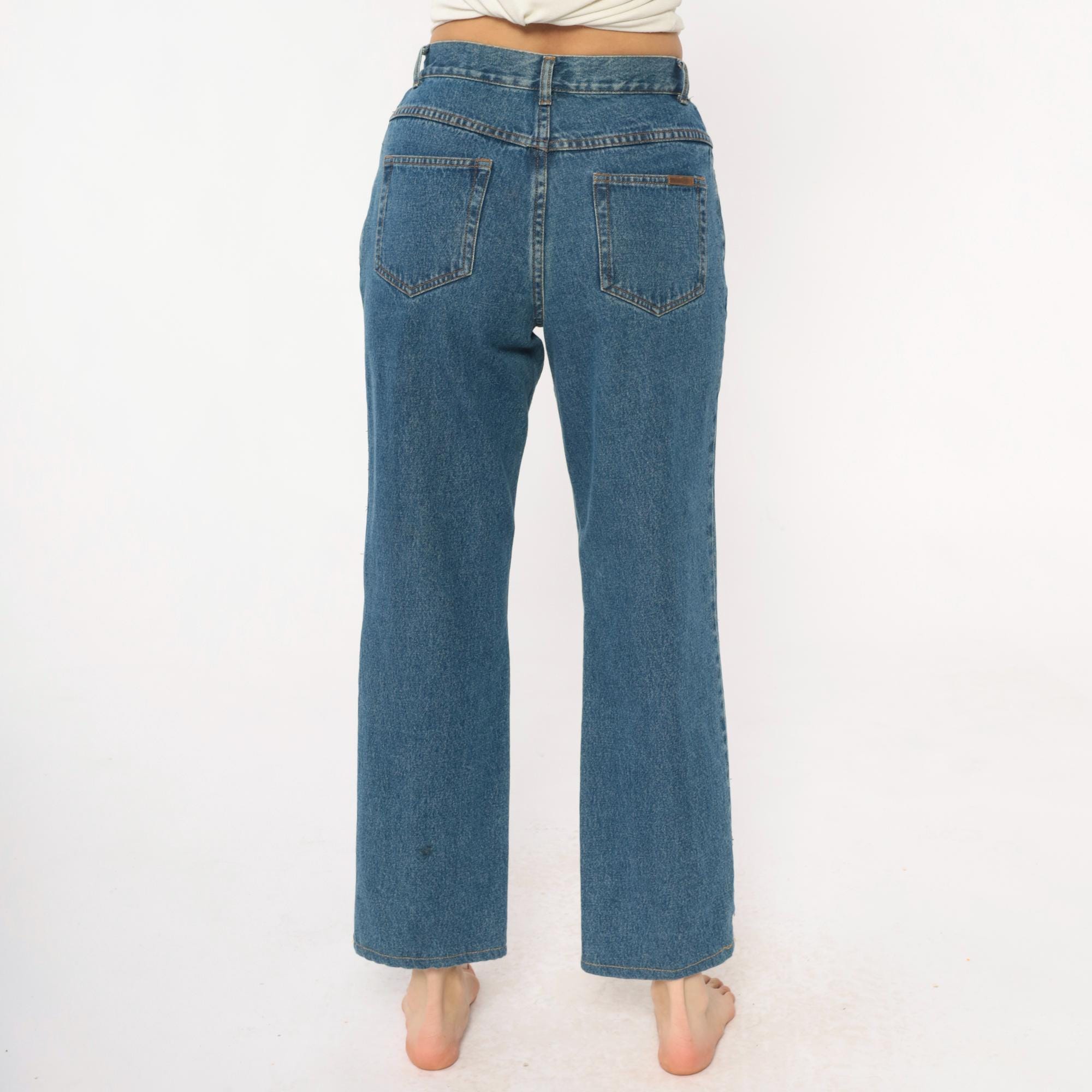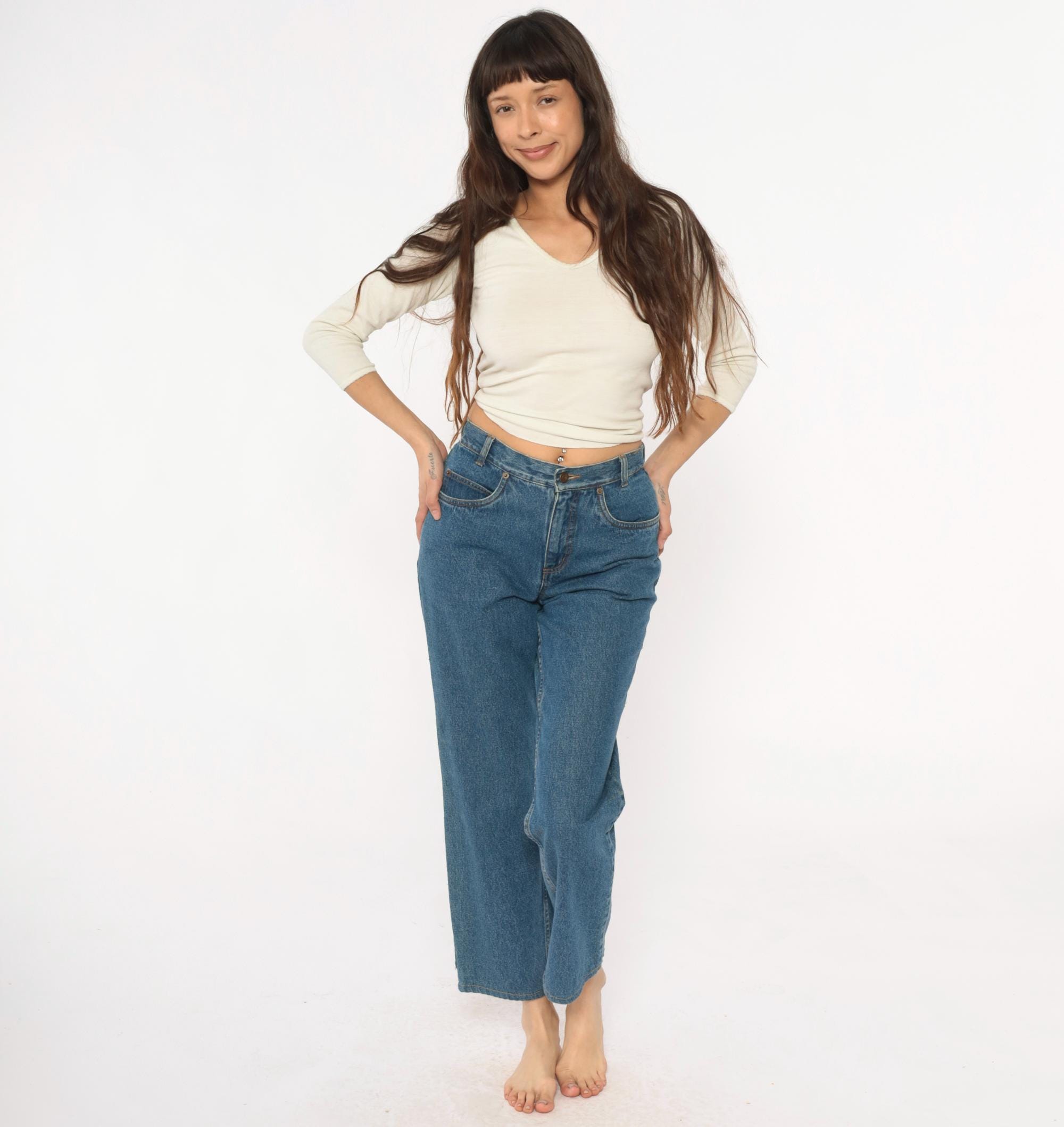 Y2K wide leg jeans from Pendleton in medium blue denim with high waist and cropped length. Five-pocket styling with button fly closure and brown leather Pendleton patch on back waistband.