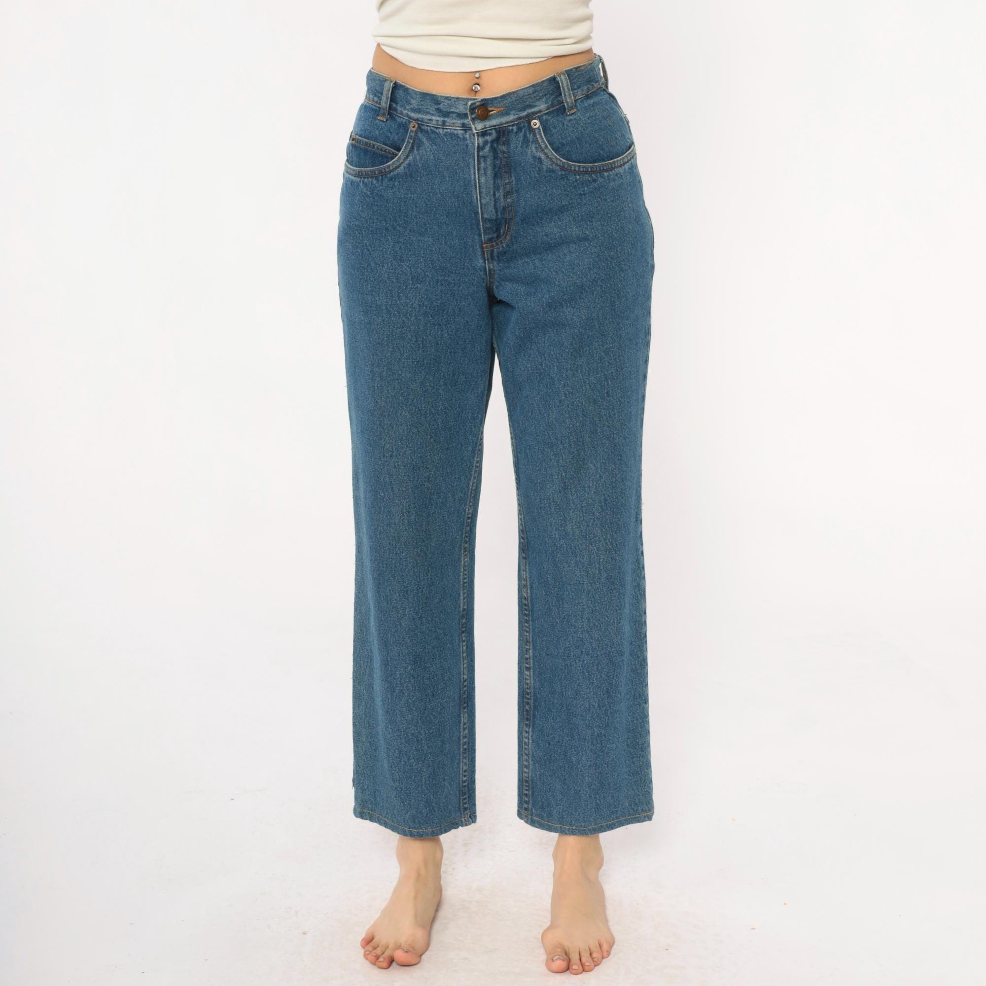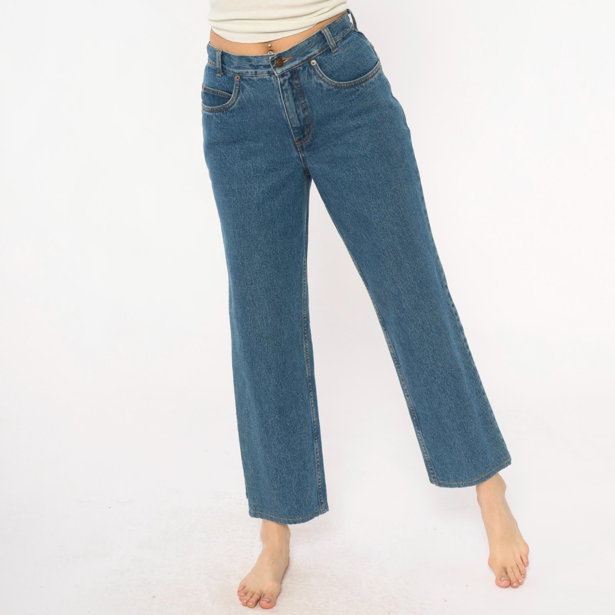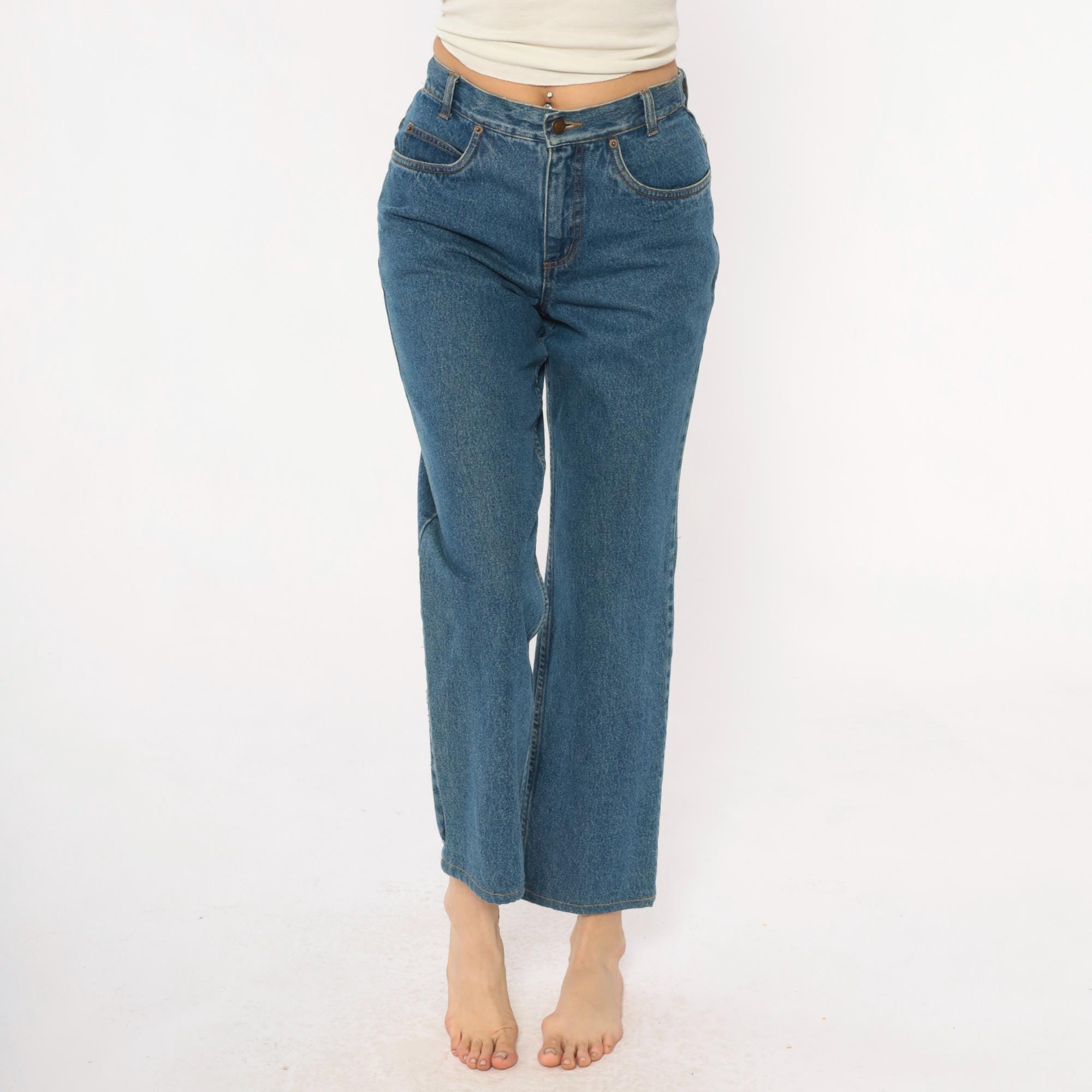 Y2K wide leg jeans from Pendleton in medium blue denim with high waist and cropped length. Five-pocket styling with button fly closure and brown leather Pendleton patch on back waistband.