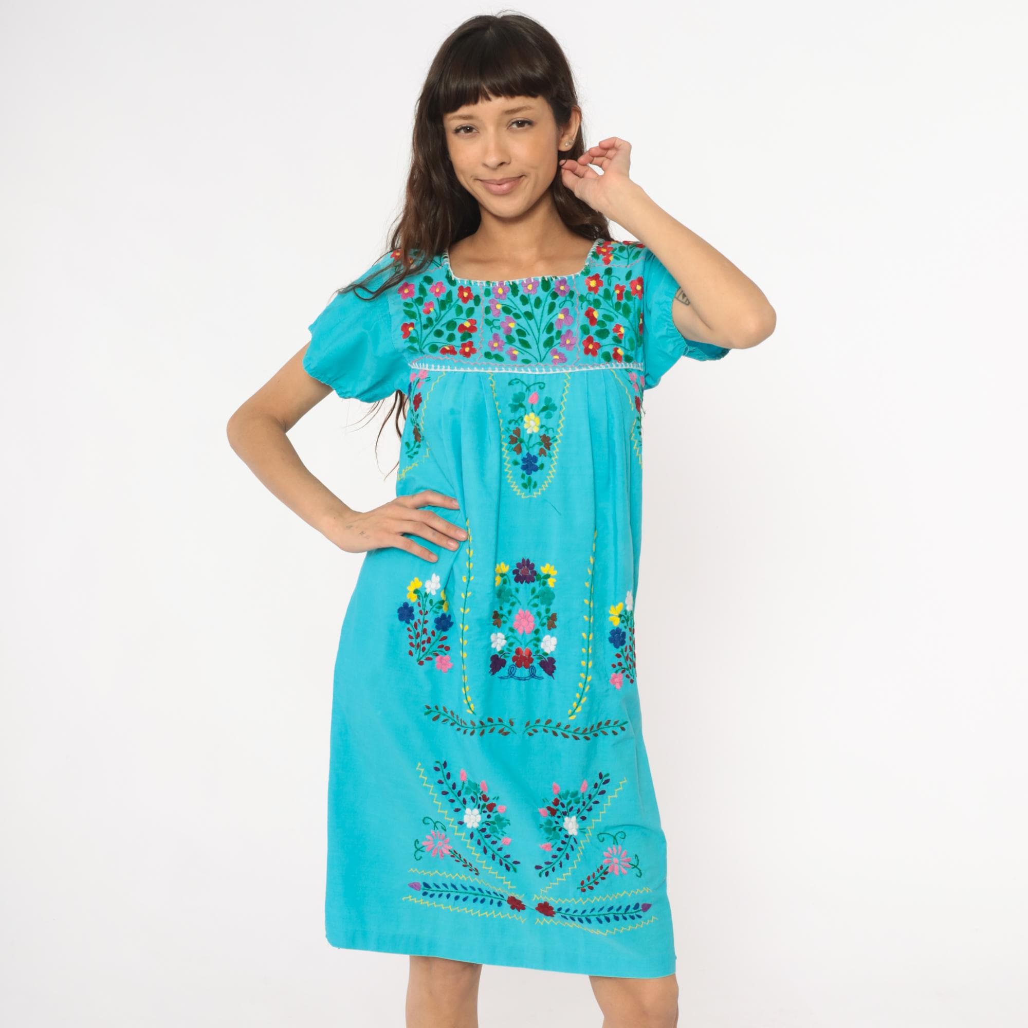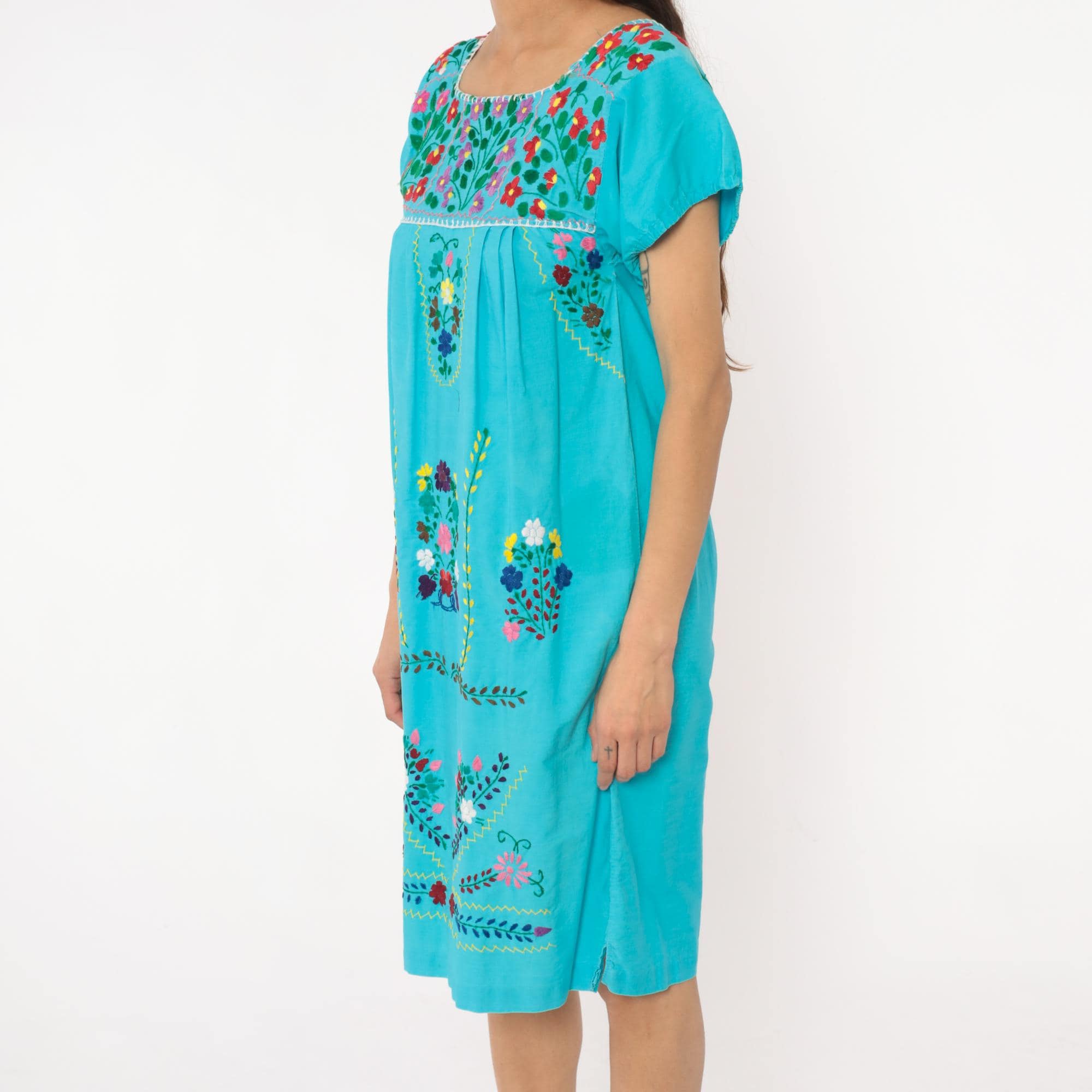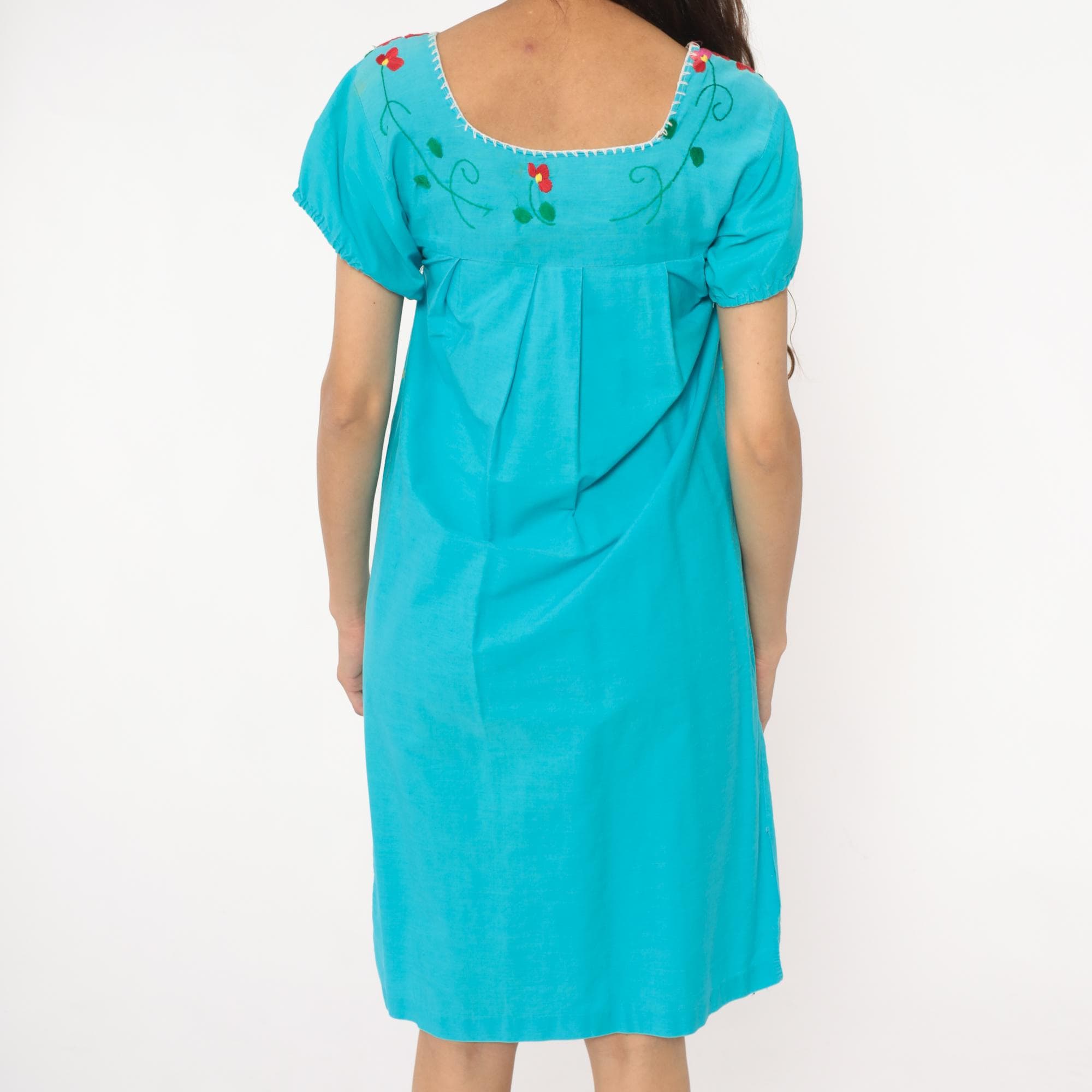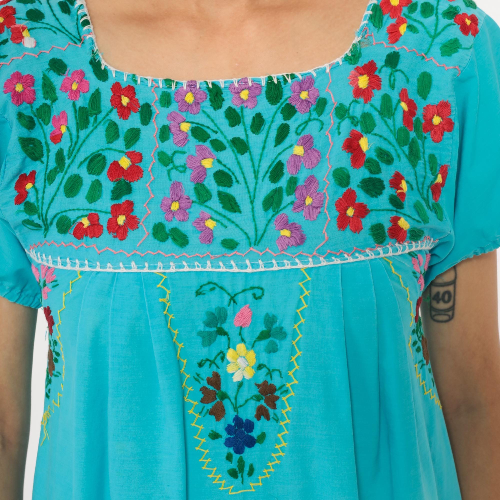 80s turquoise Mexican embroidered dress with square neckline and multi-colored floral embroidery across the yoke, chest panel, and body in red, pink, purple, yellow, and white flowers with green leaves and vines. Short puffed sleeves, empire waist with gathered skirt, white decorative trim along neckline and embroidery edges.