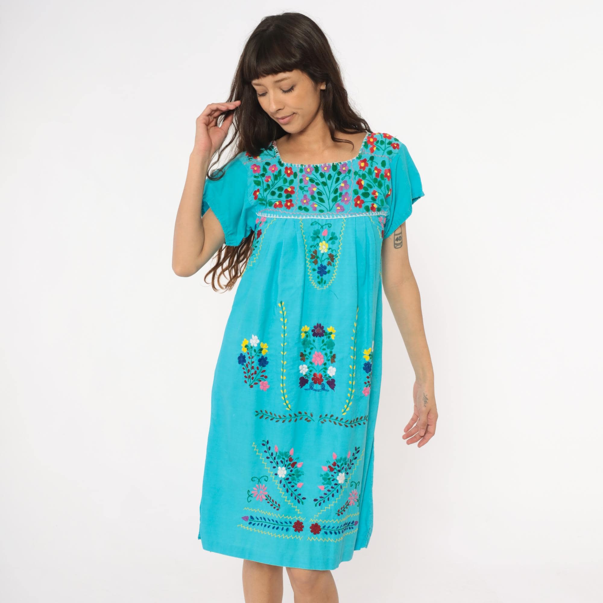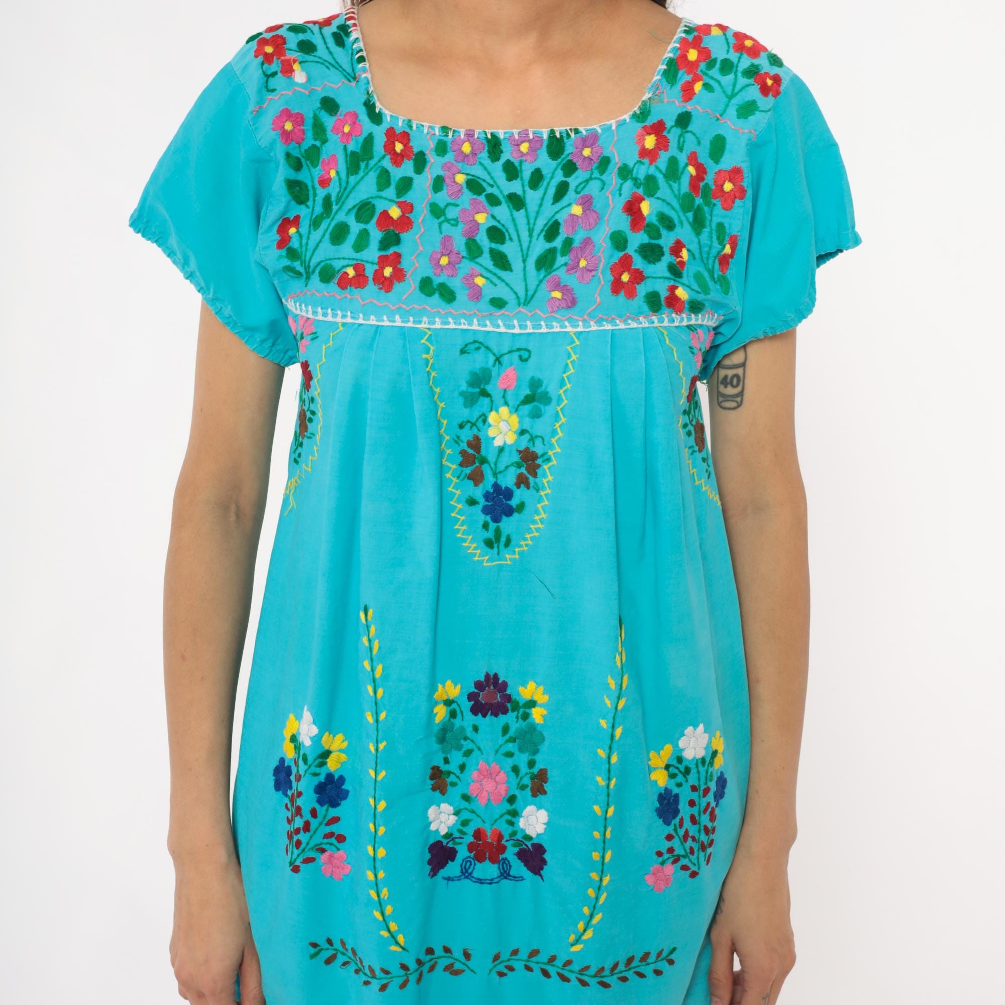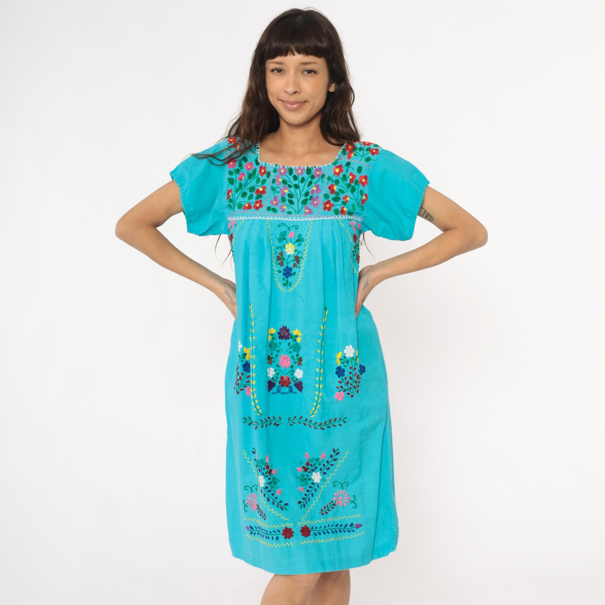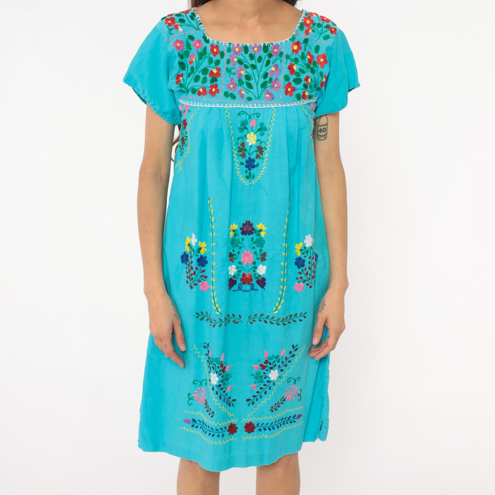 80s turquoise Mexican embroidered dress with square neckline and multi-colored floral embroidery across the yoke, chest panel, and body in red, pink, purple, yellow, and white flowers with green leaves and vines. Short puffed sleeves, empire waist with gathered skirt, white decorative trim along neckline and embroidery edges.