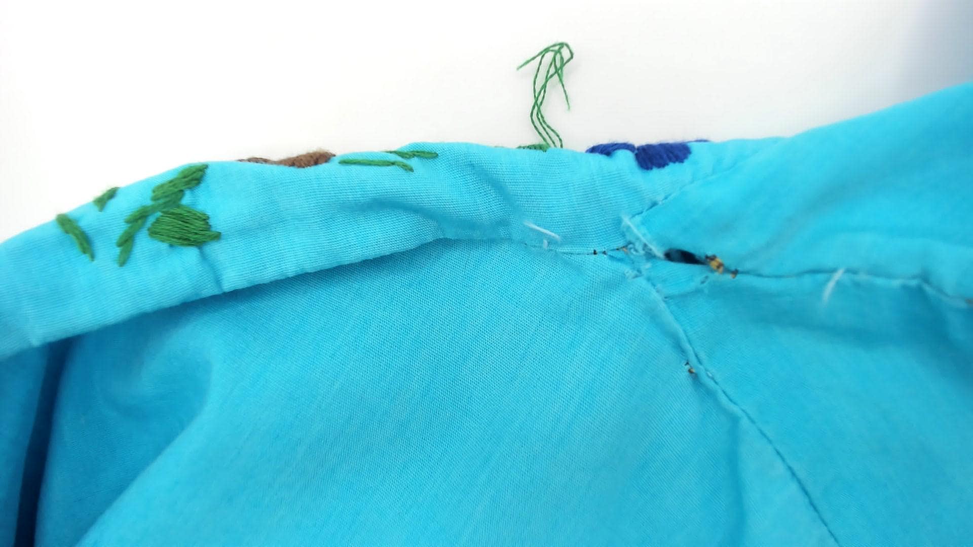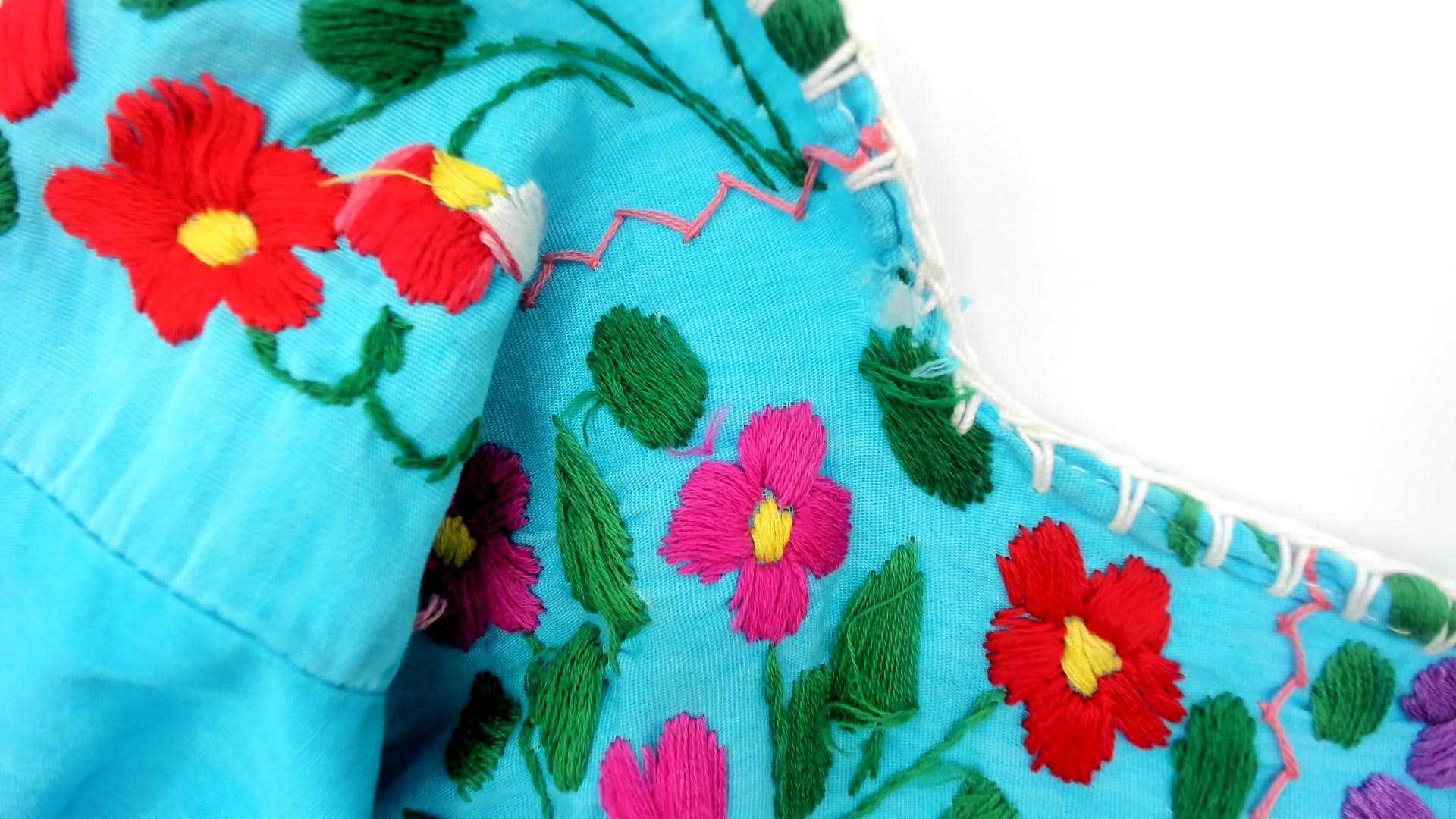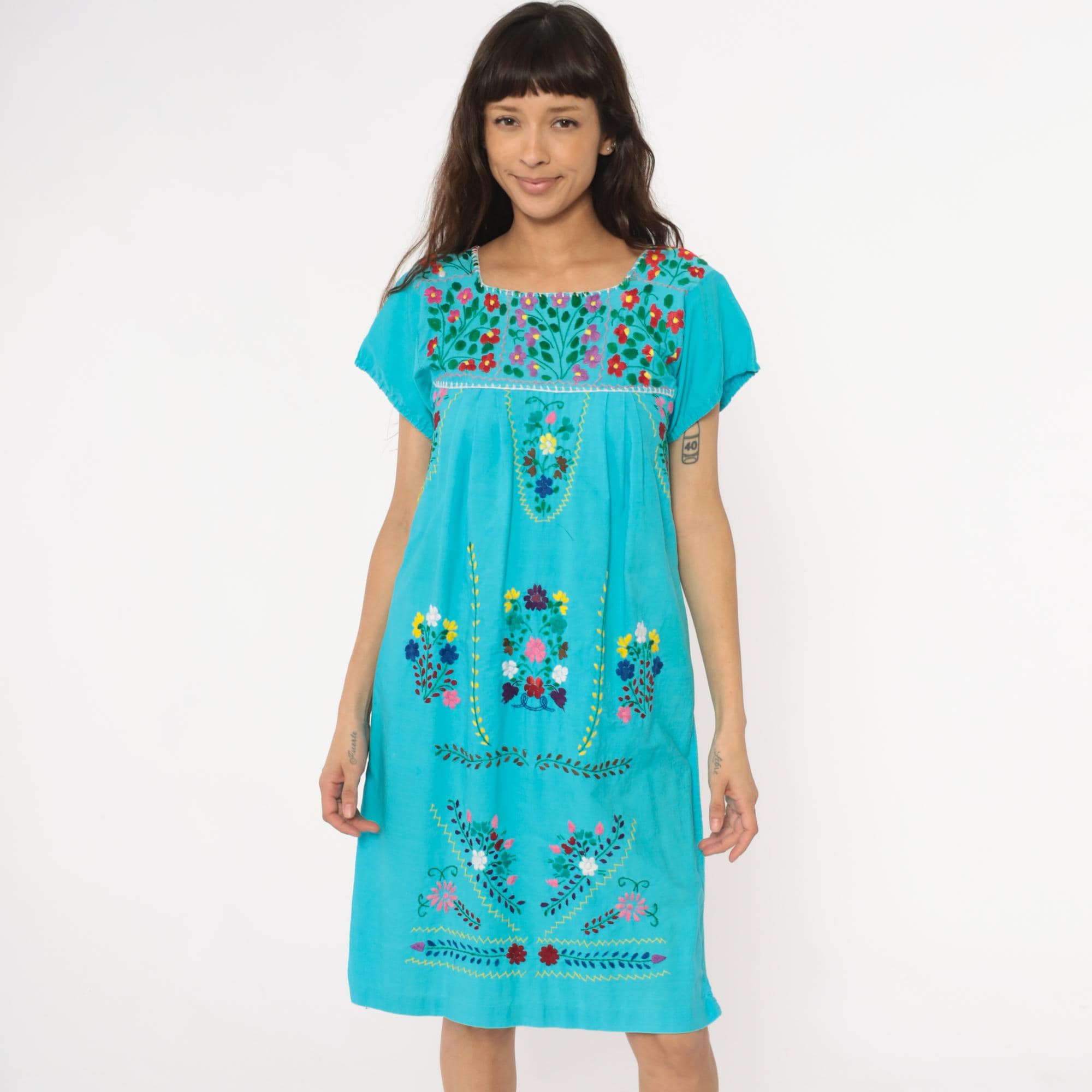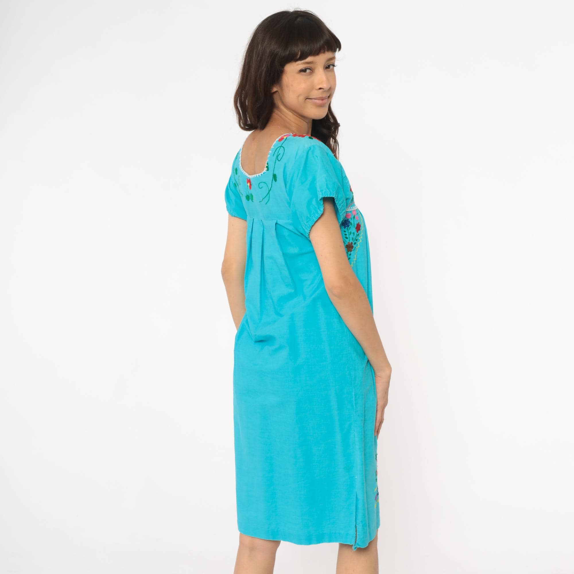 80s turquoise Mexican embroidered dress with square neckline and multi-colored floral embroidery across the yoke, chest panel, and body in red, pink, purple, yellow, and white flowers with green leaves and vines. Short puffed sleeves, empire waist with gathered skirt, white decorative trim along neckline and embroidery edges.