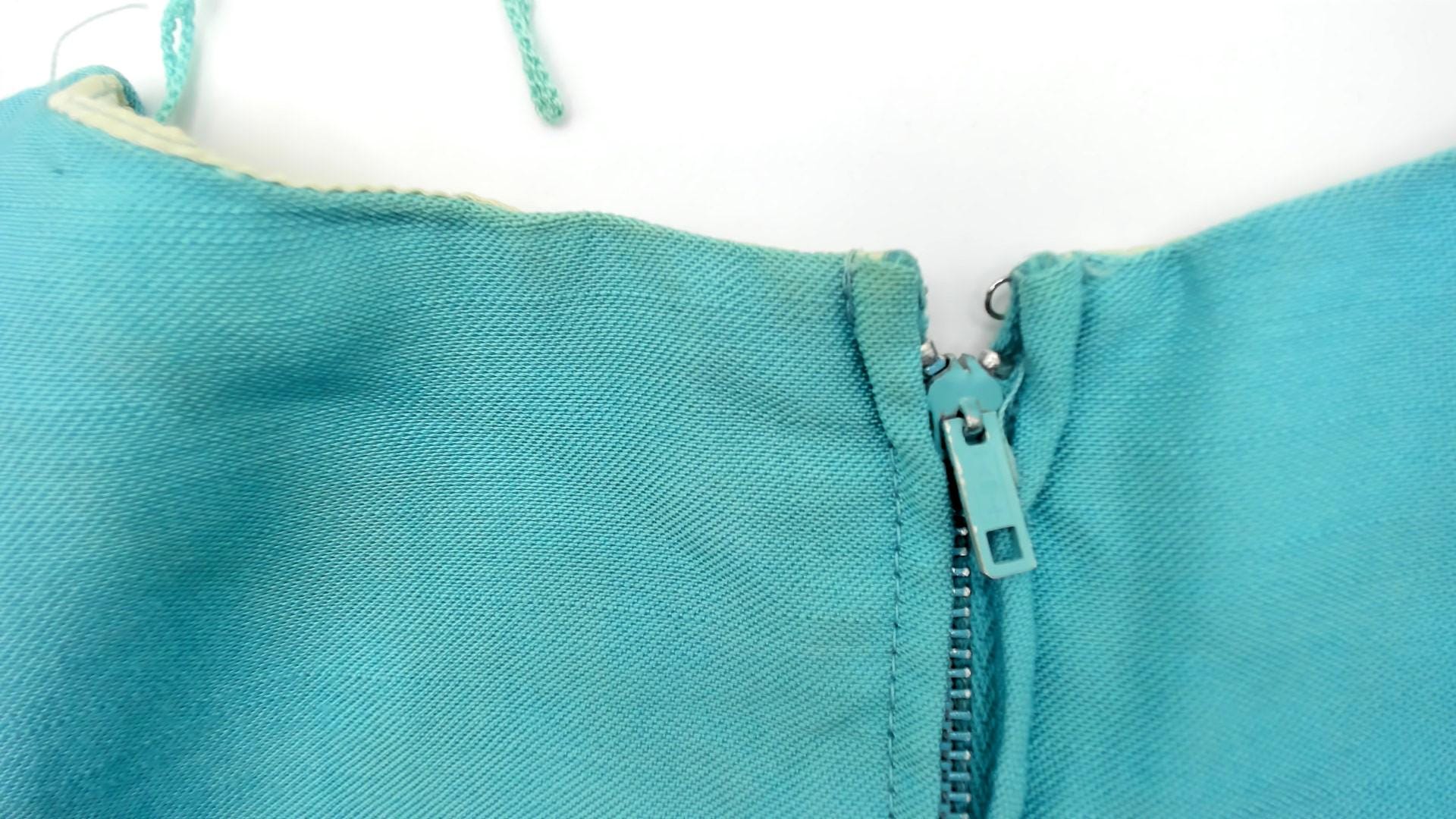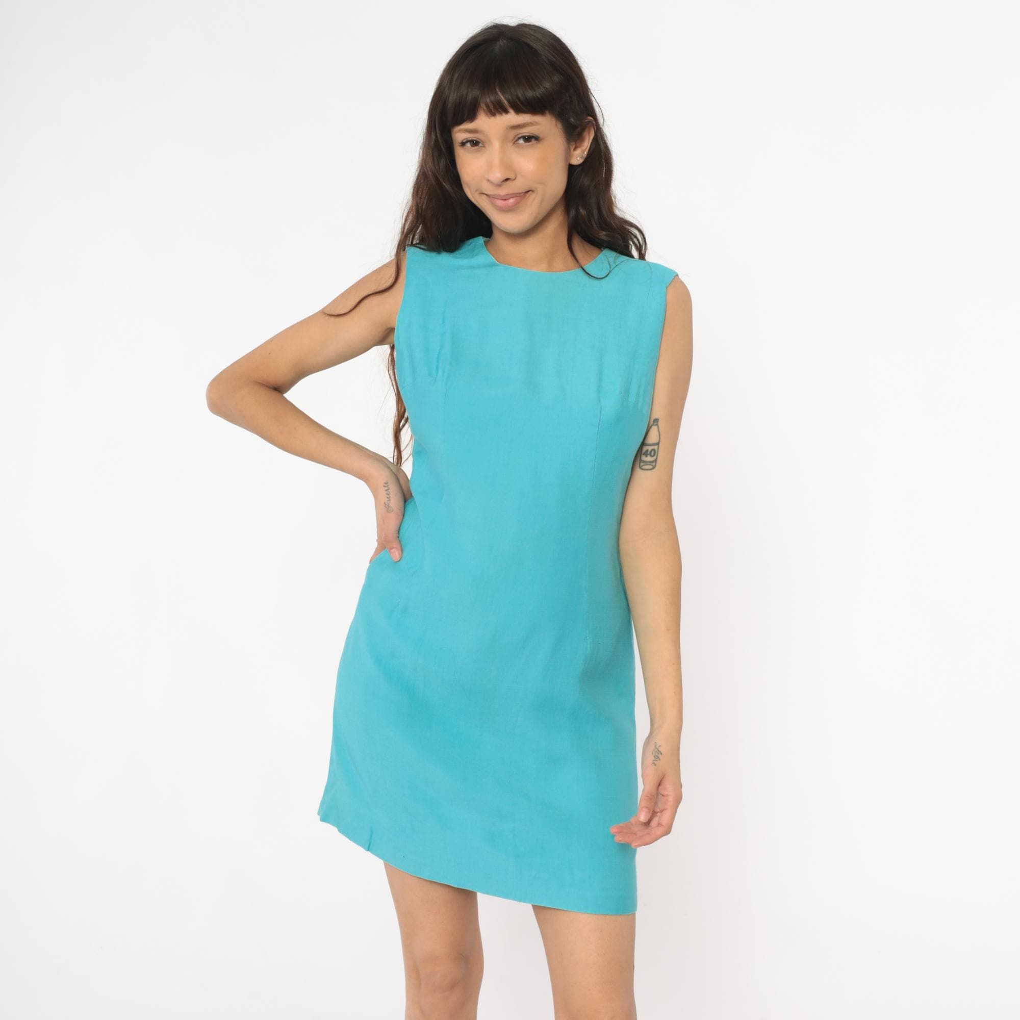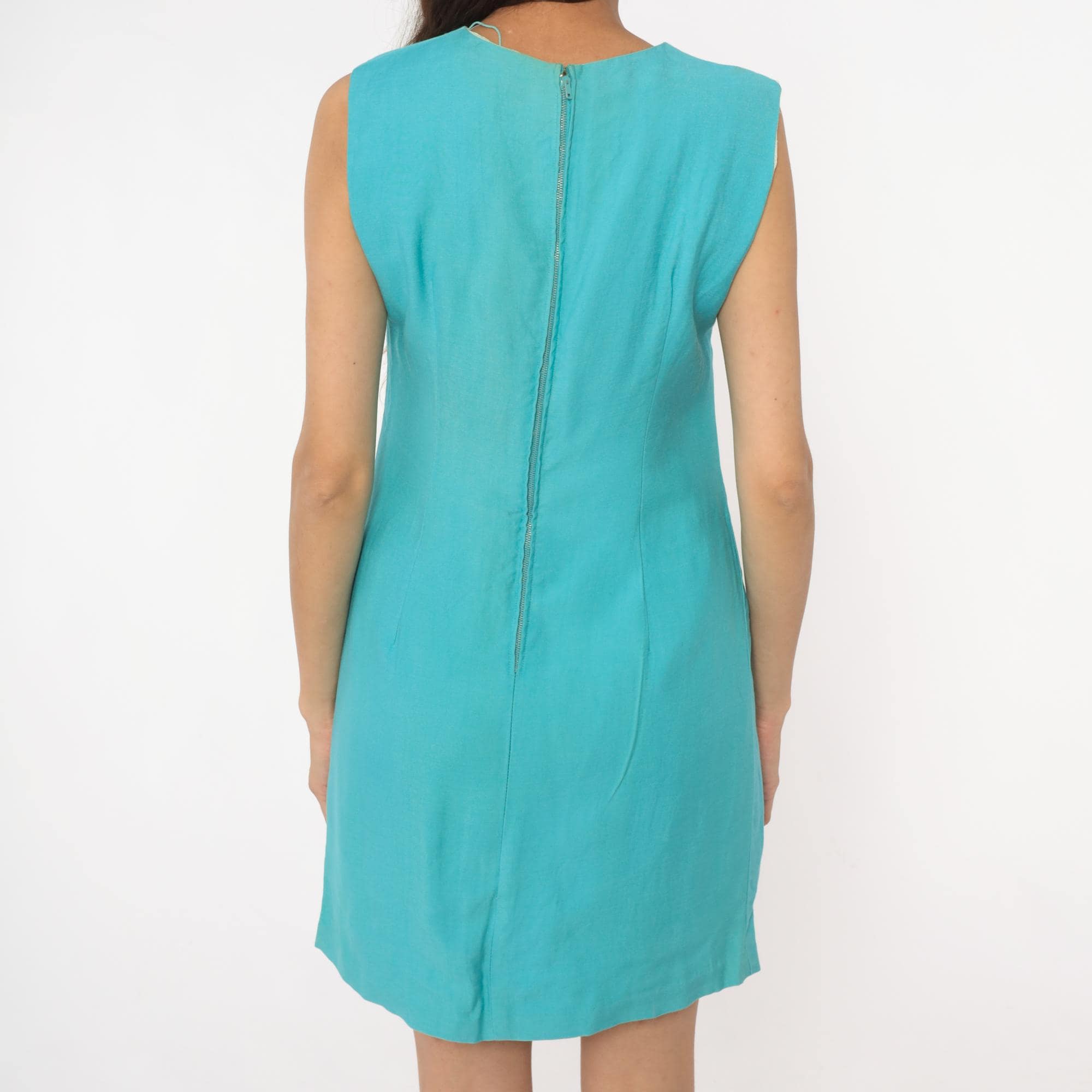 60s turquoise shift dress with round neckline and sleeveless construction. Back metal zipper closure, straight A-line silhouette.