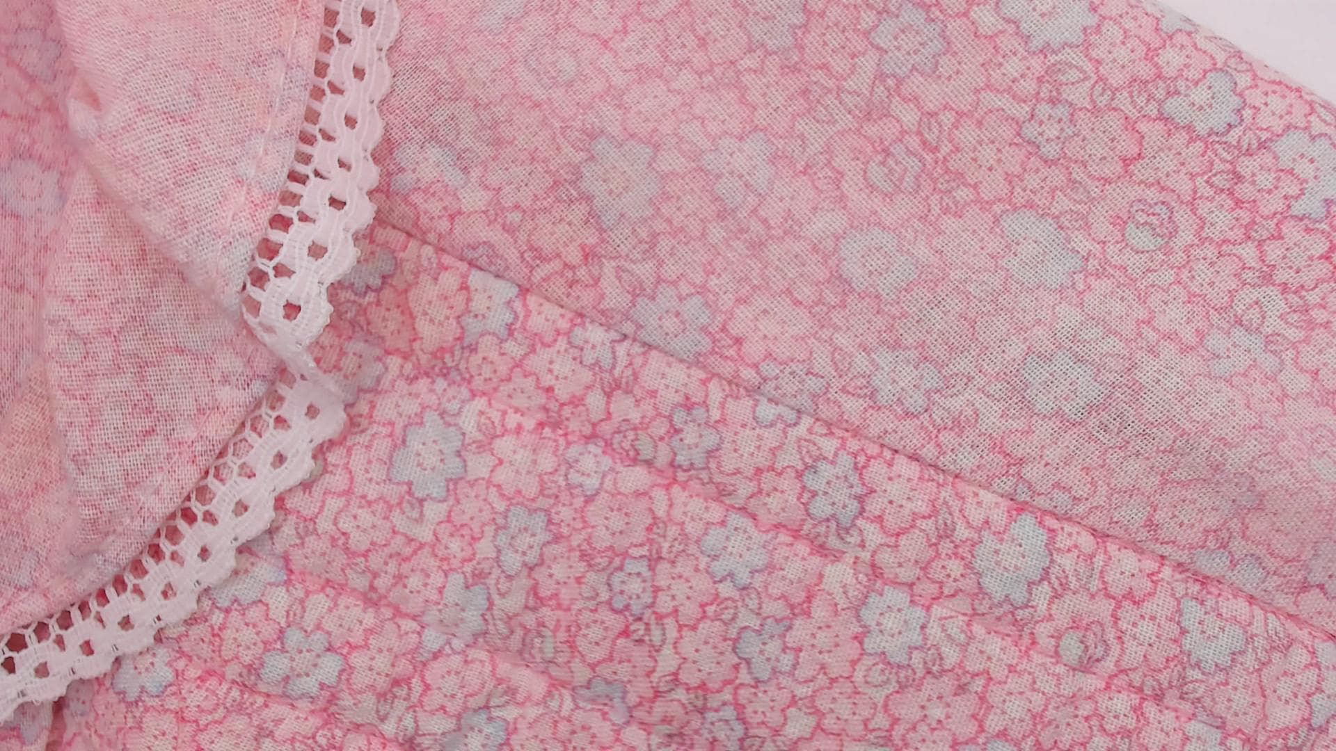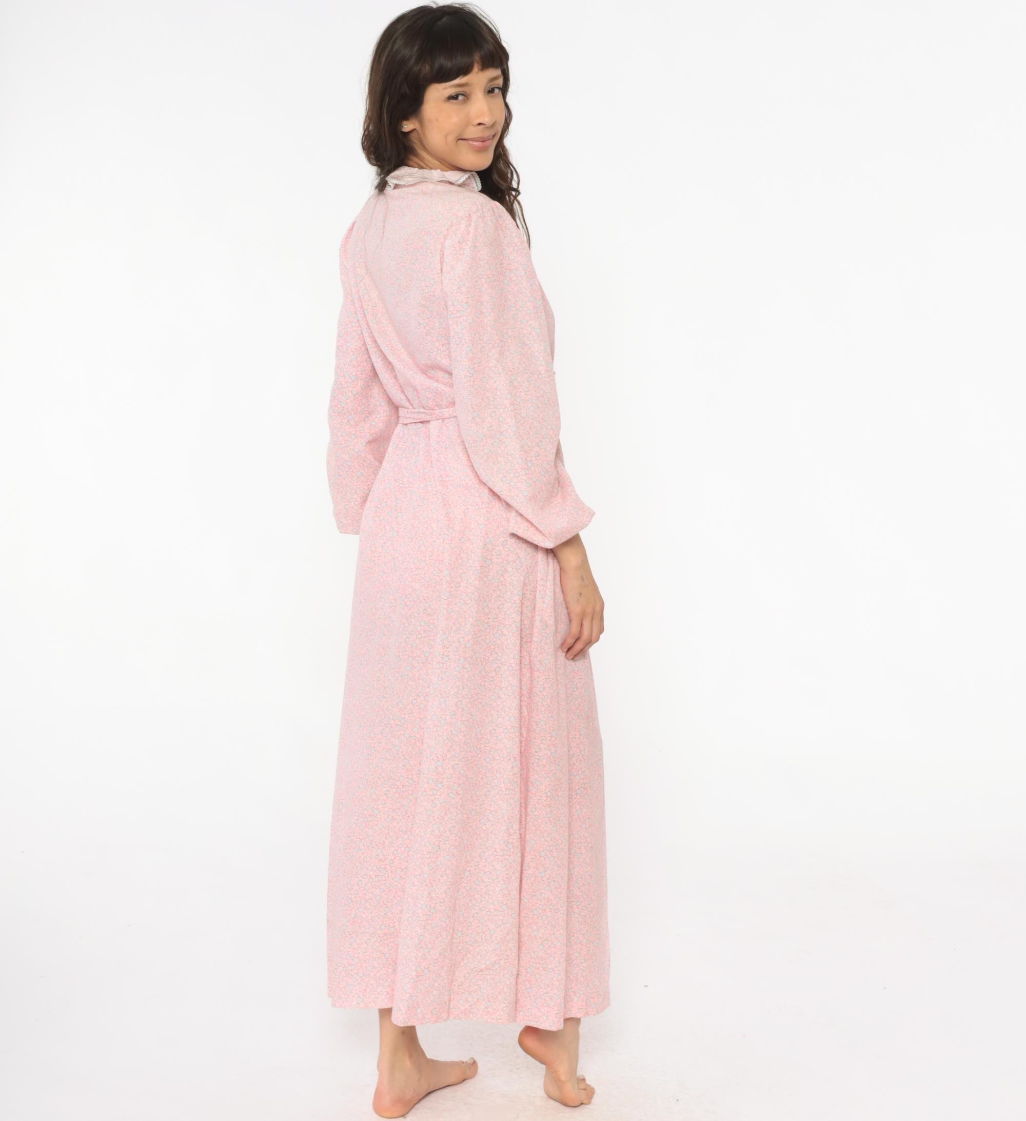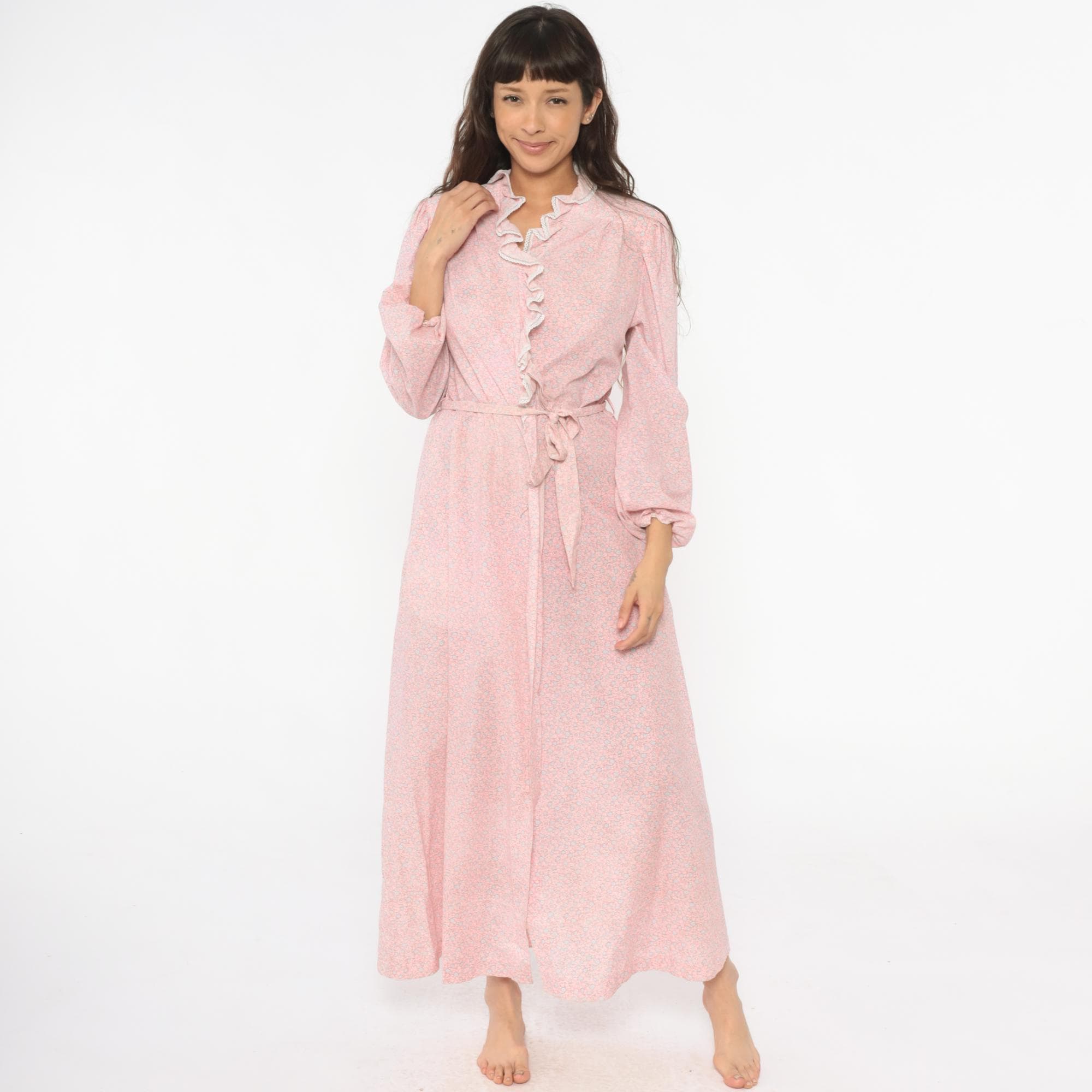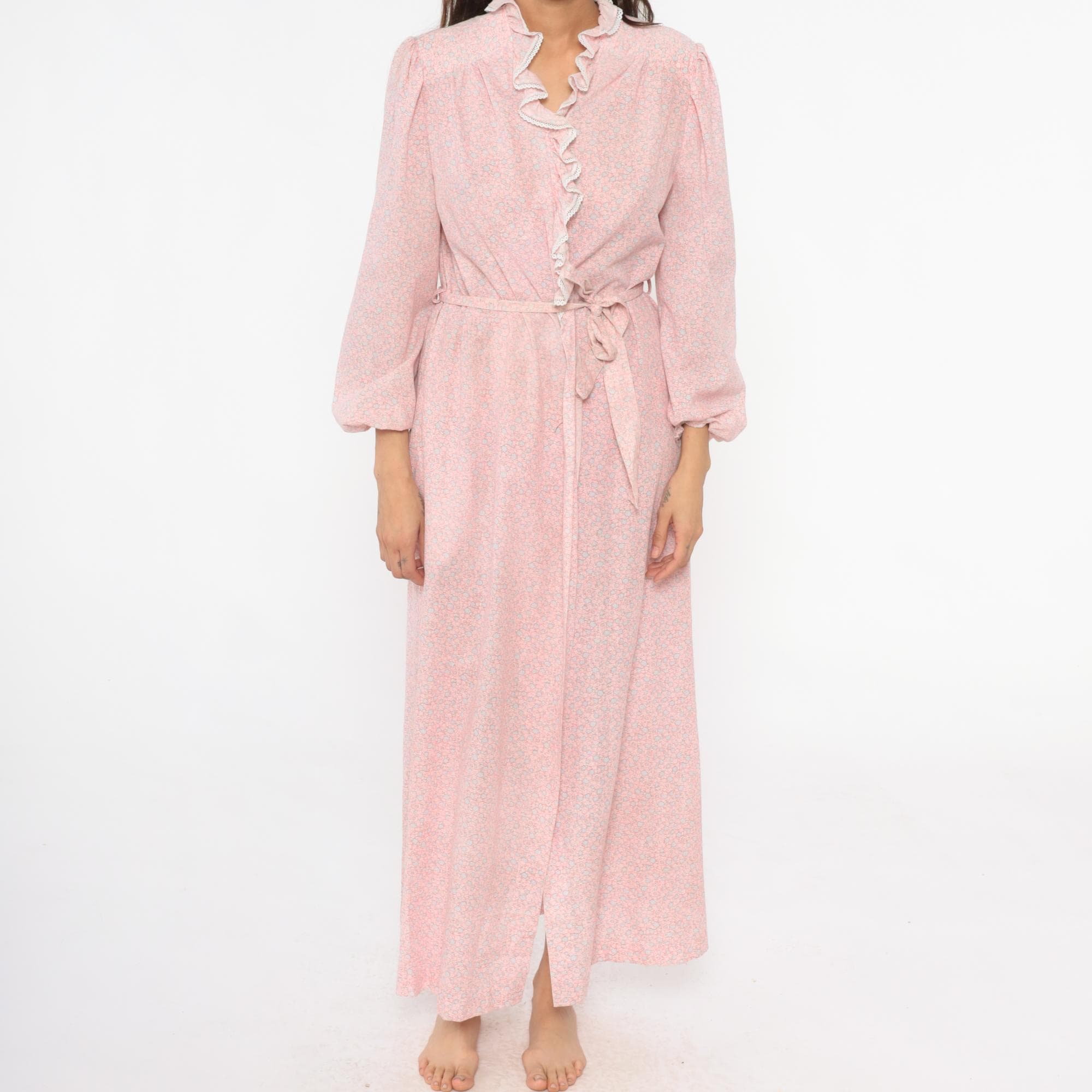 70s pink floral robe with small ditsy floral print in pink and blue across the fabric. Ruffle trim with white lace edging along front opening and collar, wrap front with tie belt at waist, long sleeves.