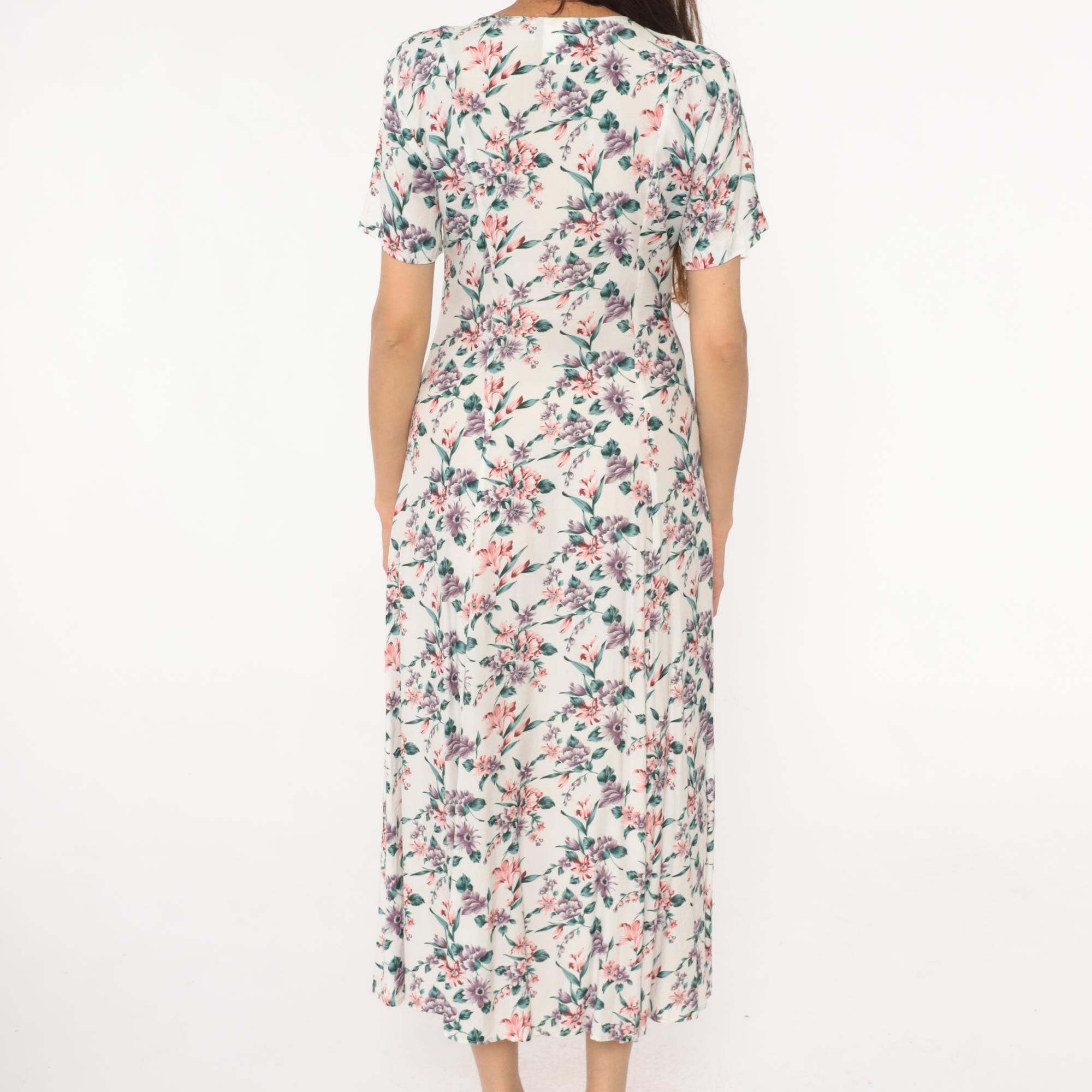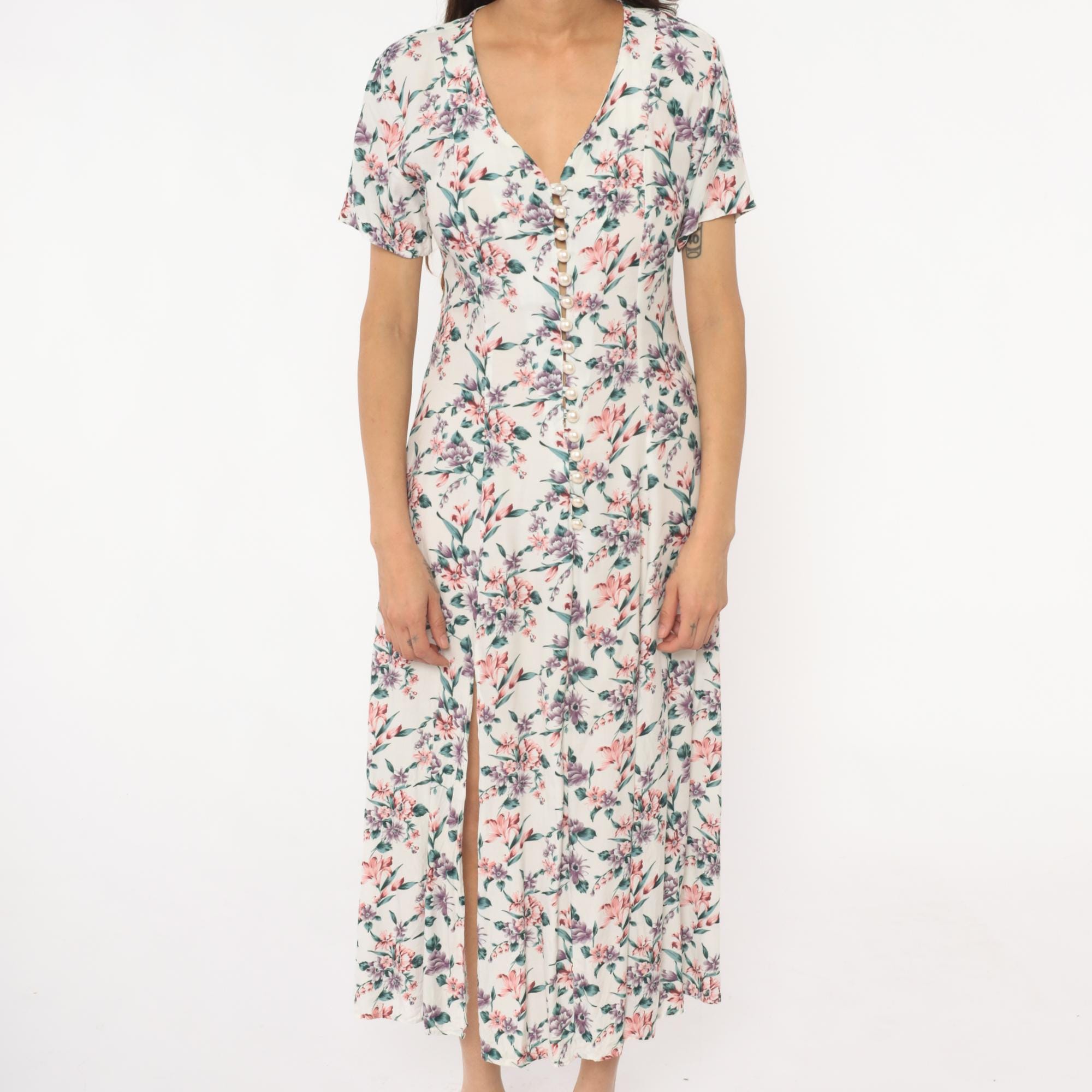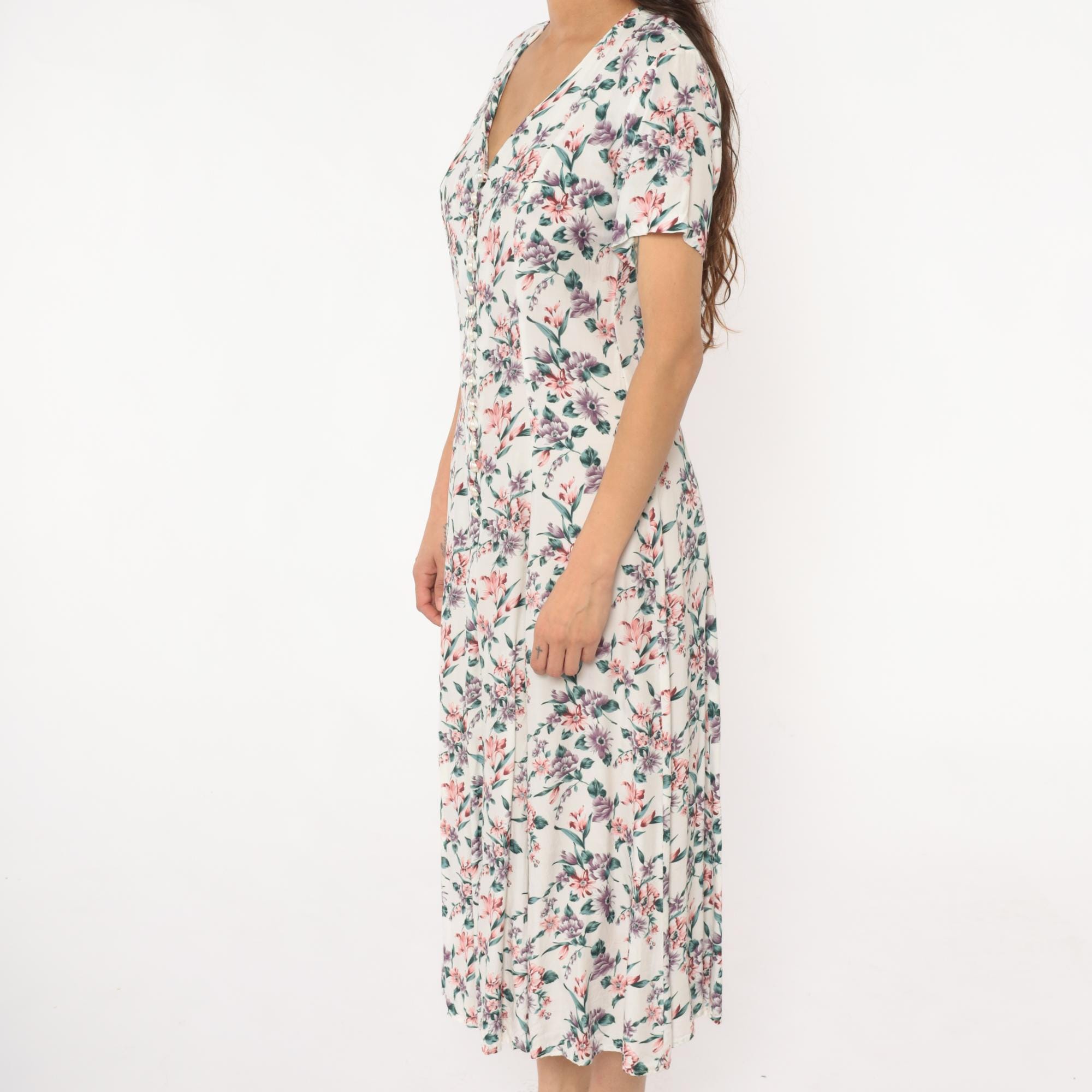 90s cream floral midi dress with pink, purple, and teal flowers across the fabric. V-neckline with button detail at center front, short sleeves, front slit extending from hem.
