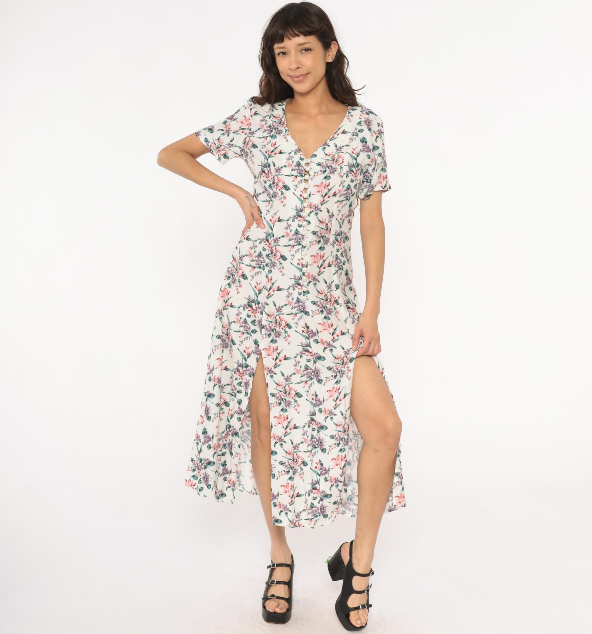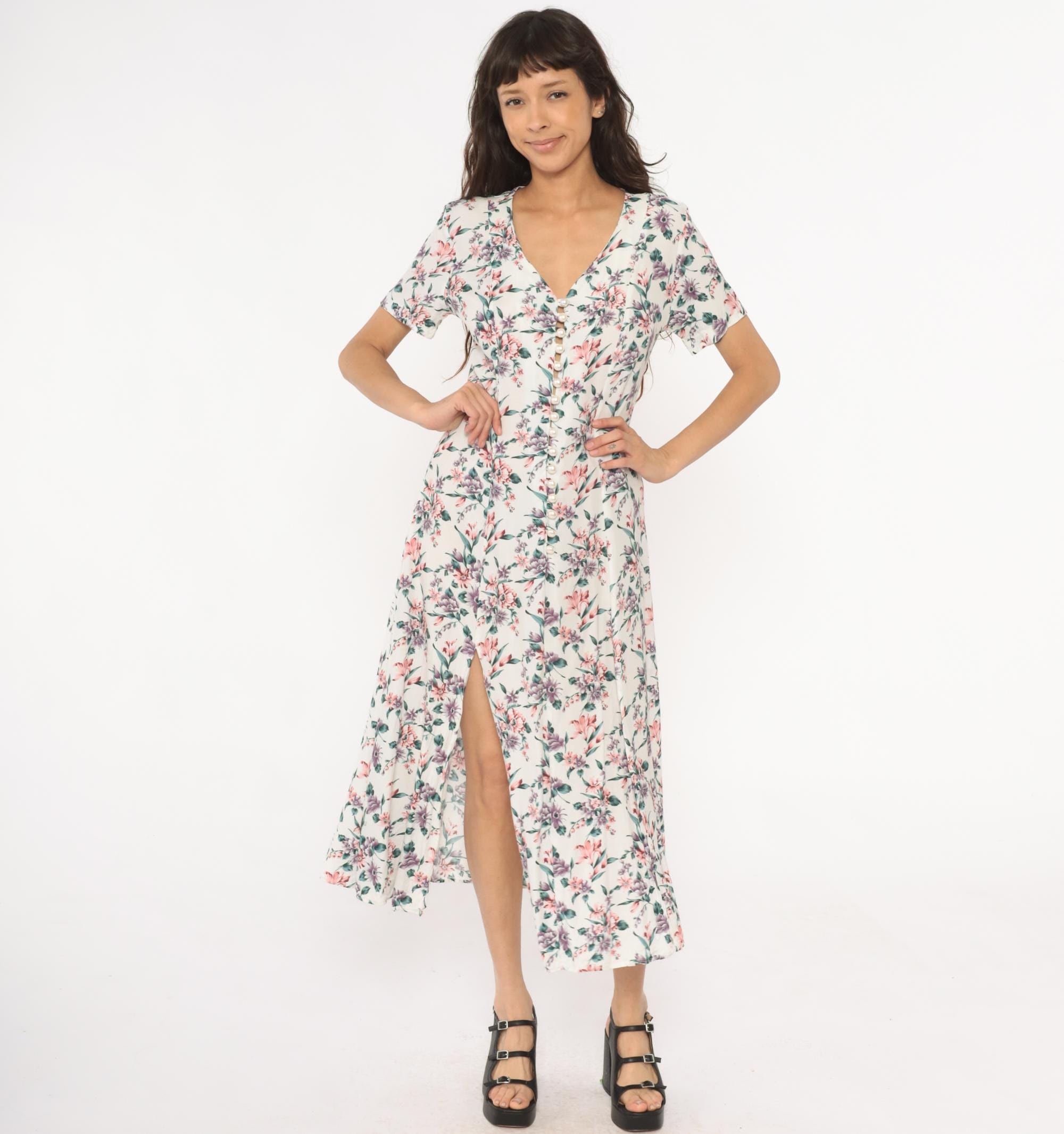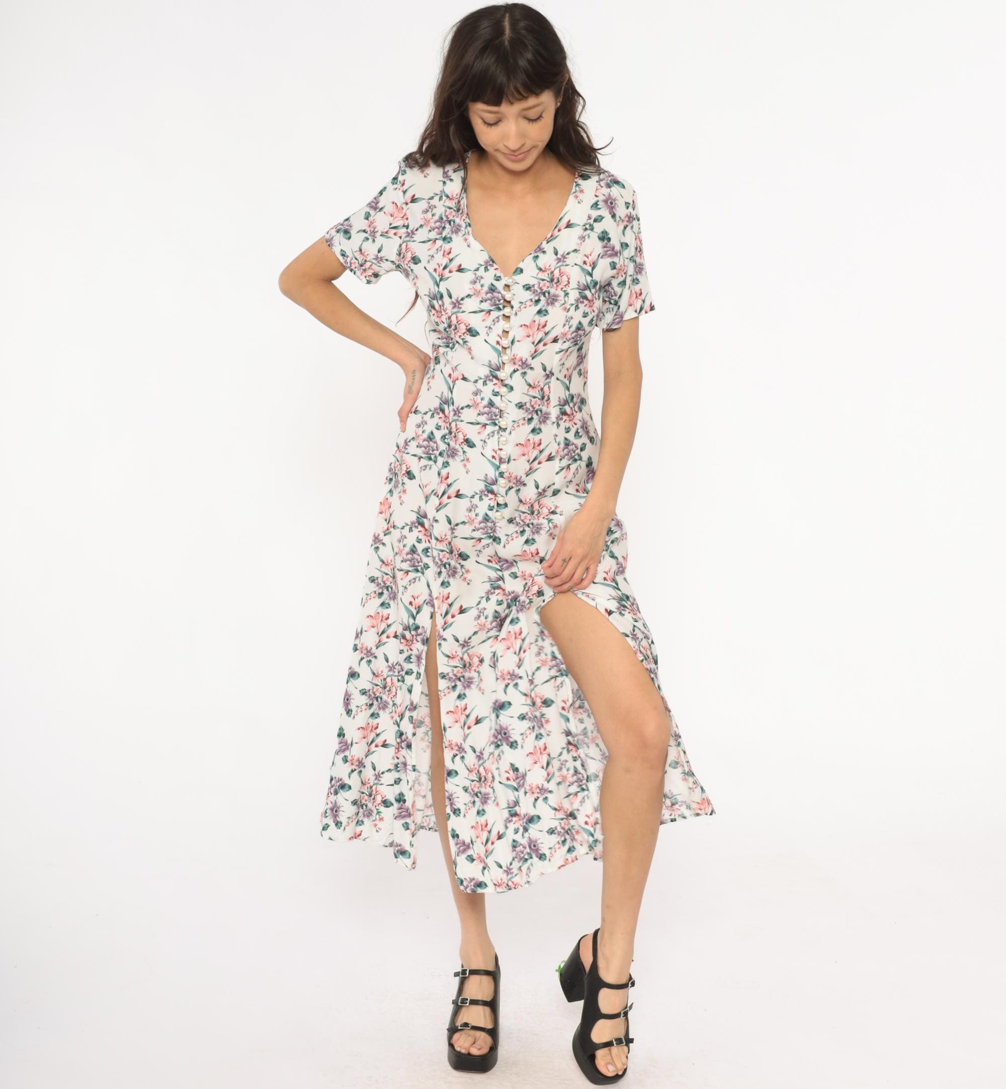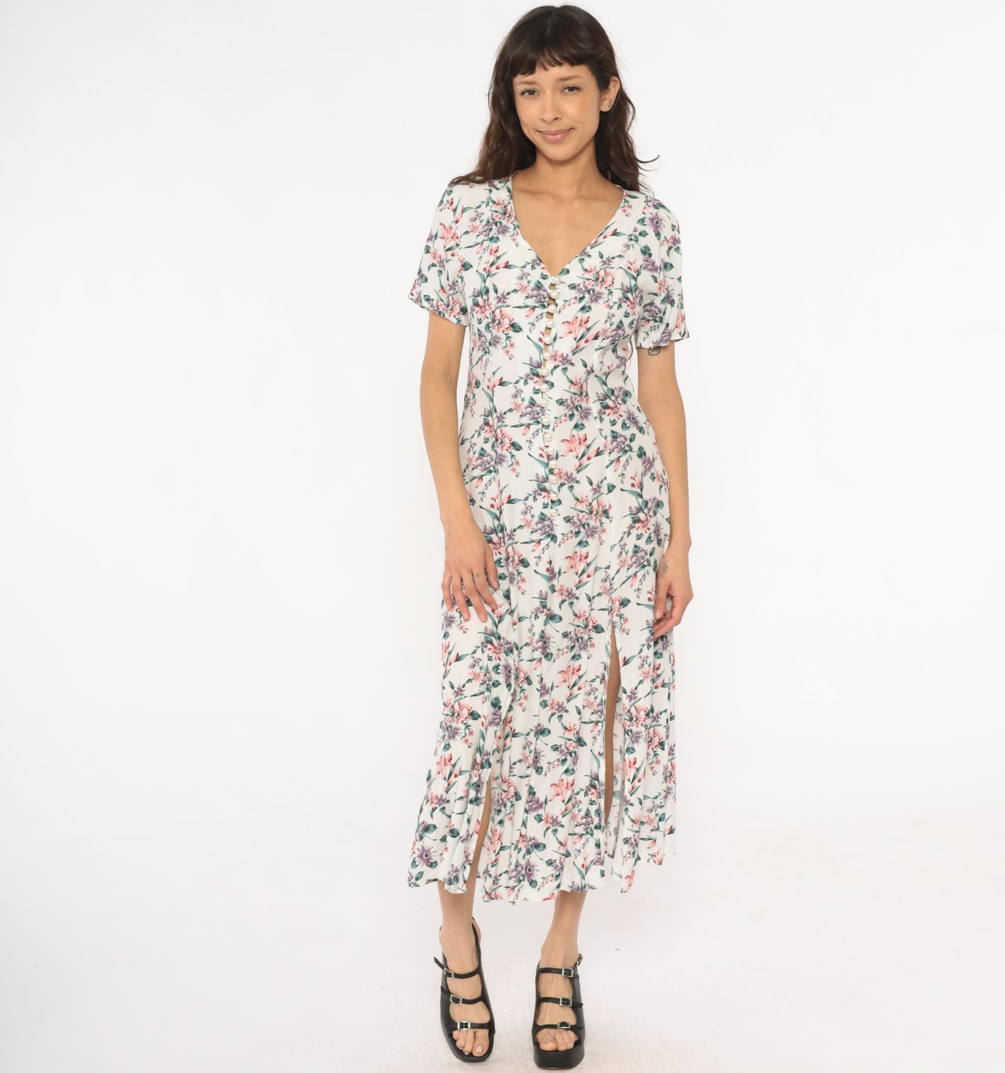 90s cream floral midi dress with pink, purple, and teal flowers across the fabric. V-neckline with button detail at center front, short sleeves, front slit extending from hem.