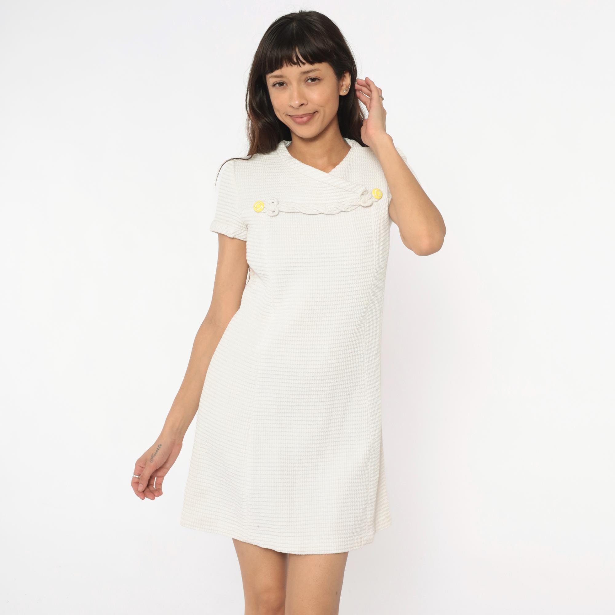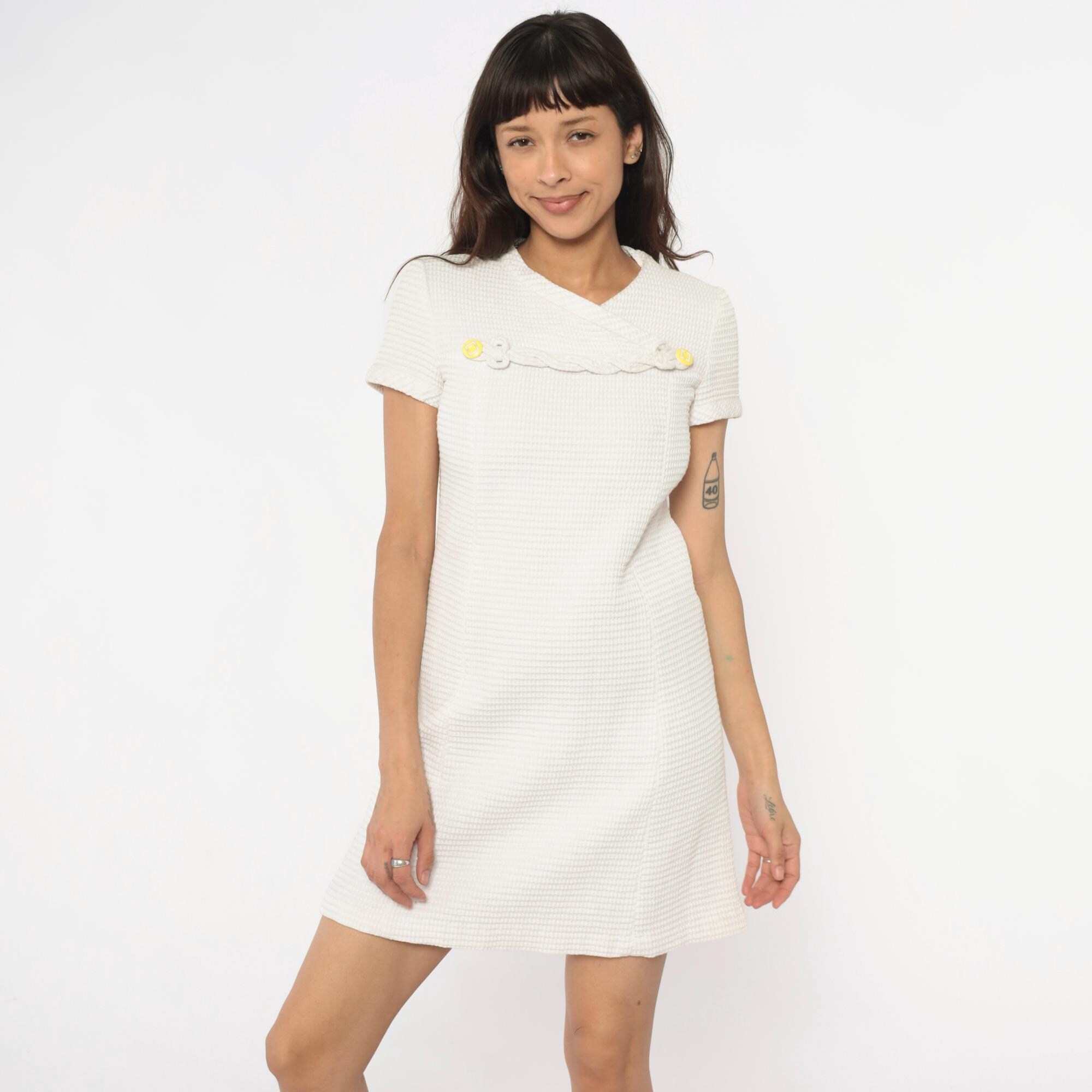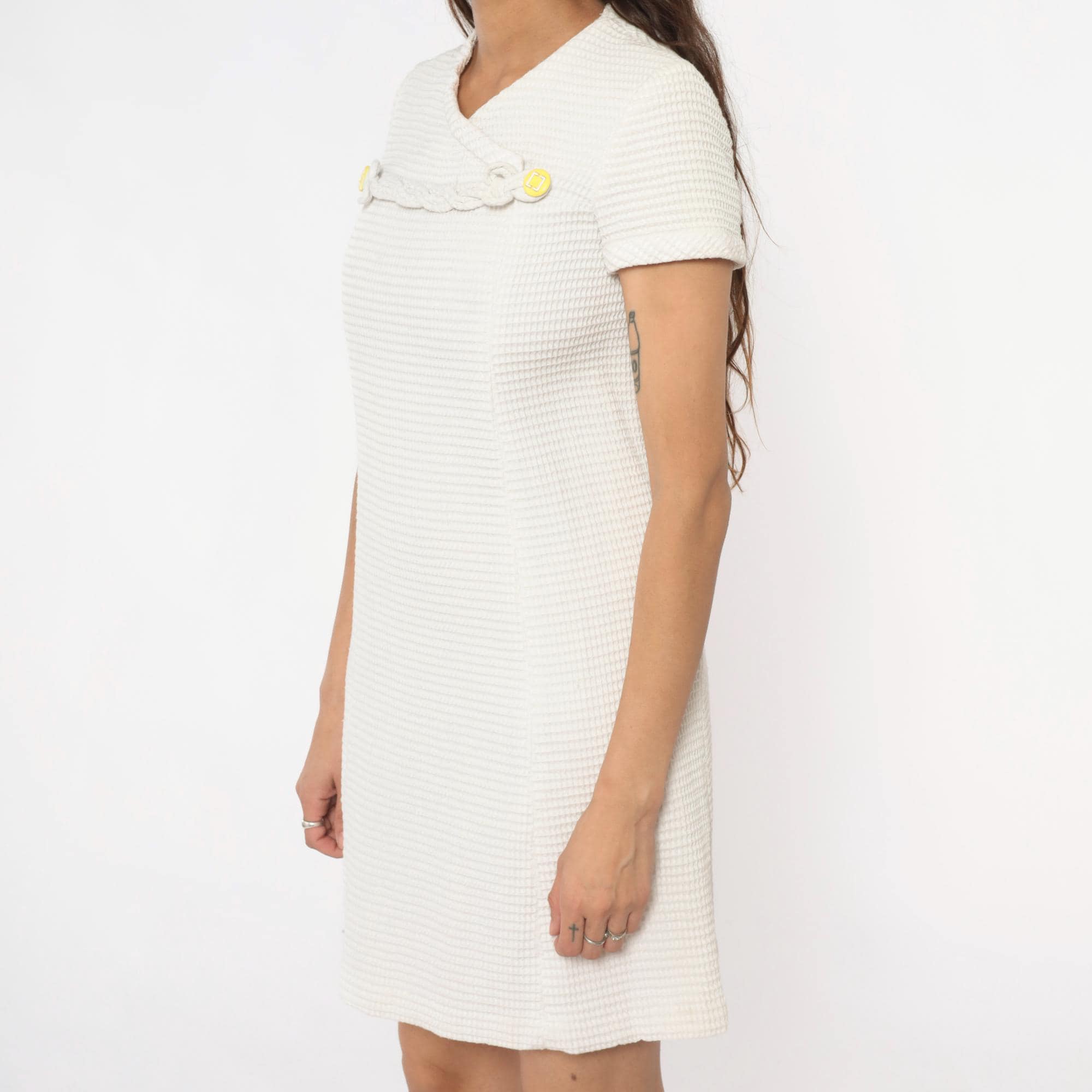 60s white shift dress with textured waffle-weave fabric and V-neckline. Decorative braided trim across the chest with circular disc embellishments, some with yellow centers. Short sleeves, back zipper closure.