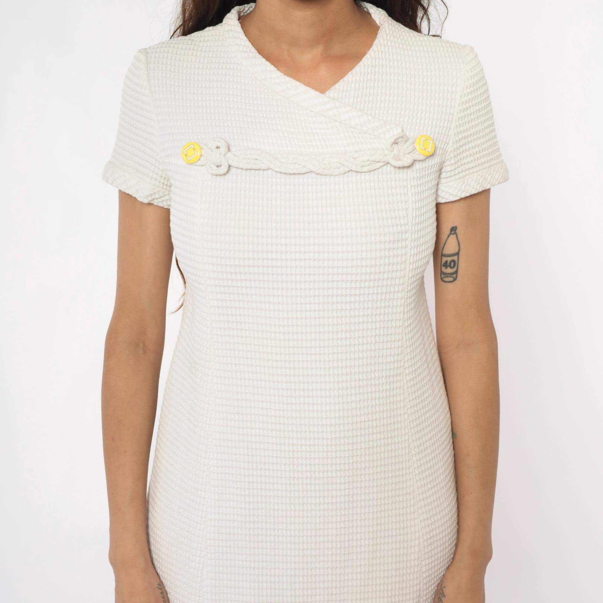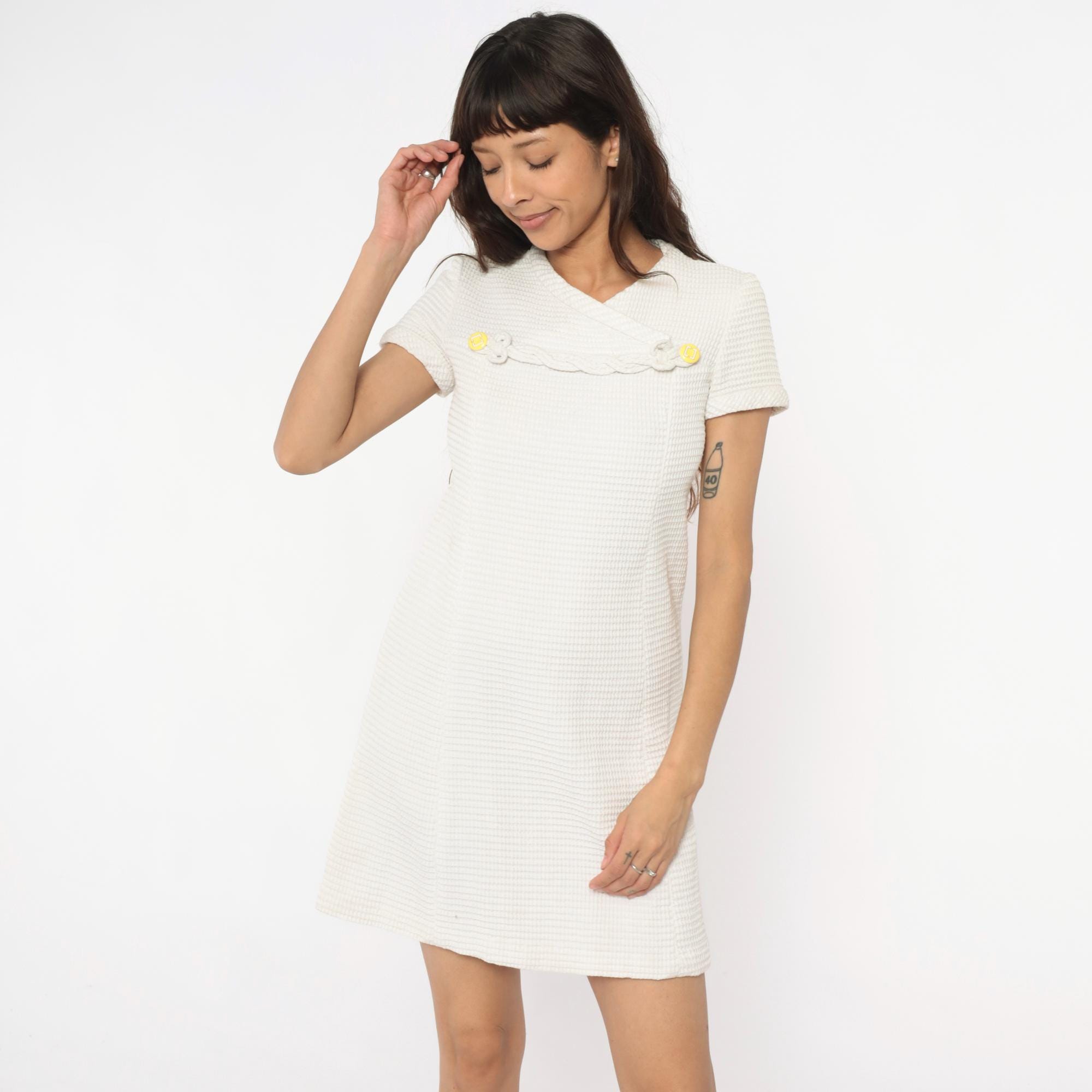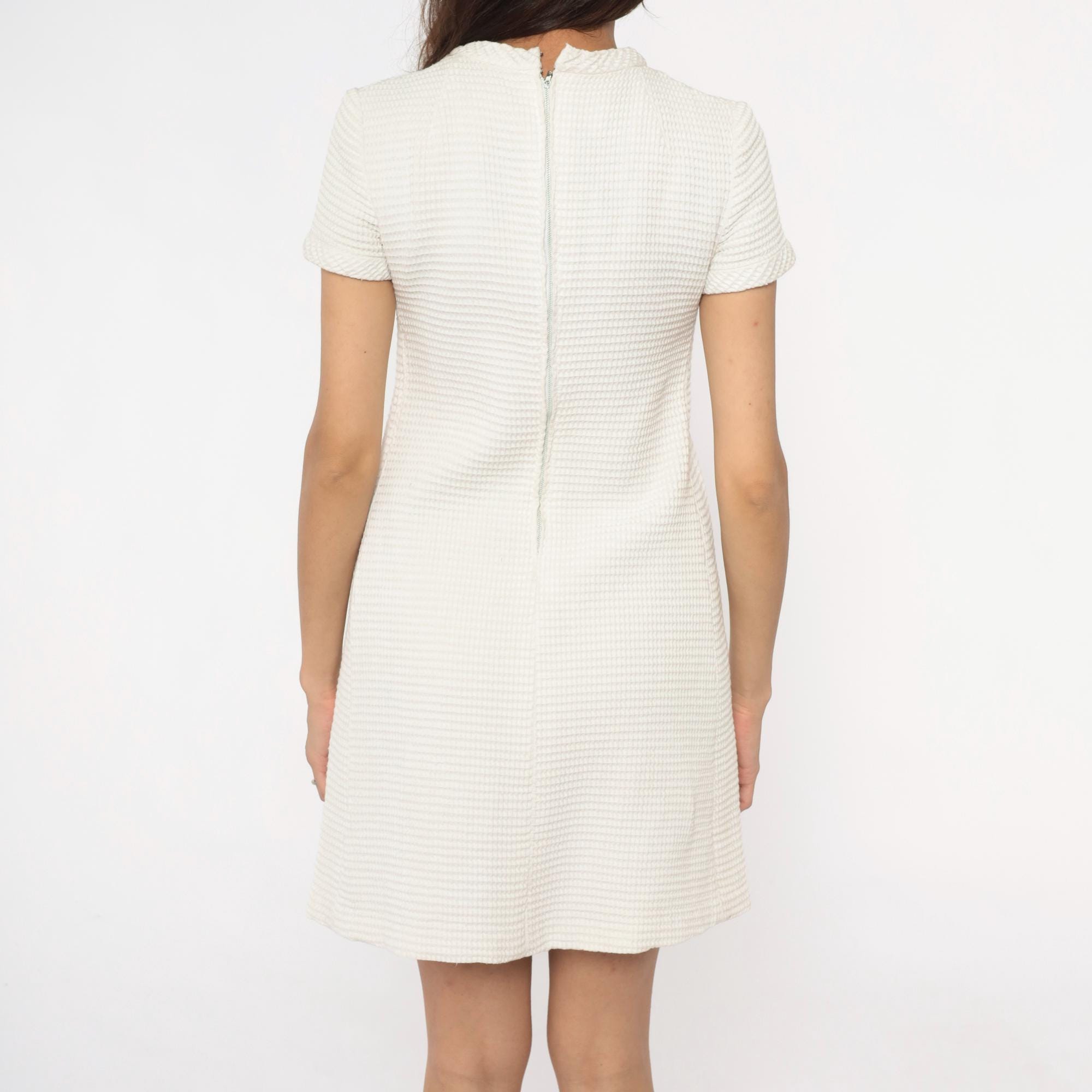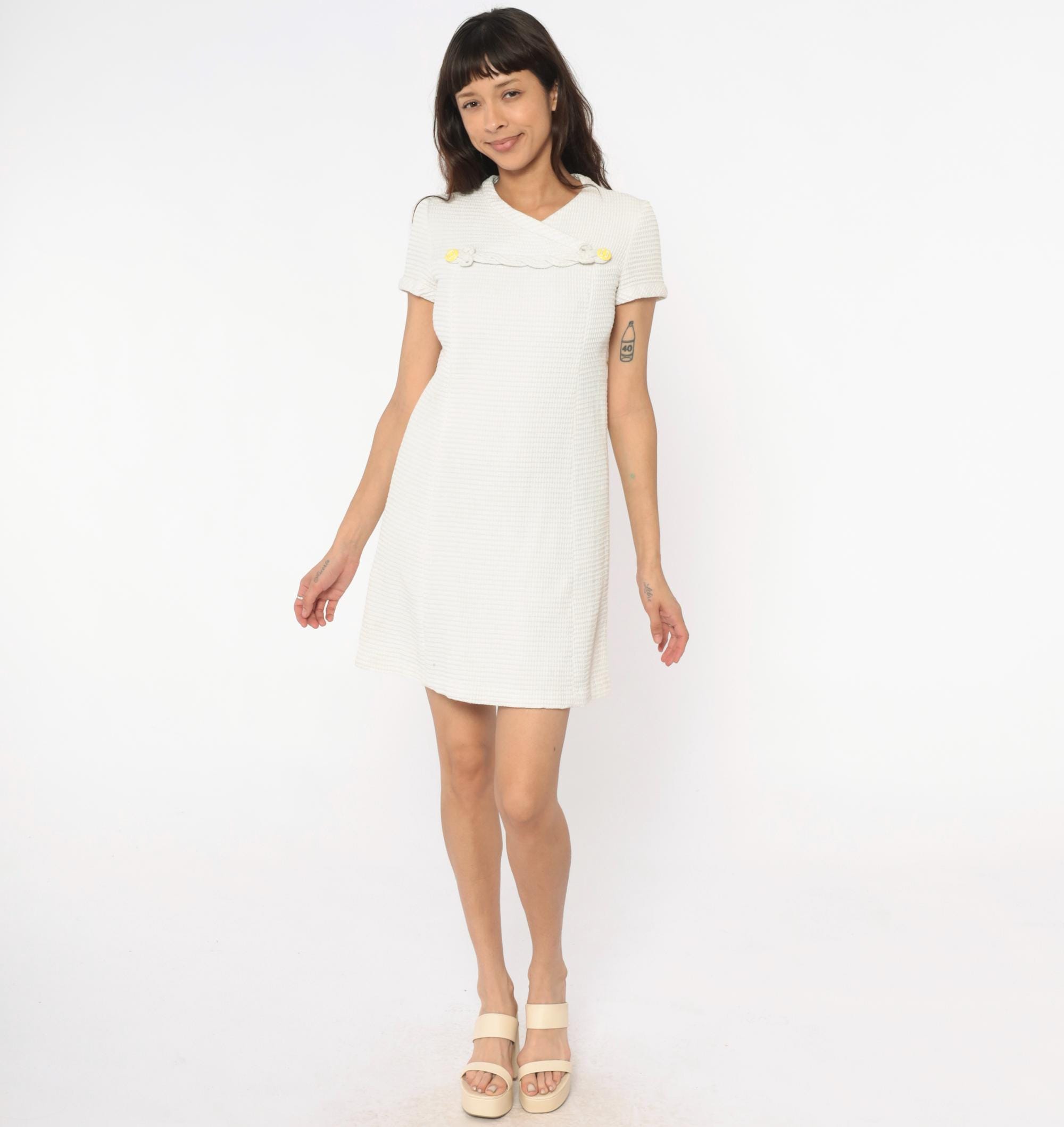 60s white shift dress with textured waffle-weave fabric and V-neckline. Decorative braided trim across the chest with circular disc embellishments, some with yellow centers. Short sleeves, back zipper closure.