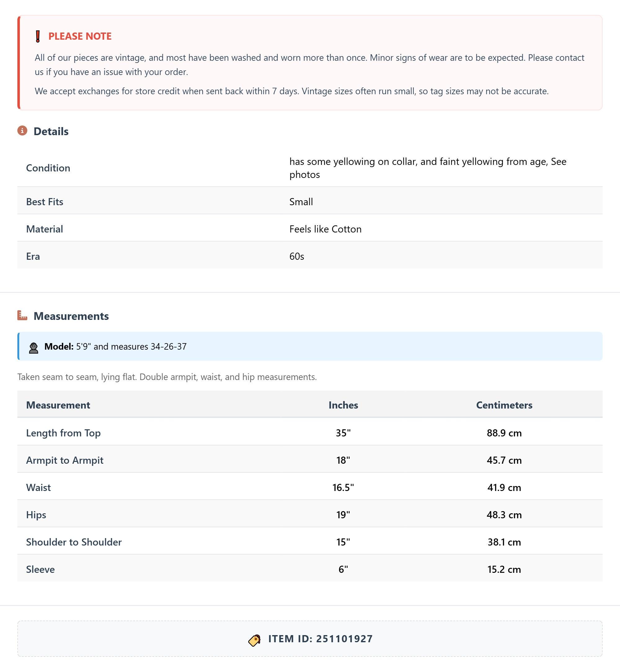 All of our pieces are vintage, and most have been washed and worn more than once. Minor signs of wear are to be expected. Please contact us if you have an issue with your order. We accept exchanges for store credit when sent back within 7 days.