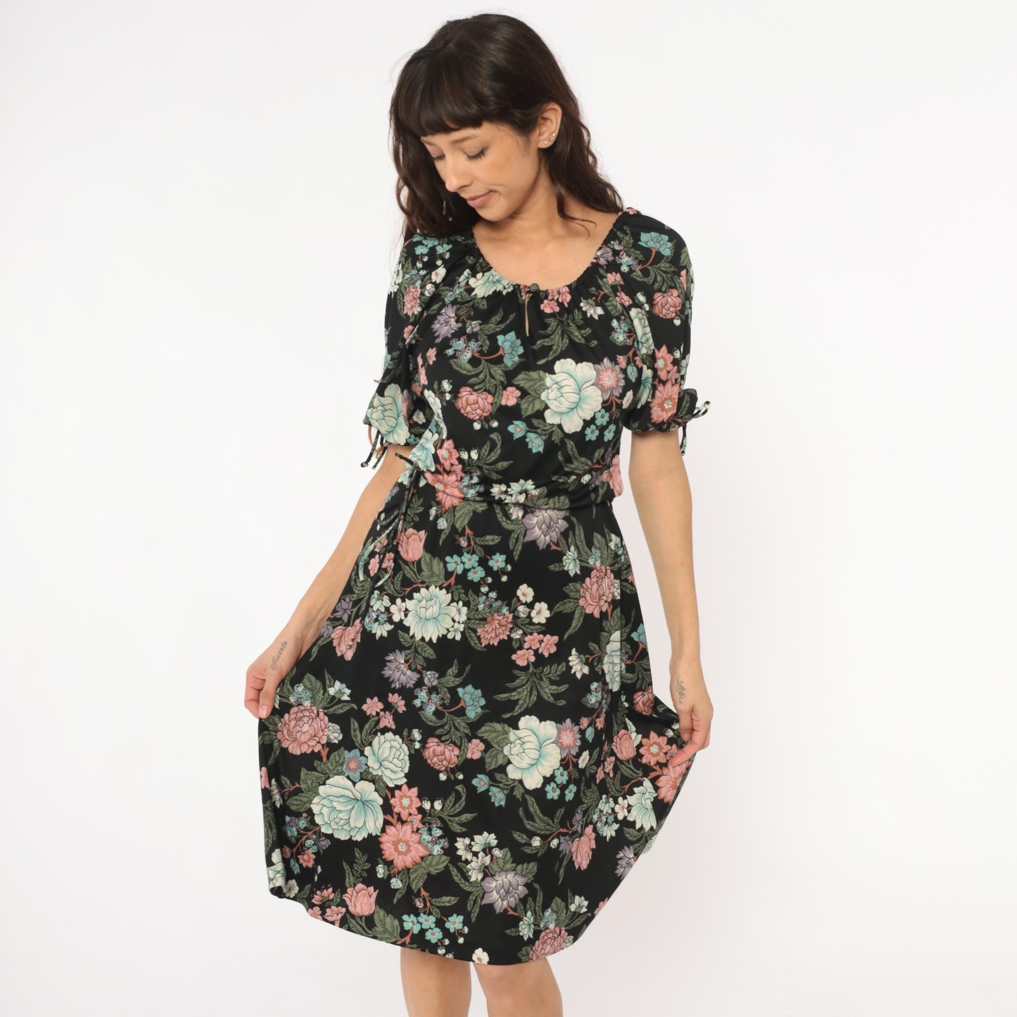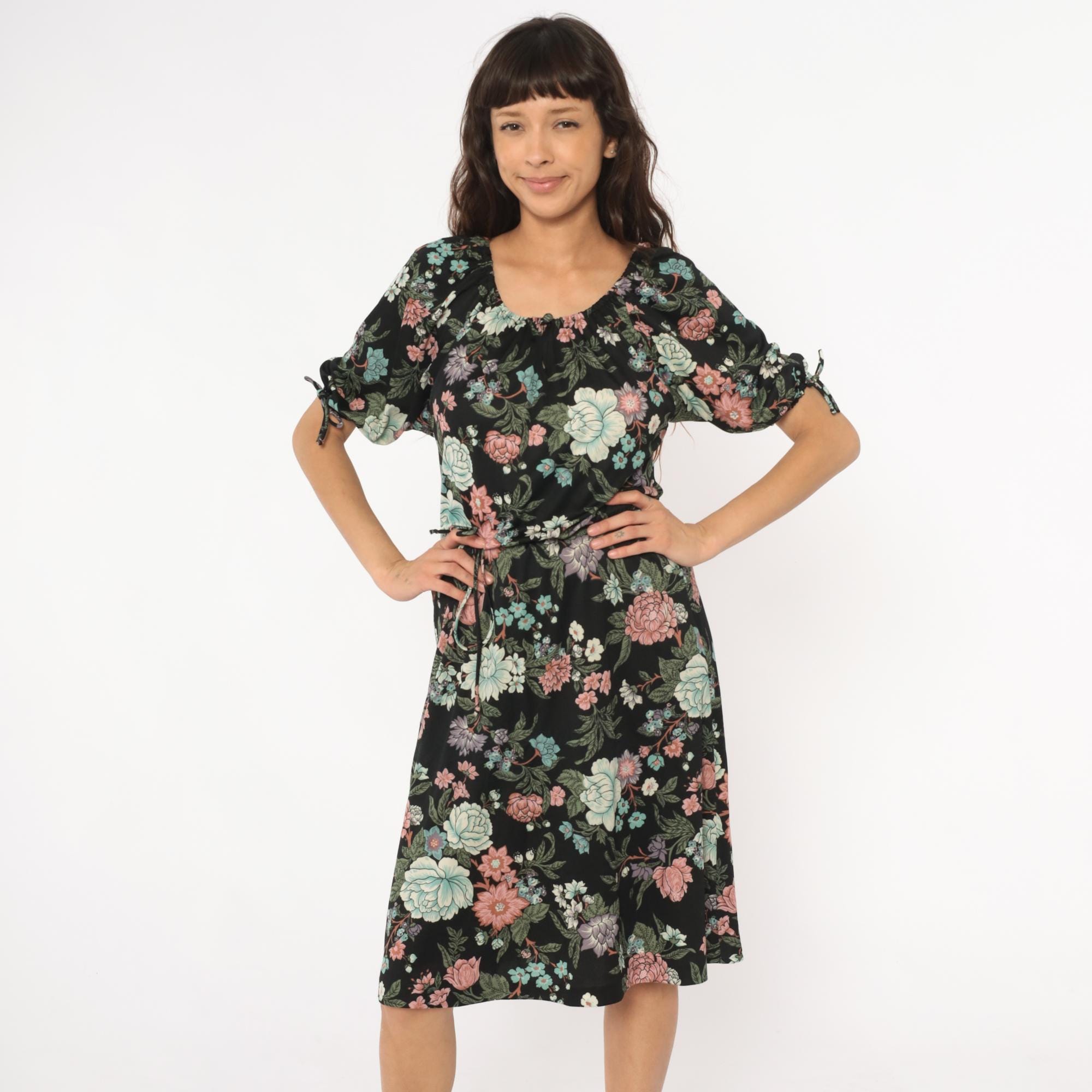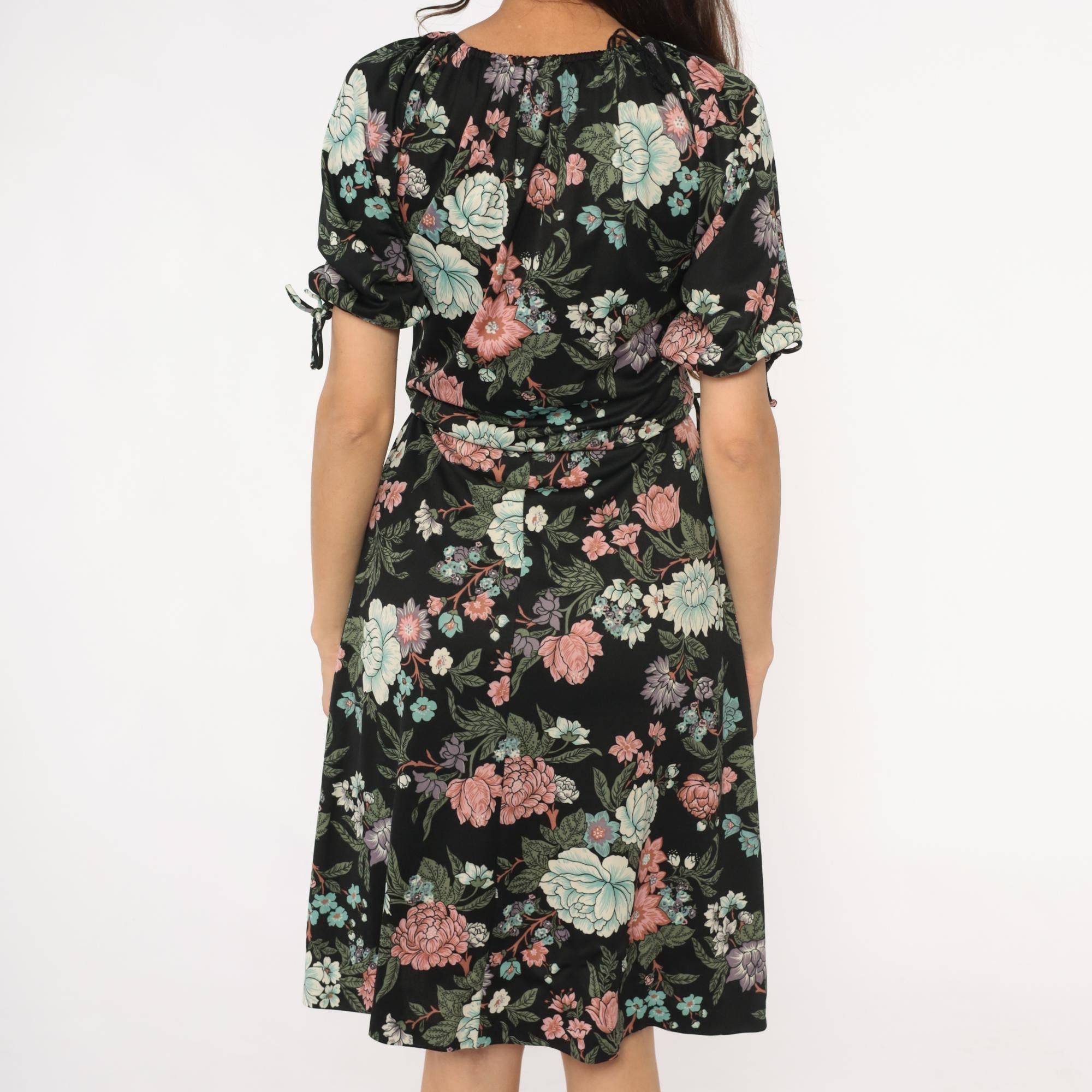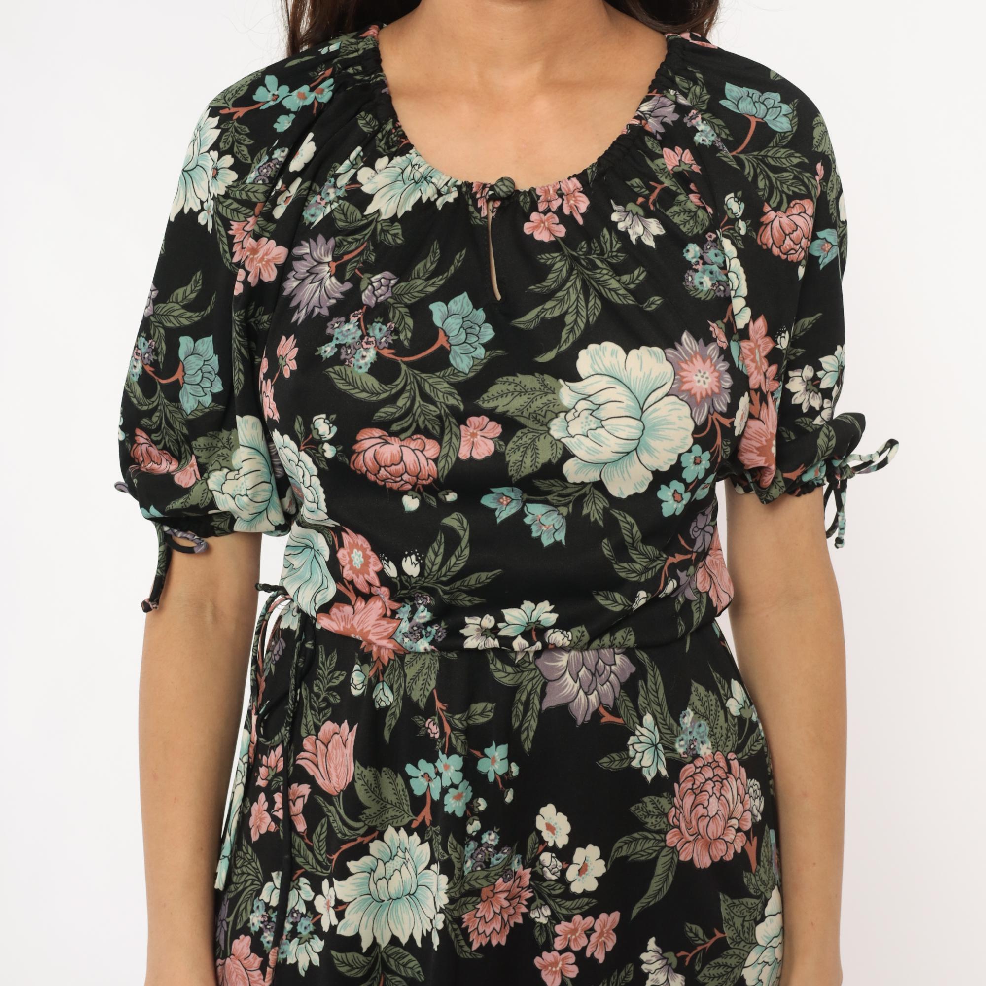 70s black floral midi dress with large-scale blooms in mint, pink, coral, lavender, and cream with green foliage throughout. Gathered elastic neckline, short sleeves with tie closures at cuffs, elastic gathered waist, A-line skirt.