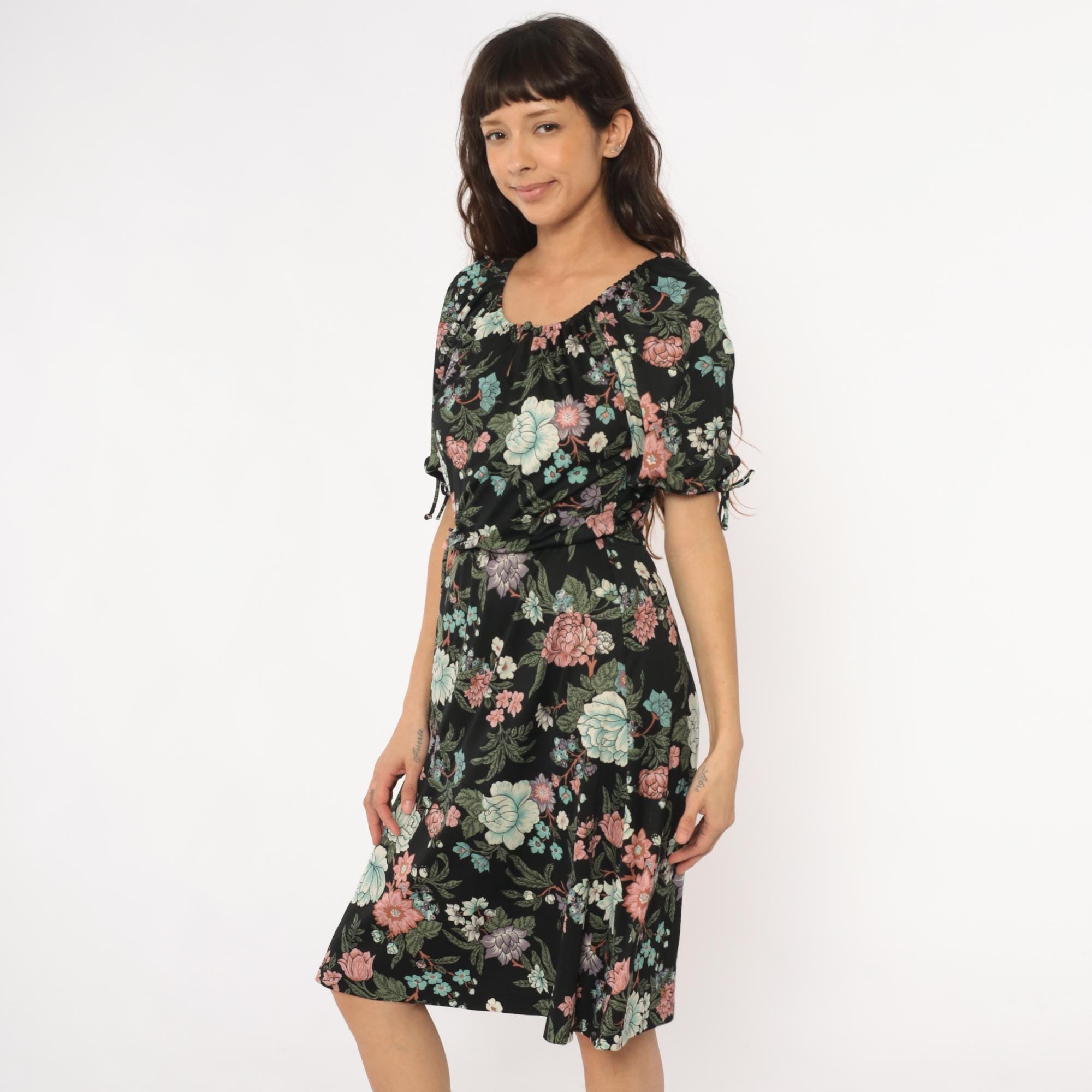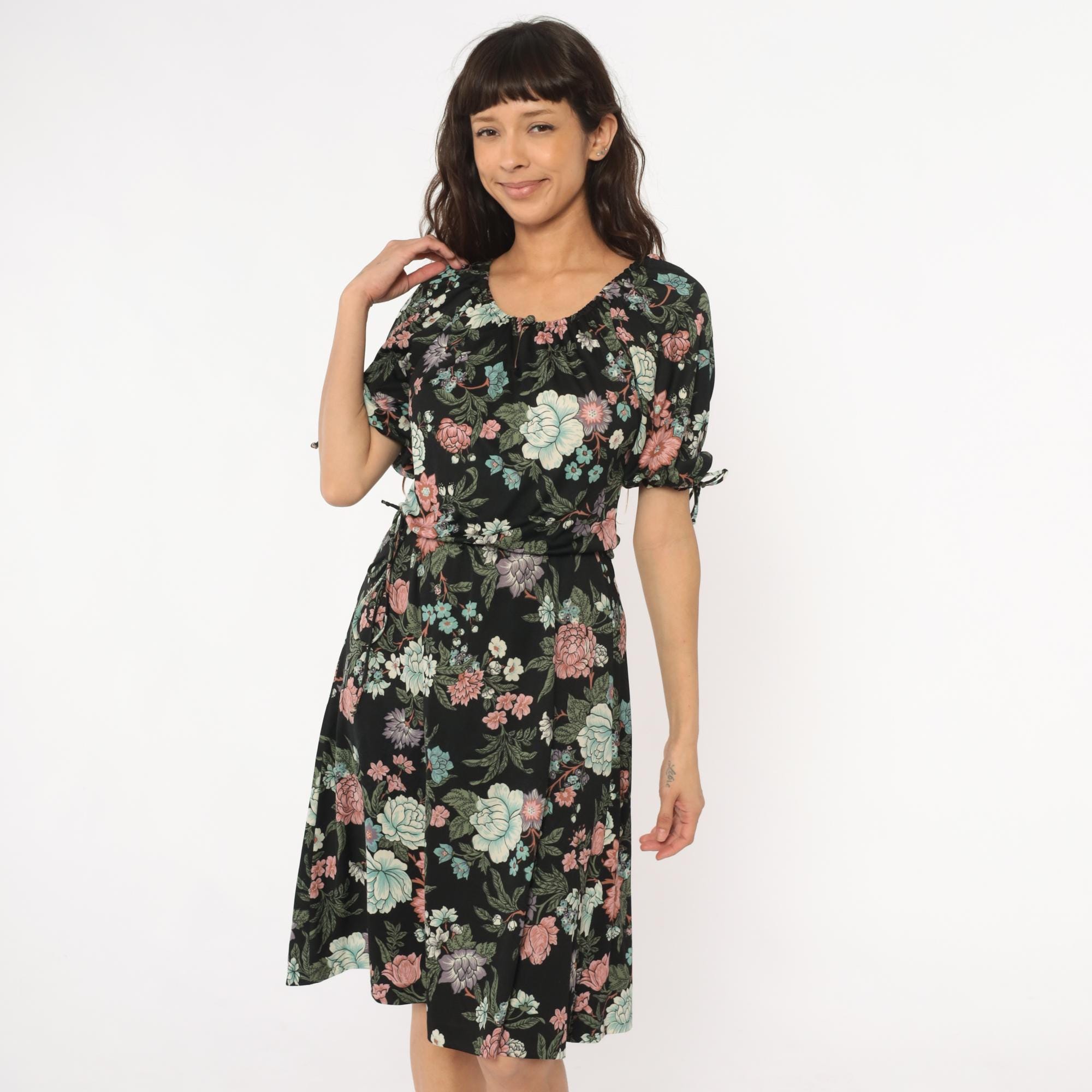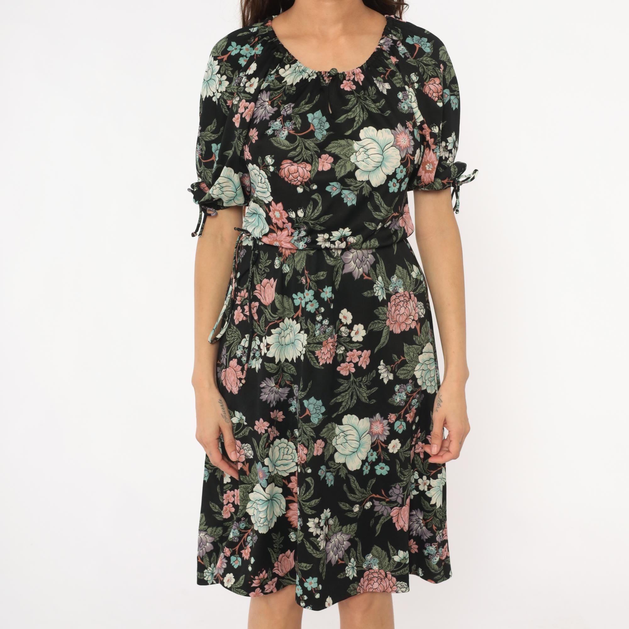 70s black floral midi dress with large-scale blooms in mint, pink, coral, lavender, and cream with green foliage throughout. Gathered elastic neckline, short sleeves with tie closures at cuffs, elastic gathered waist, A-line skirt.