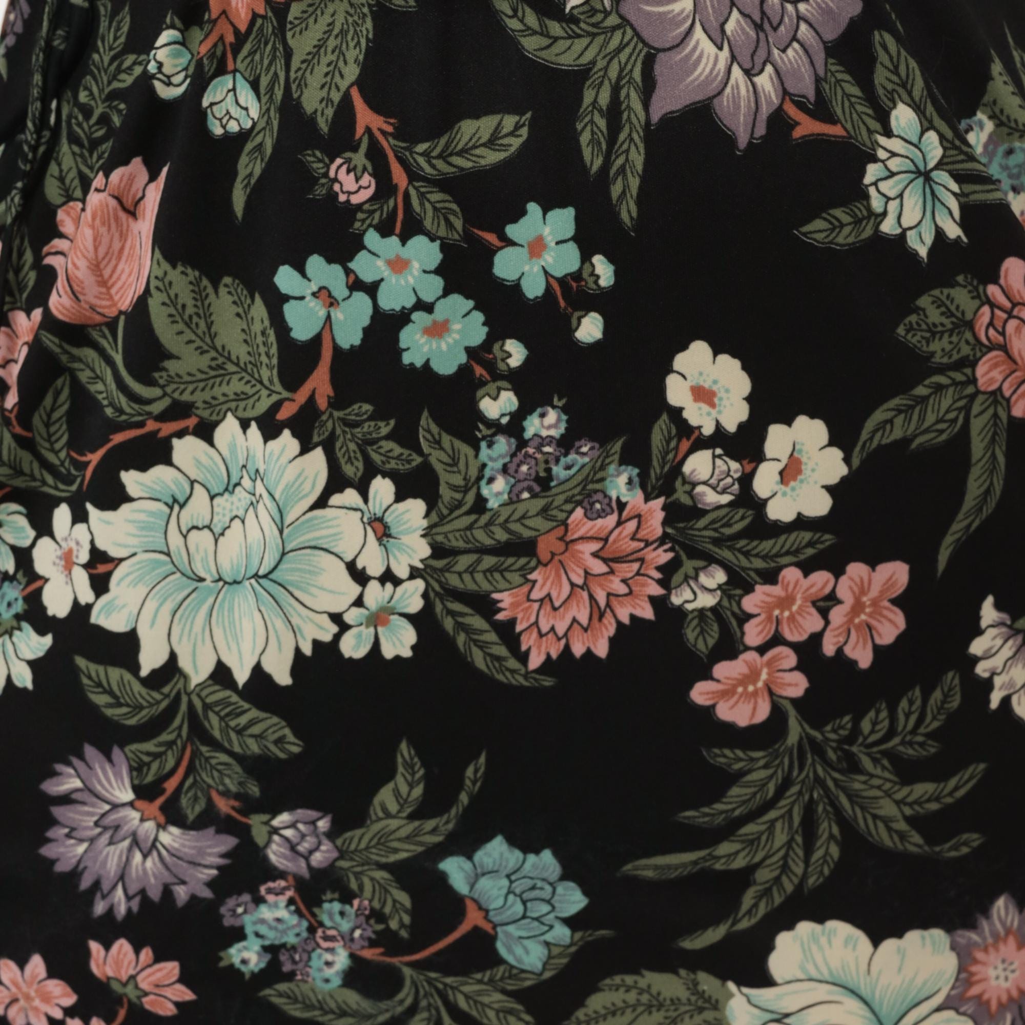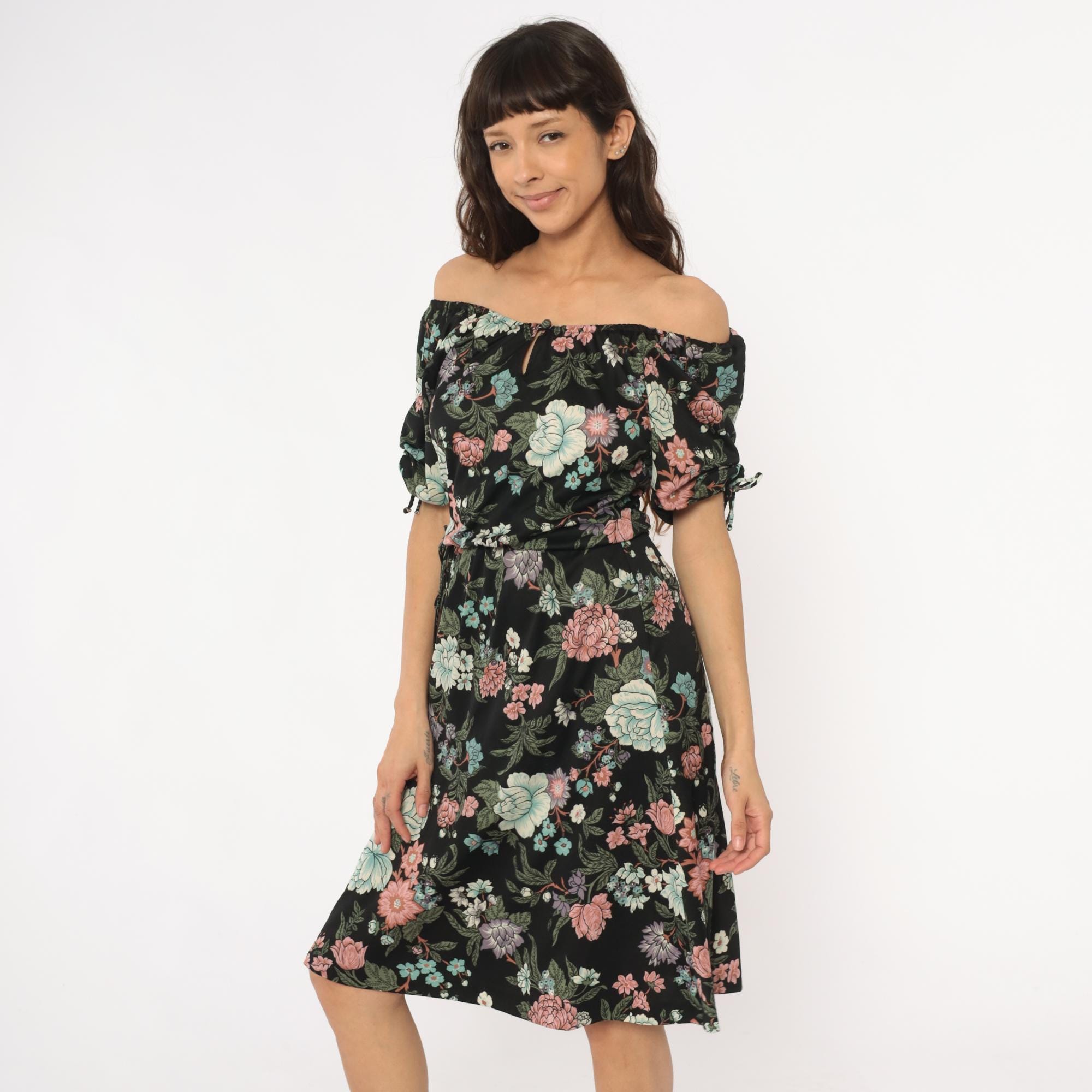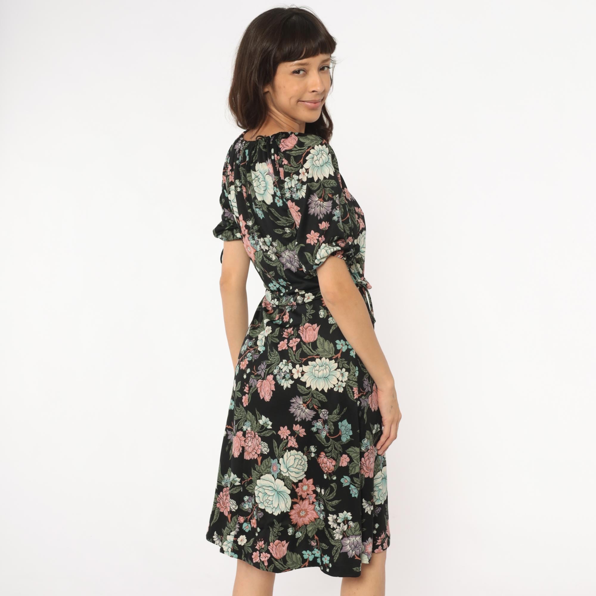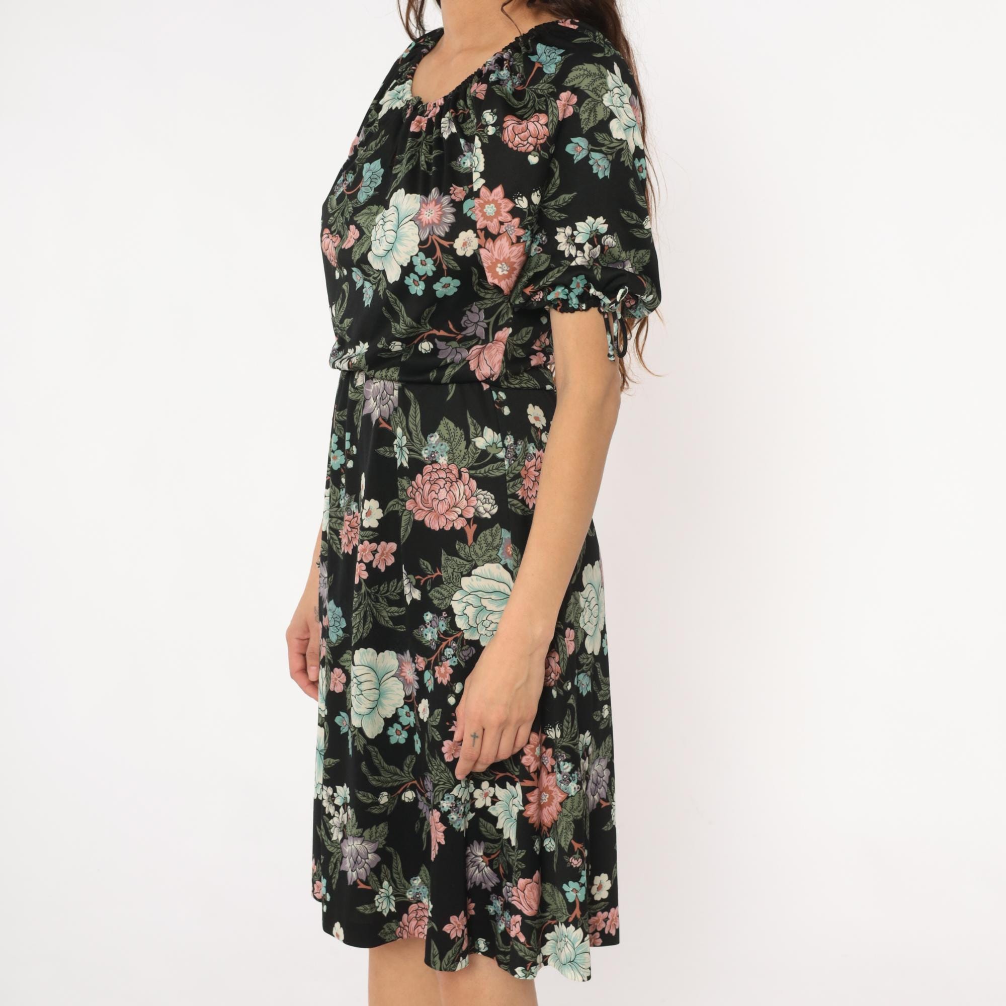 70s black floral midi dress with large-scale blooms in mint, pink, coral, lavender, and cream with green foliage throughout. Gathered elastic neckline, short sleeves with tie closures at cuffs, elastic gathered waist, A-line skirt.