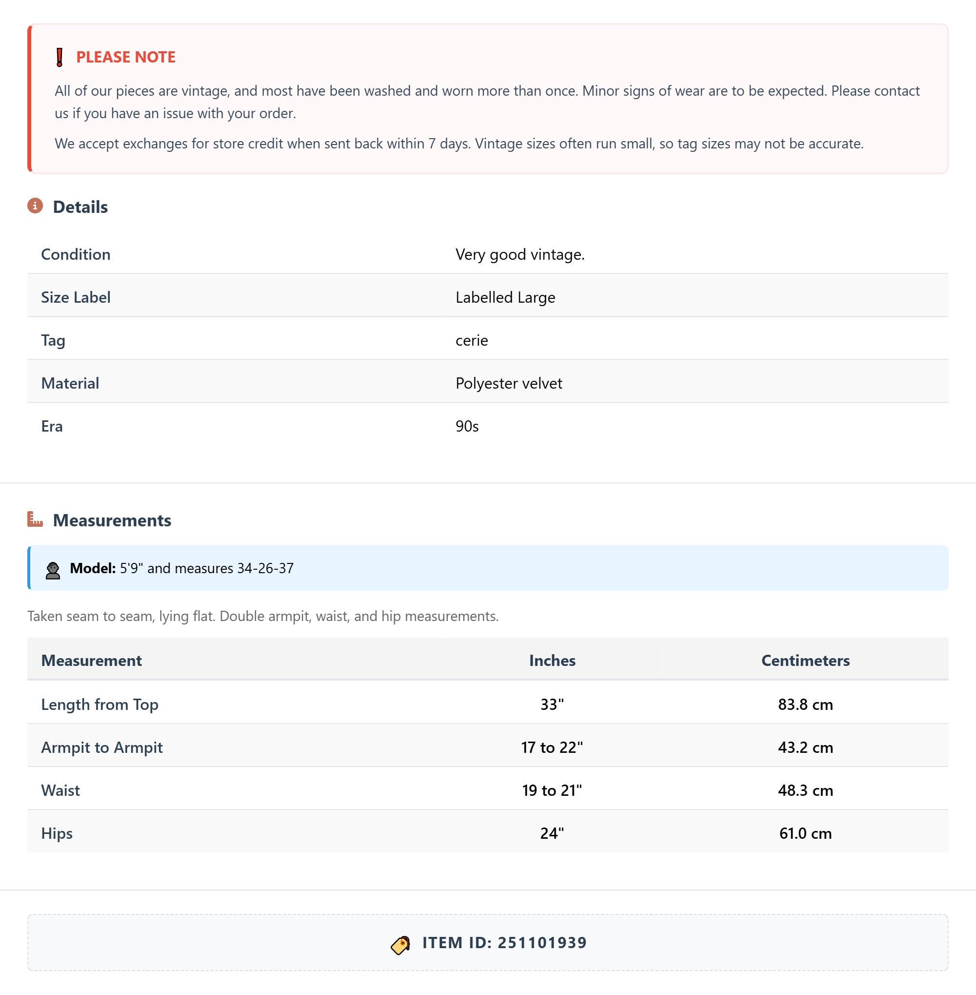 All of our pieces are vintage, and most have been washed and worn more than once. Minor signs of wear are to be expected. Please contact us if you have an issue with your order. We accept exchanges for store credit when sent back within 7 days.