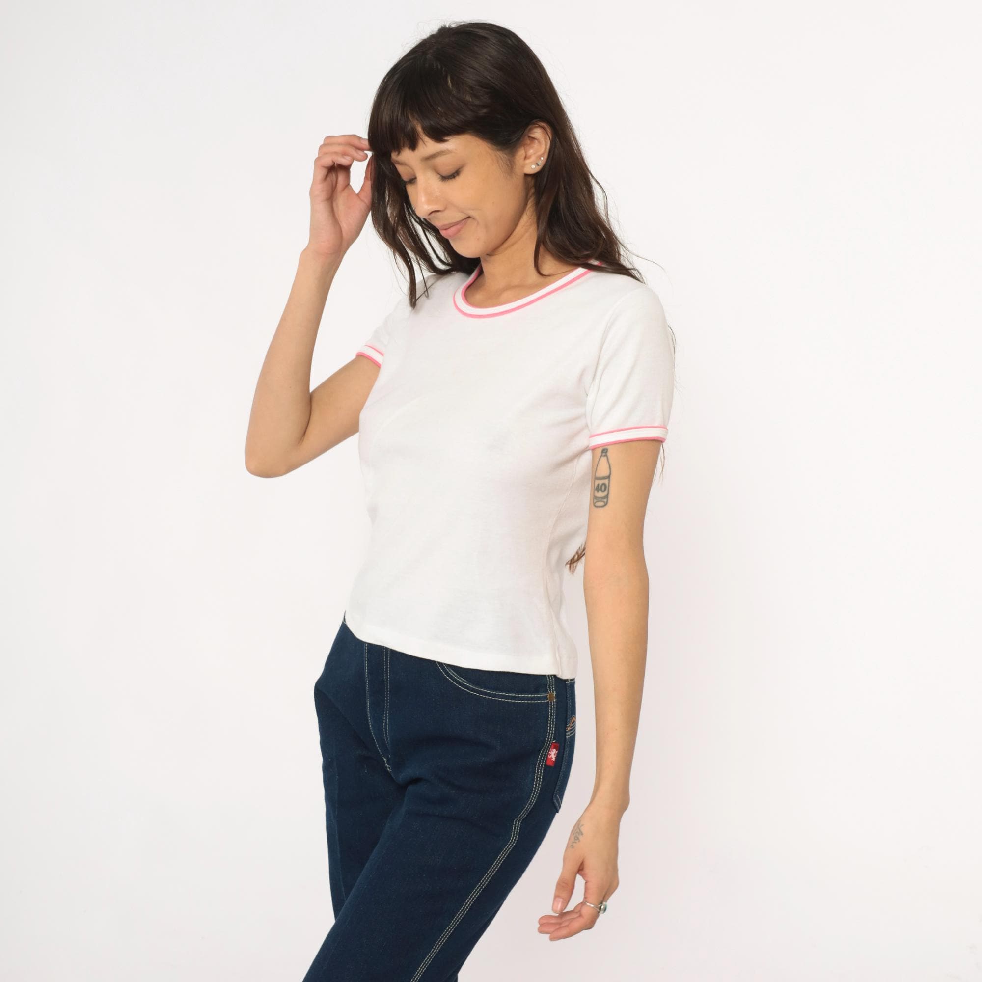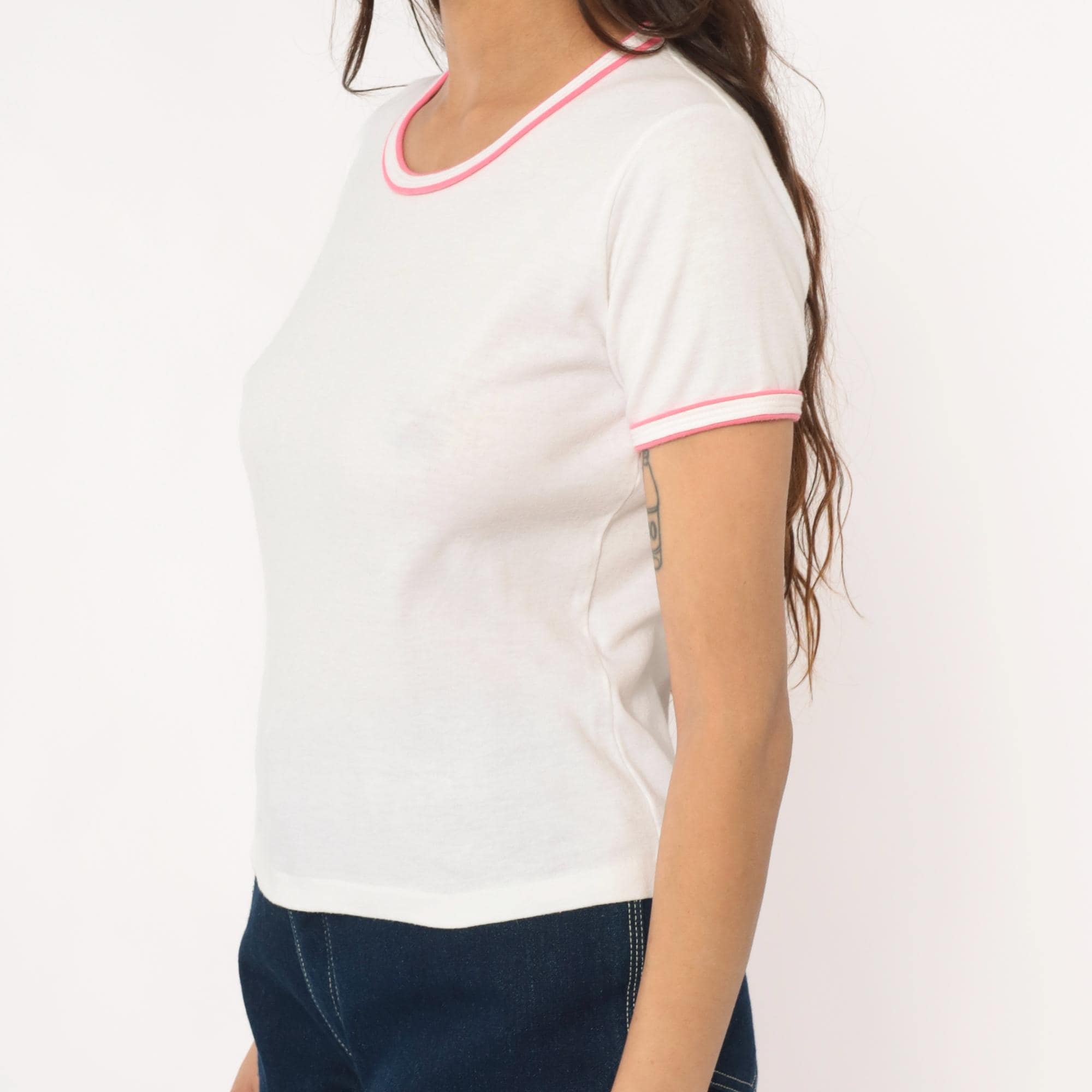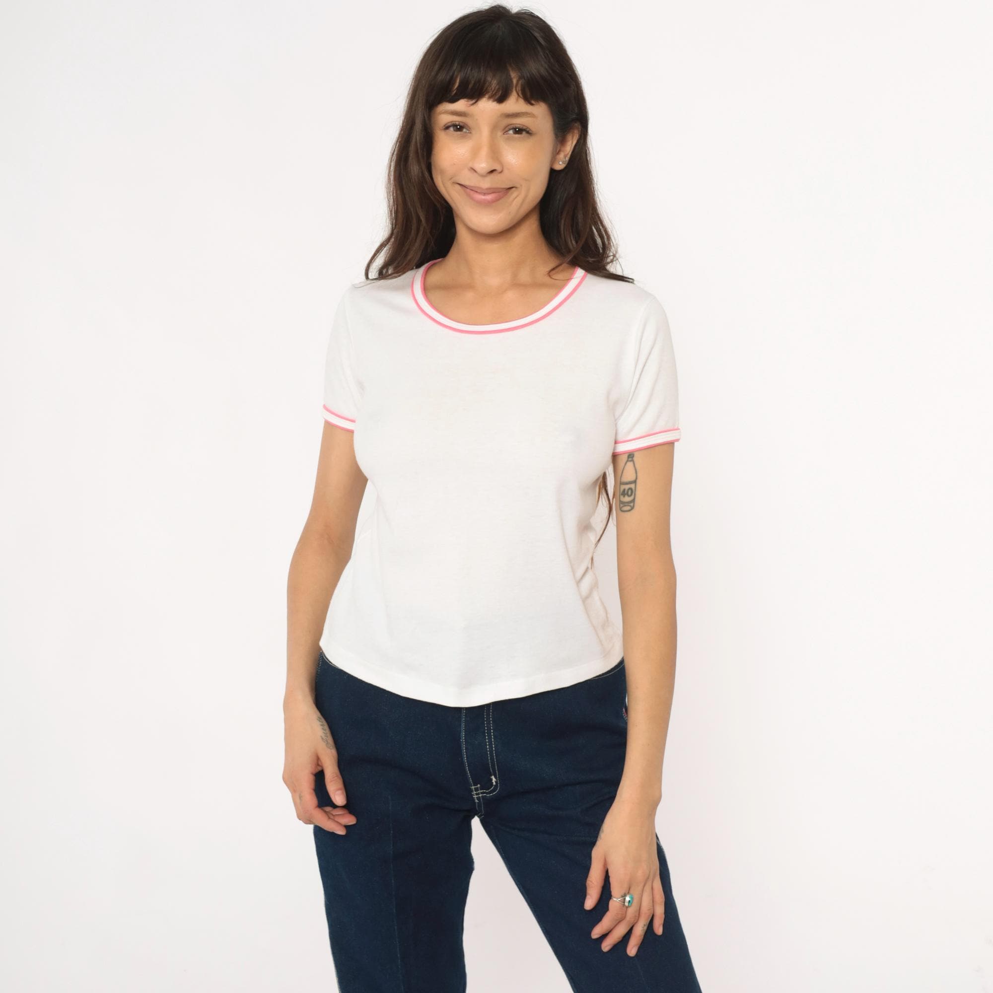 80s white ringer tee from Herman Geist with pink and white striped trim at crew neckline and short sleeve cuffs. Simple construction with no graphics or embellishments.