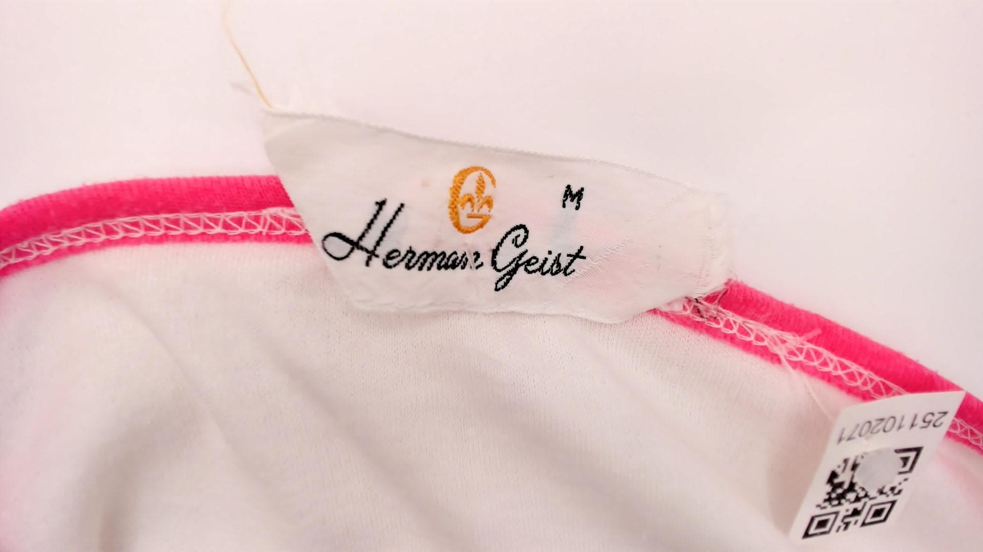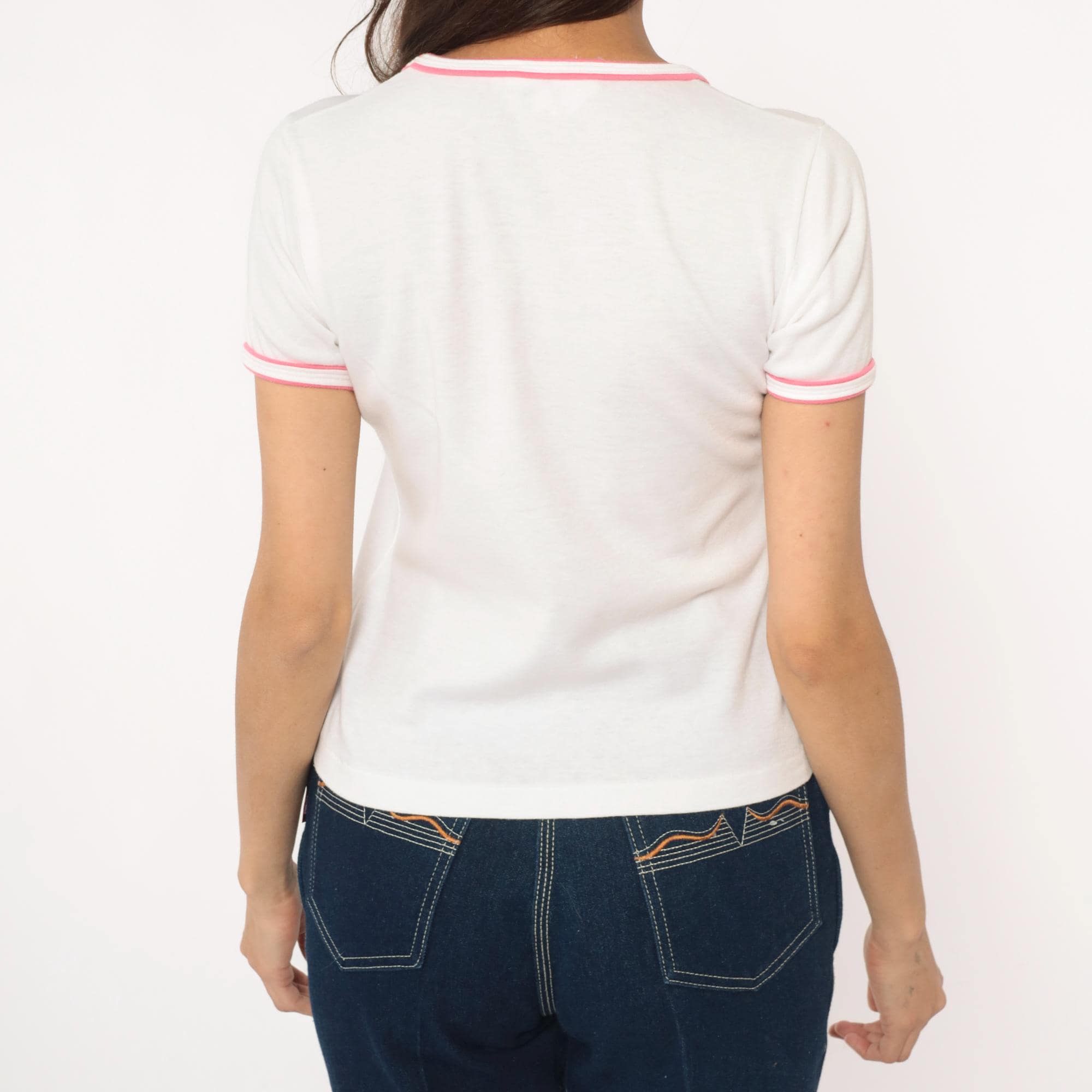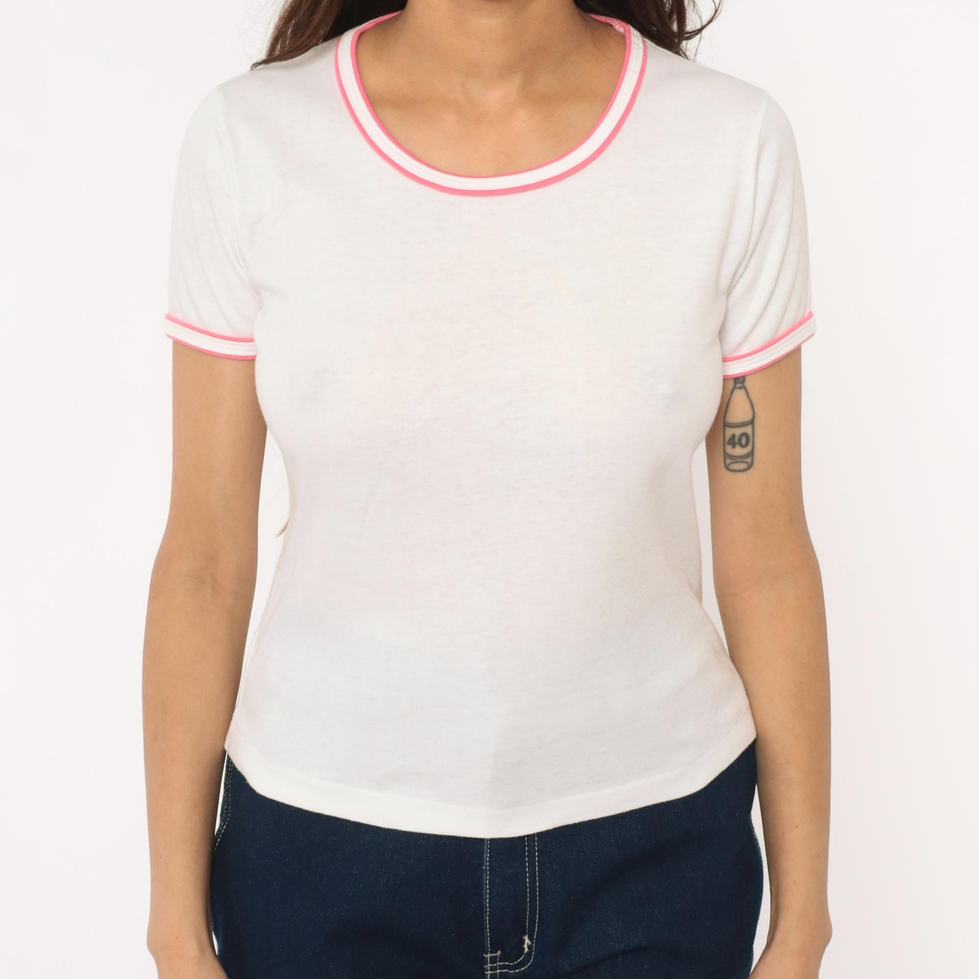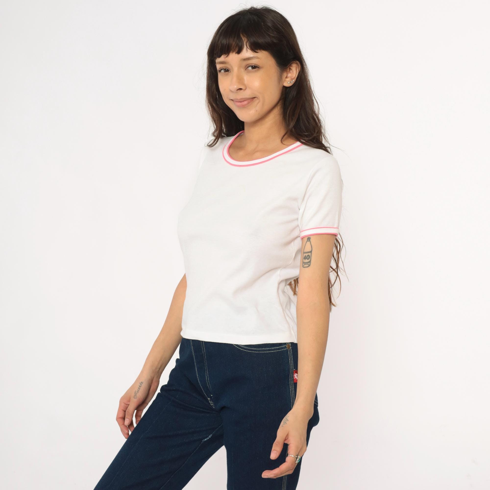 80s white ringer tee from Herman Geist with pink and white striped trim at crew neckline and short sleeve cuffs. Simple construction with no graphics or embellishments.