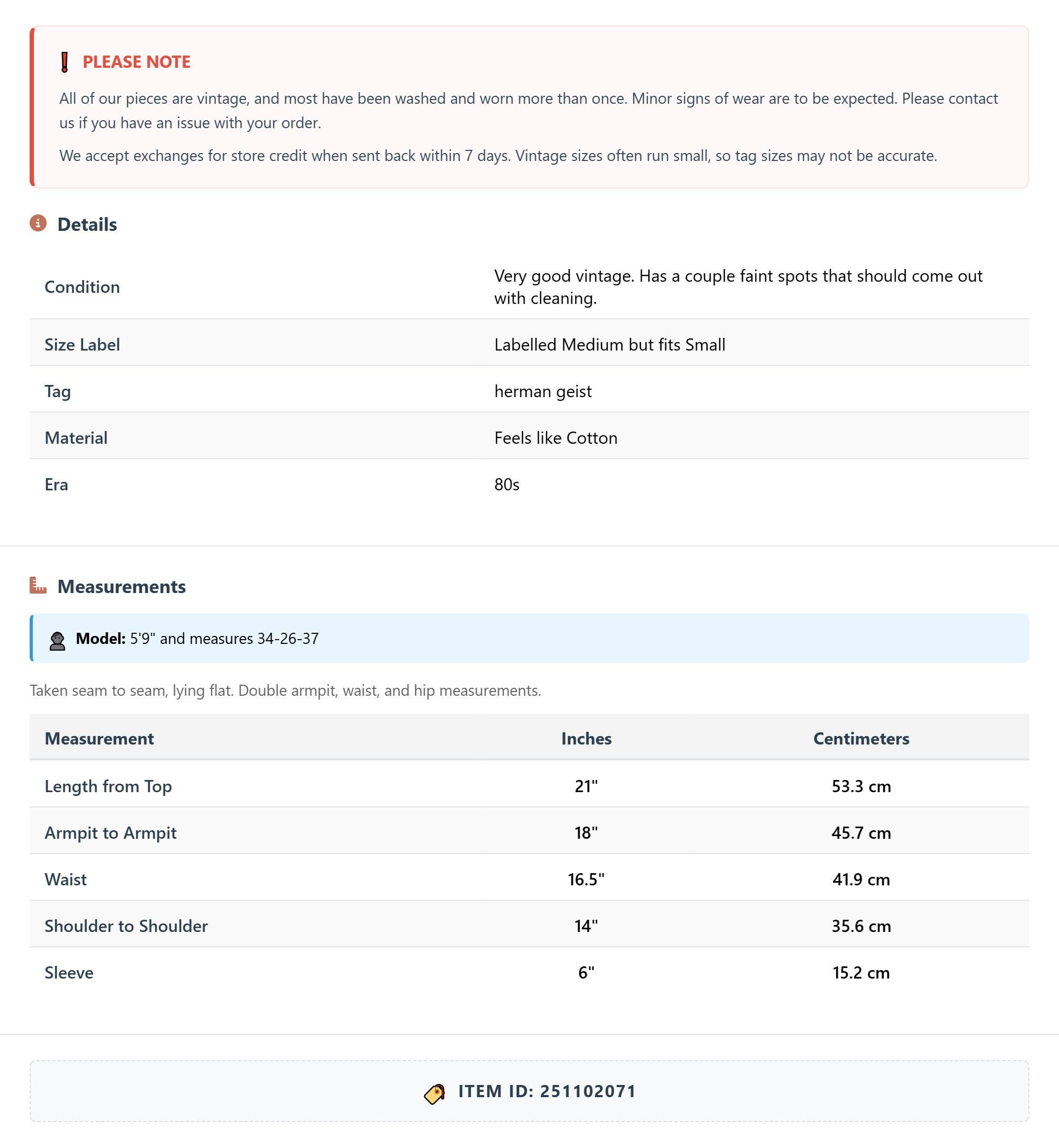 Suggested sizes are estimates only; see measurements for exact sizing. Vintage sizes often run small, so tag sizes may not be accurate.