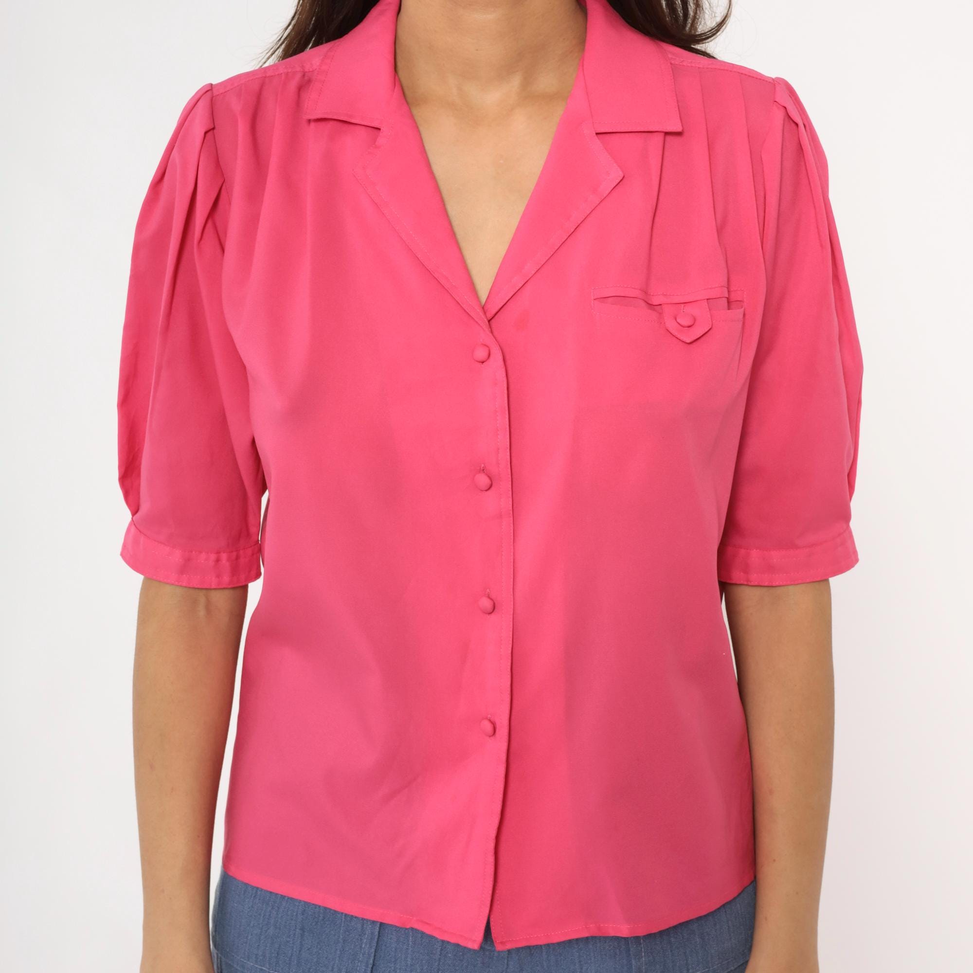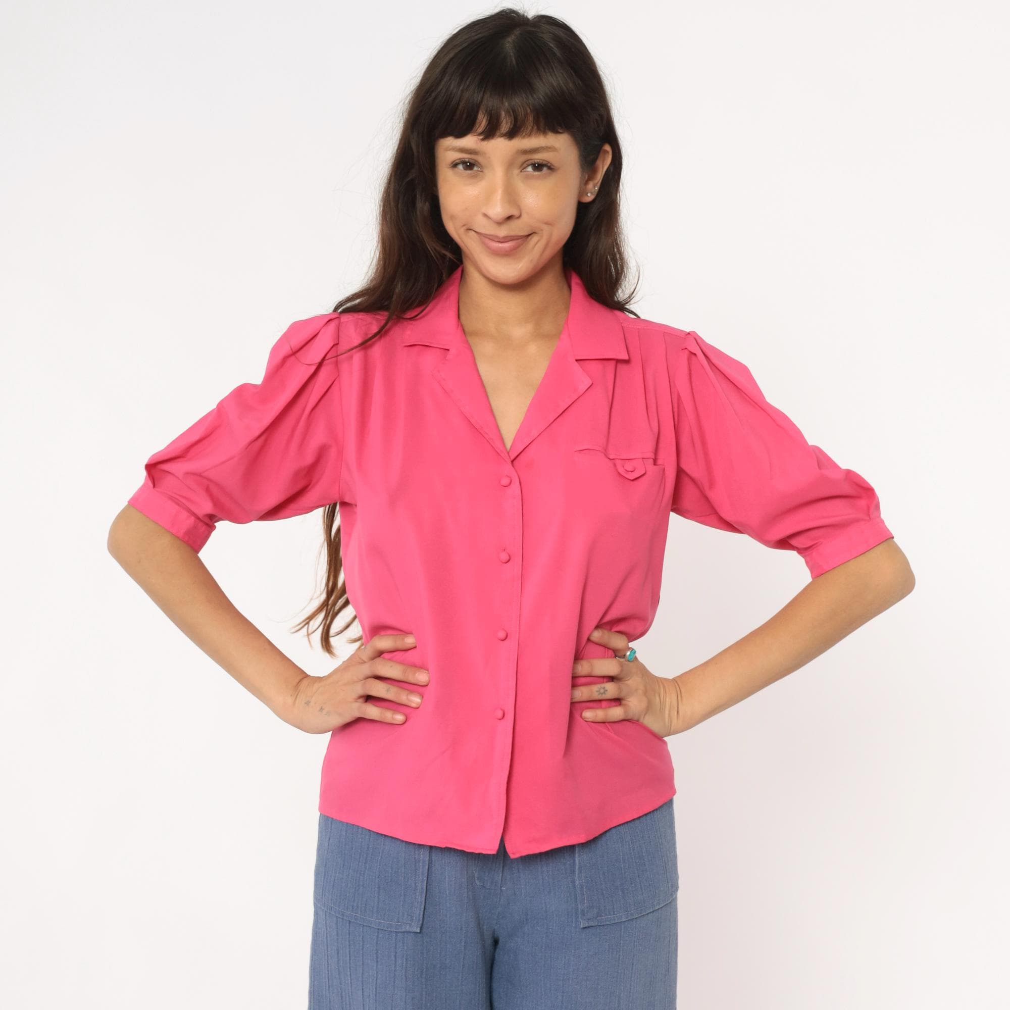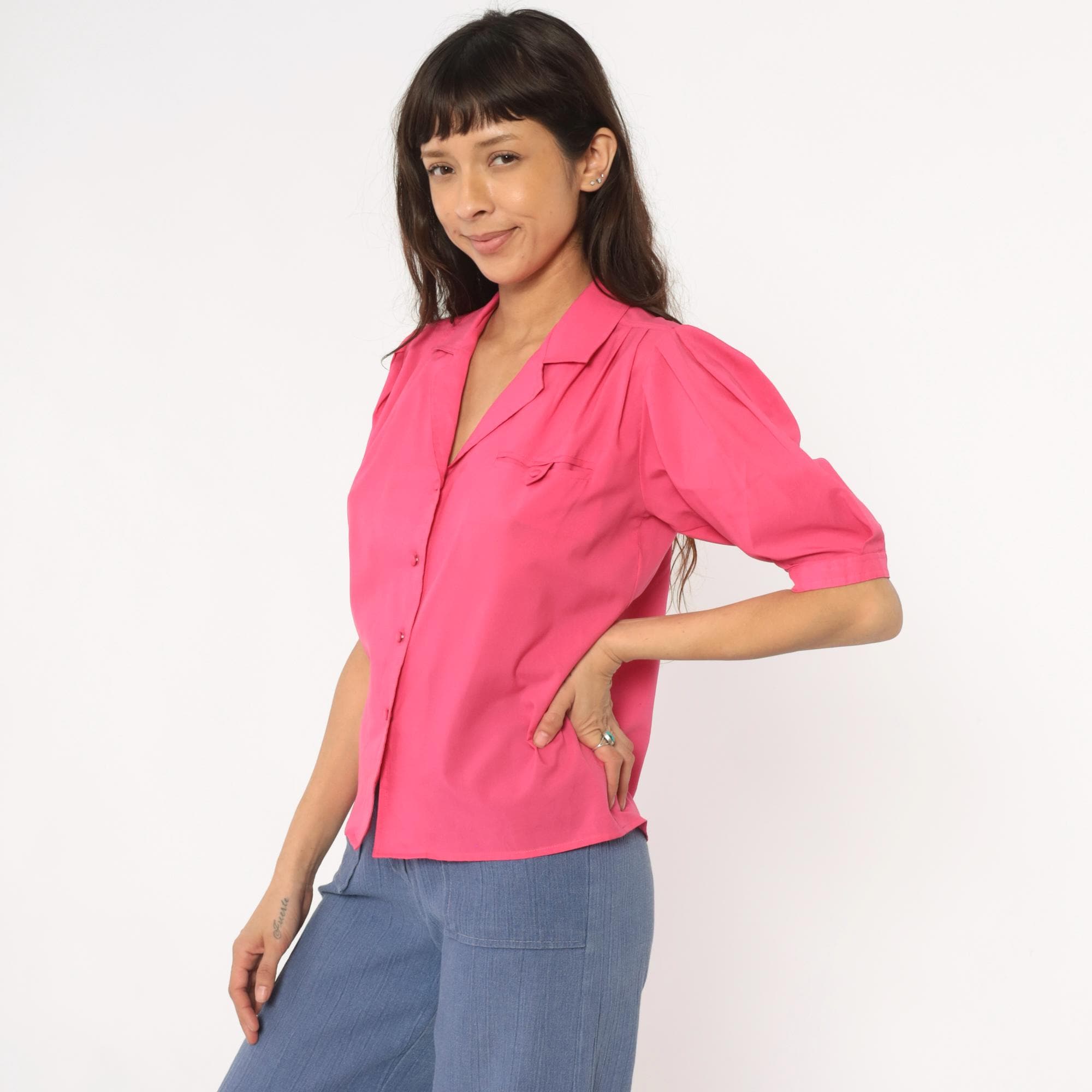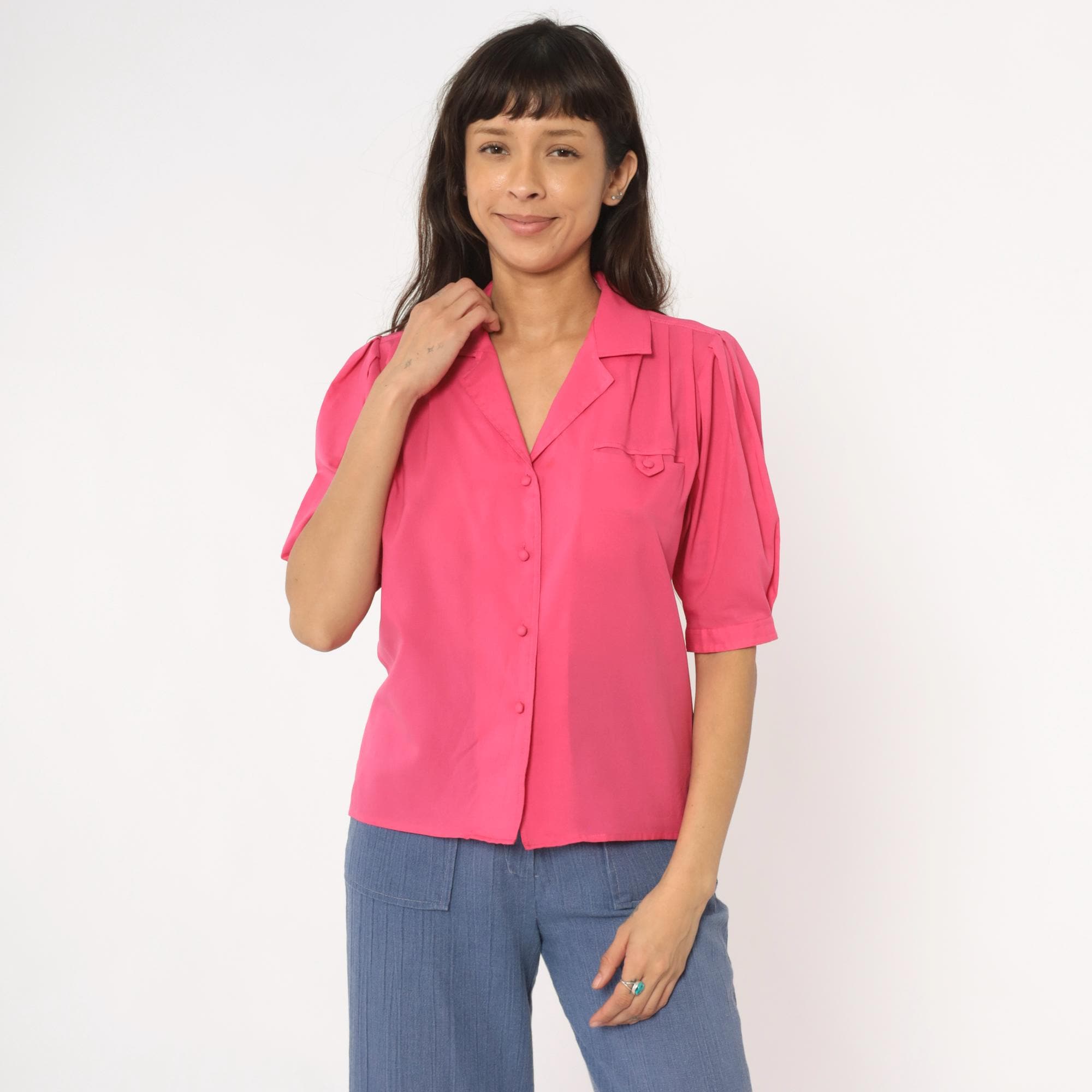 Hot pink collared blouse from Josephine with notched collar and button front closure. Puffed short sleeves with button cuffs, chest pocket, gathered shoulders and back yoke detail.