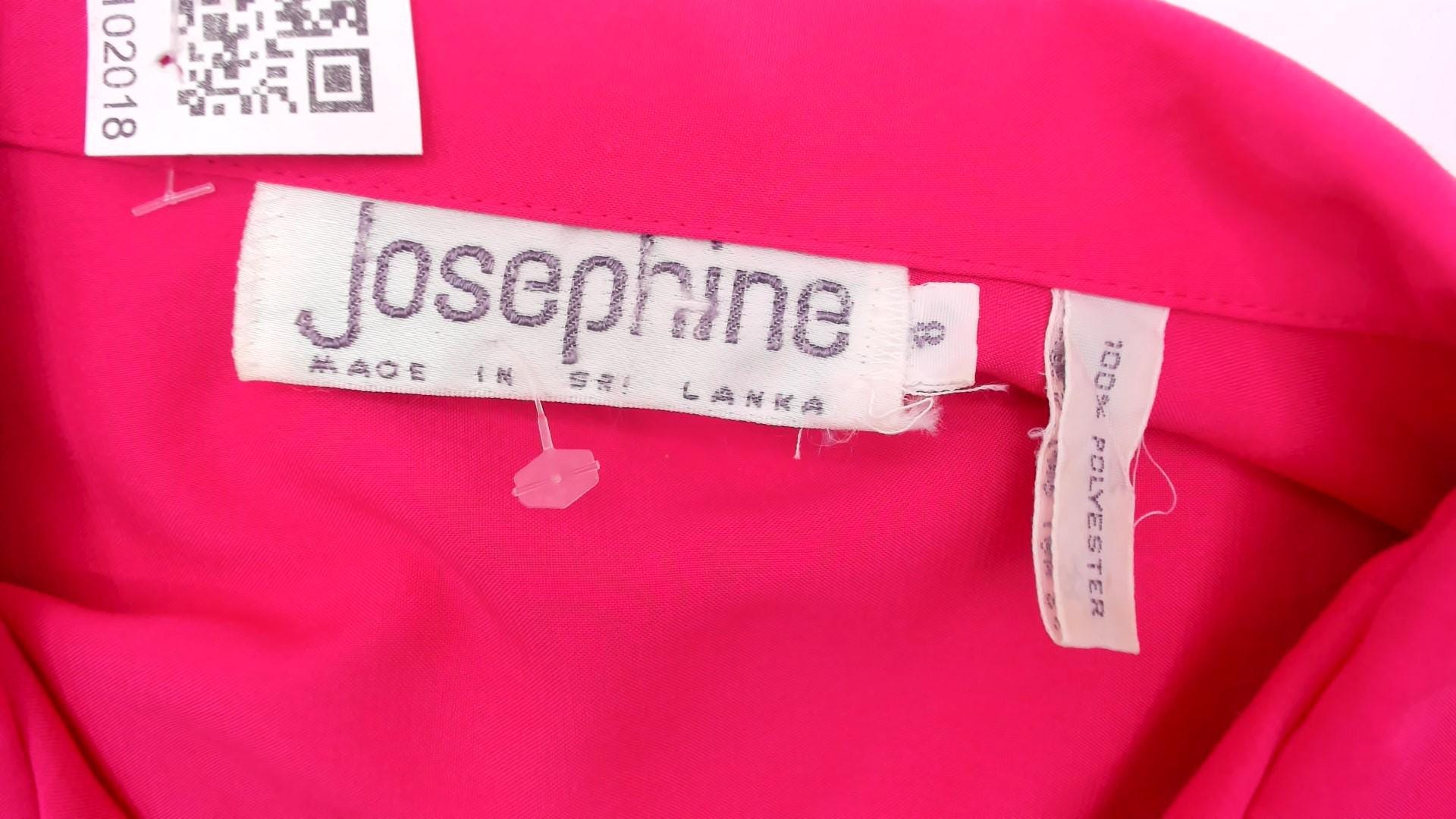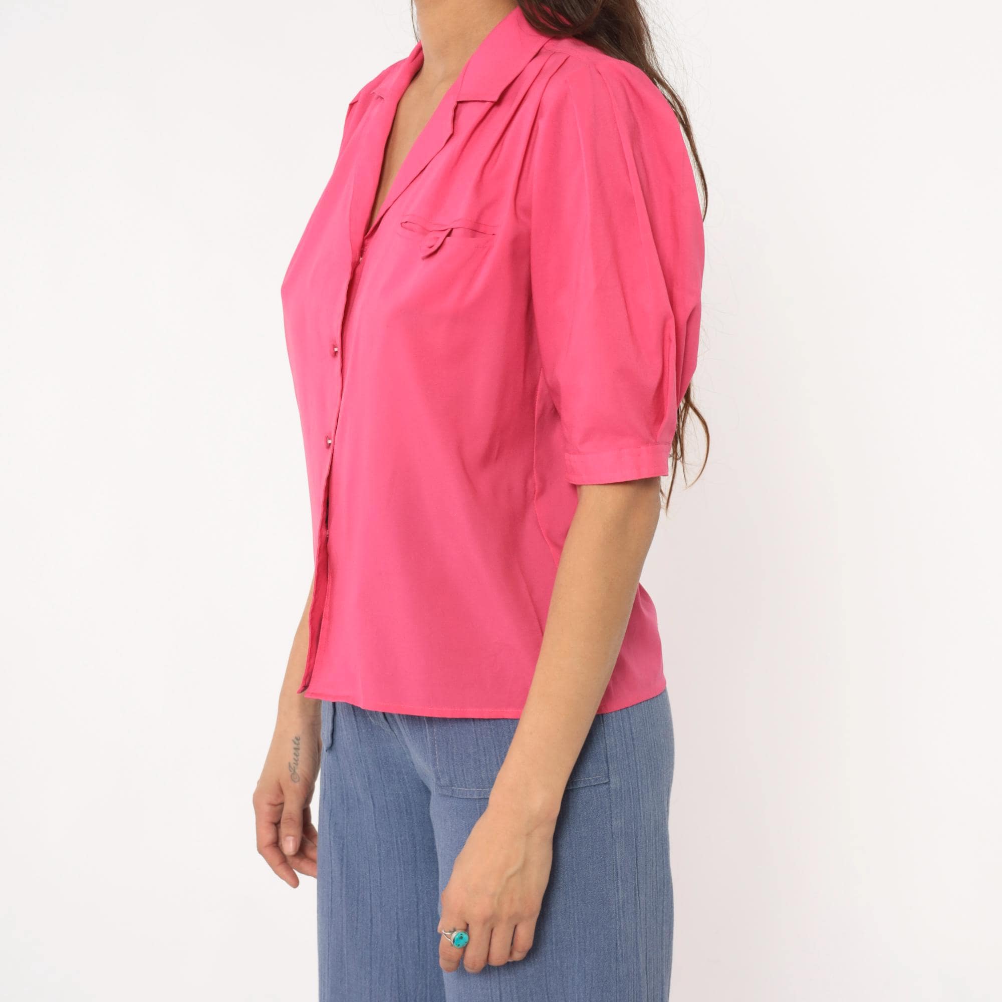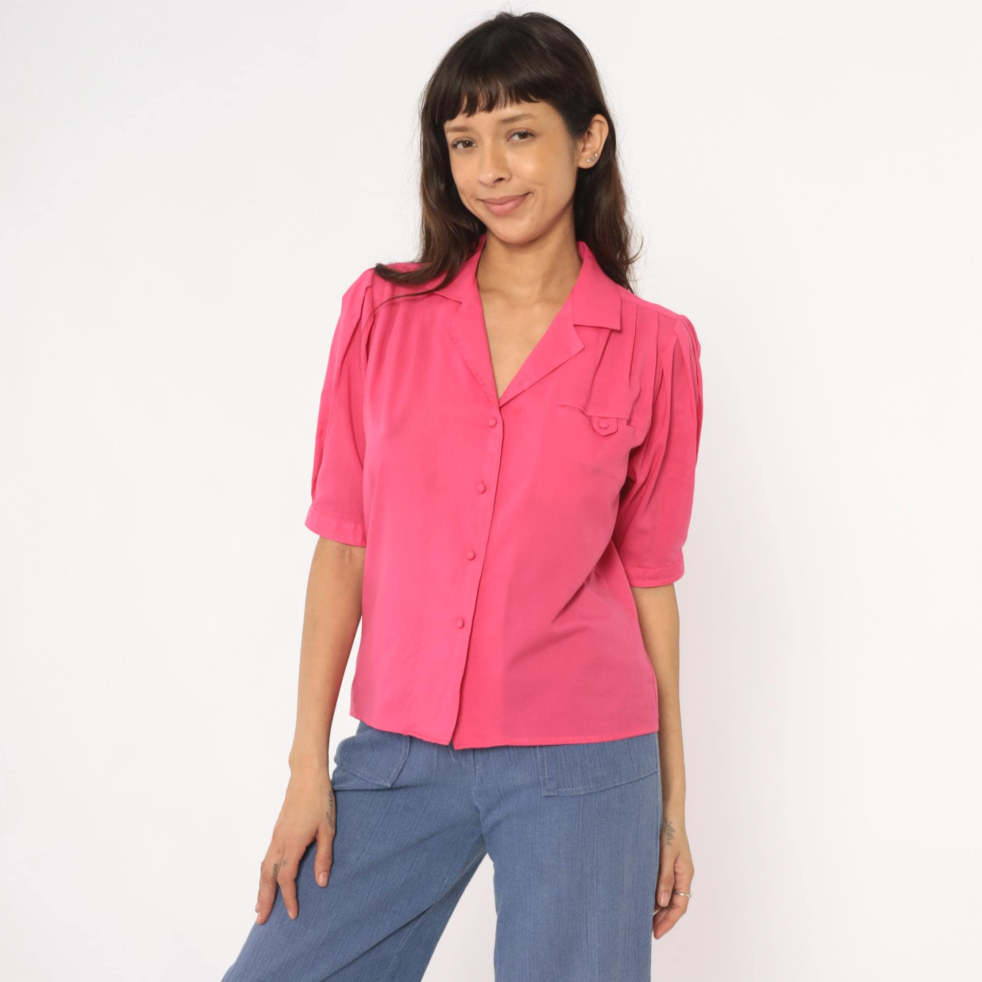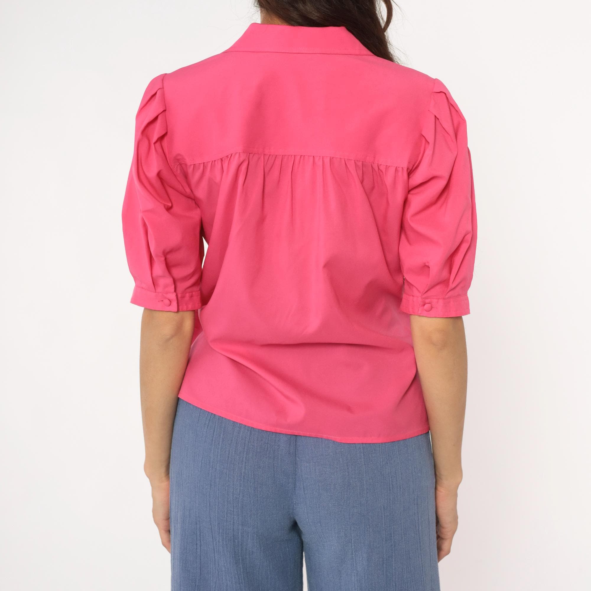 Hot pink collared blouse from Josephine with notched collar and button front closure. Puffed short sleeves with button cuffs, chest pocket, gathered shoulders and back yoke detail.