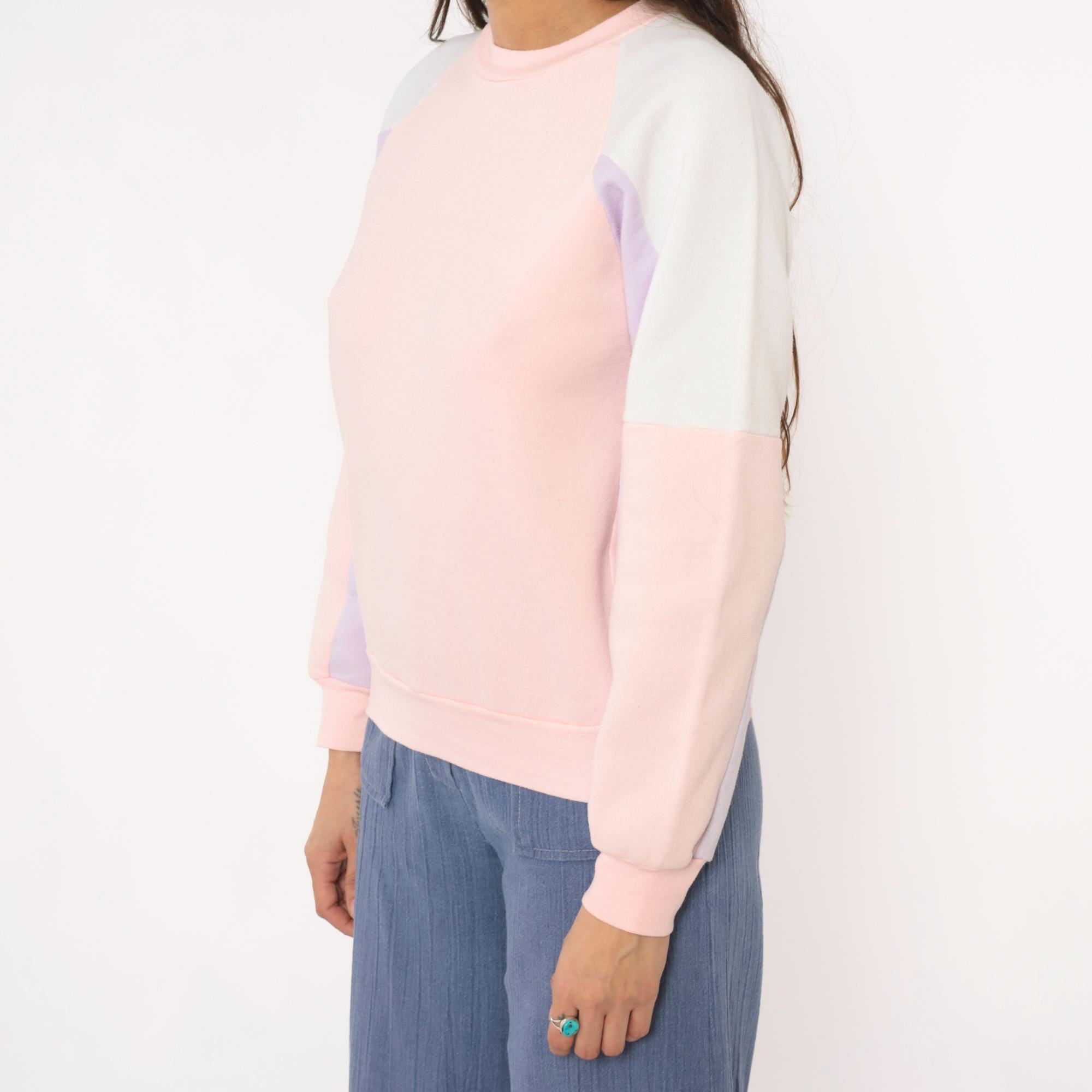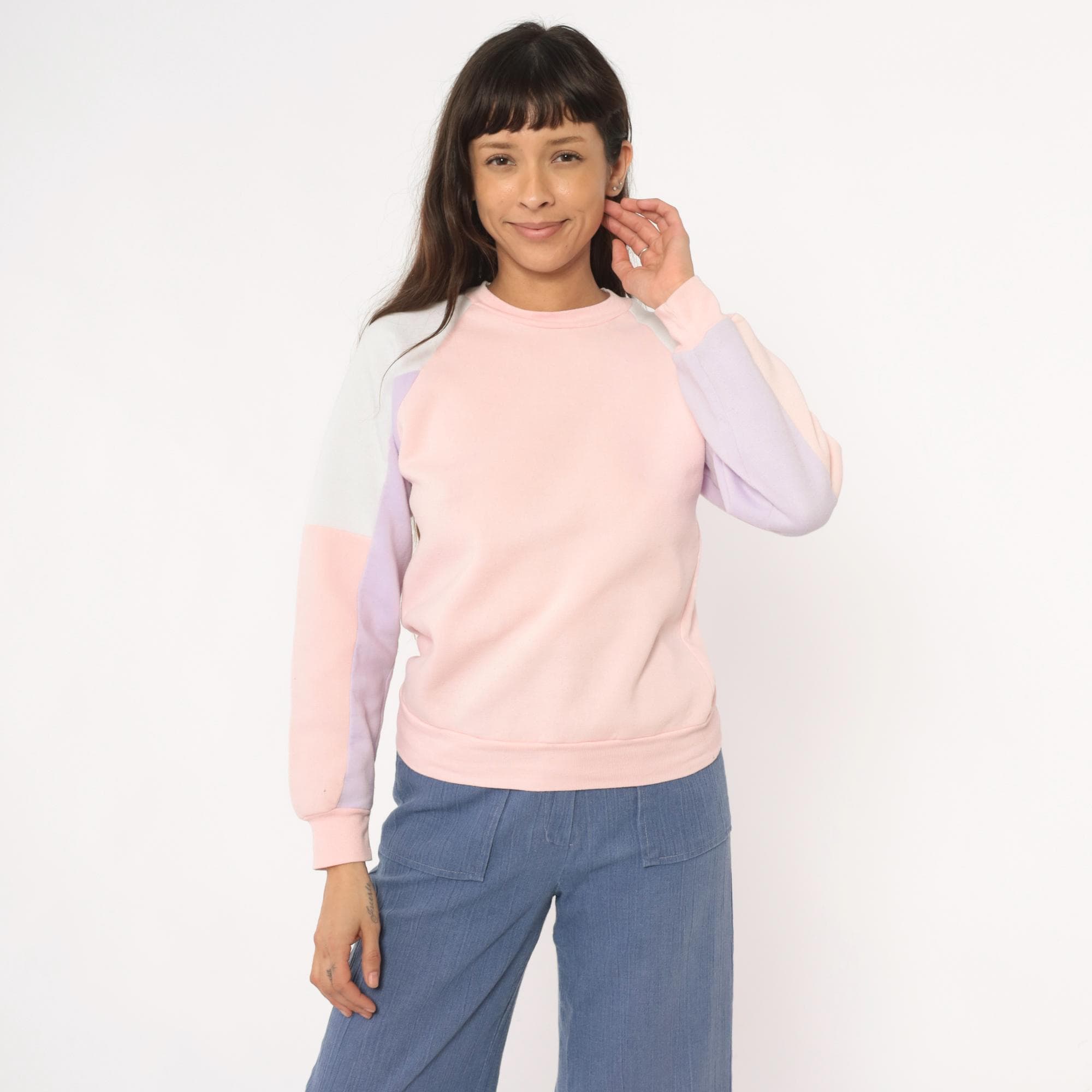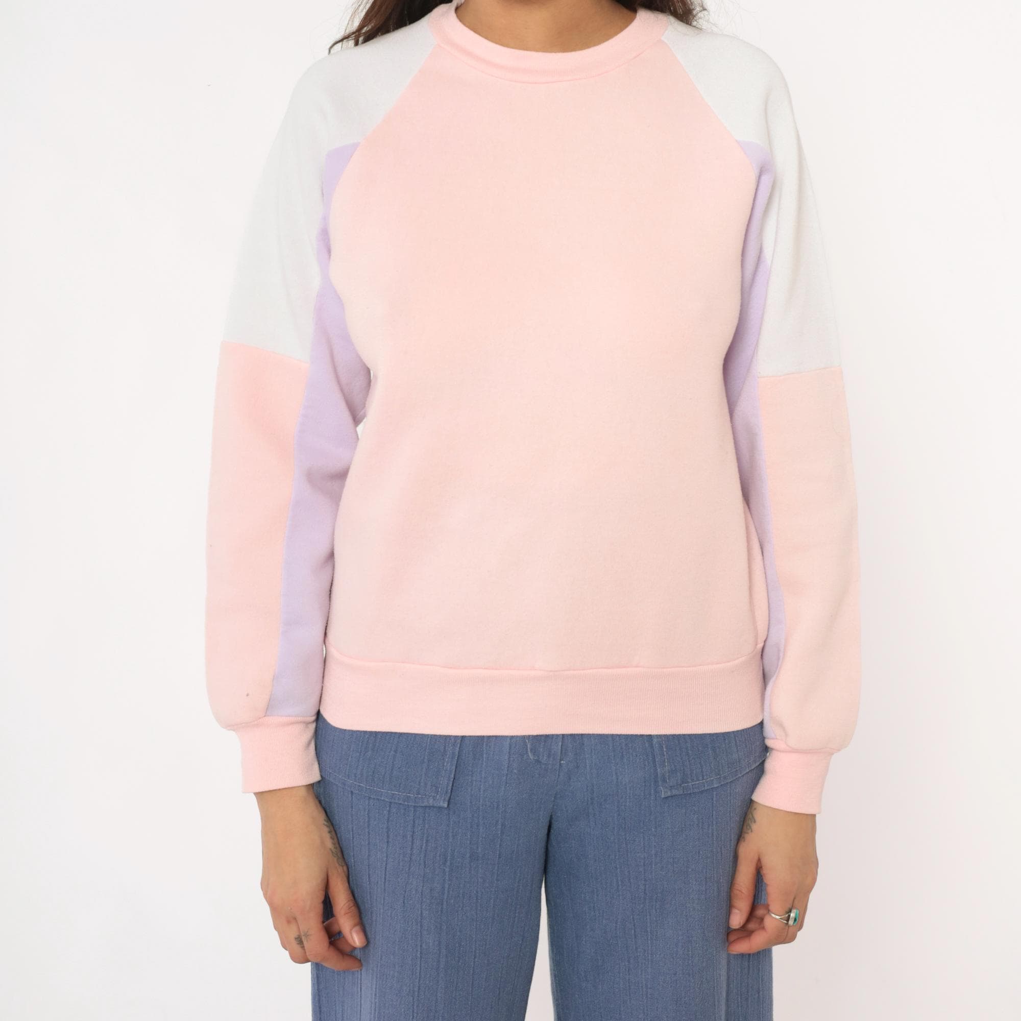 80s pastel colorblock sweatshirt with pink, lavender, white, and cream panel sections. Crew neckline with long sleeves, ribbed cuffs, collar, and hem.