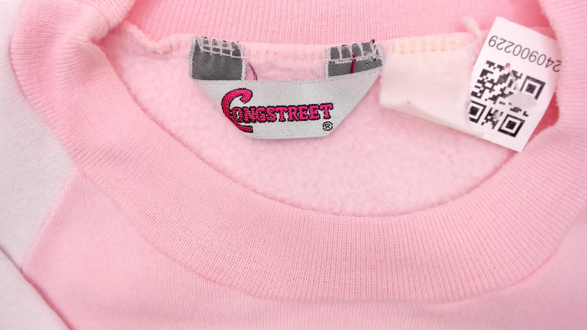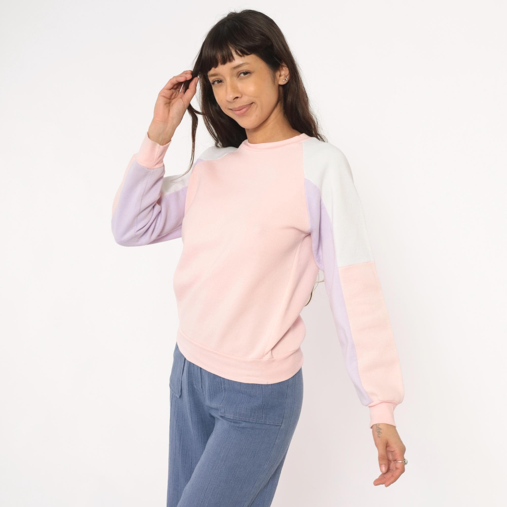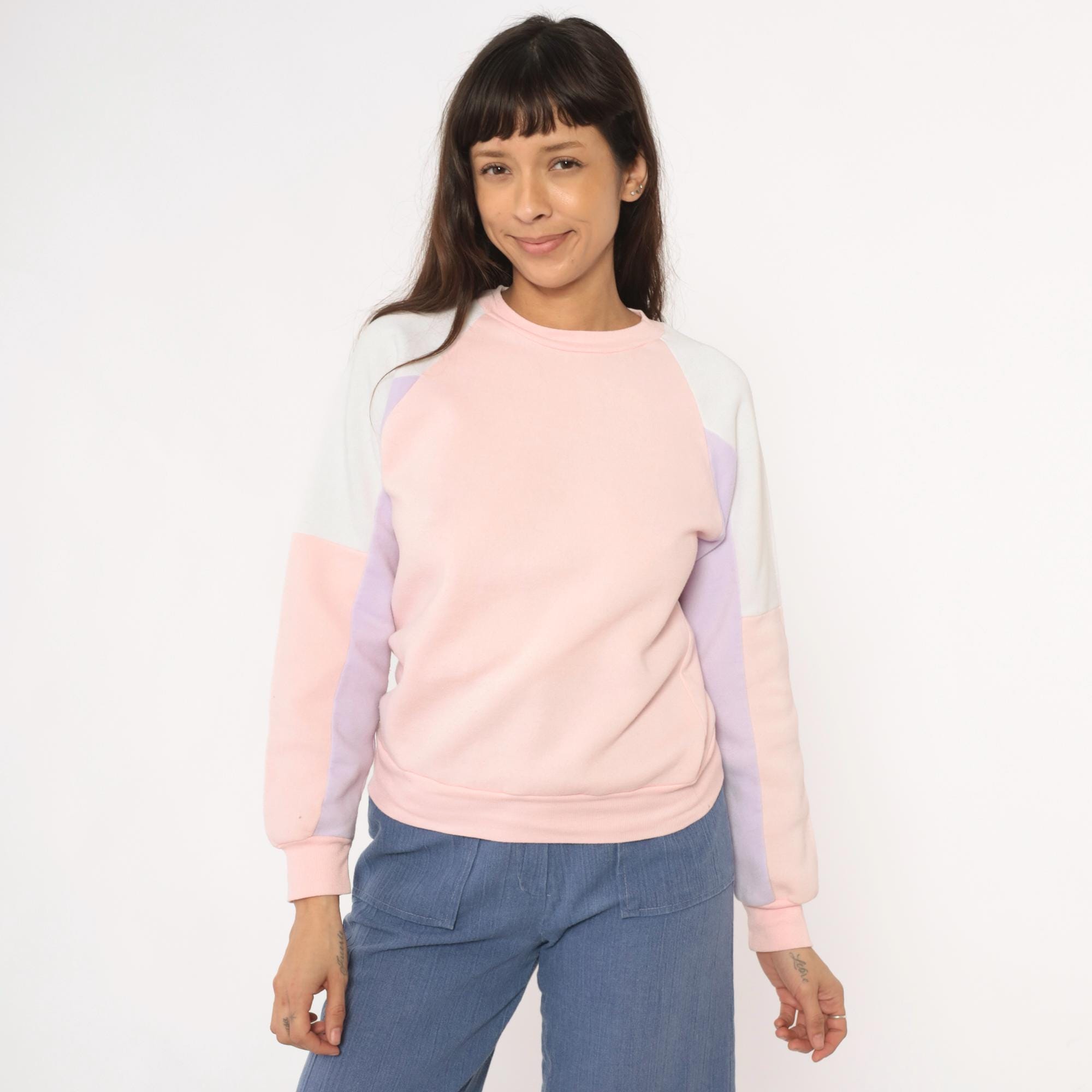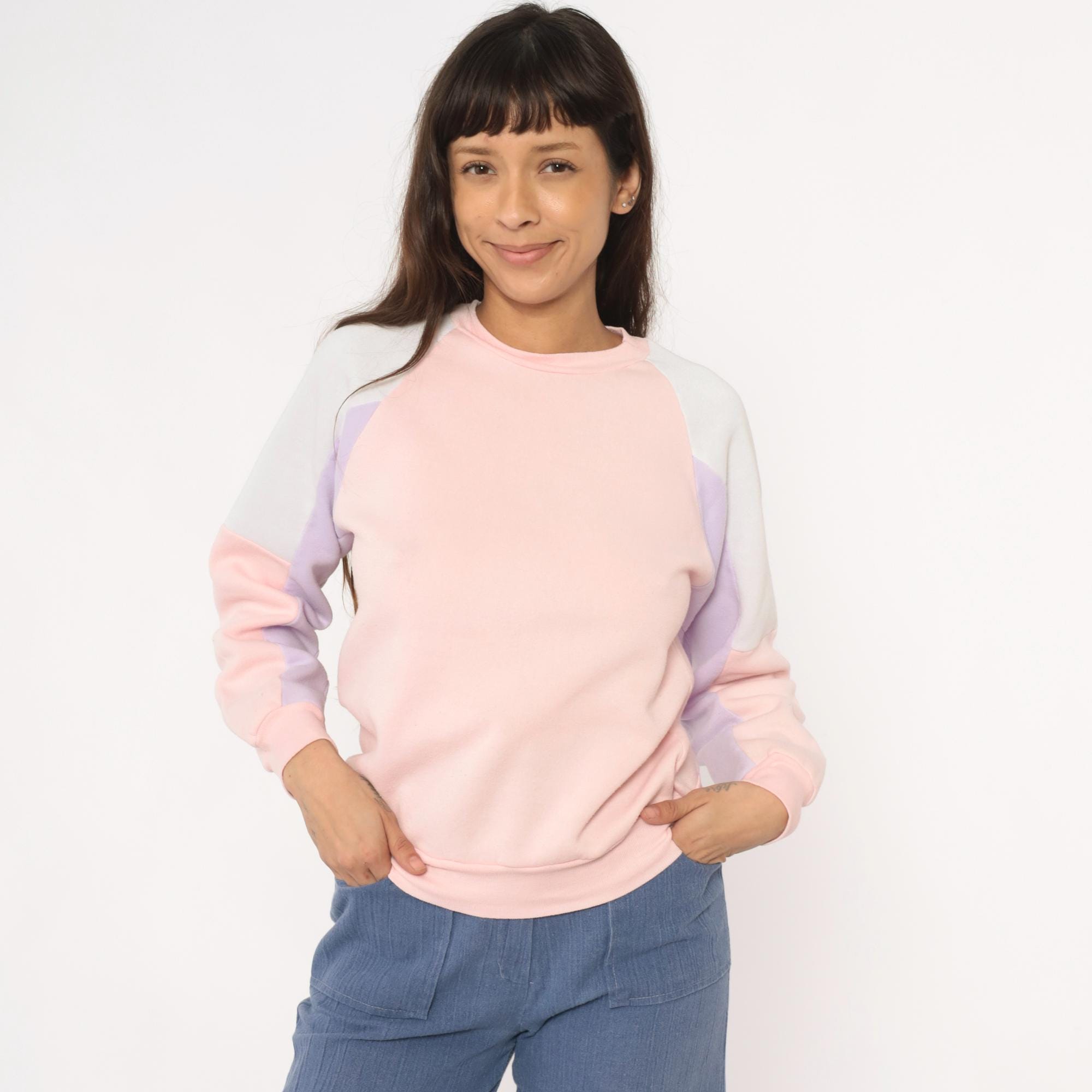 80s pastel colorblock sweatshirt with pink, lavender, white, and cream panel sections. Crew neckline with long sleeves, ribbed cuffs, collar, and hem.