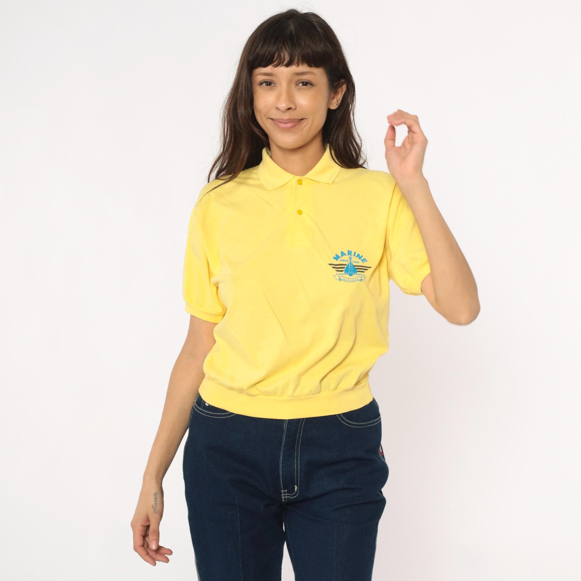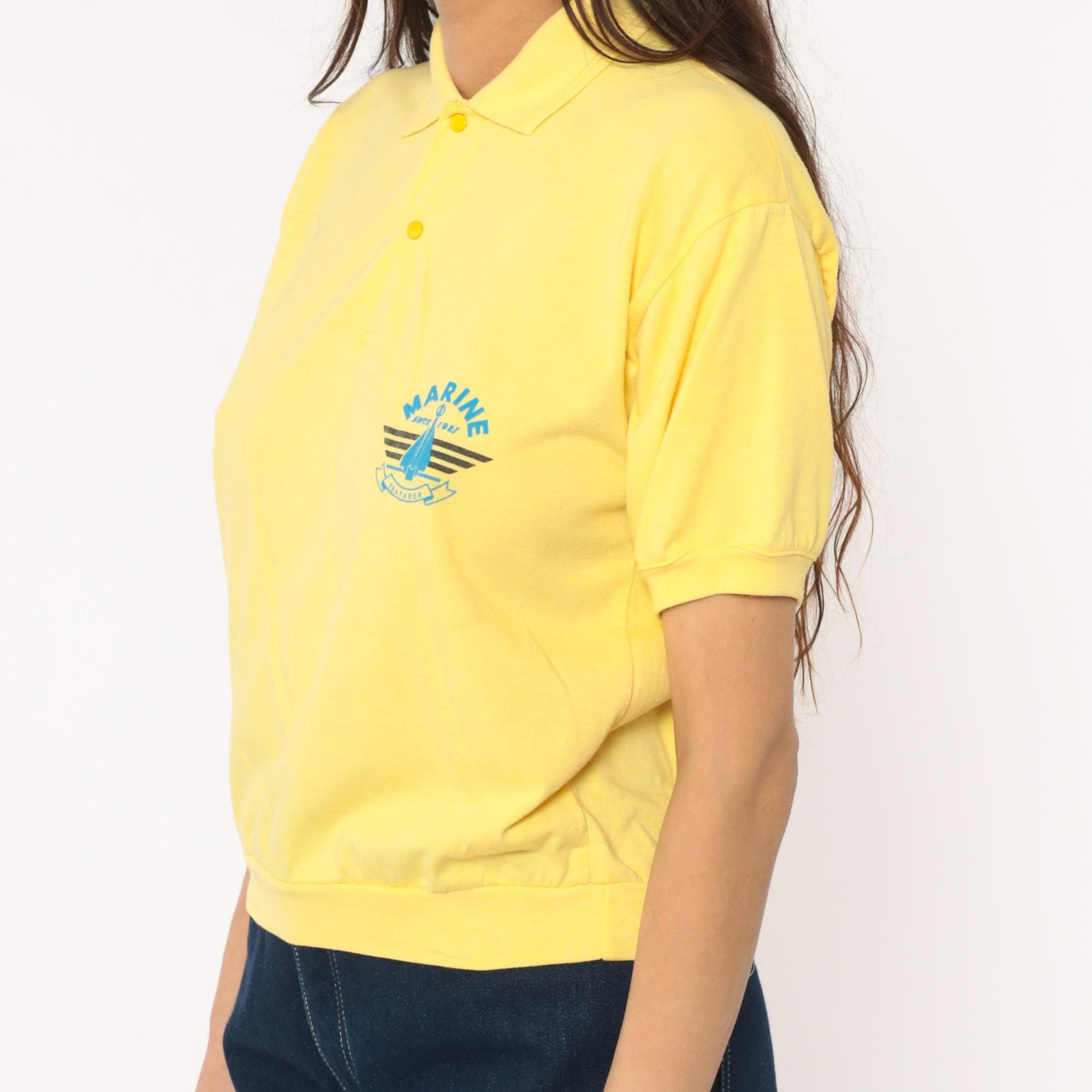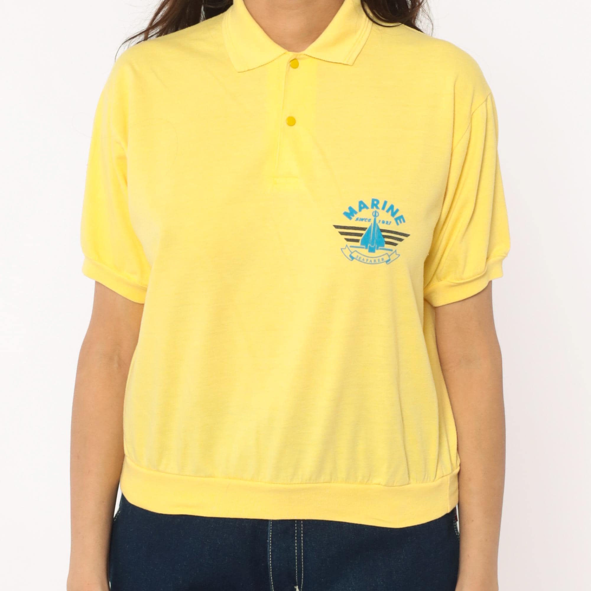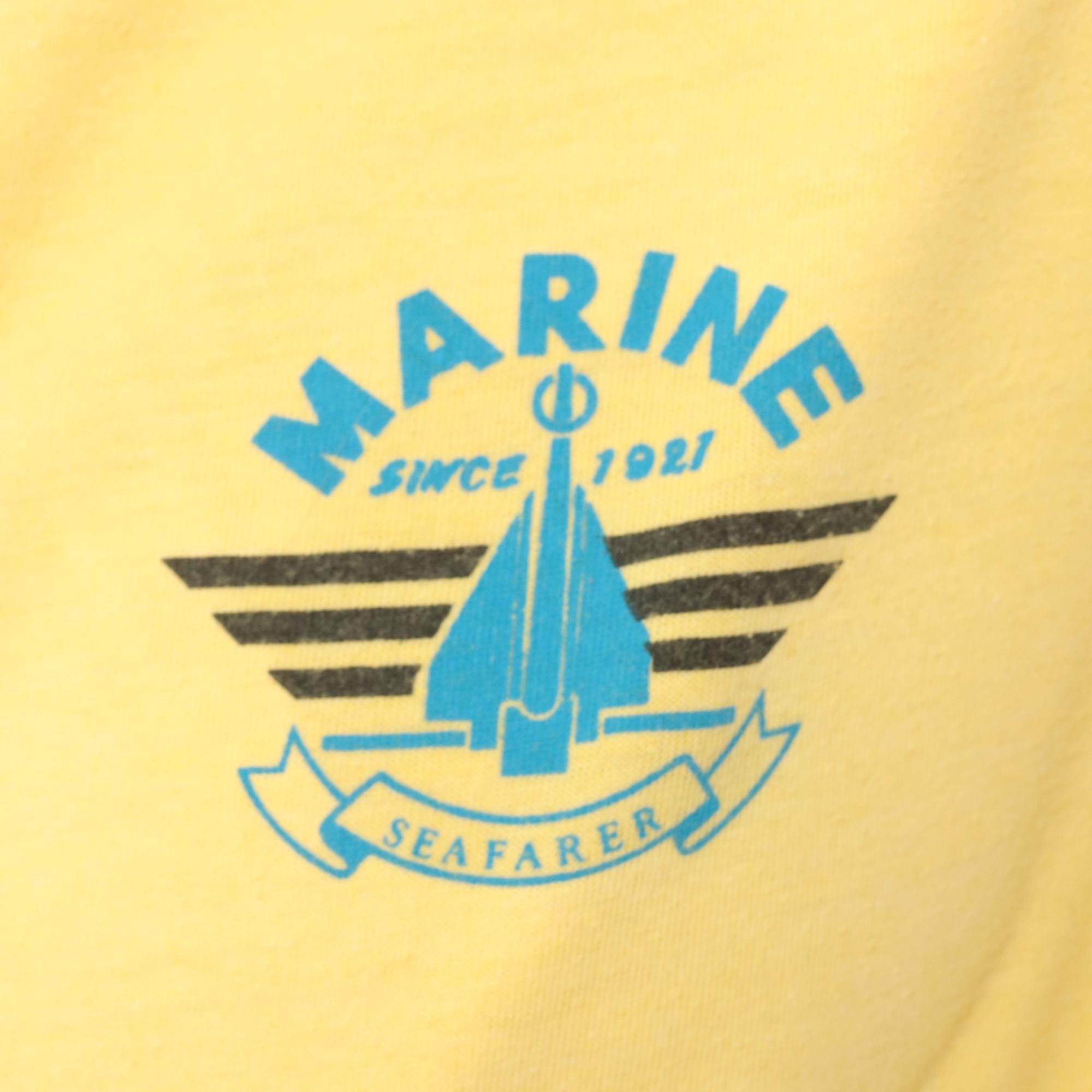 80s yellow polo shirt with Marine Seafarer graphic print across the chest showing a blue sailboat design with black stripes and "Since 1987" text. Collared neckline with two-button placket, short sleeves with ribbed cuffs and ribbed collar.