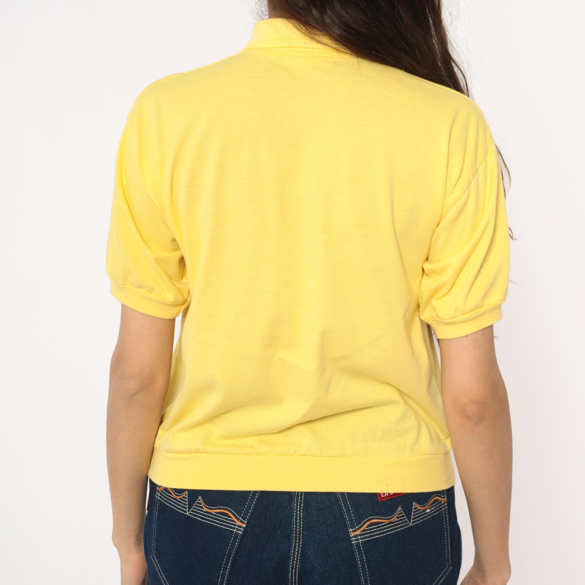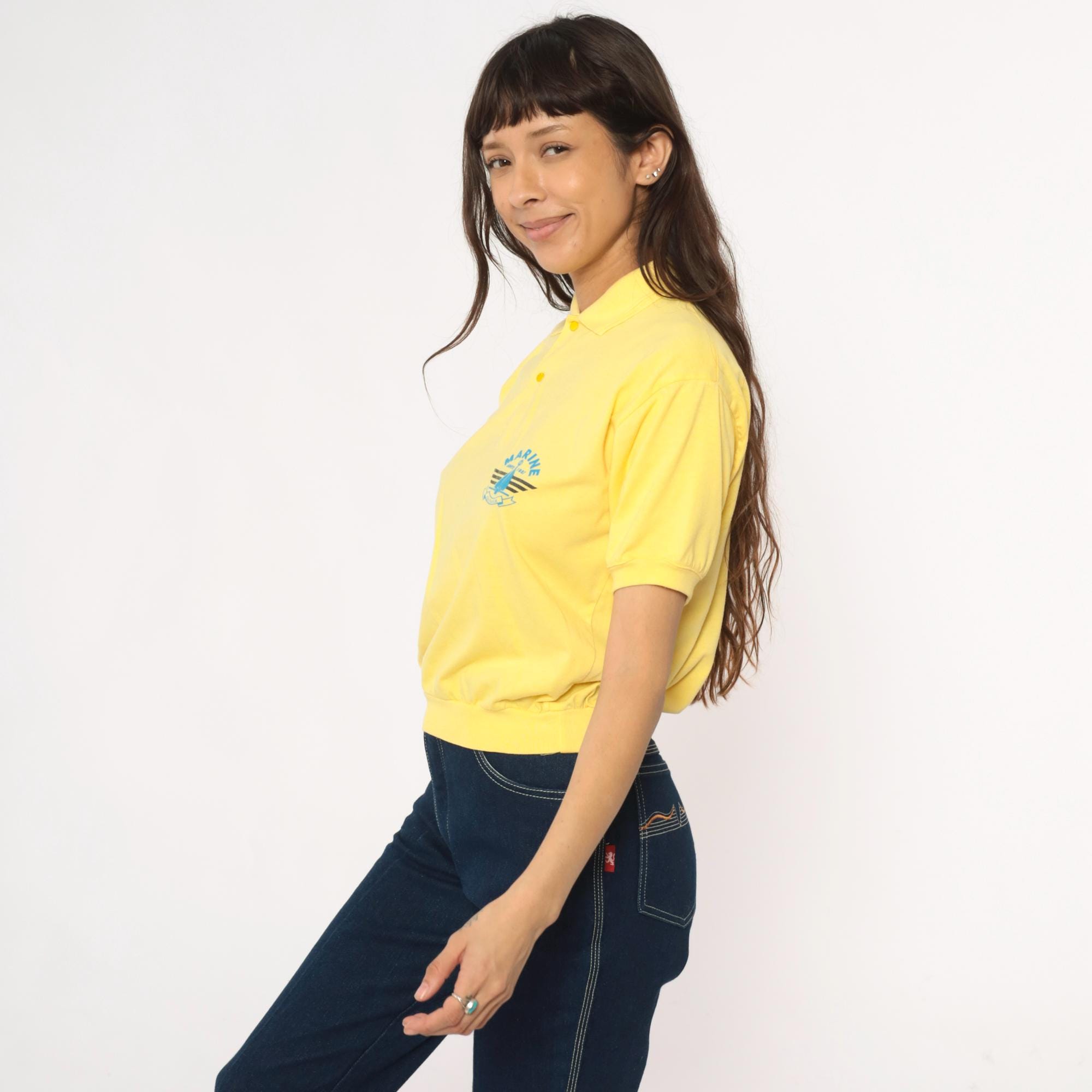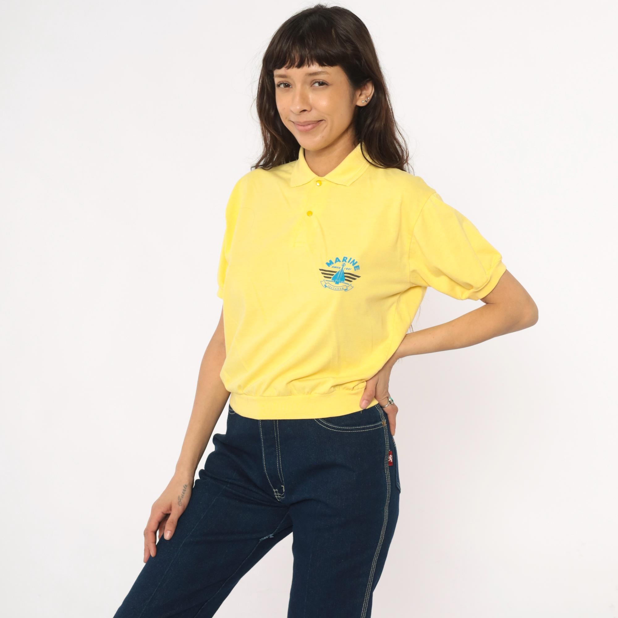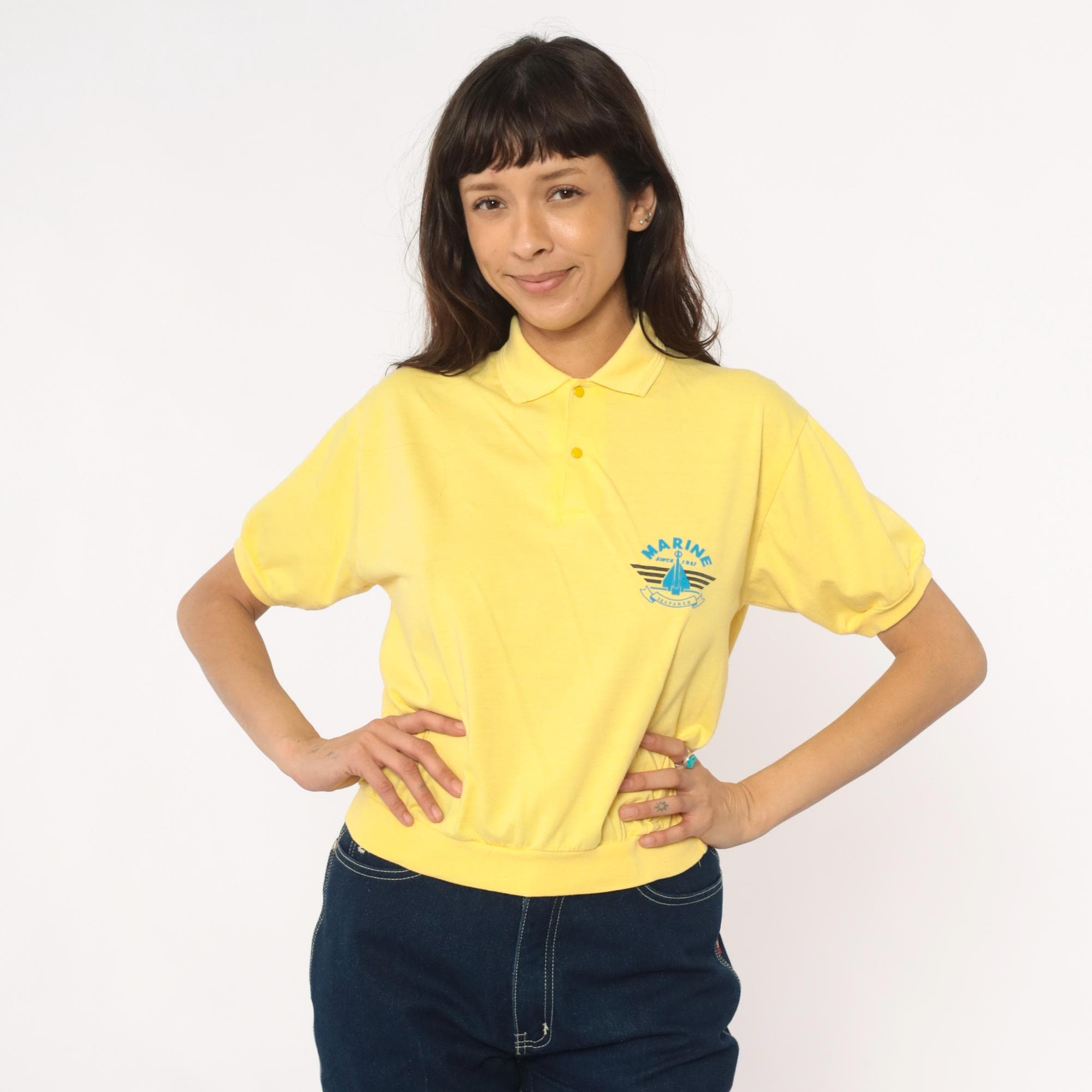 80s yellow polo shirt with Marine Seafarer graphic print across the chest showing a blue sailboat design with black stripes and "Since 1987" text. Collared neckline with two-button placket, short sleeves with ribbed cuffs and ribbed collar.