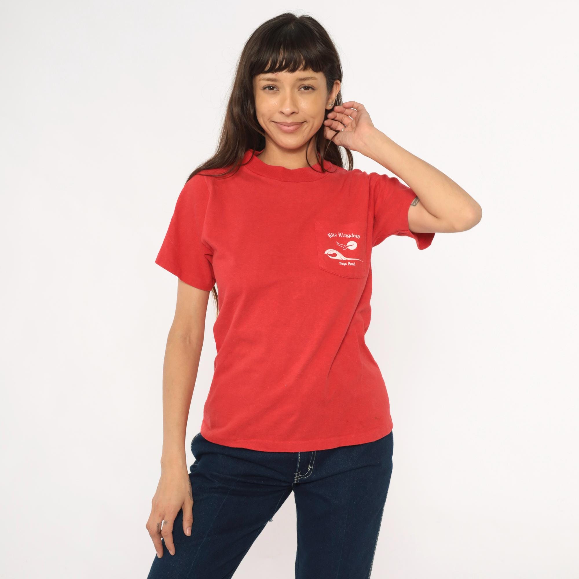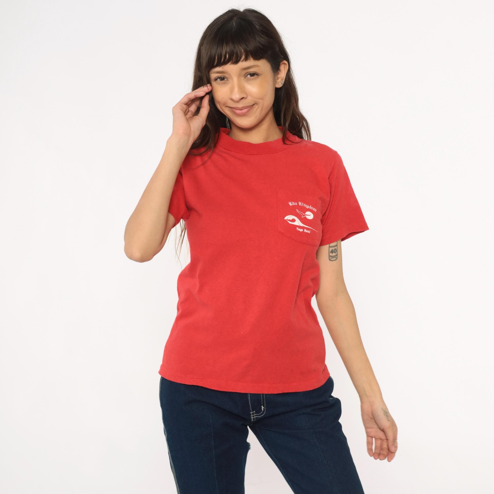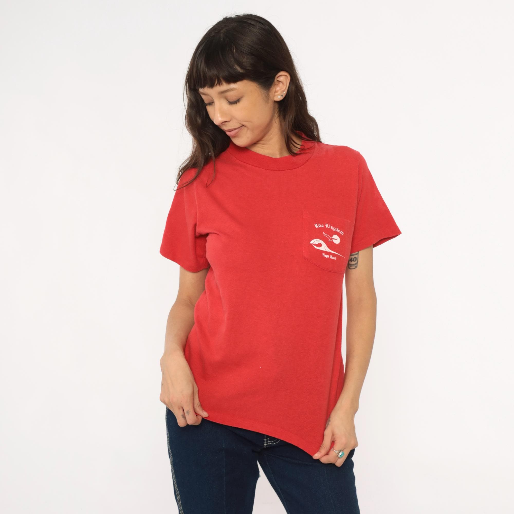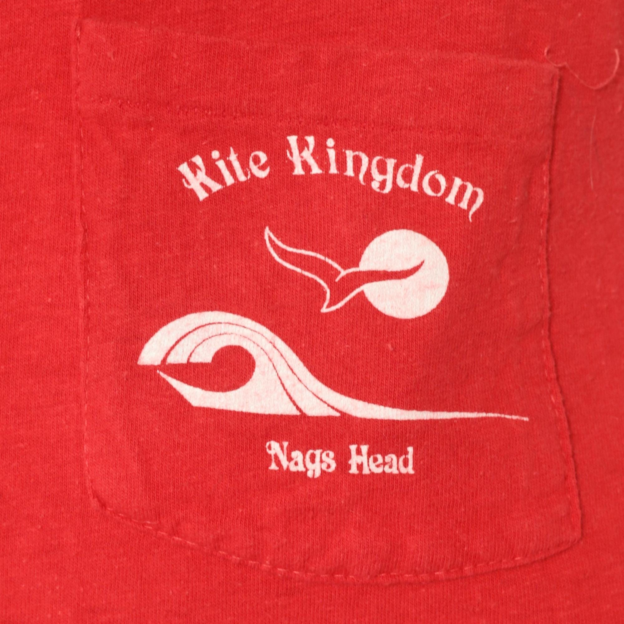 90s red souvenir t-shirt from Kite Kingdom in Nags Head, North Carolina with front chest pocket and large back graphic featuring a white seagull, yellow sun, and blue wave design. Front pocket repeats the Kite Kingdom branding with small matching graphics.