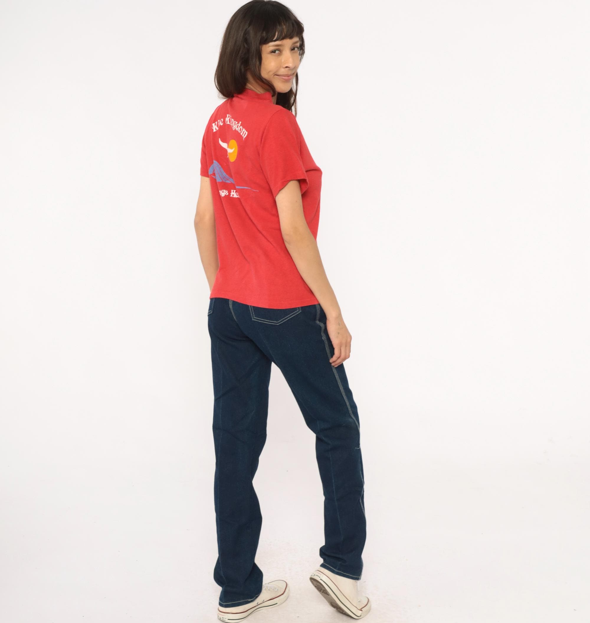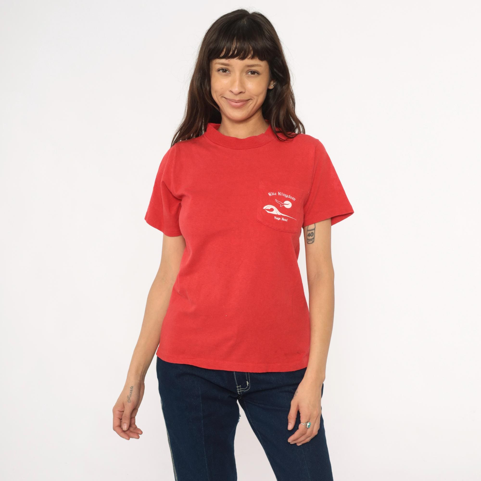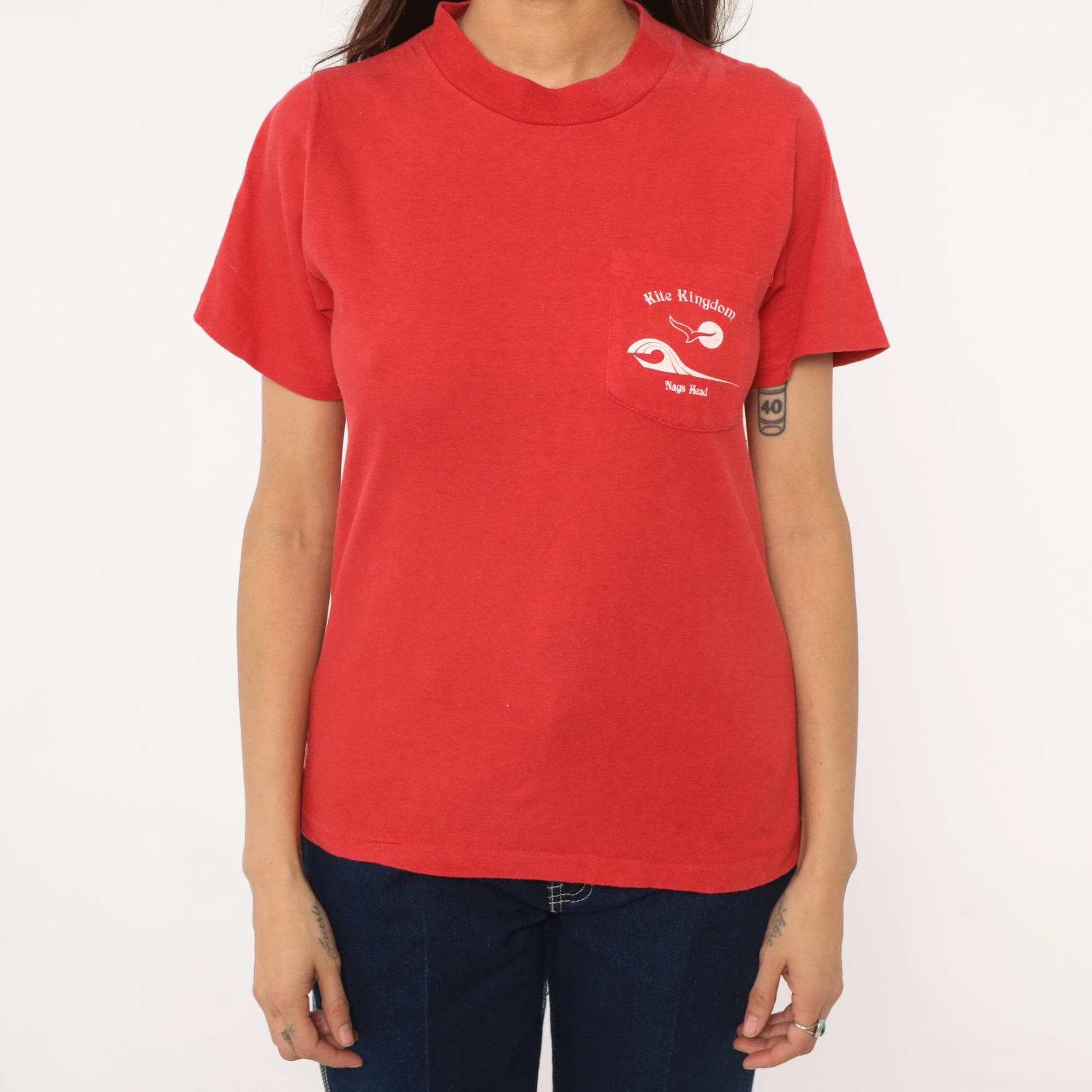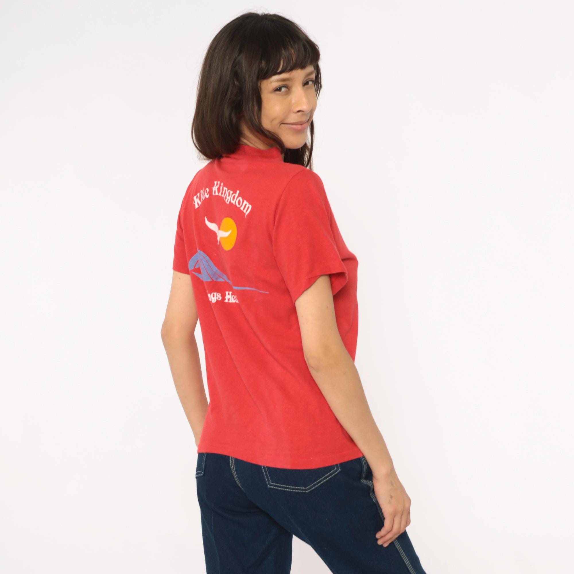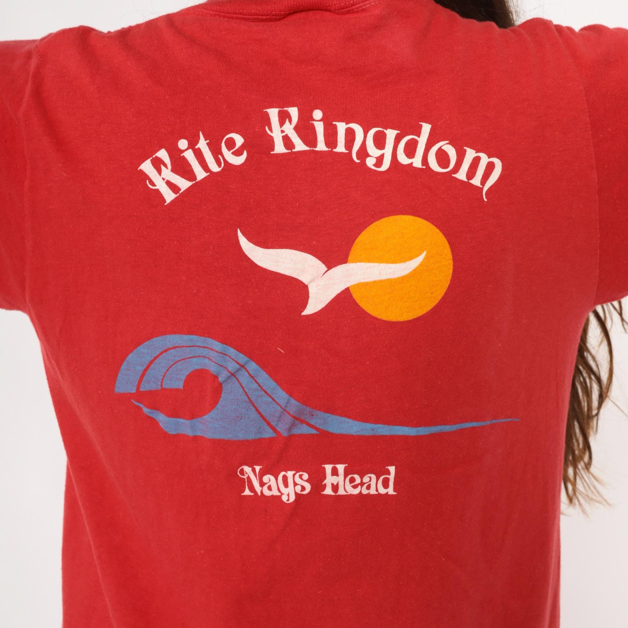 90s red souvenir t-shirt from Kite Kingdom in Nags Head, North Carolina with front chest pocket and large back graphic featuring a white seagull, yellow sun, and blue wave design. Front pocket repeats the Kite Kingdom branding with small matching graphics.