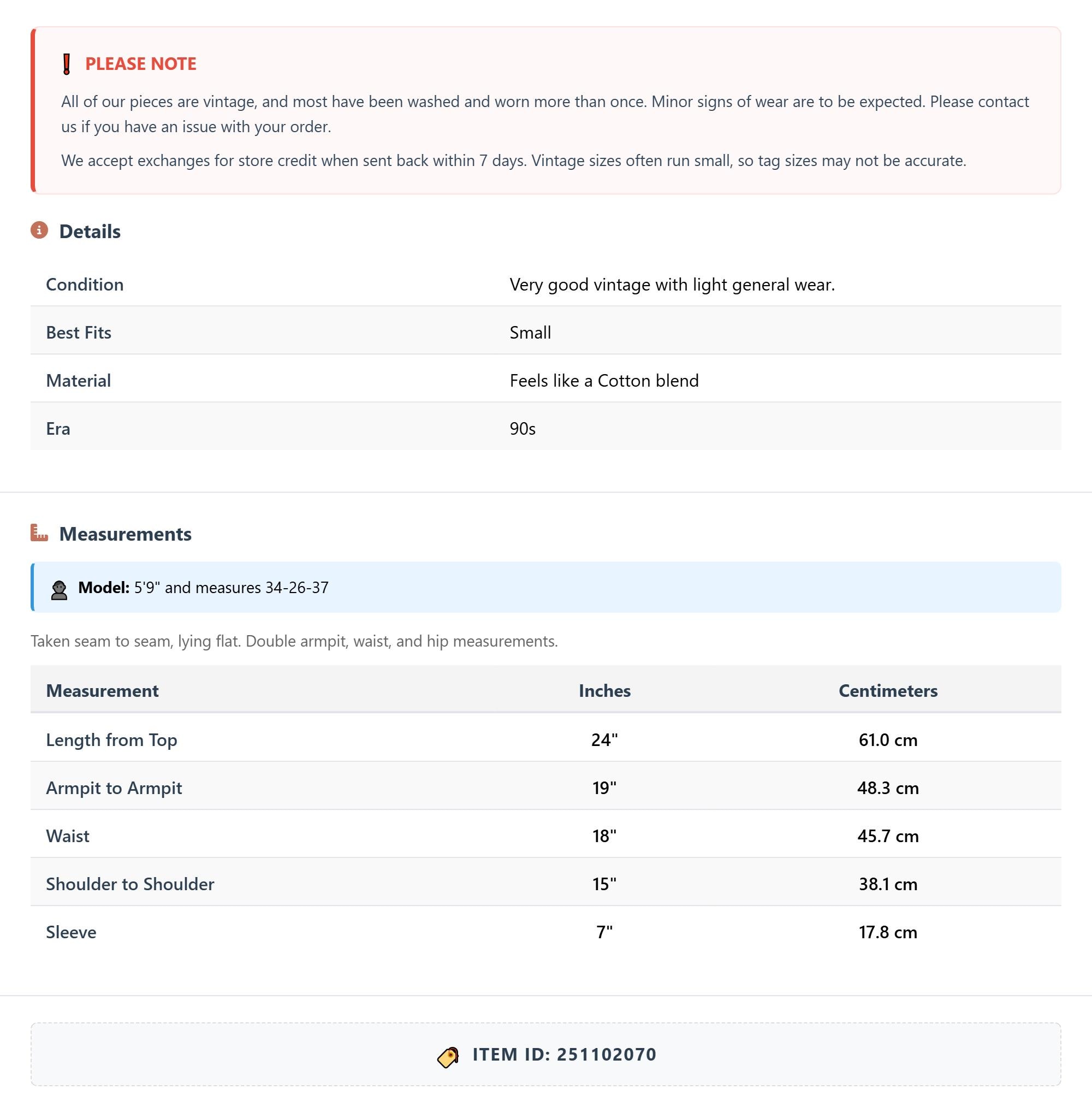 All of our pieces are vintage, and most have been washed and worn more than once. Minor signs of wear are to be expected. Please contact us if you have an issue with your order. We accept exchanges for store credit when sent back within 7 days.