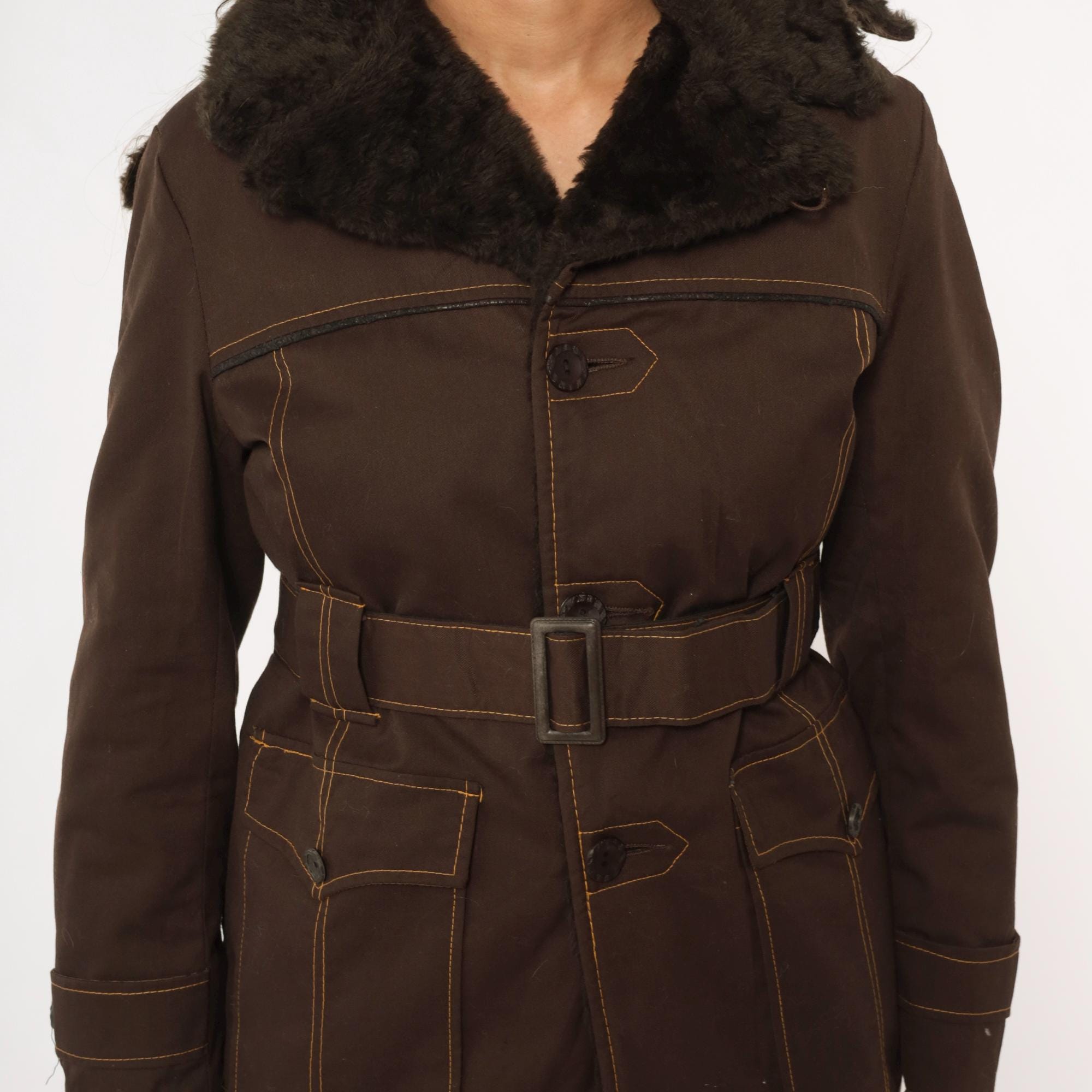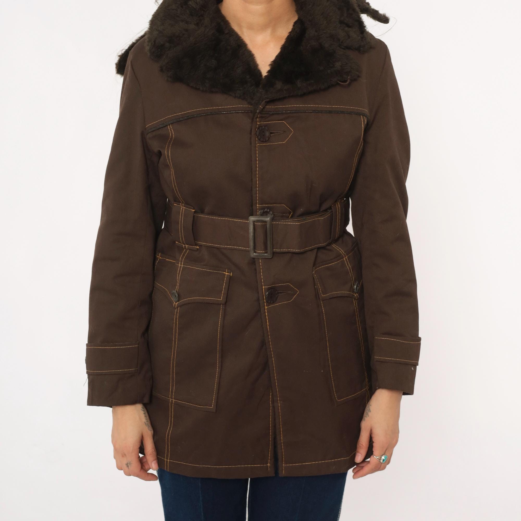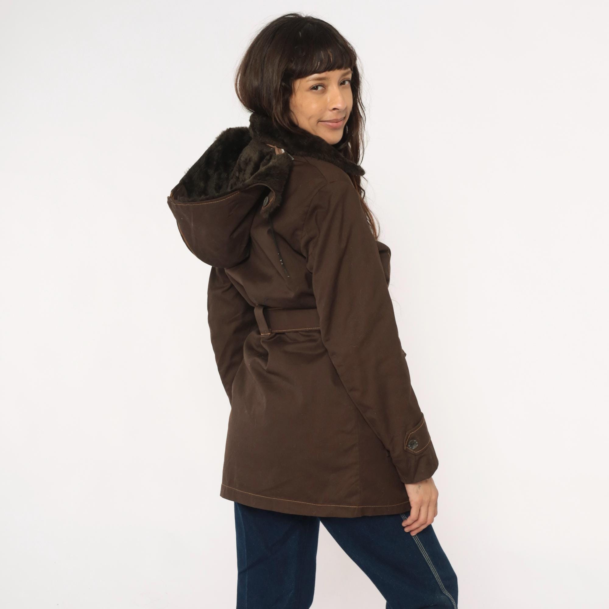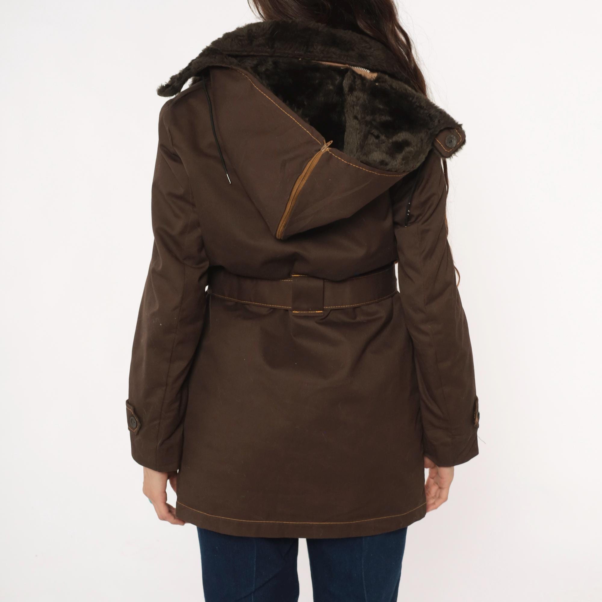 70s brown detachable hooded coat from mcgregor with dark faux fur collar and lining, contrast tan topstitching throughout. Belted waist with rectangular buckle, front flap pockets, long sleeves with button-tab cuffs.