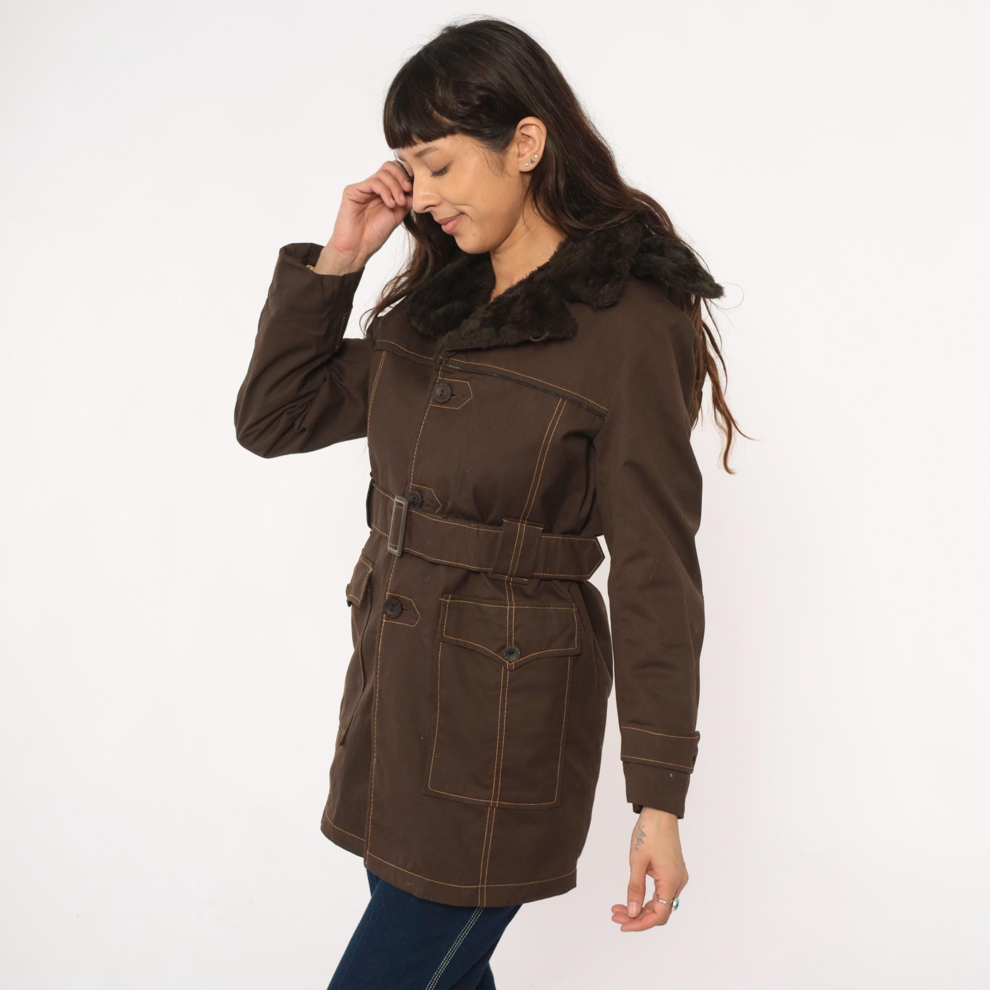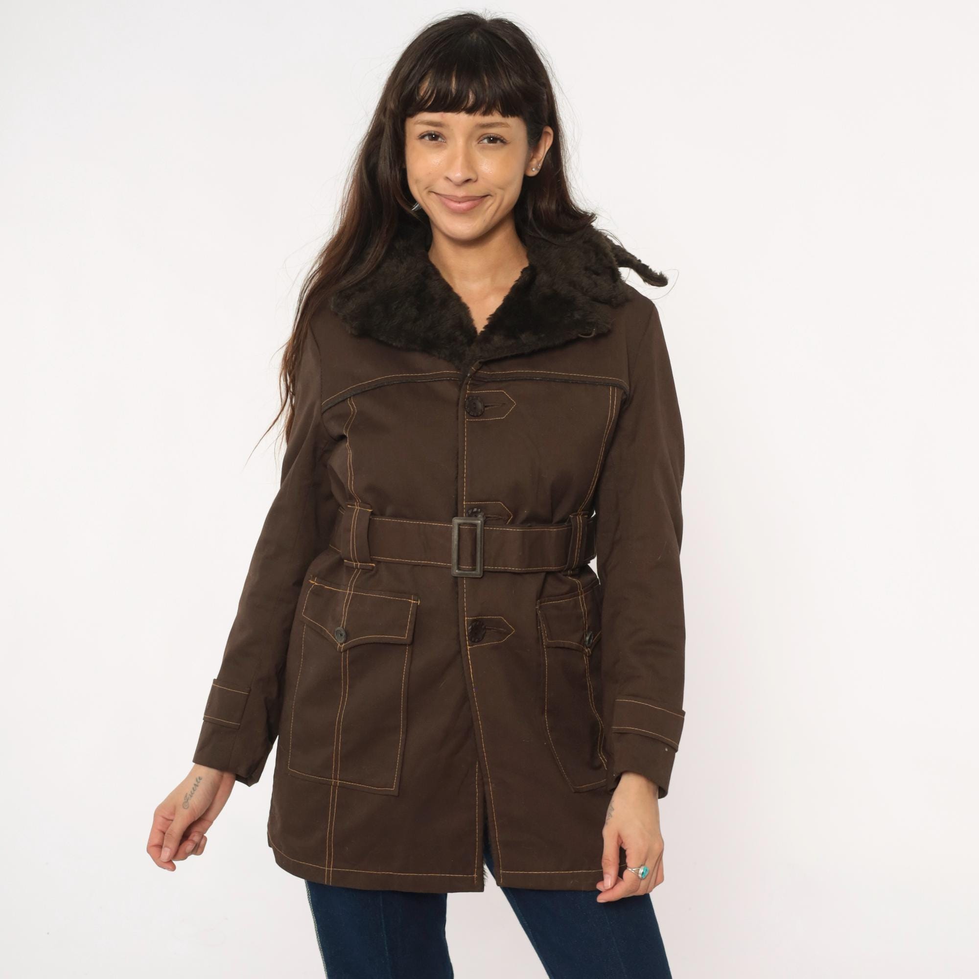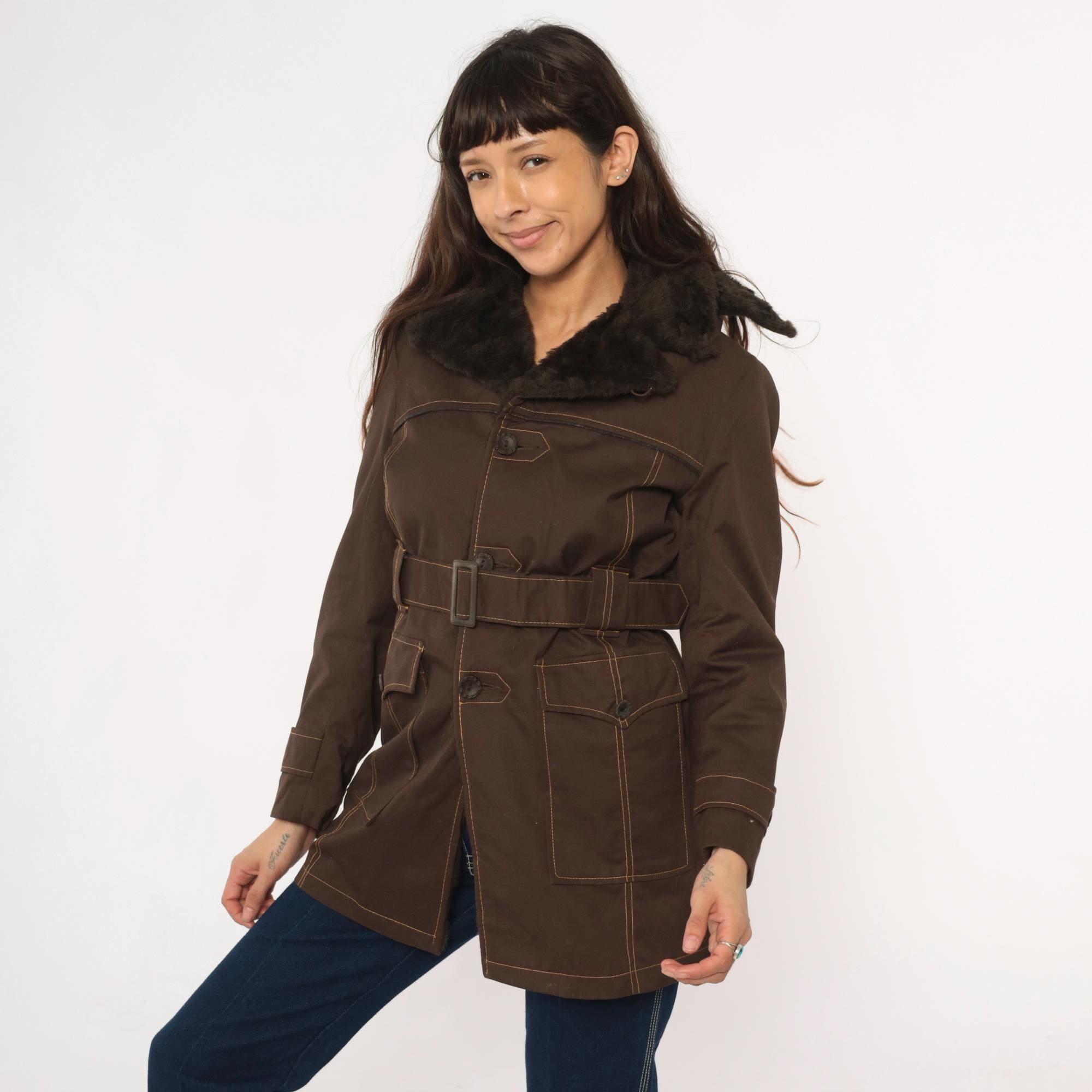 70s brown detachable hooded coat from mcgregor with dark faux fur collar and lining, contrast tan topstitching throughout. Belted waist with rectangular buckle, front flap pockets, long sleeves with button-tab cuffs.