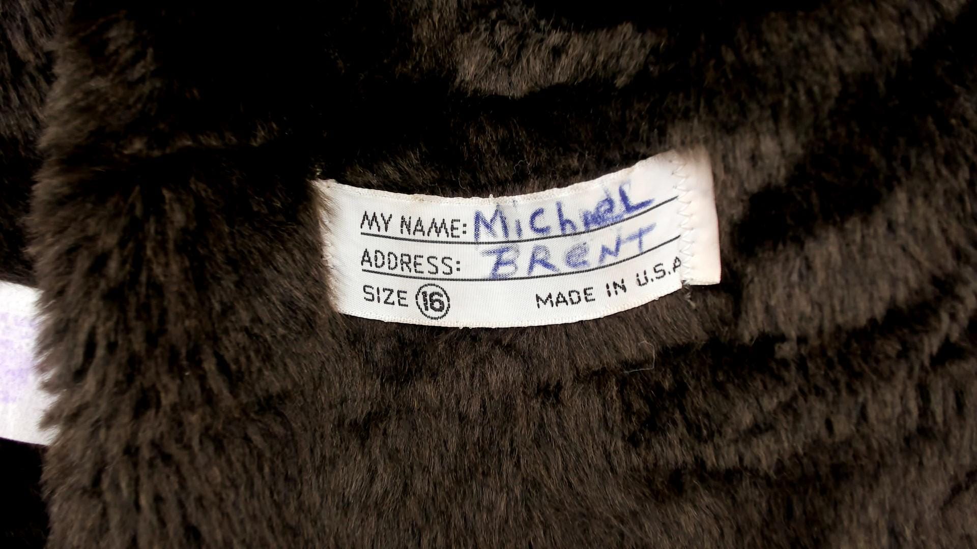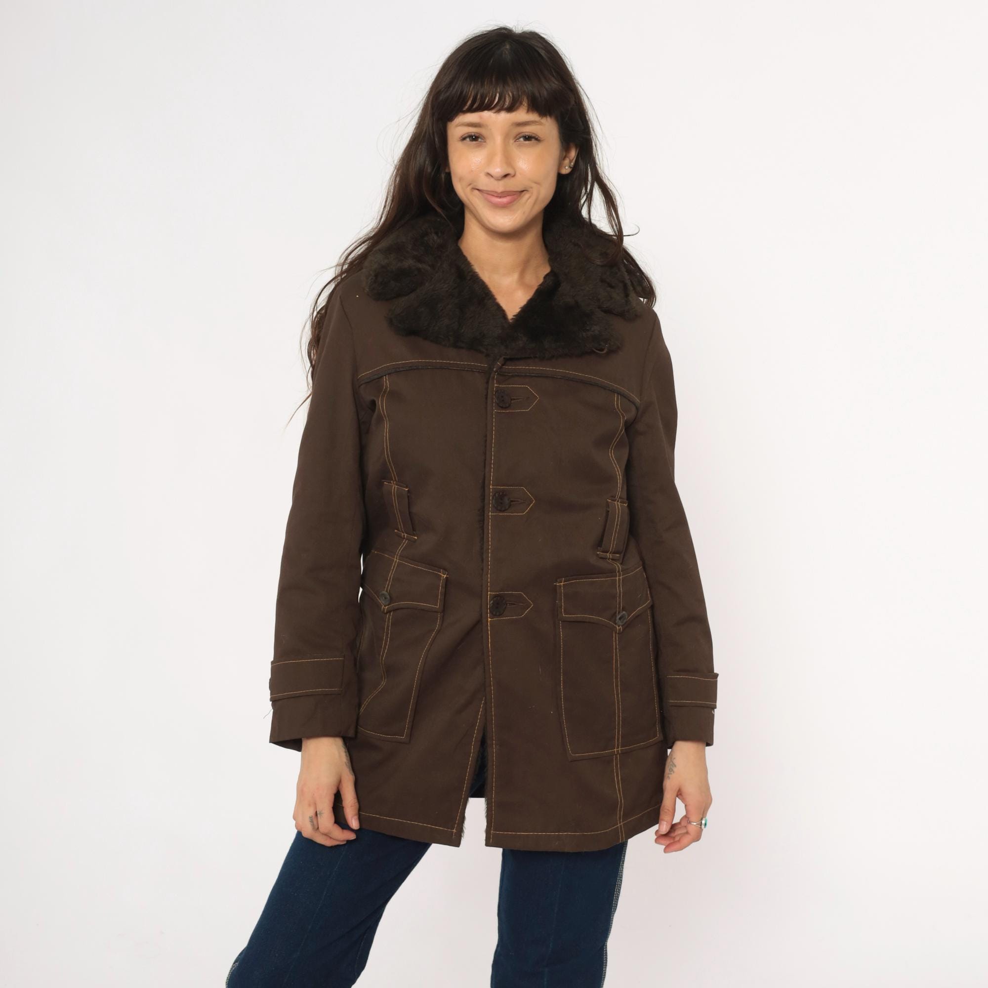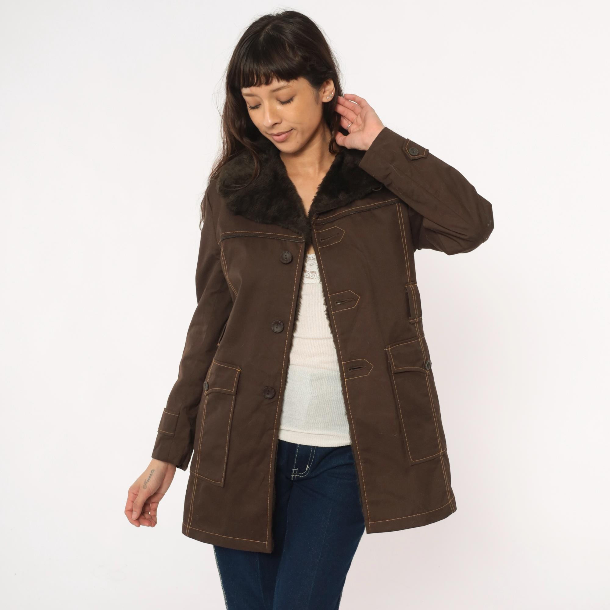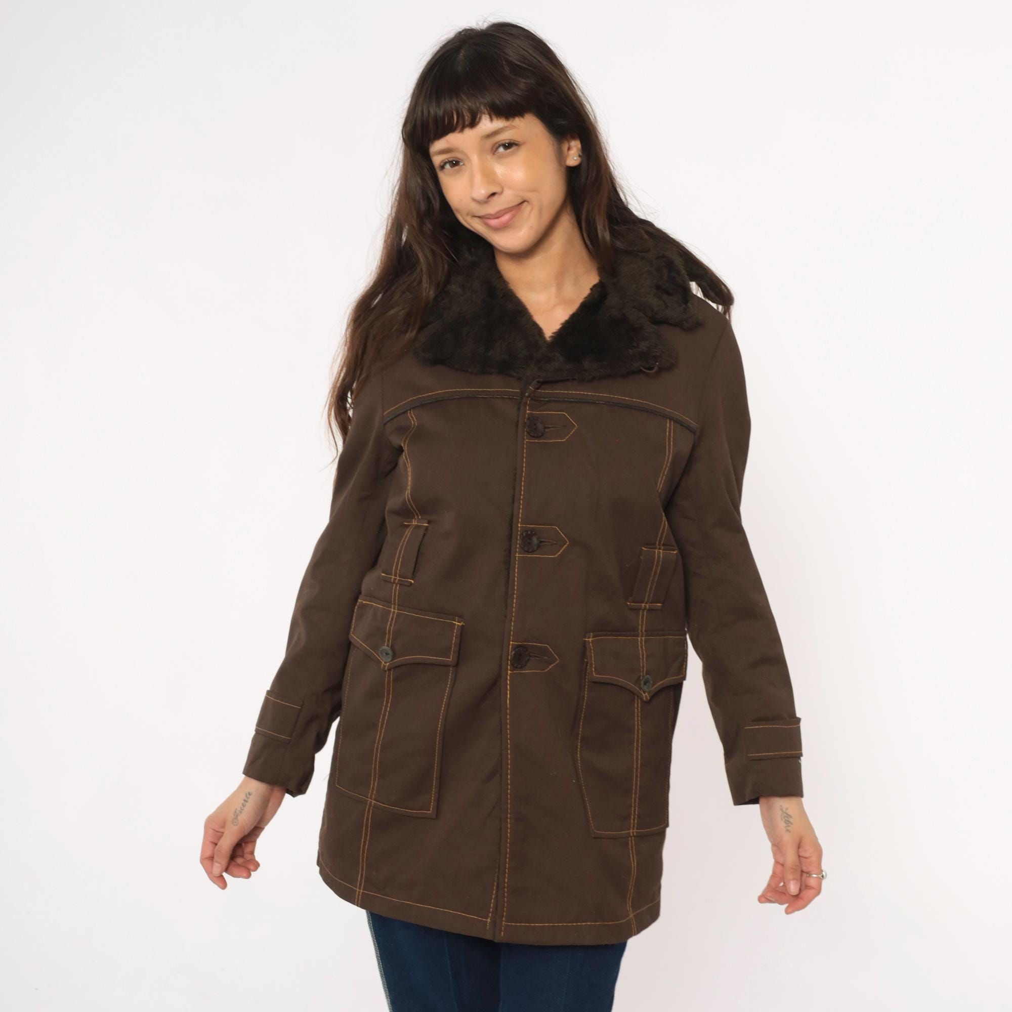 70s brown detachable hooded coat from mcgregor with dark faux fur collar and lining, contrast tan topstitching throughout. Belted waist with rectangular buckle, front flap pockets, long sleeves with button-tab cuffs.
